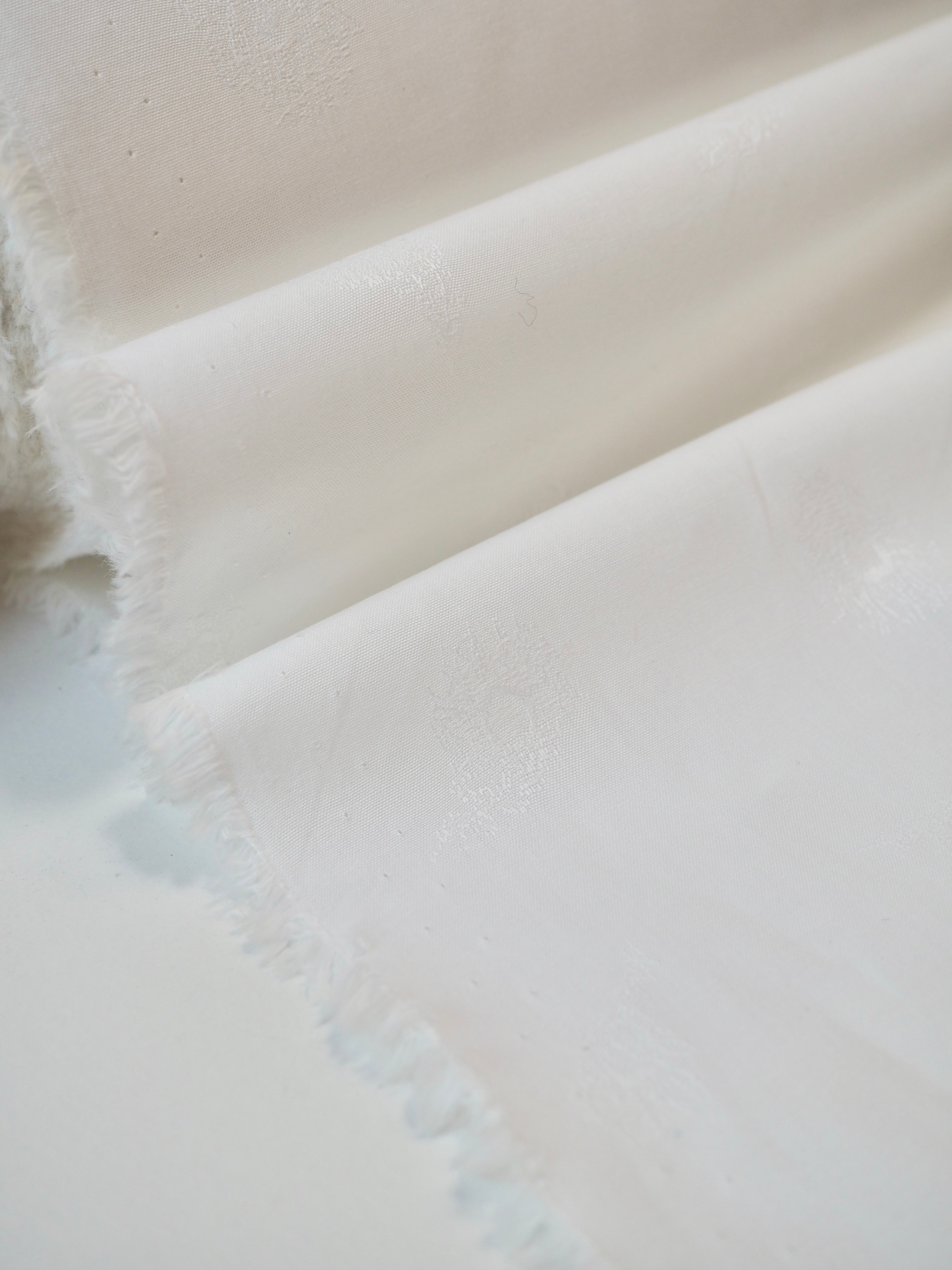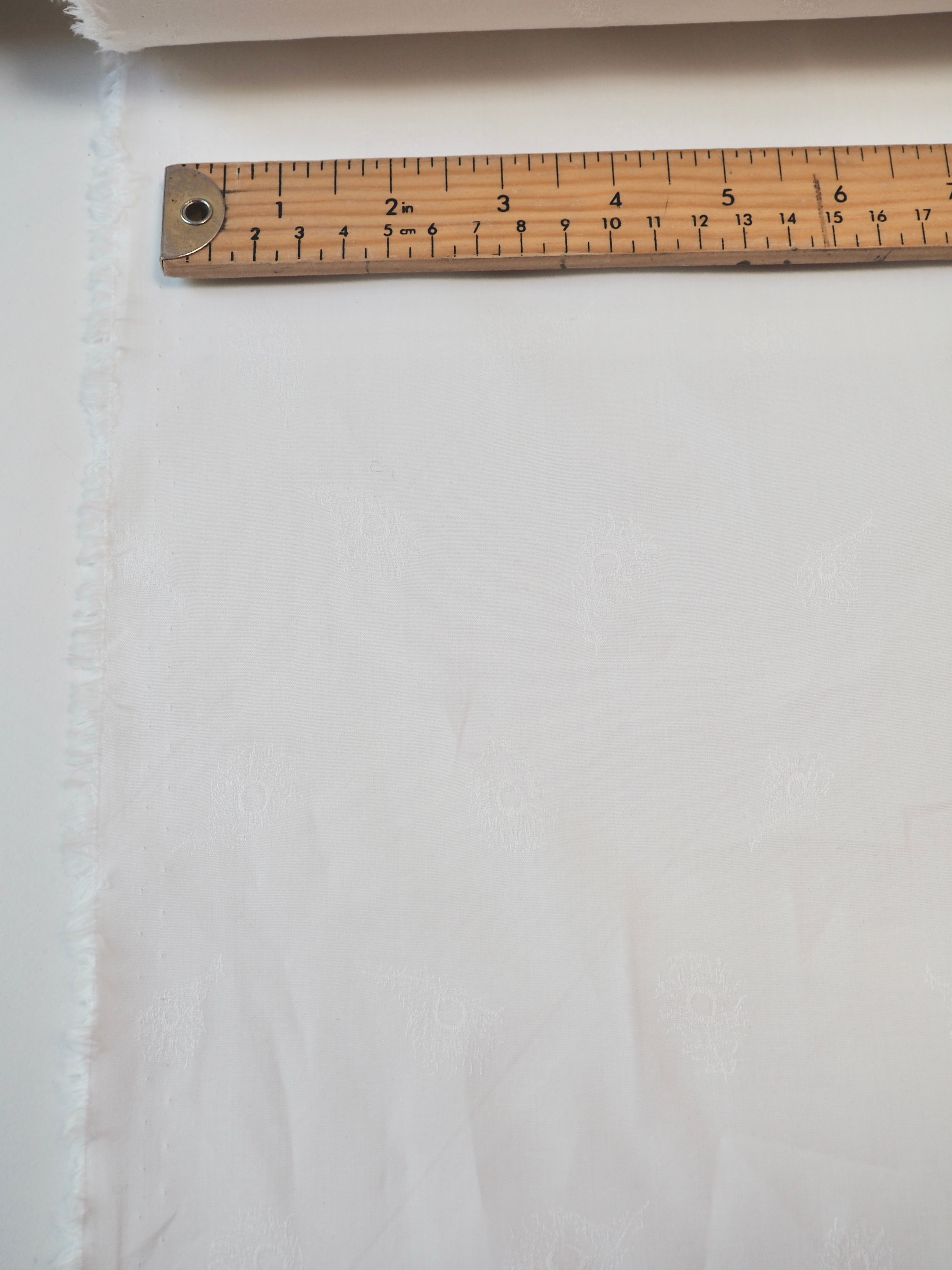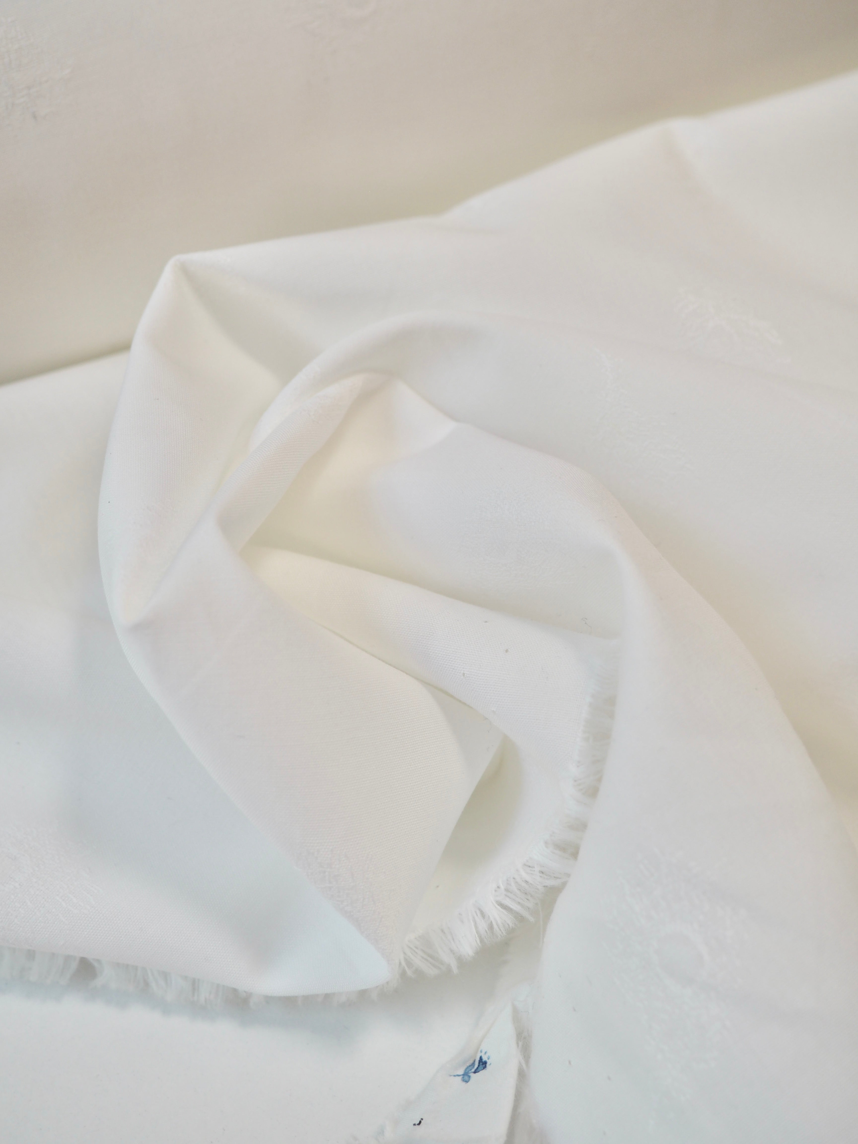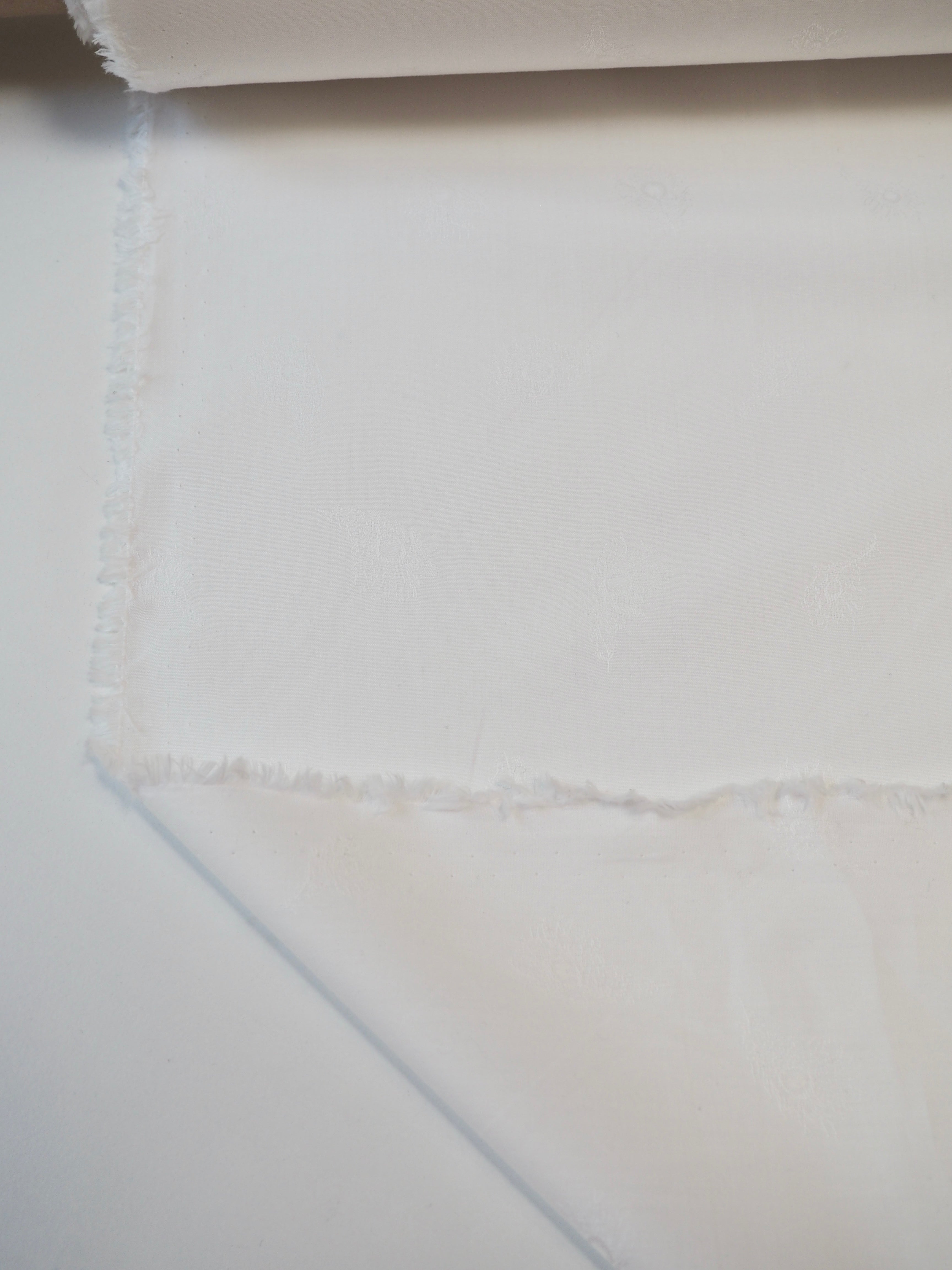 This ex-designer fabric is a classic Liberty cotton. A subtle feather motif is woven into this pure white cotton jacquard. It's a spread out design but so crisp and cottage-core in it's look! A top-quality Liberty cotton, and super lightweight! Soft with a lovely drape, and slightly sheer, so you might want to line it. We would love to see it in our Everyday Dress/Top, or as a summery tablecloth for afternoon tea!