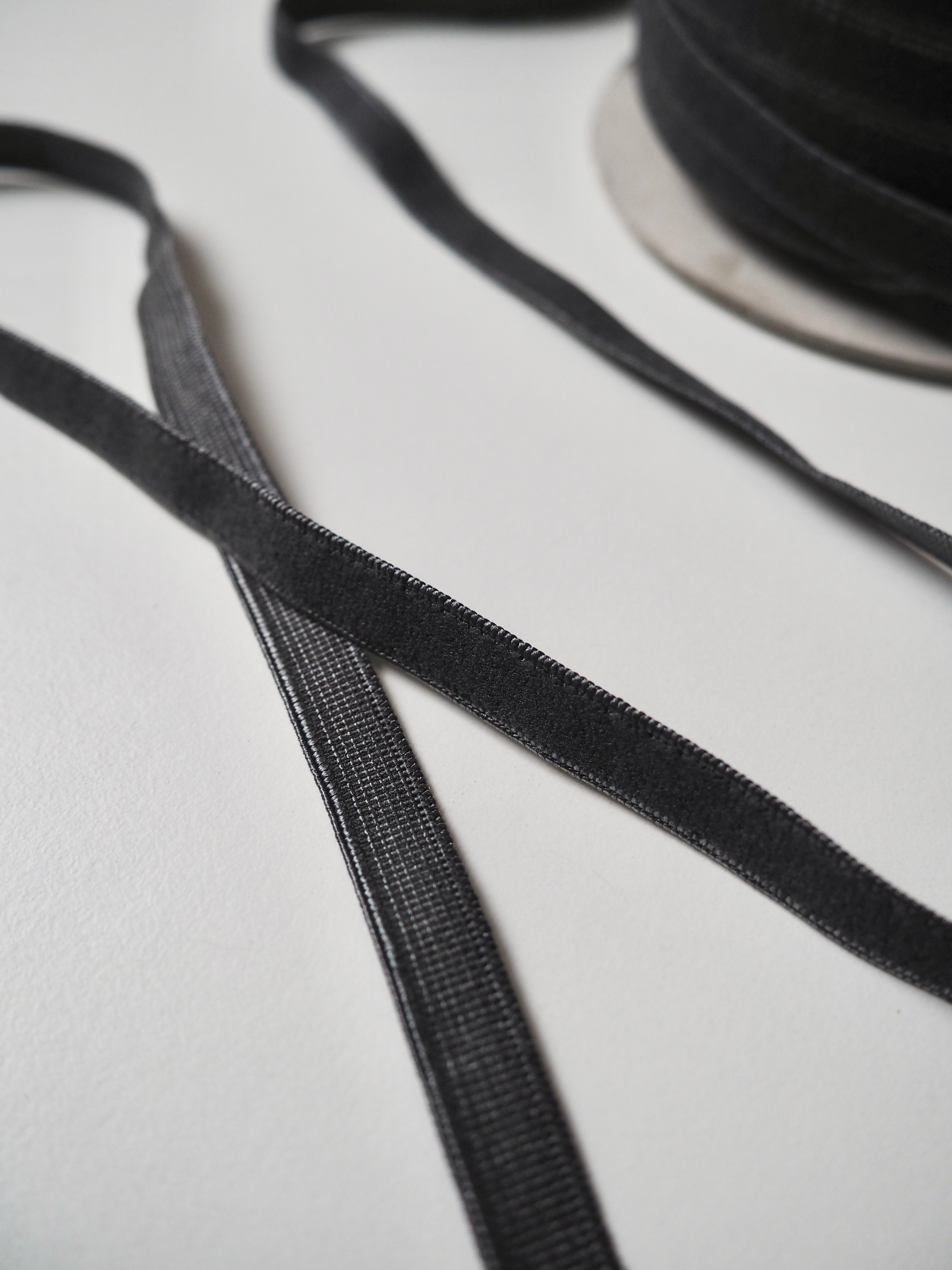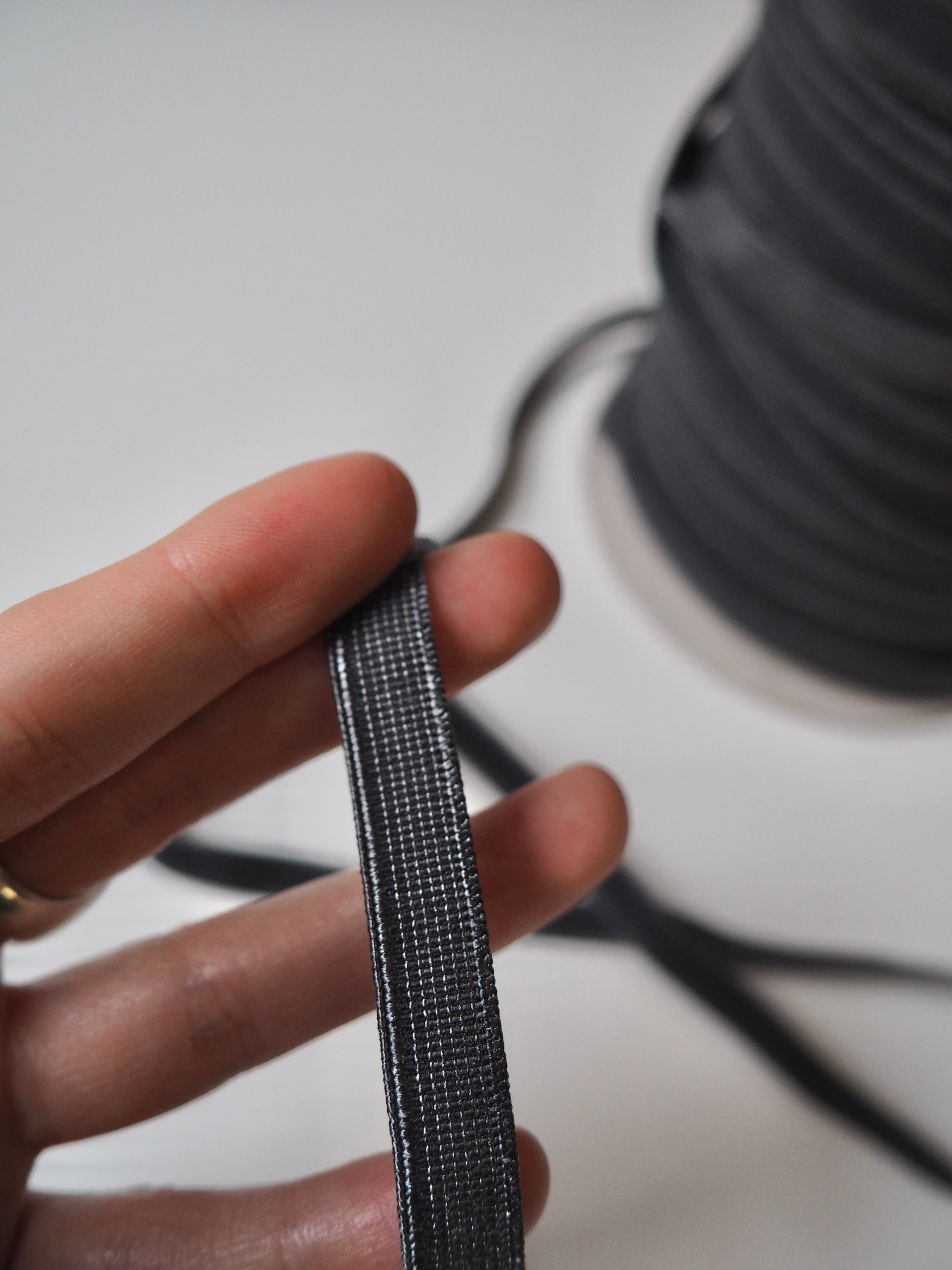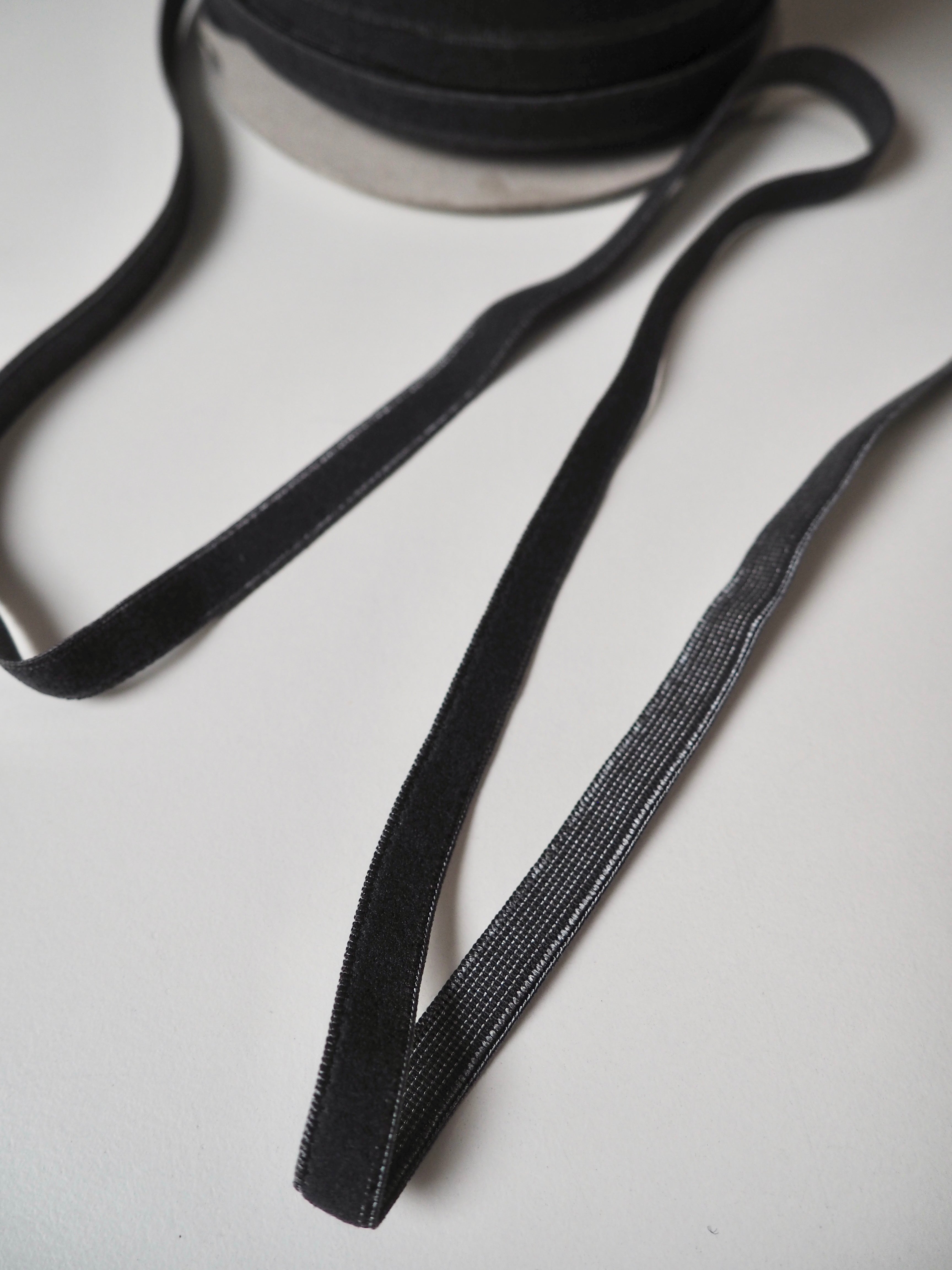This ex-designer trim is a Charcoal elastic. One side is a typical textured elastic feel with a lighter grey woven in, and the other a plush with a soft feel. Great stretch and recovery. Good for smaller casings on trousers and tops, and even waistbands and lingerie straps. Lingerie patterns here!