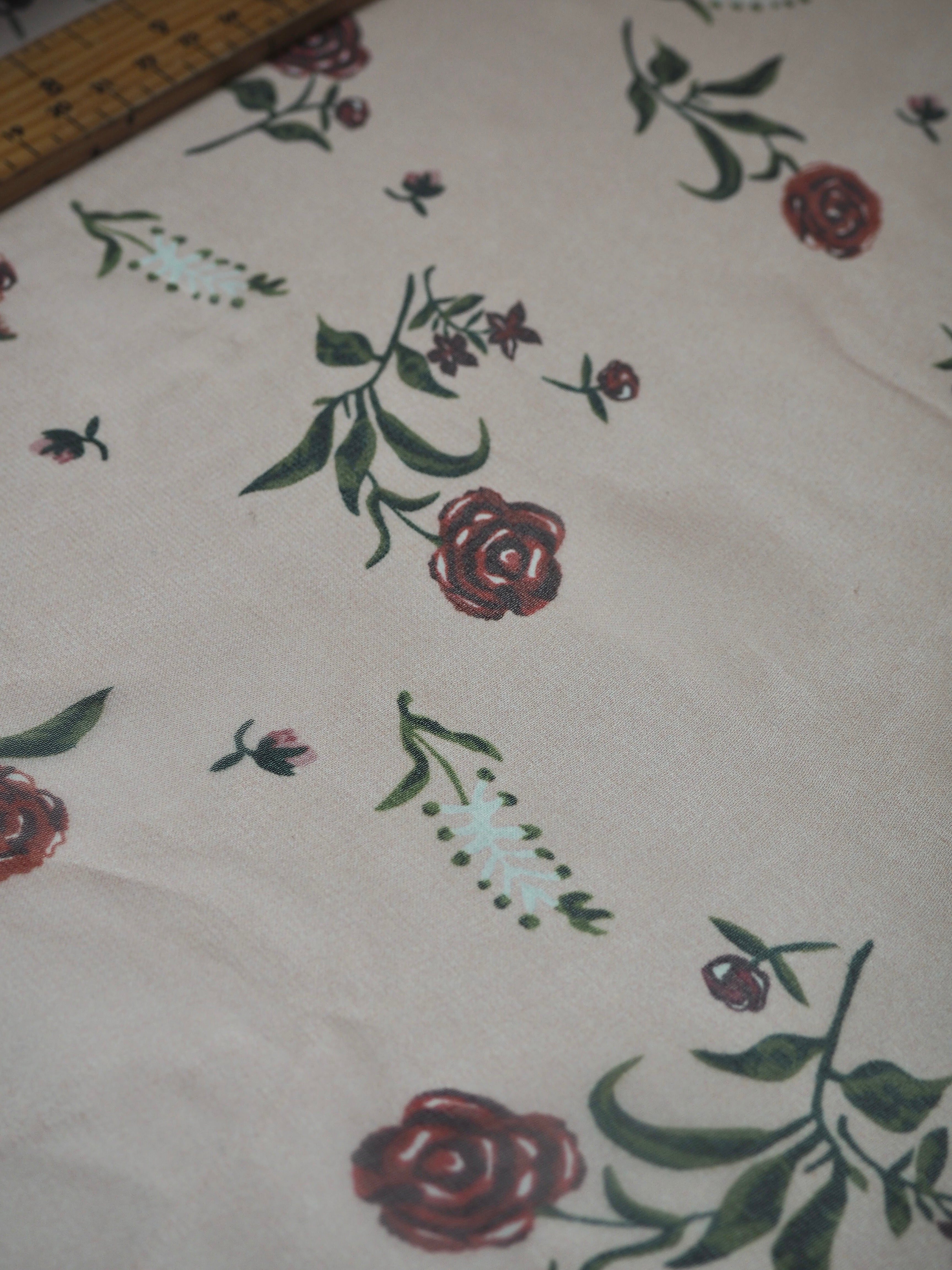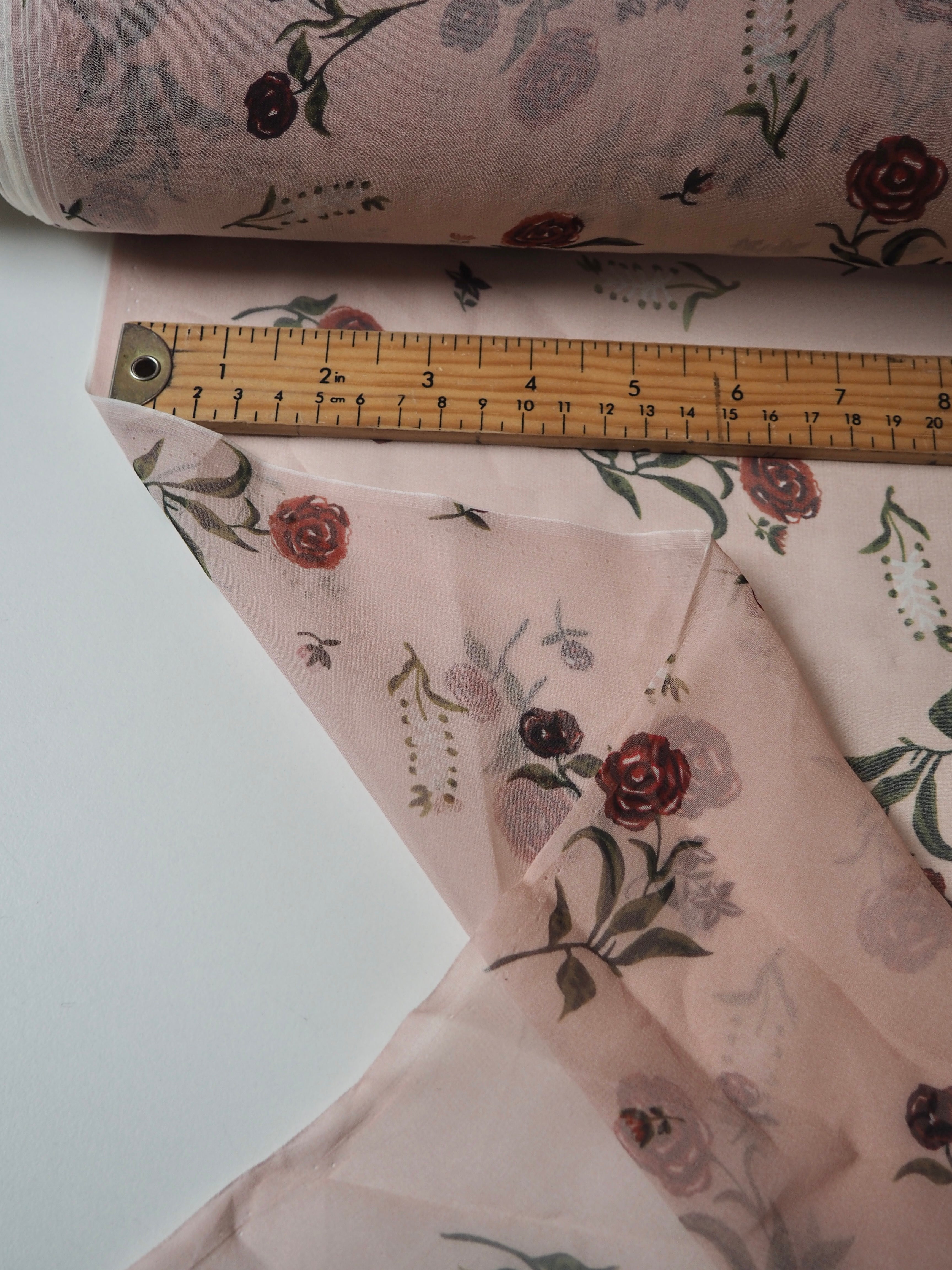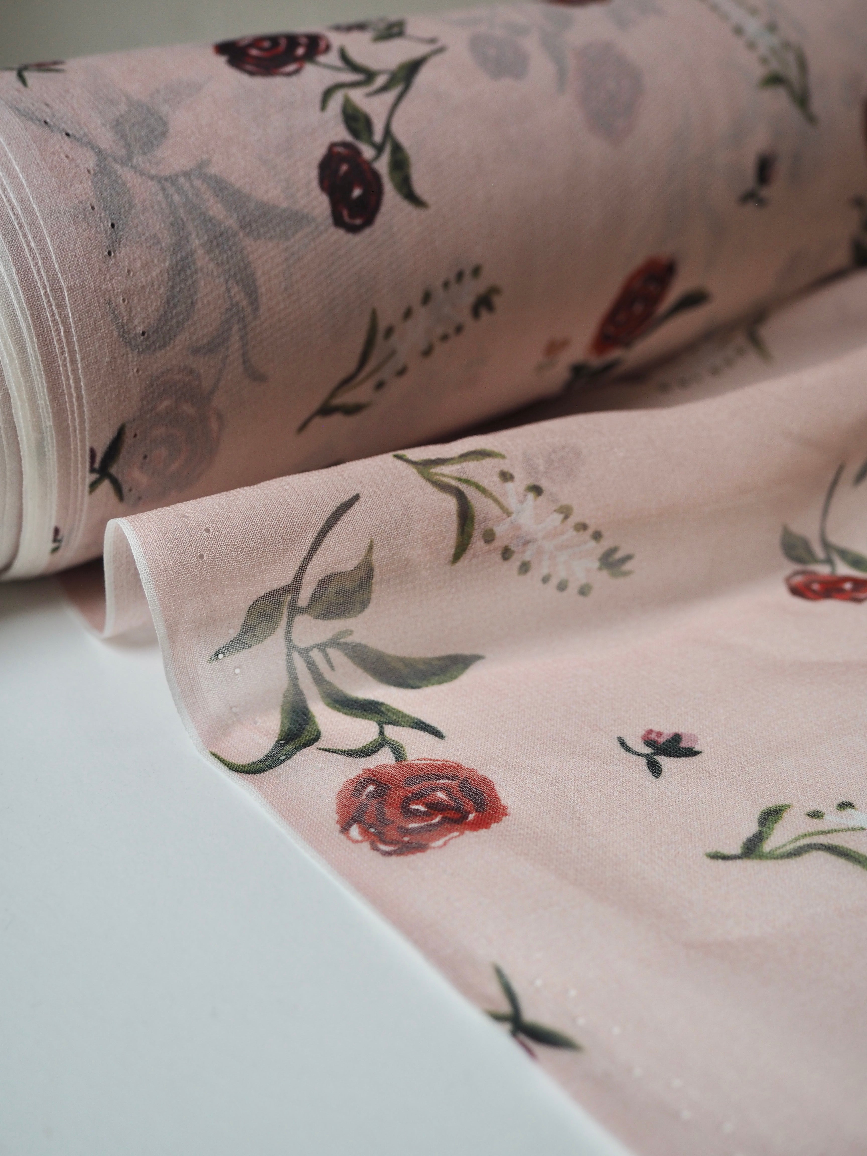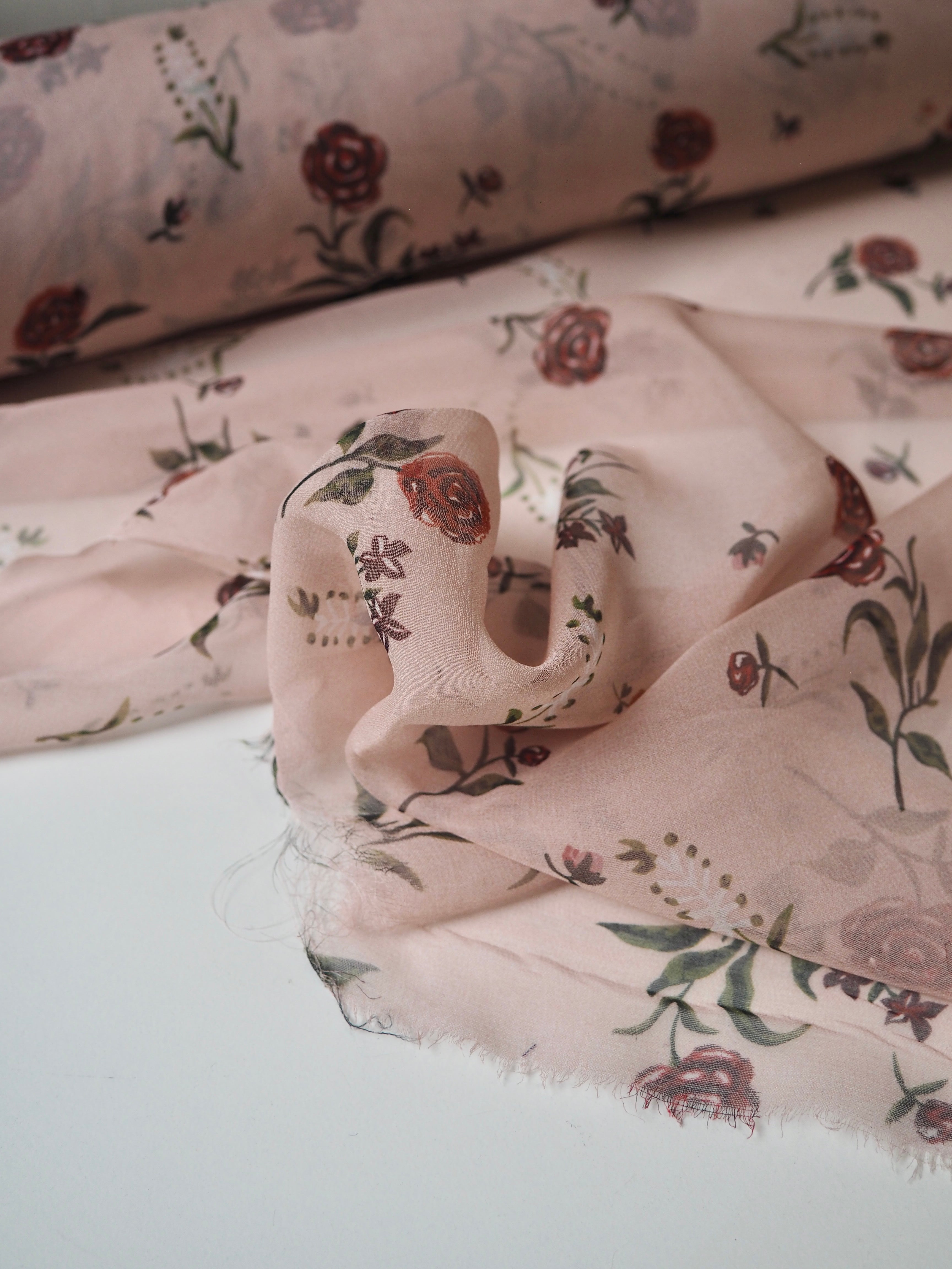 This ex-designer fabric is a lightweight silk chiffon. In a pale pink colour, with dainty red roses and blossoms printed across, and quite sheer. It's a bespoke print from the designer. Has a great silky handle with a subtle crepe-like texture. Super light and airy, ideal for lingerie, or using for a floaty top or dress!