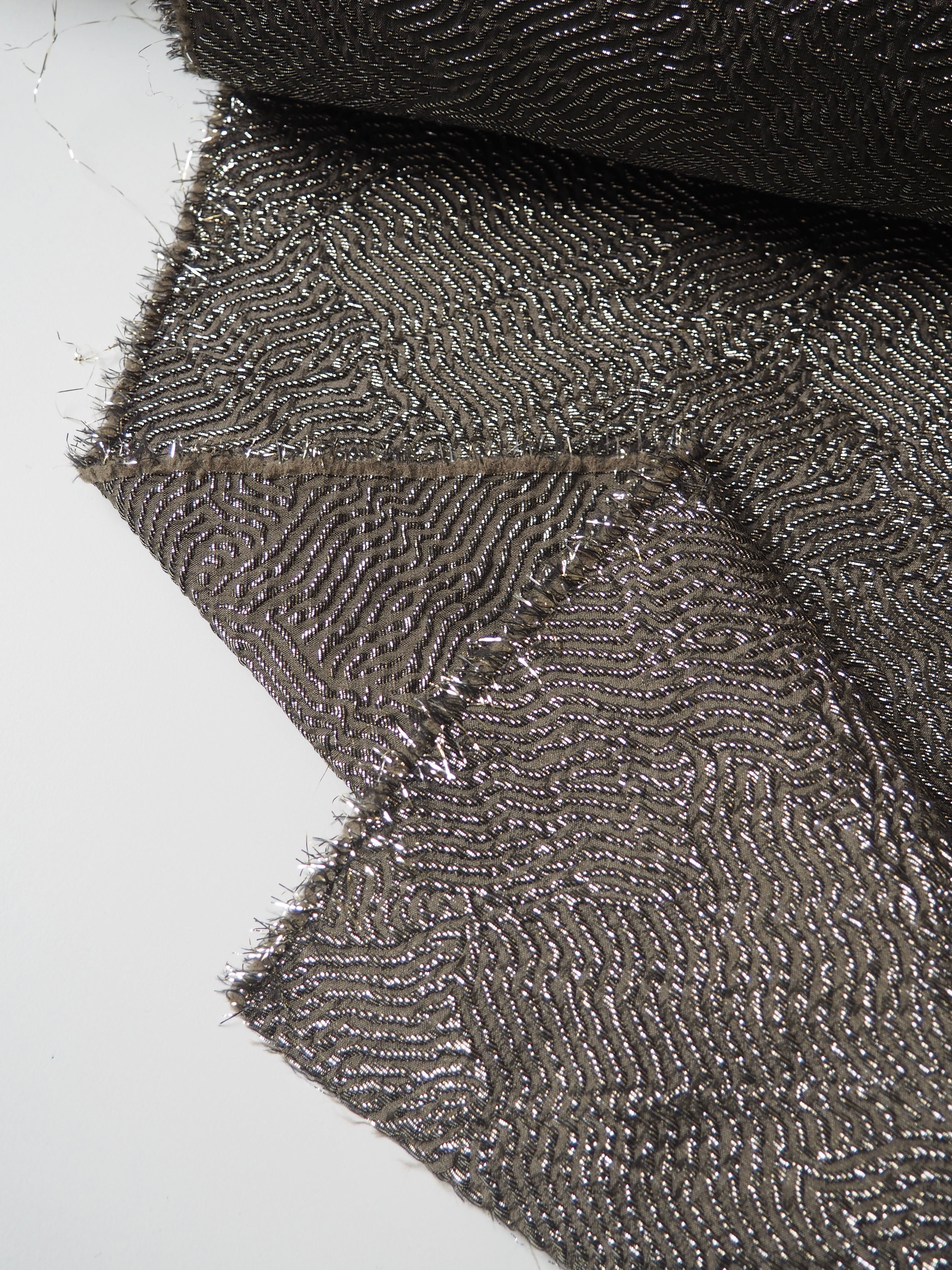 This ex-designer fabric is a metallic jacquard. A wavy jacquard design is woven with metallic threads for a lightweight luxurious cloth. It sparkles so beautifully in the light, has a bouncy and flexible structure, and a plush, metallic-y handle. Perfect for a special dress or even a bag!