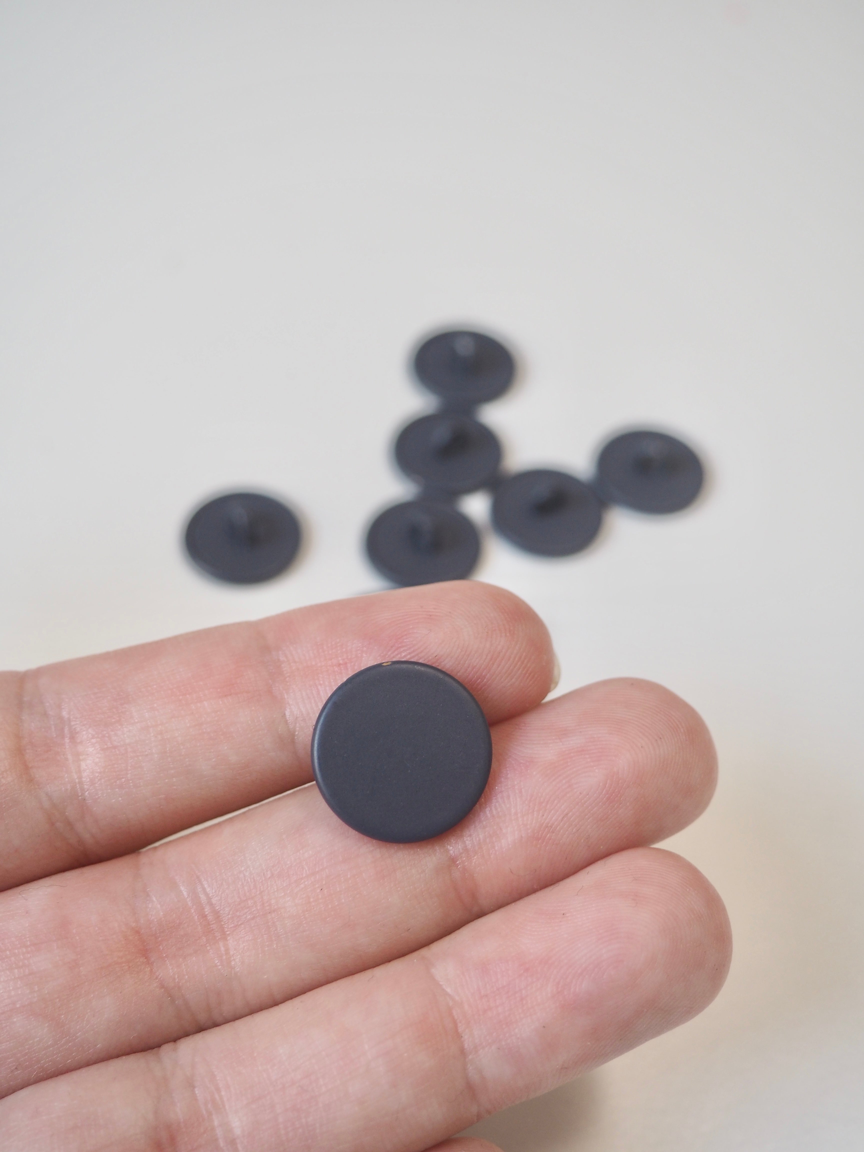 This ex-designer hardware is a shank button. Matte navy finish with a flat top and a shank attachment.