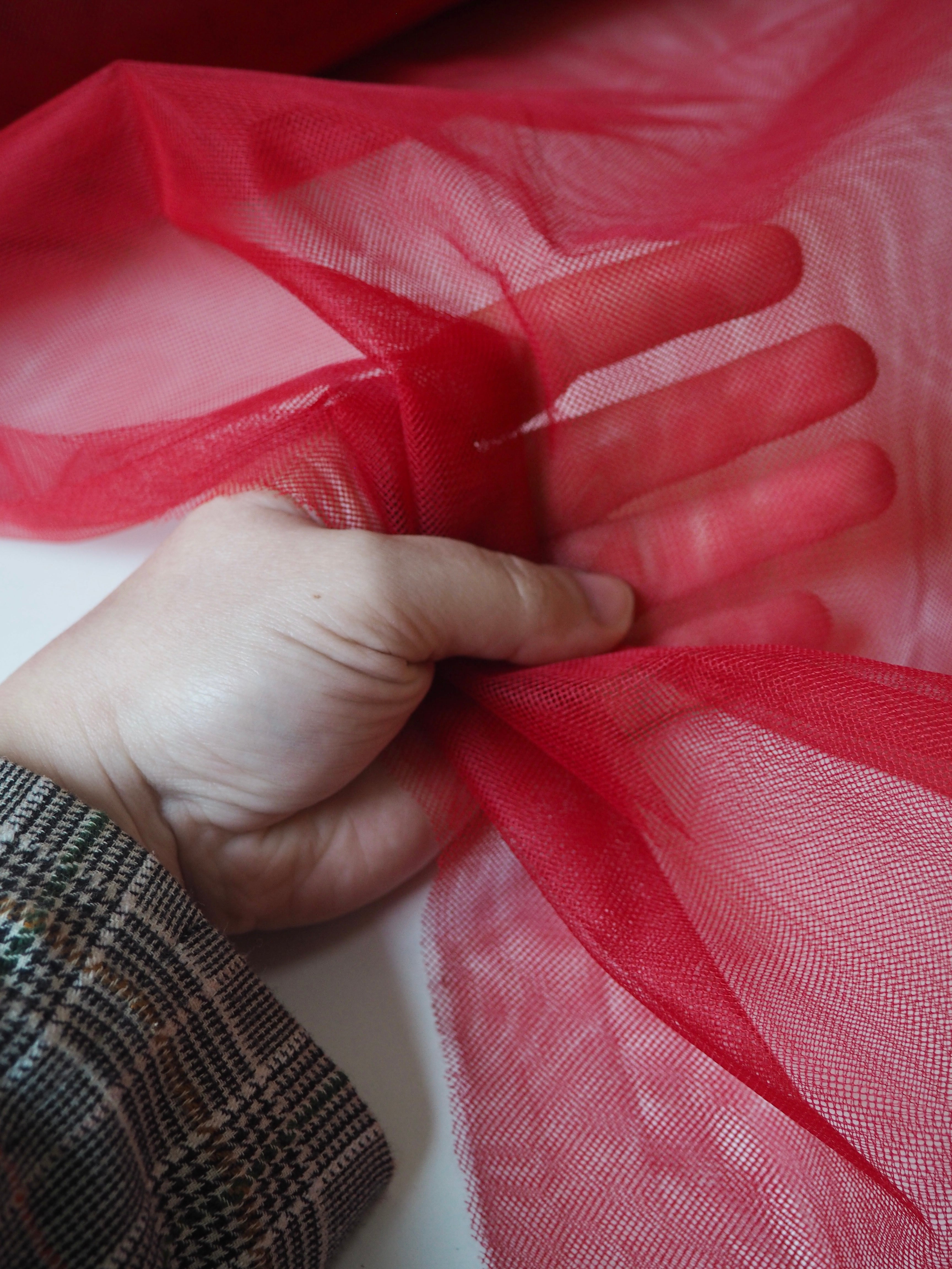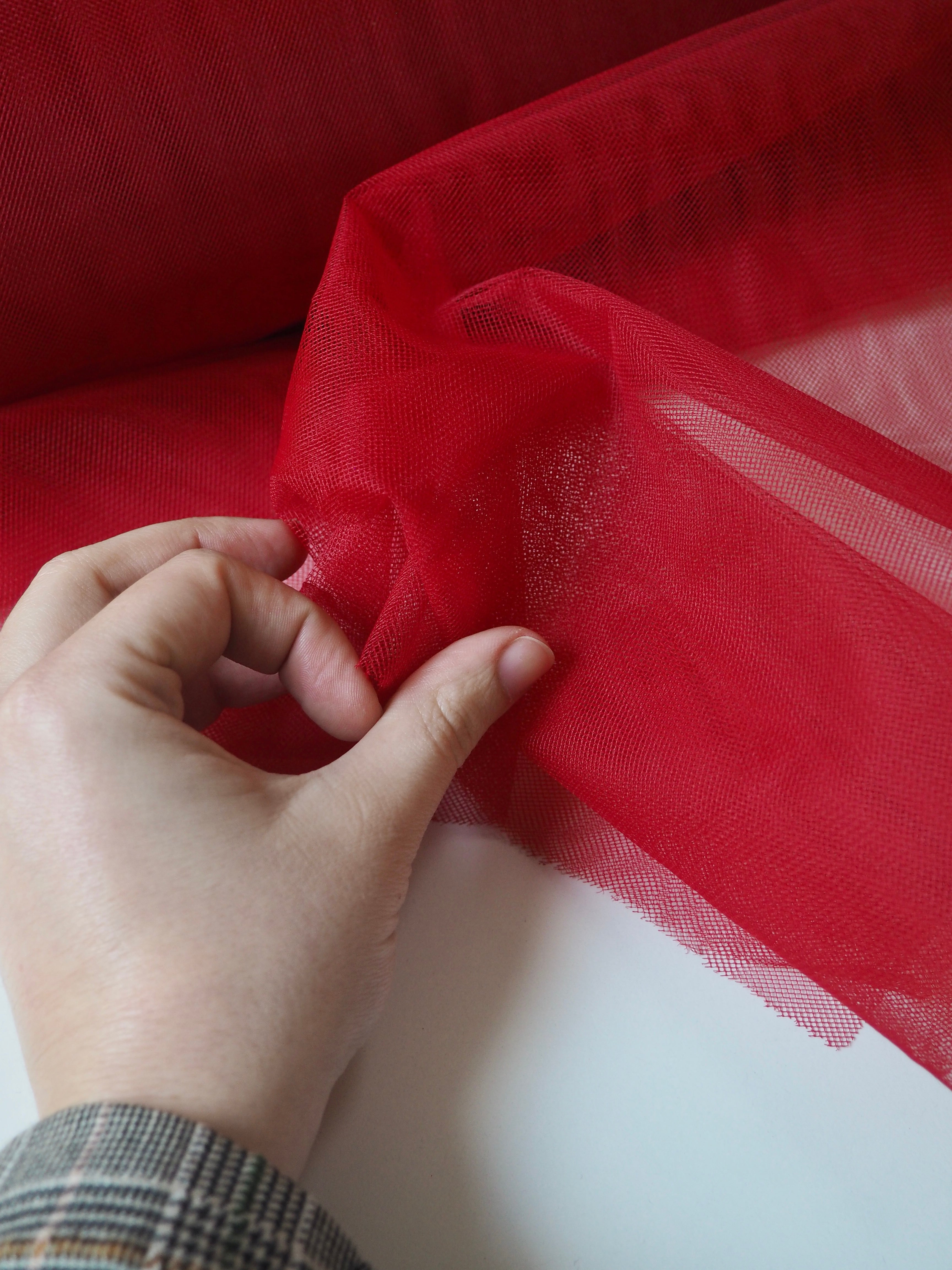 This ex-designer fabric is an extra wide tulle. It has a medium rigidity, with a dense but soft, structured handle. Woven from a network of tiny interconnecting hexagons which gives it the characteristic net like appearance. Lightweight with a crisp drape. Perfect for underskirts, crafting, and technical projects!