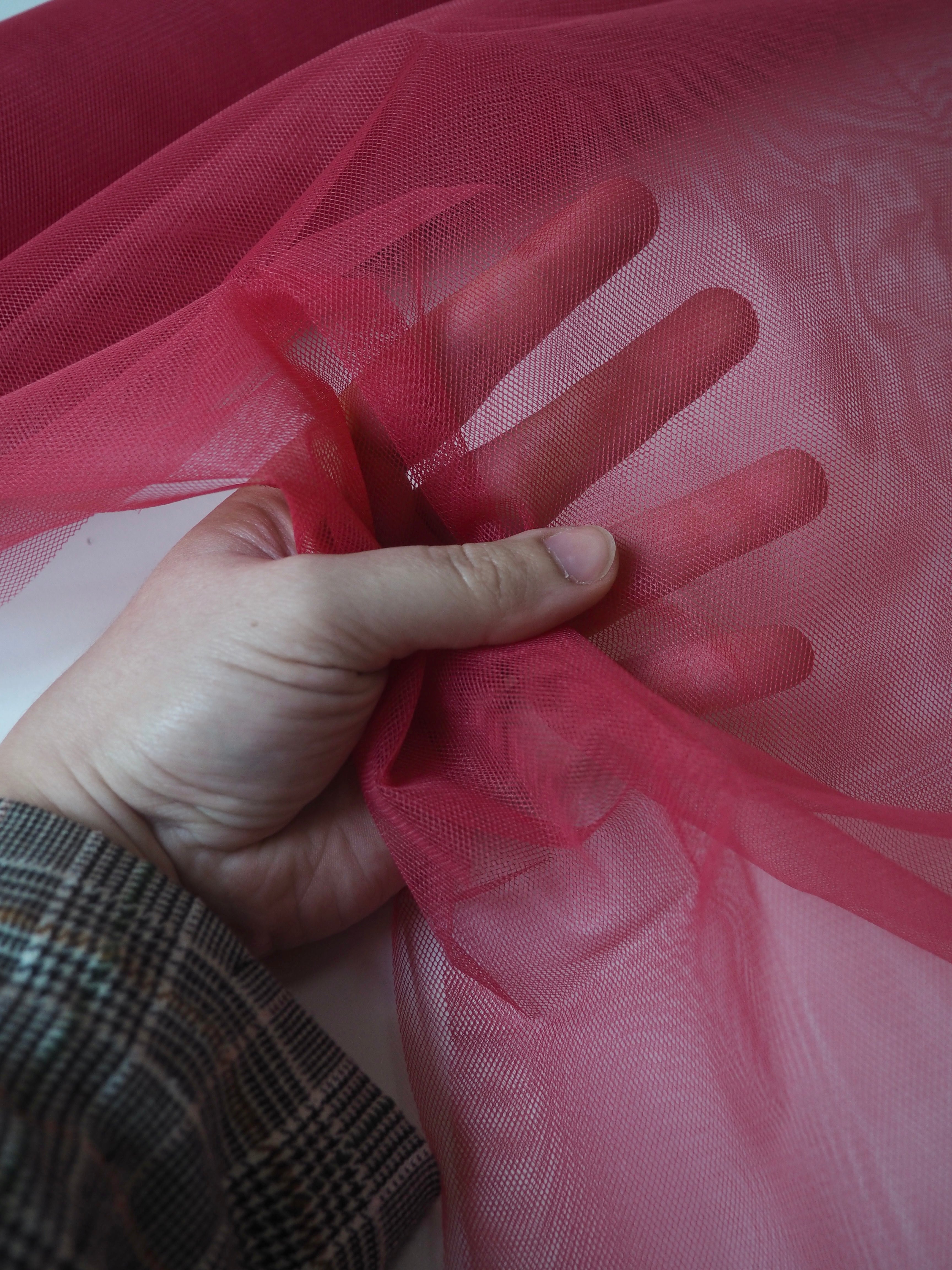 This ex-designer fabric is a wide tulle. It has a medium rigidity, with a dense but soft, structured handle. Woven from a network of tiny interconnecting hexagons which gives it the characteristic net like appearance. Lightweight with a crisp drape. Perfect for underskirts, crafting, and technical projects!