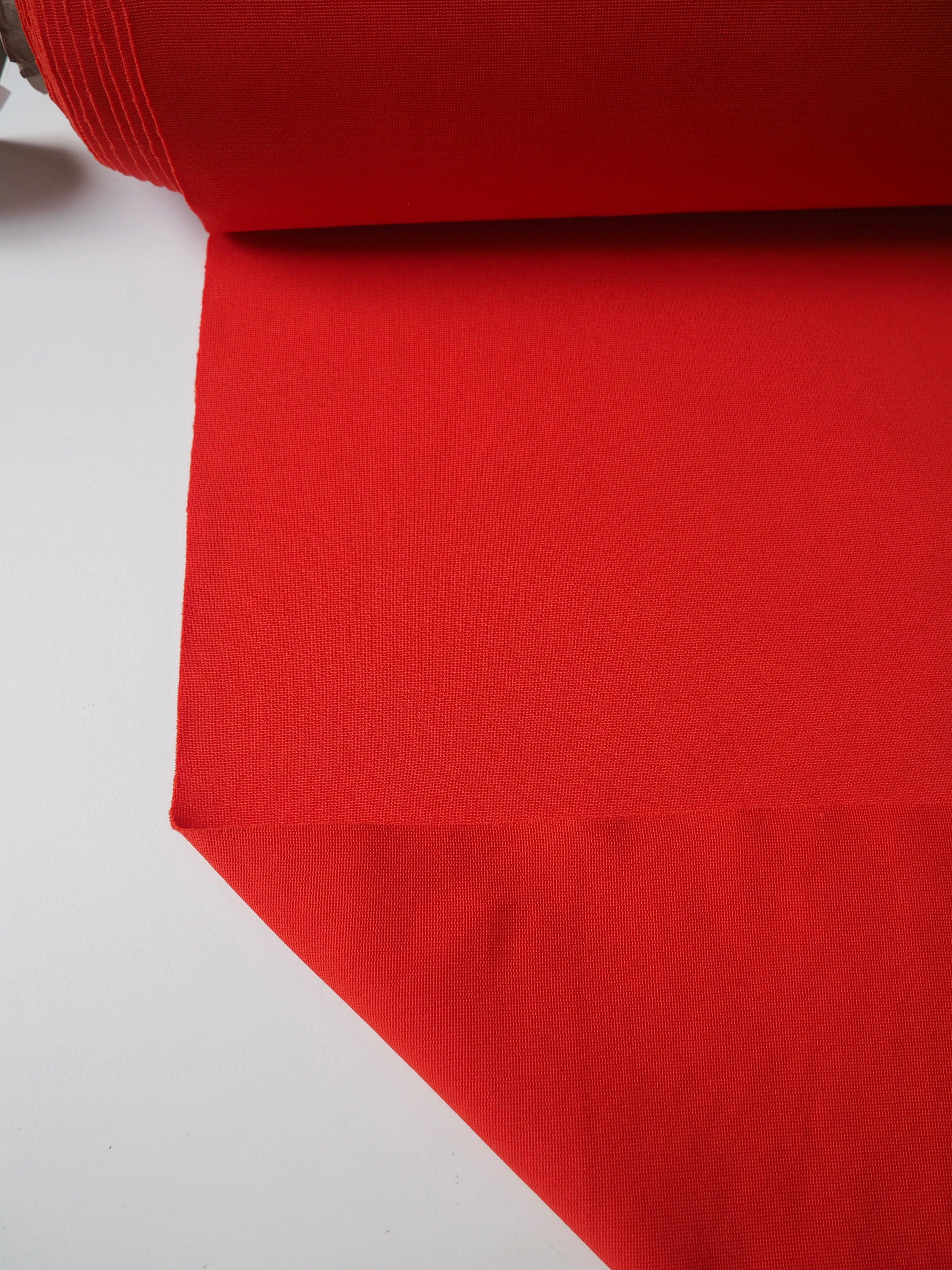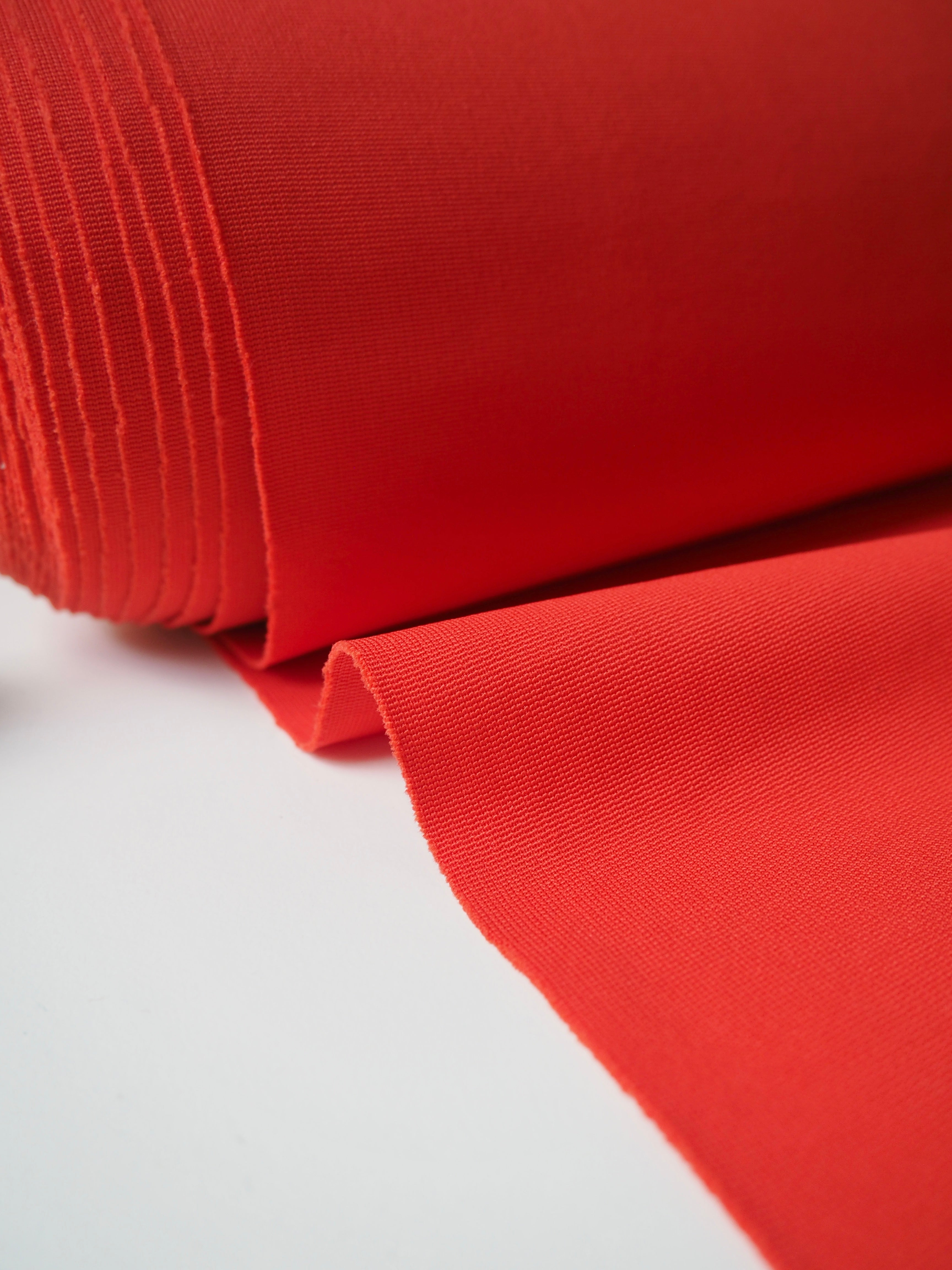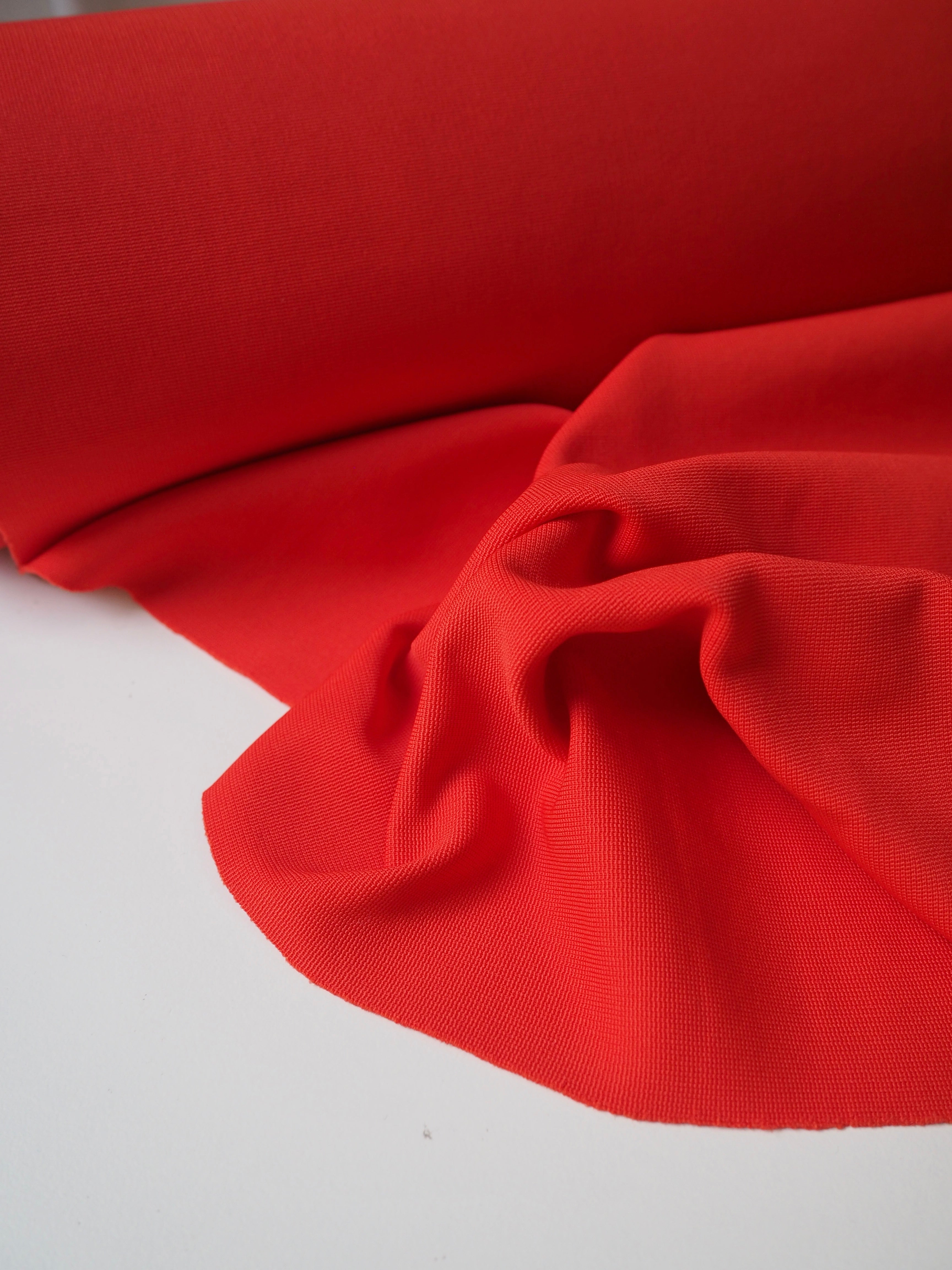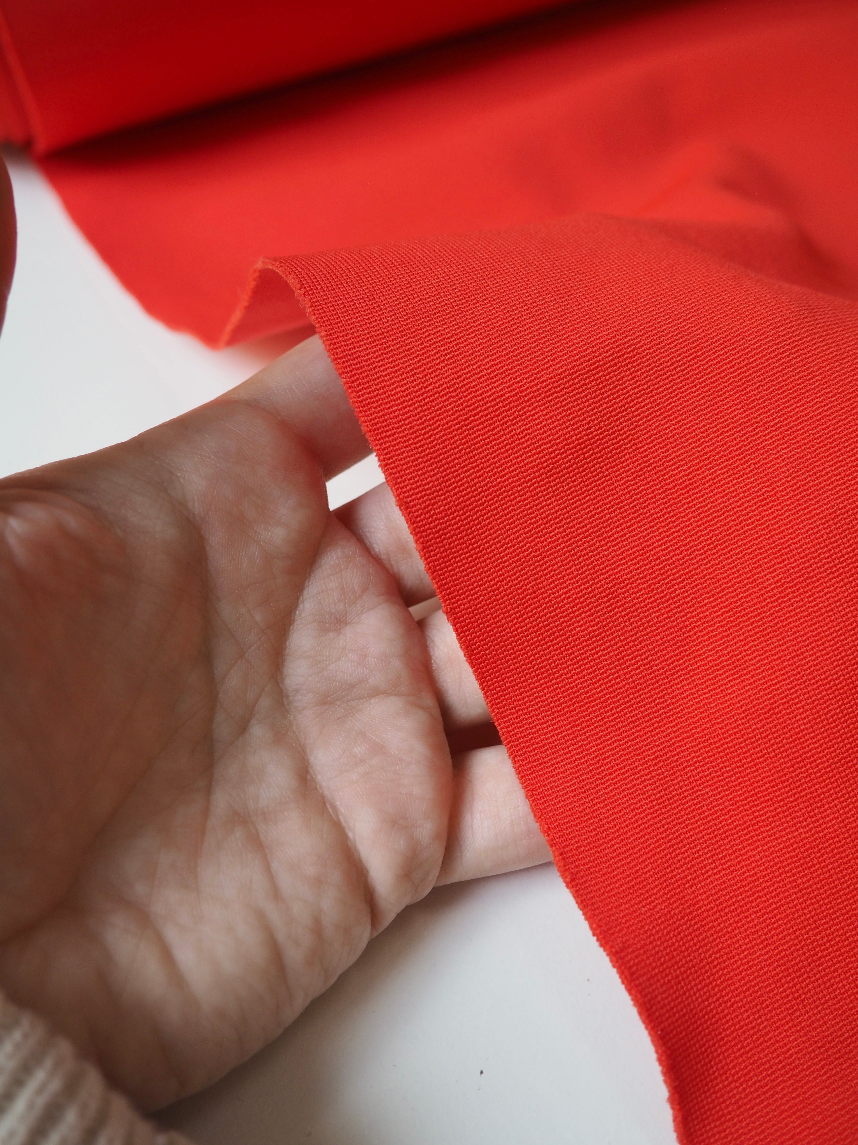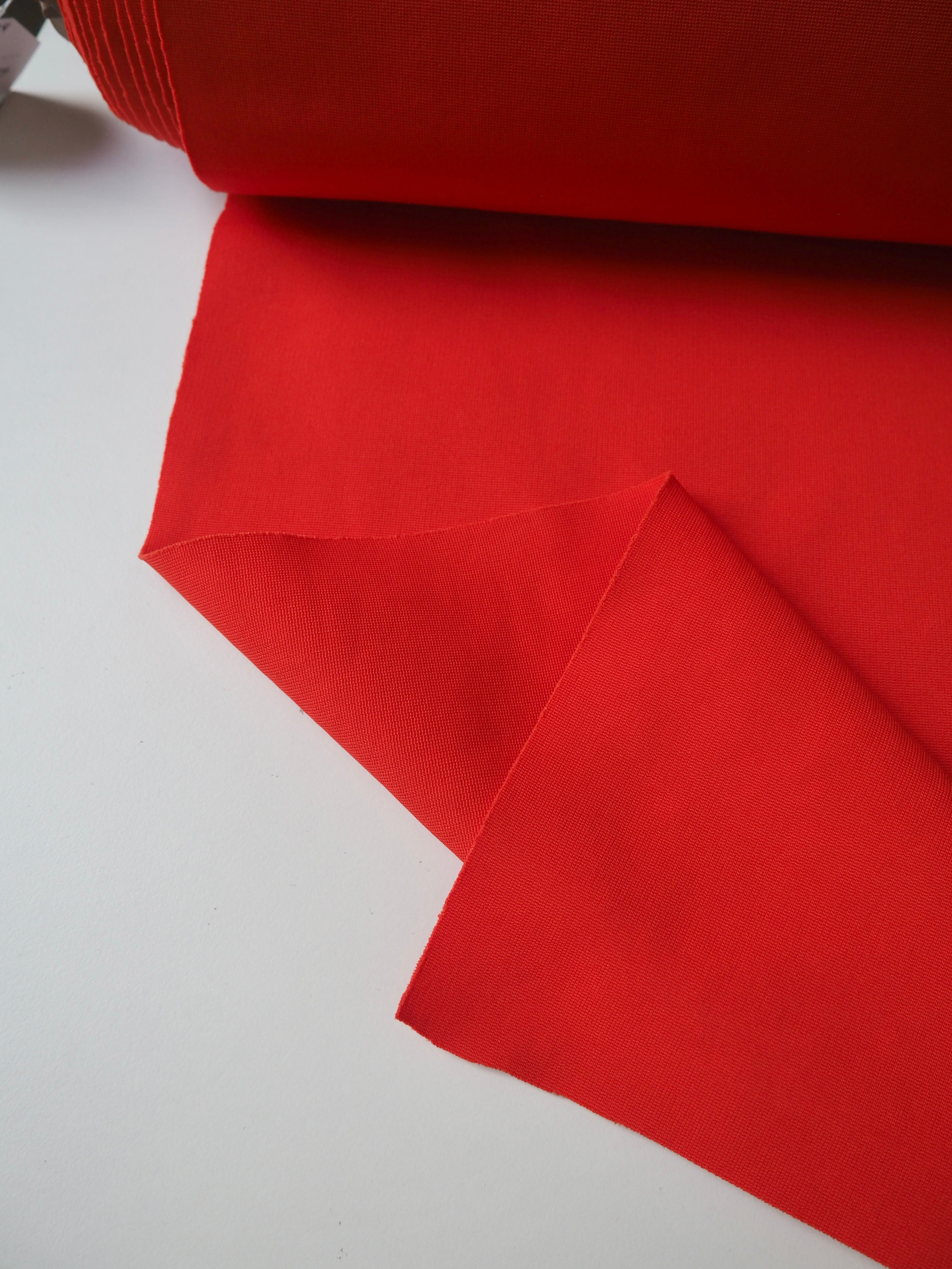 This ex-designer fabric is a jersey. Ponte di Roma is a double interlock jersey with a medium weight. It has a great structure and this one is sturdy. Has strong 30-40% stretch both ways, and great recovery. Perfect for bodycon dresses!