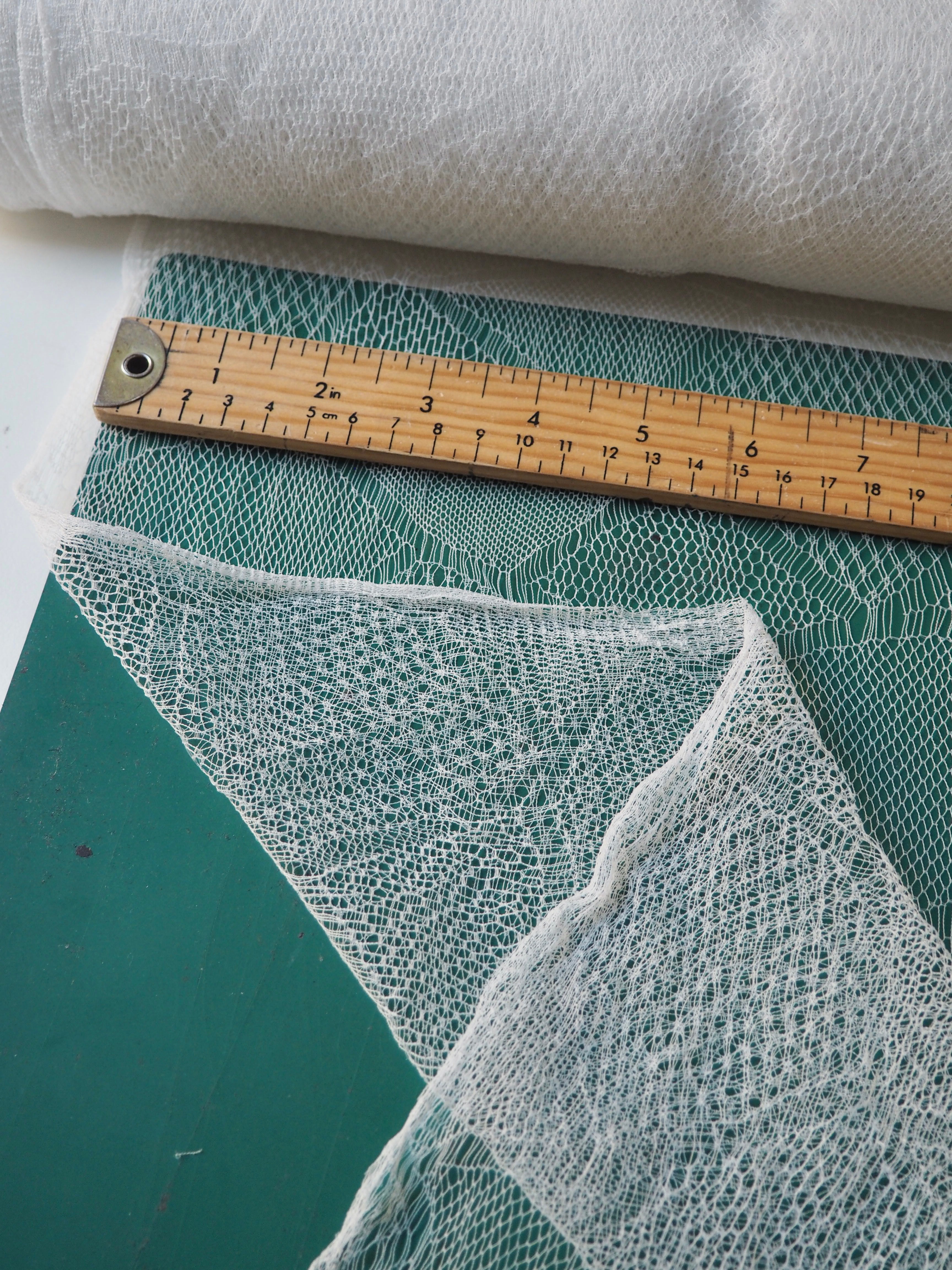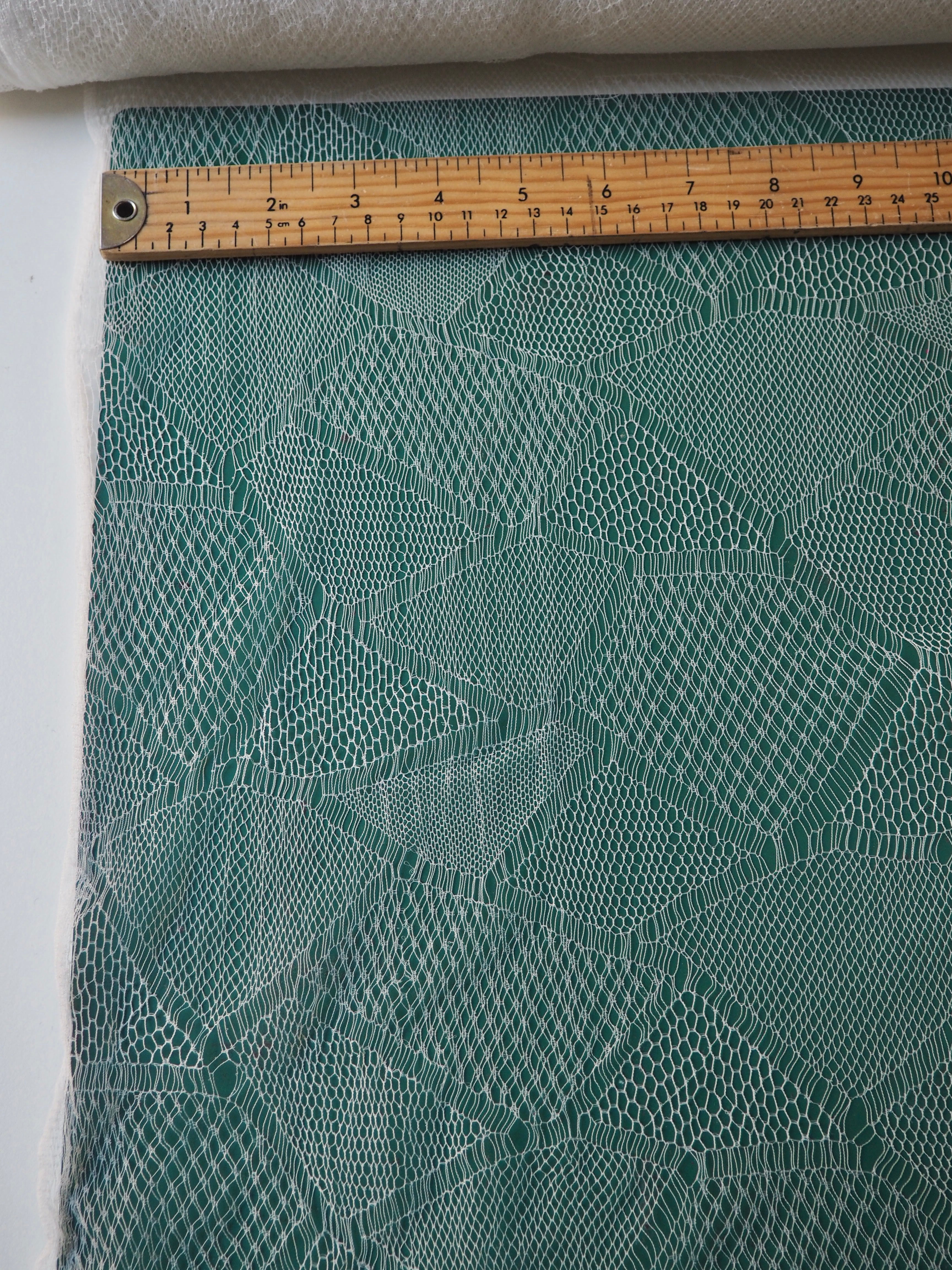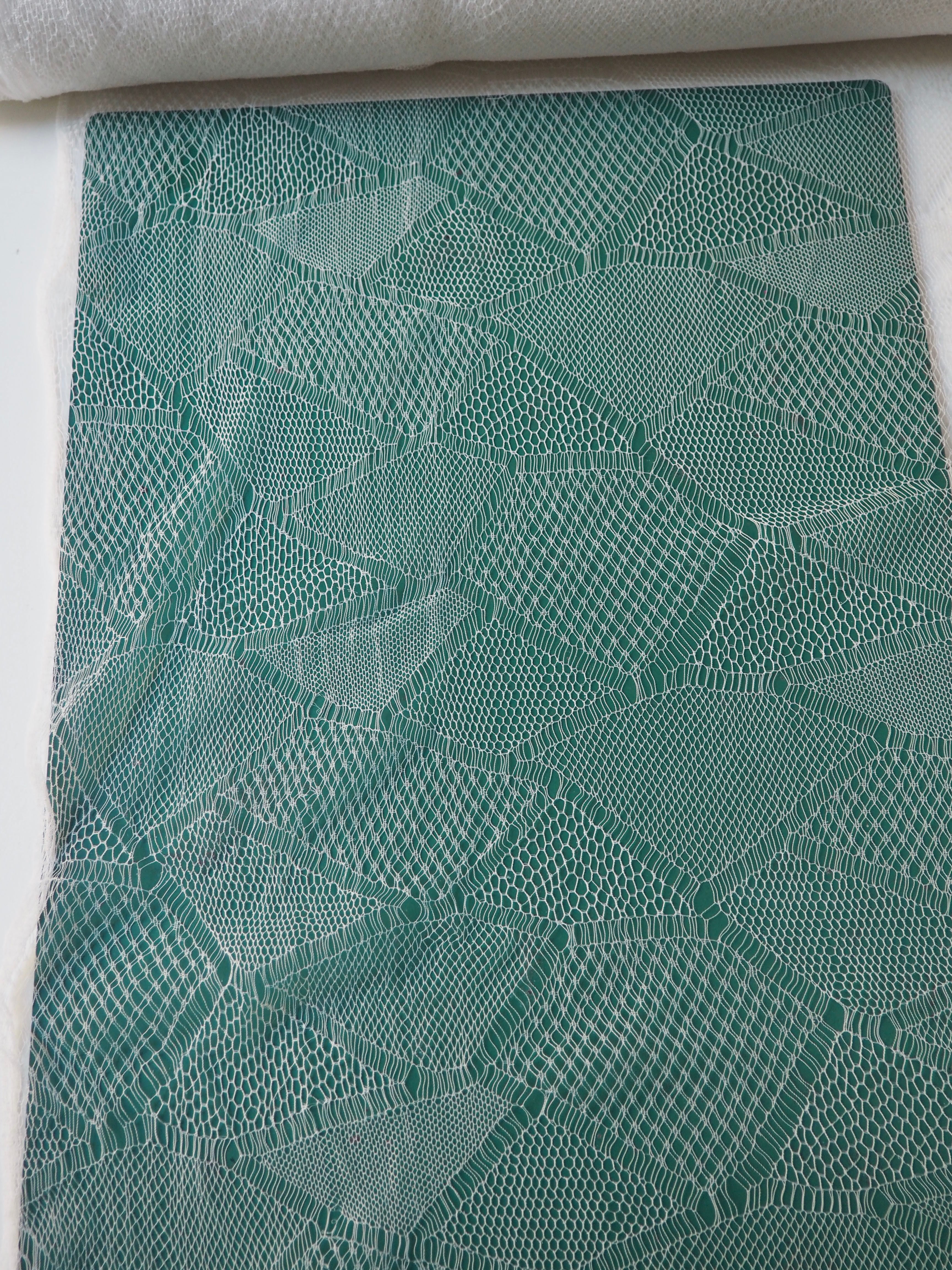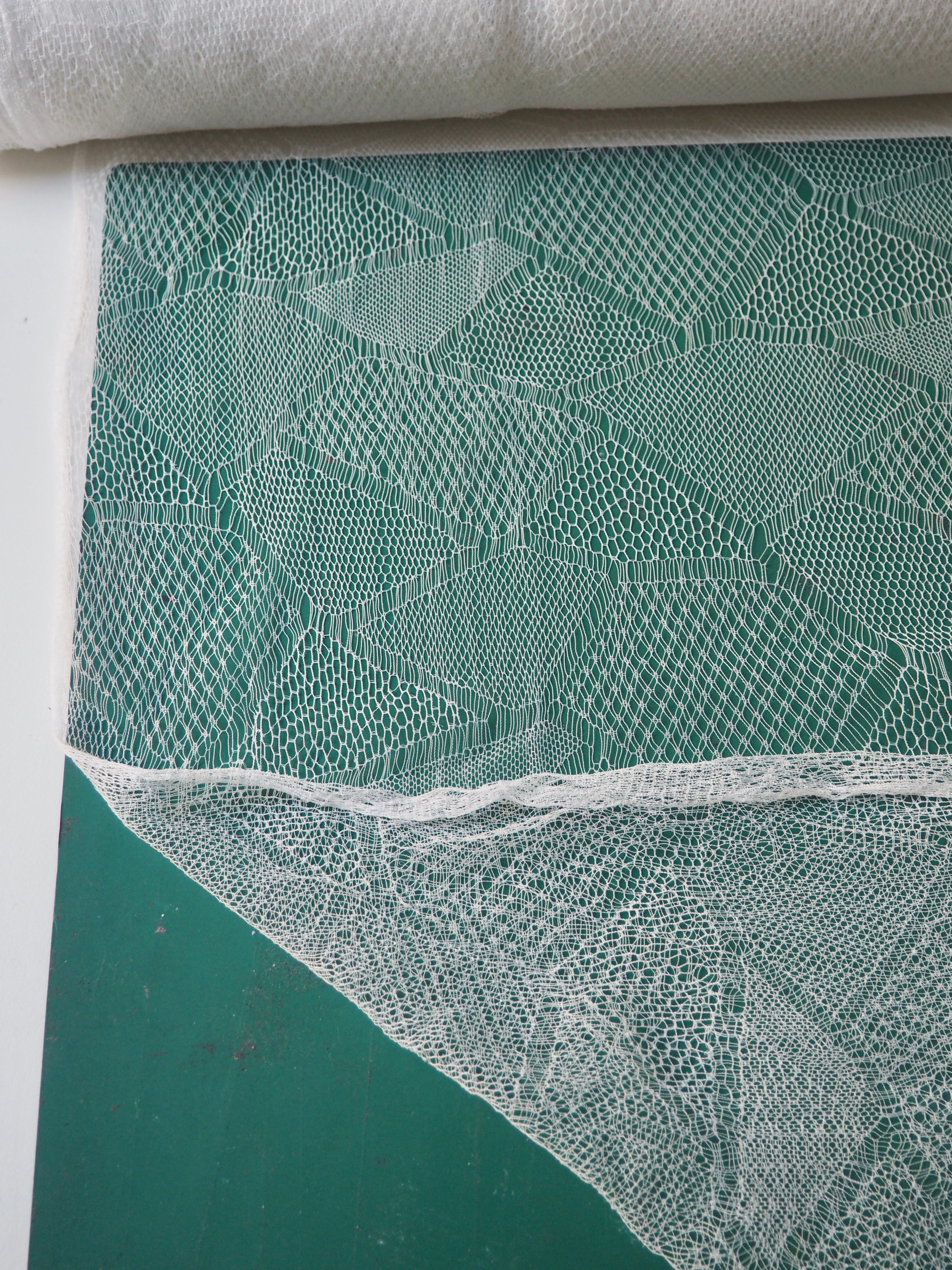 This ex-designer fabric is an exquisite lace. It is very delicate, with a triangle geometric design. In a soft white shade with a very slight sheen finish. It's super lightweight and has such a lovely soft handle. Drapes so well and barely feels like anything at all when holding! Would make a gorgeous dress or top overlay, or be great for hats or veils!
