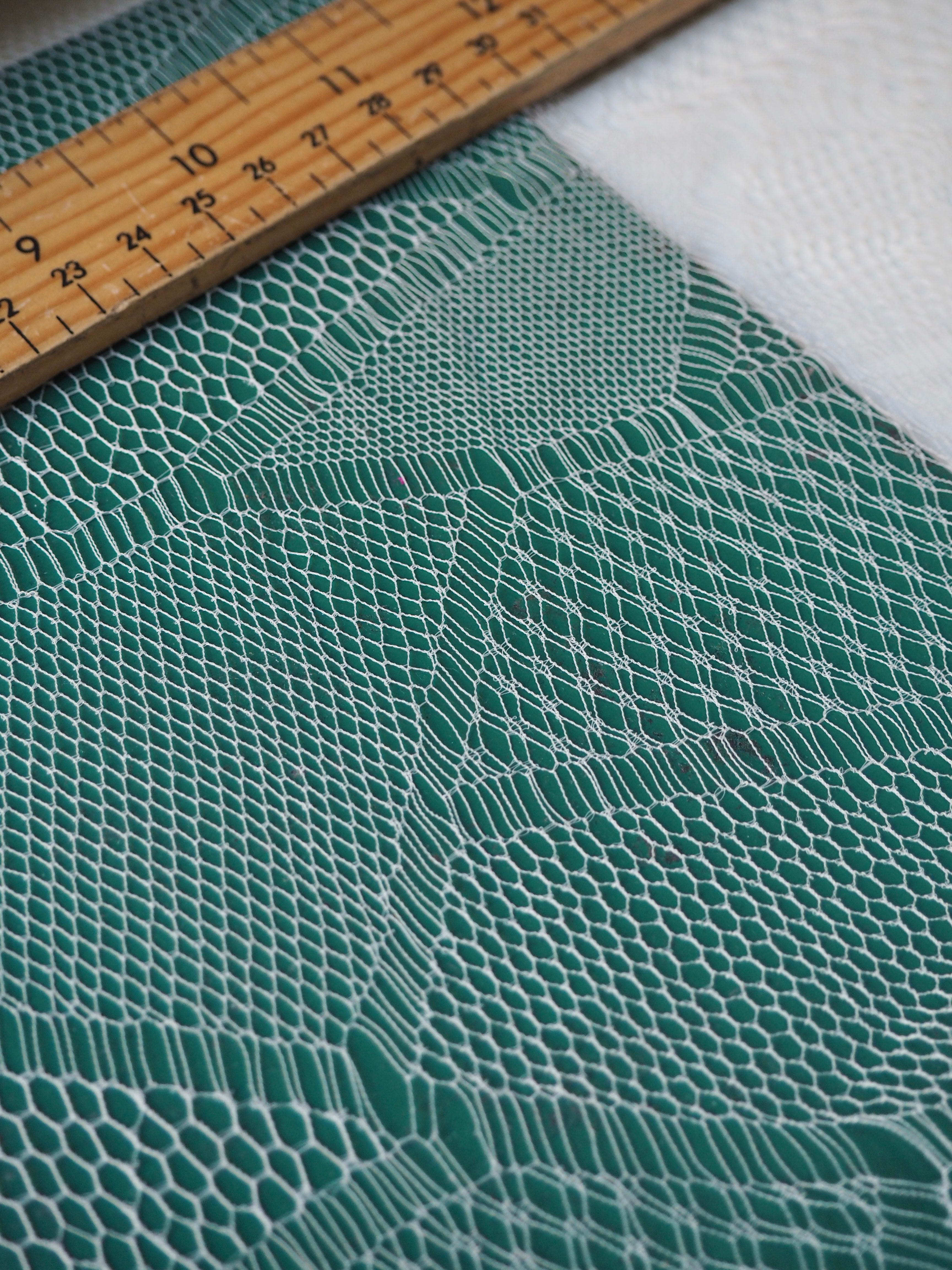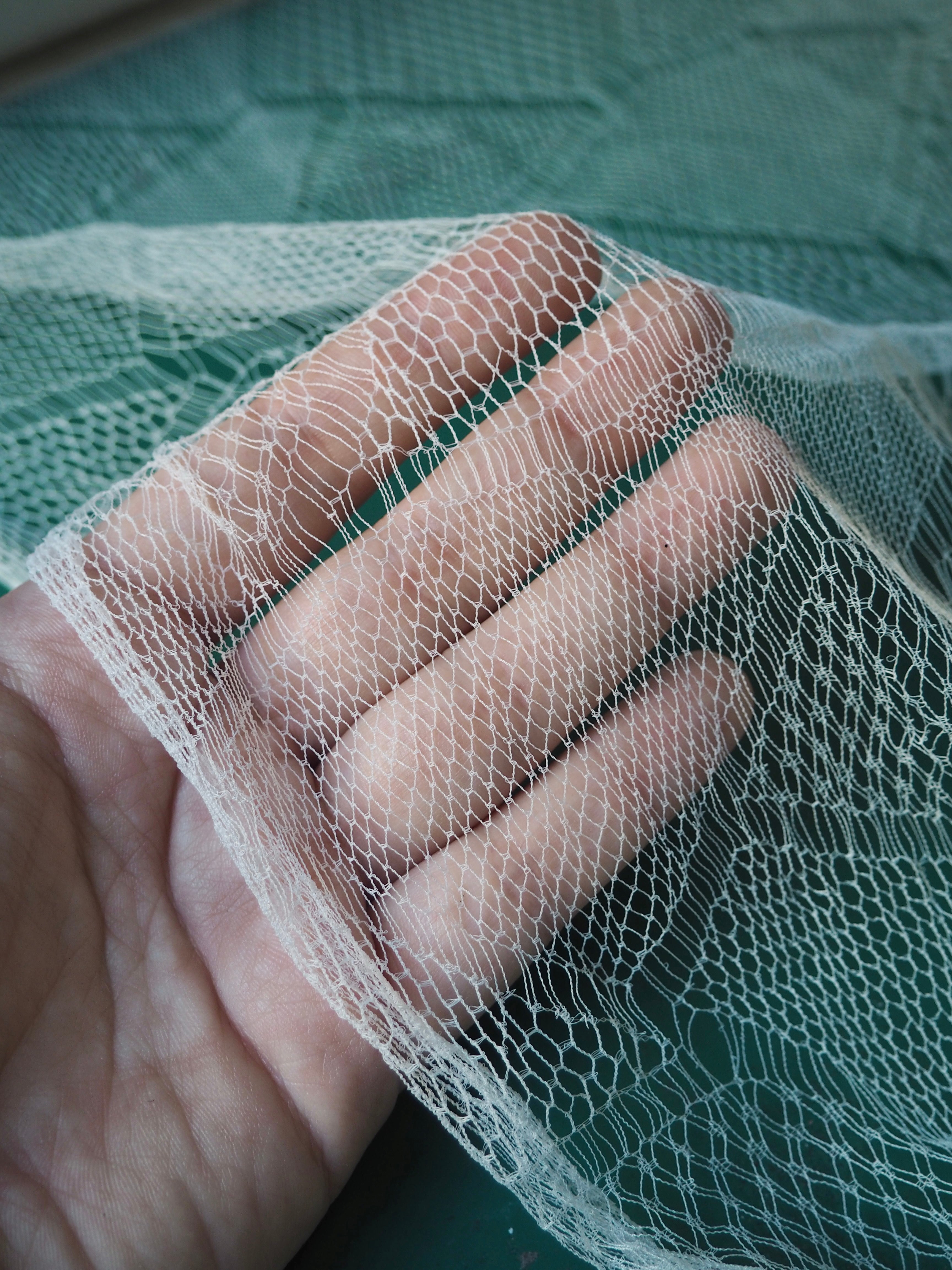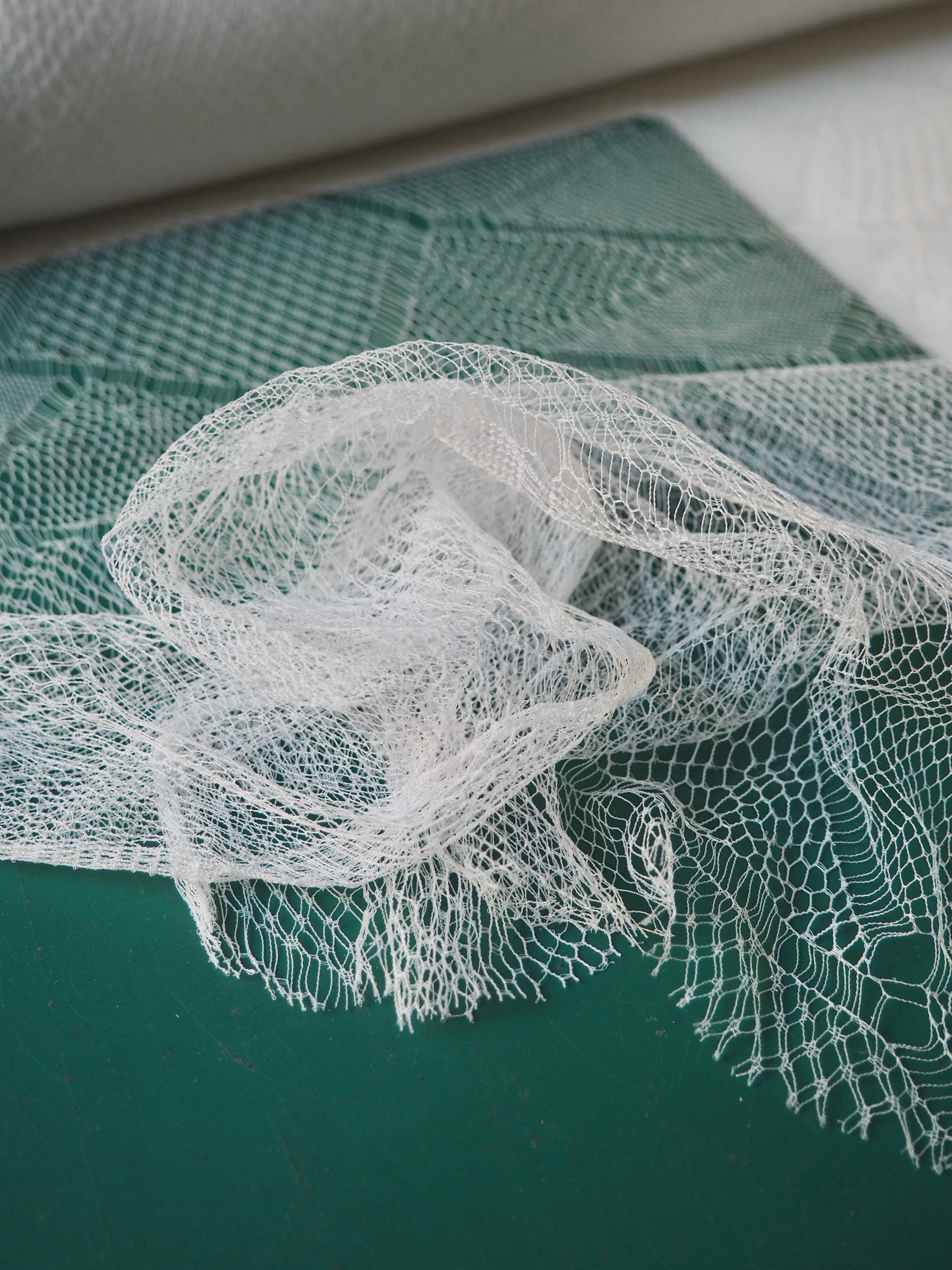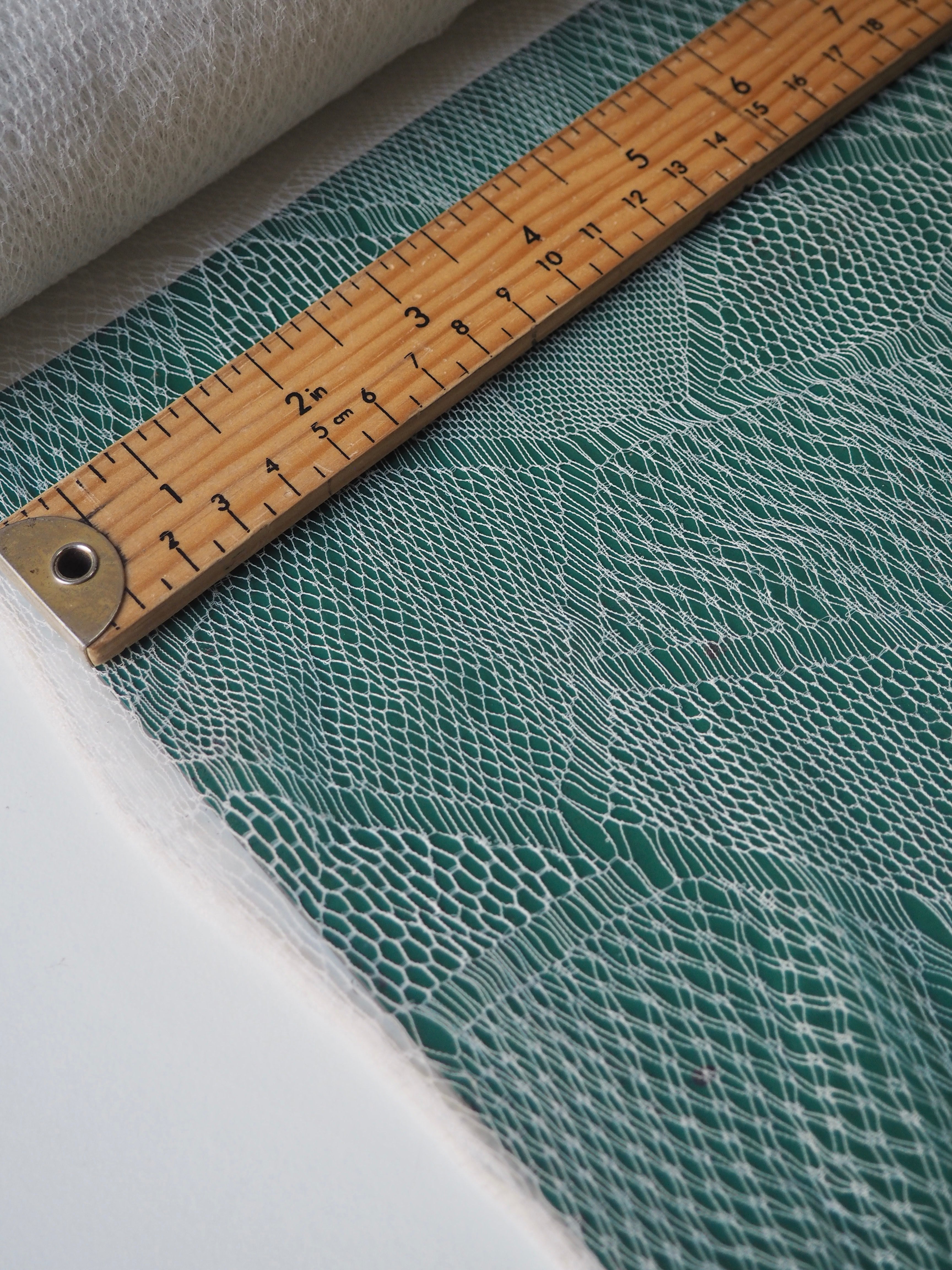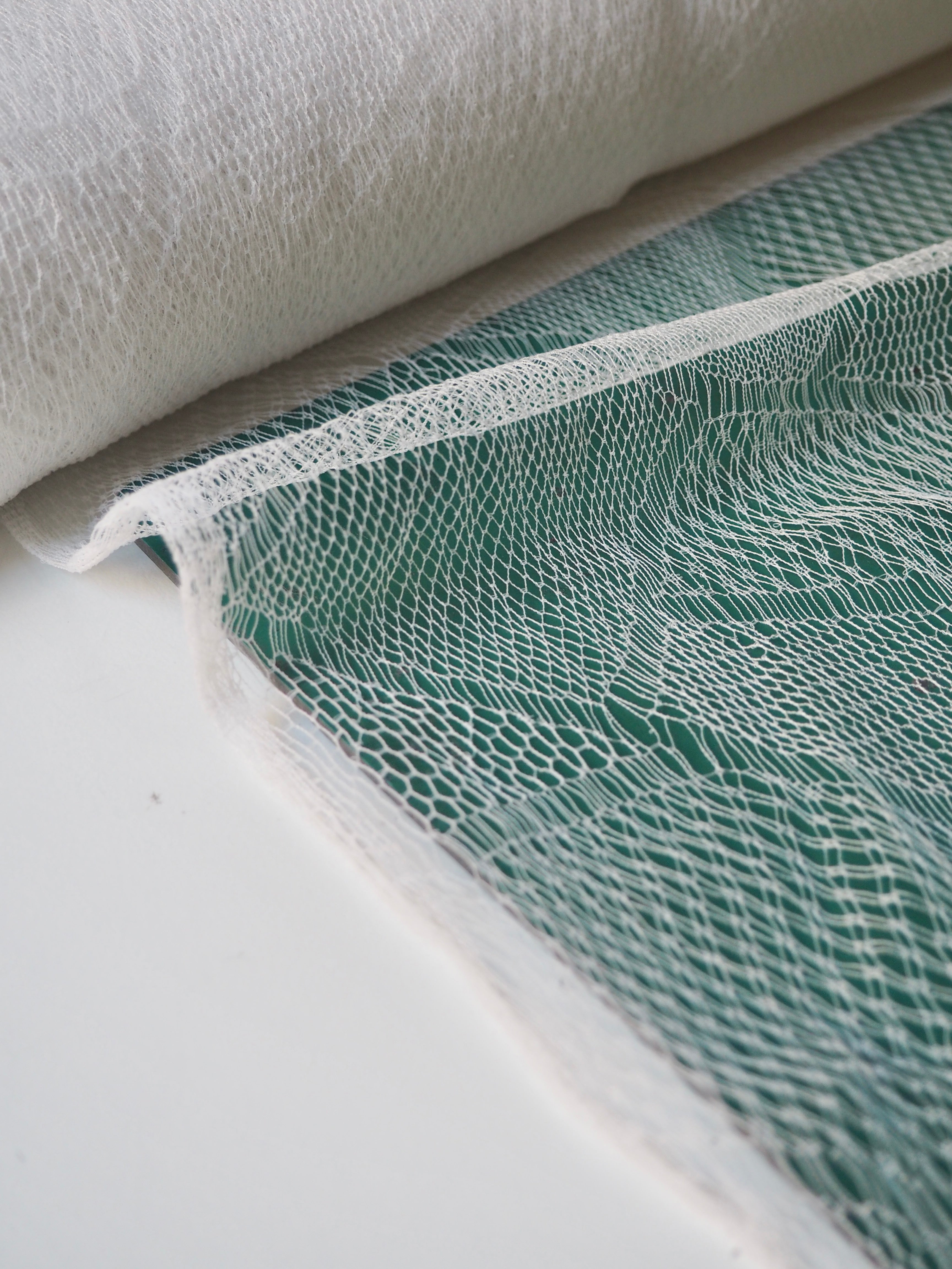 This ex-designer fabric is an exquisite lace. It is very delicate, with a triangle geometric design. In a soft white shade with a very slight sheen finish. It's super lightweight and has such a lovely soft handle. Drapes so well and barely feels like anything at all when holding! Would make a gorgeous dress or top overlay, or be great for hats or veils!