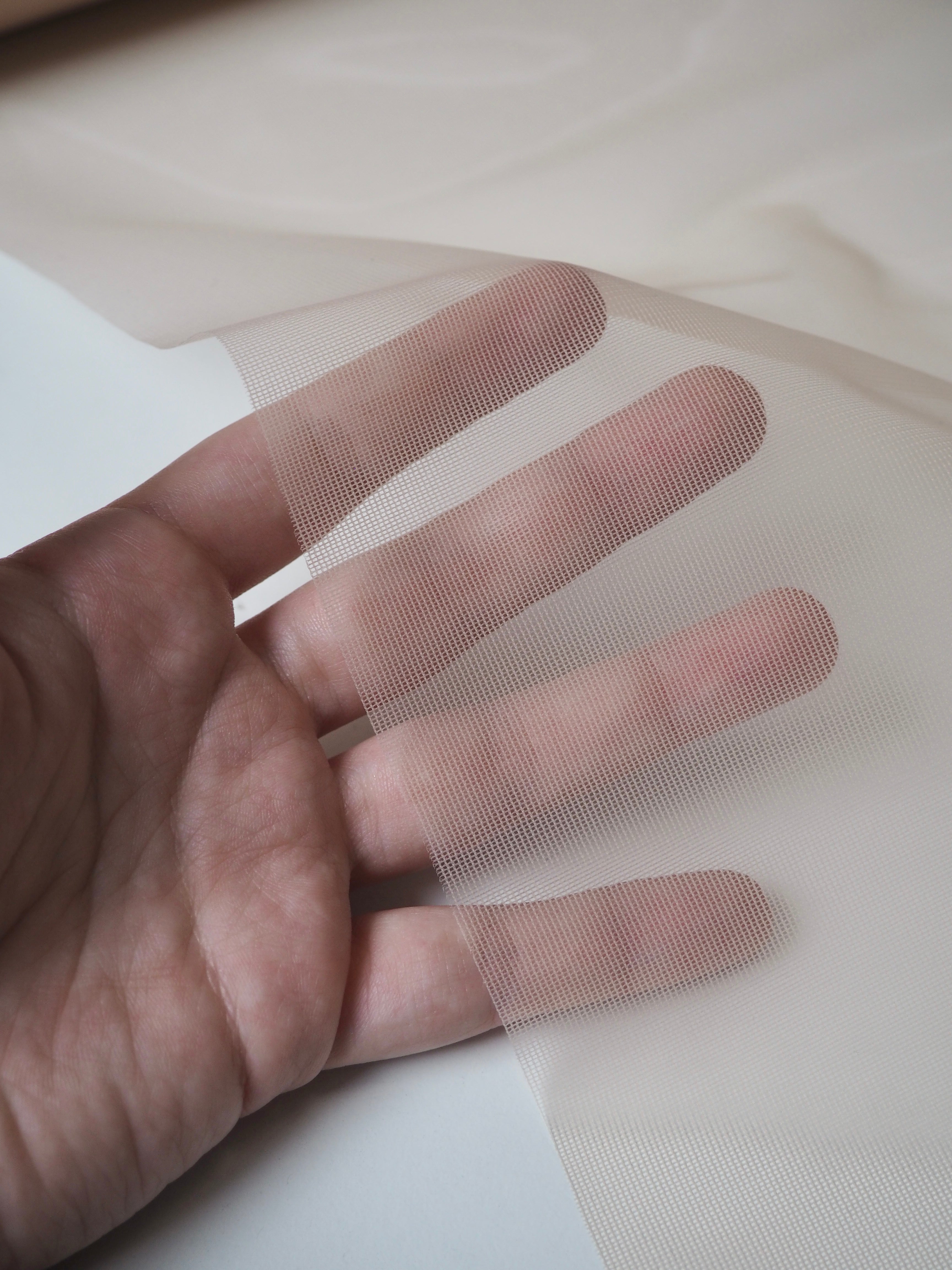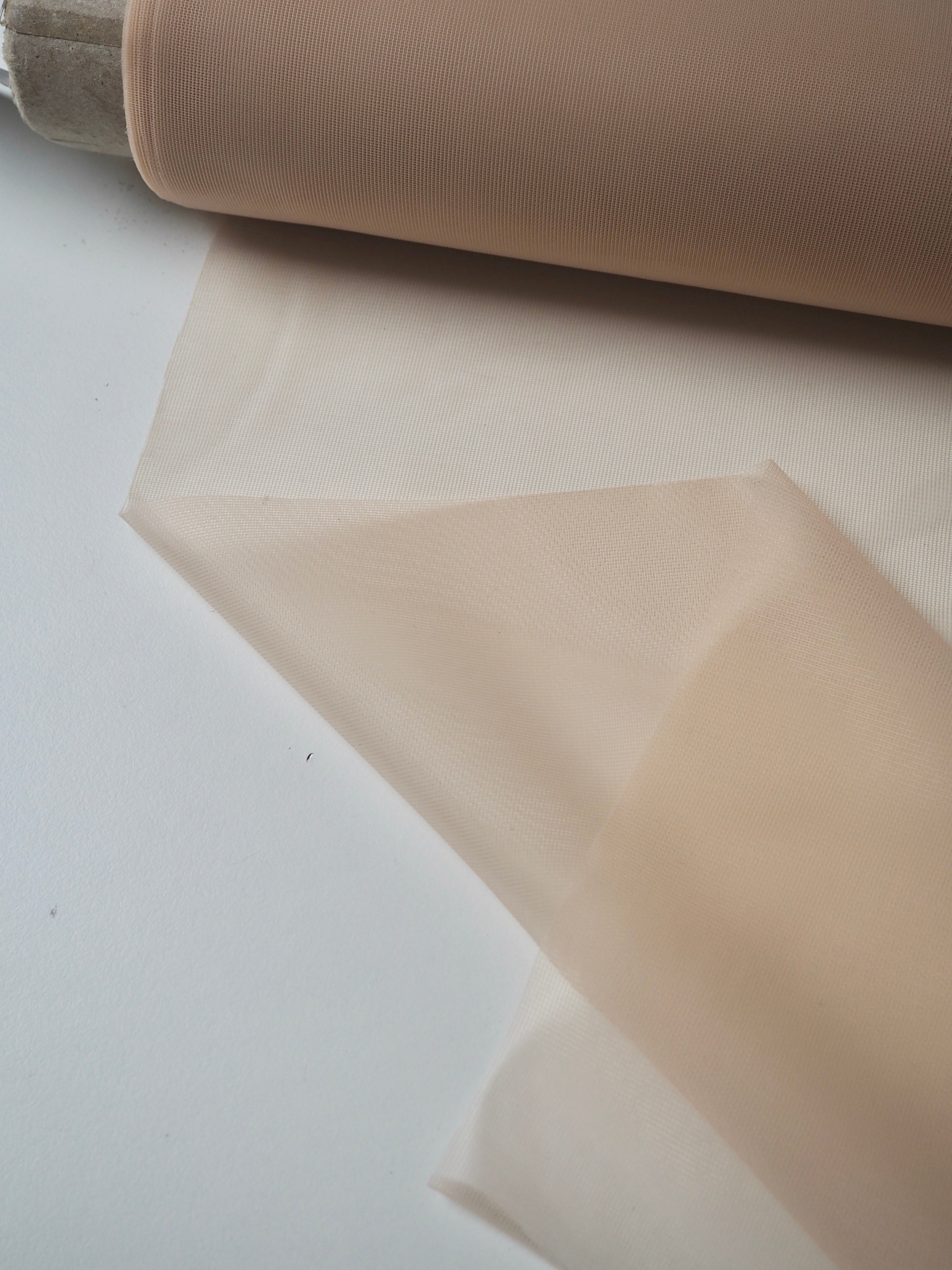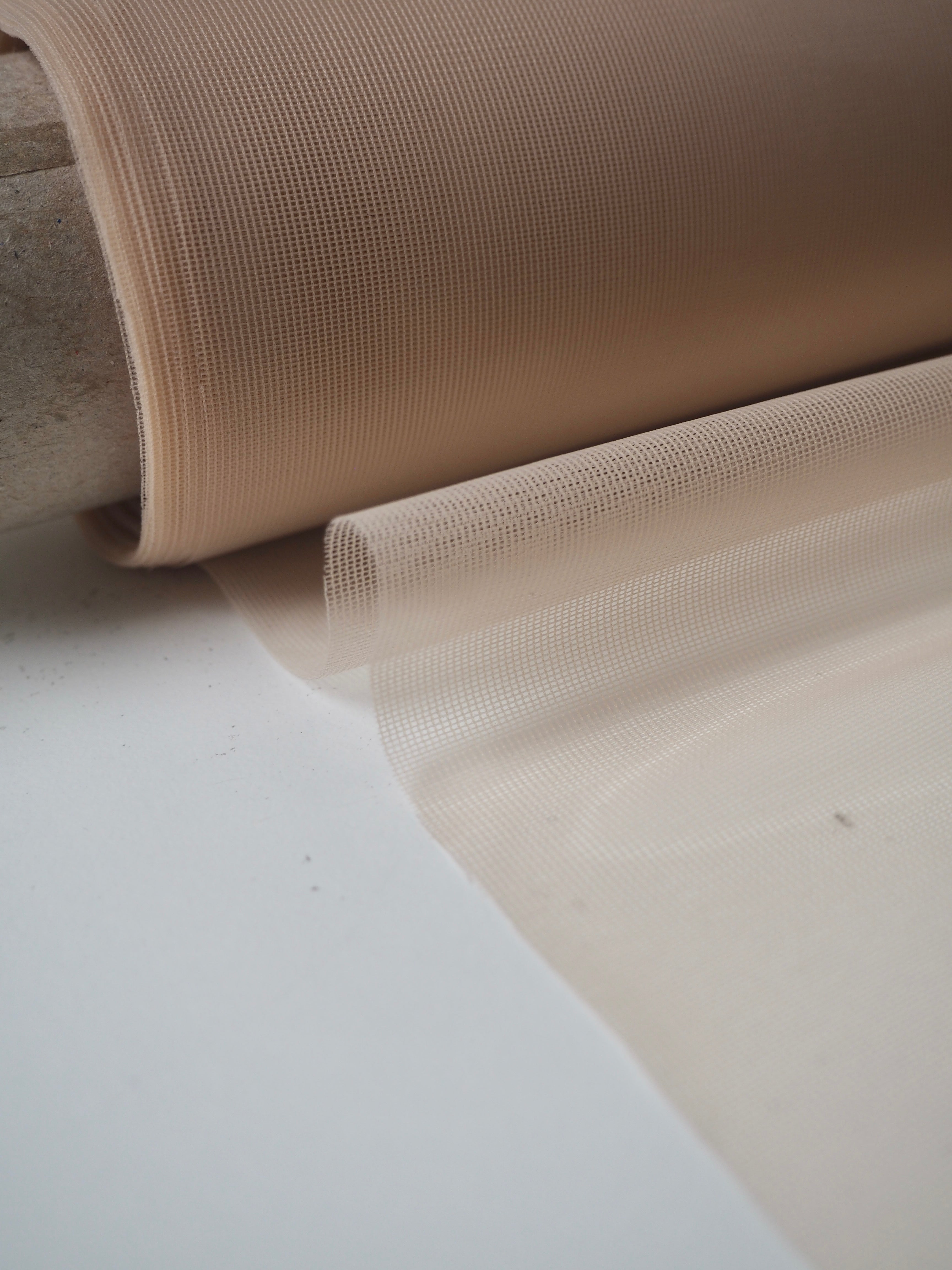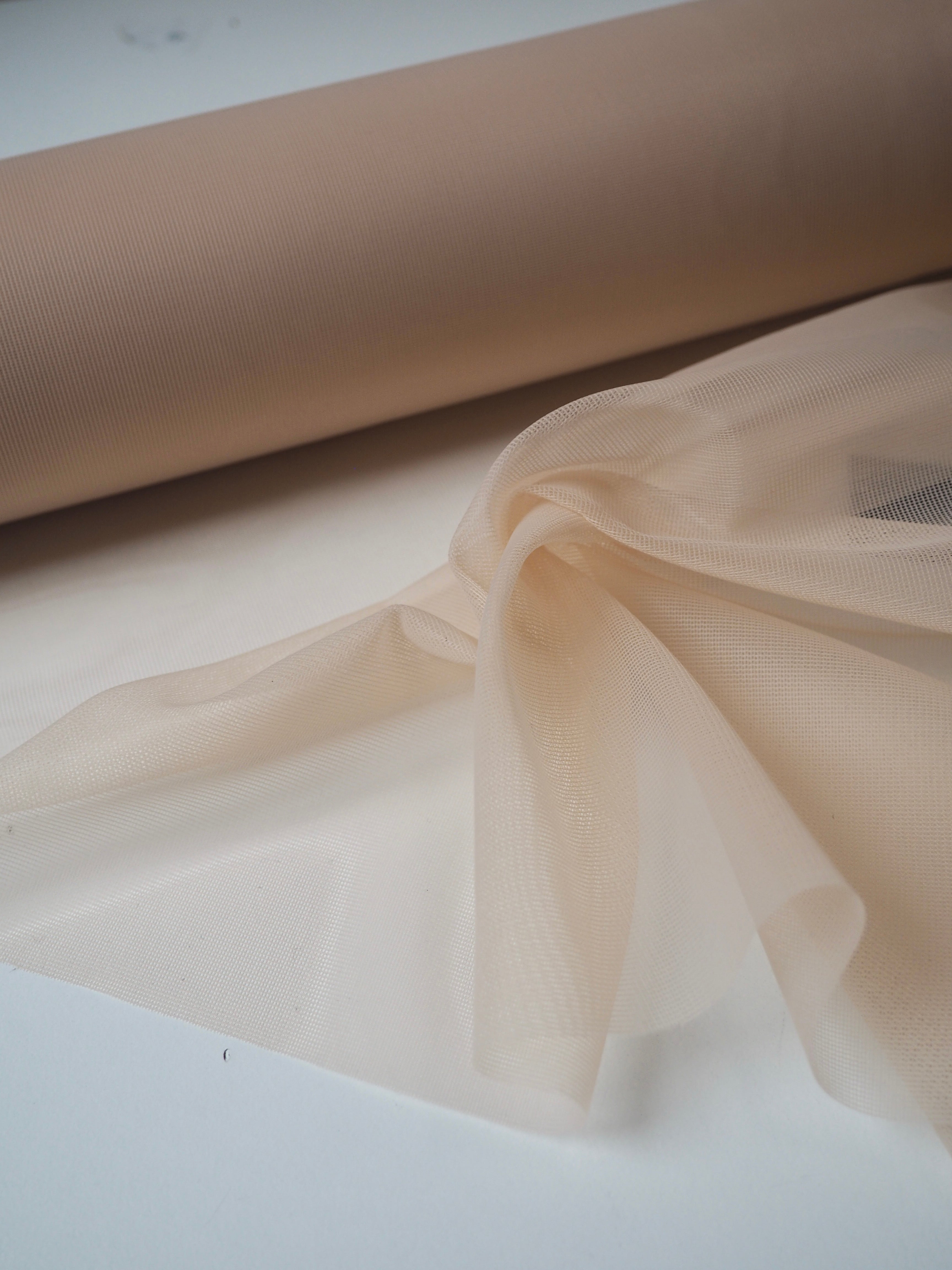 This ex-designer fabric is a stretch sheer cup lining. Sheer bra cup lining is for lining bra cups under lace or other delicate fabrics It's lightweight but strong, with a mesh like structure and soft but slick handle. You can double it as the main fabric in sheer cup bras too. This one doesn't have any stretch. Perfect for our lingerie patterns, and we even have bra finding kits!