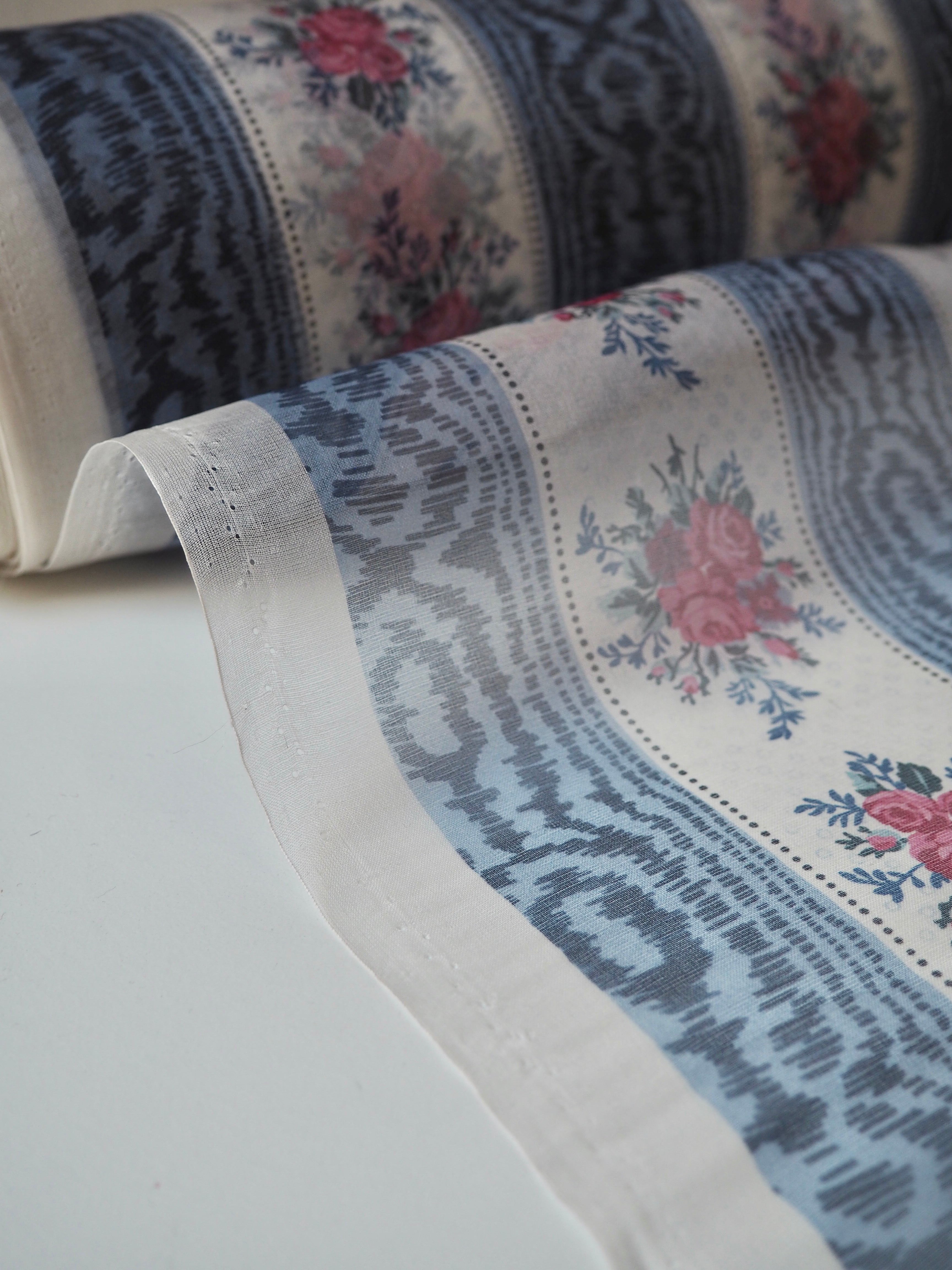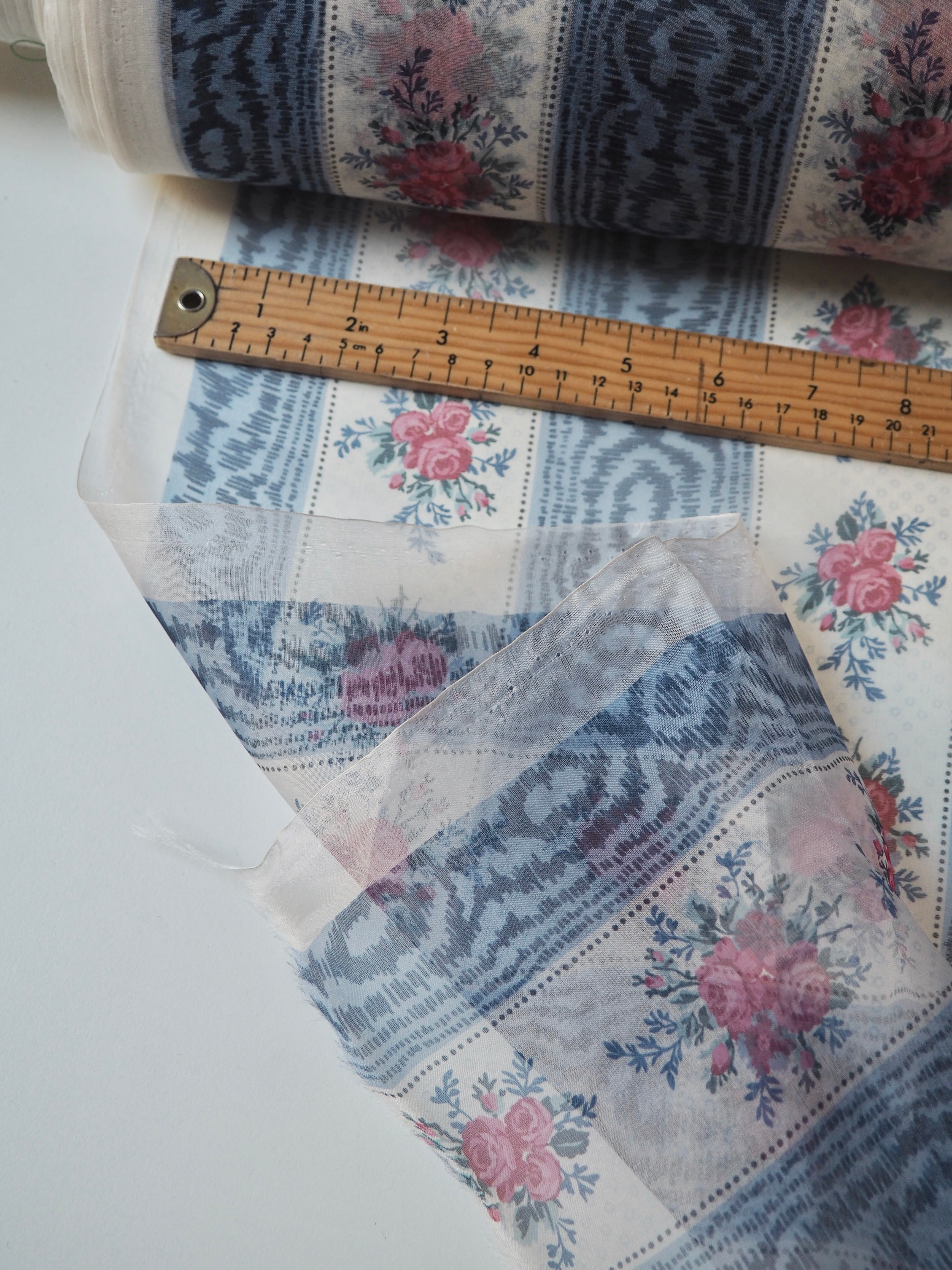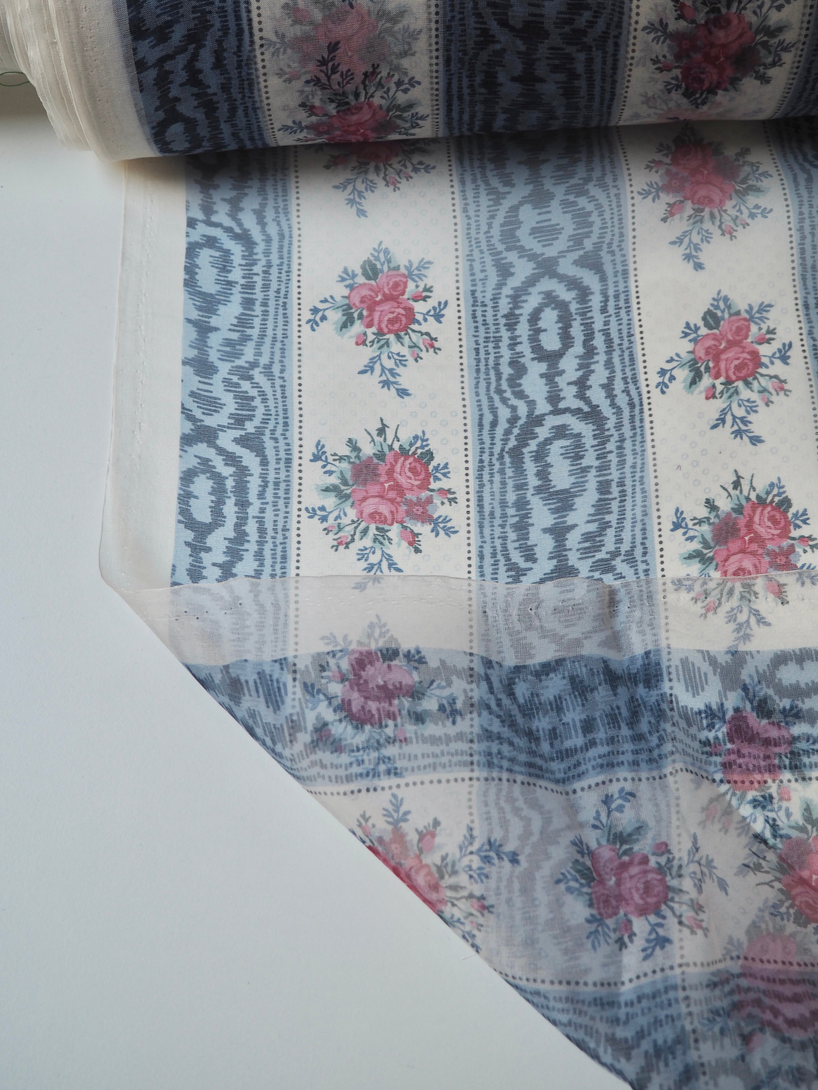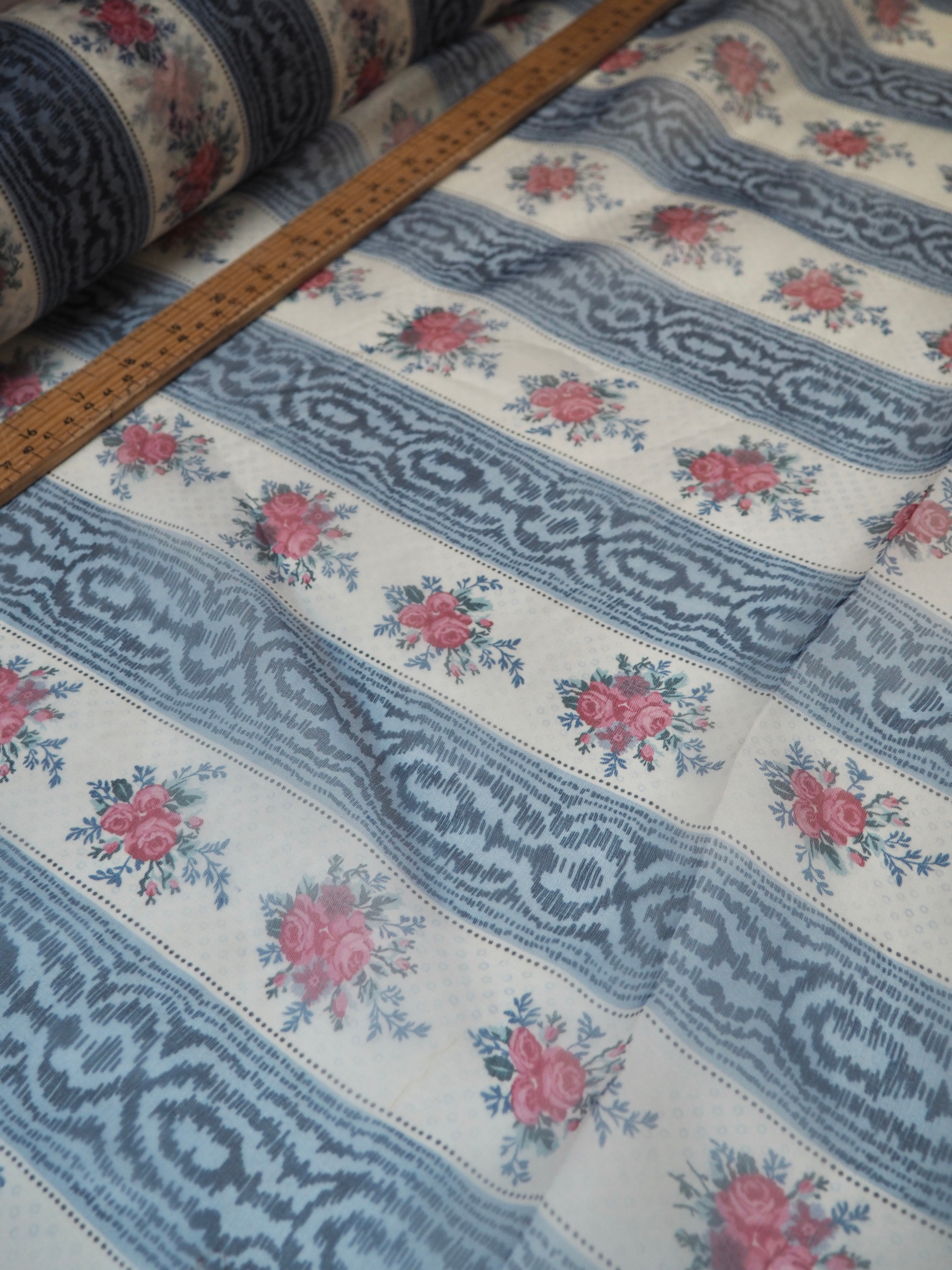 This ex-designer fabric is a silk organza. Blue moiré and floral stripes alternate into this interesting and nostalgic printed organza. It was a bespoke print for the London-based designer. It has a beautiful sheen finish that catches the light as it moves. Sheer, with a luxurious handle and lovely structure. Perfect for use in occasion wear, and it stands away from the body really well. Also great for simple tops, sheer scrunchies, and overlays!