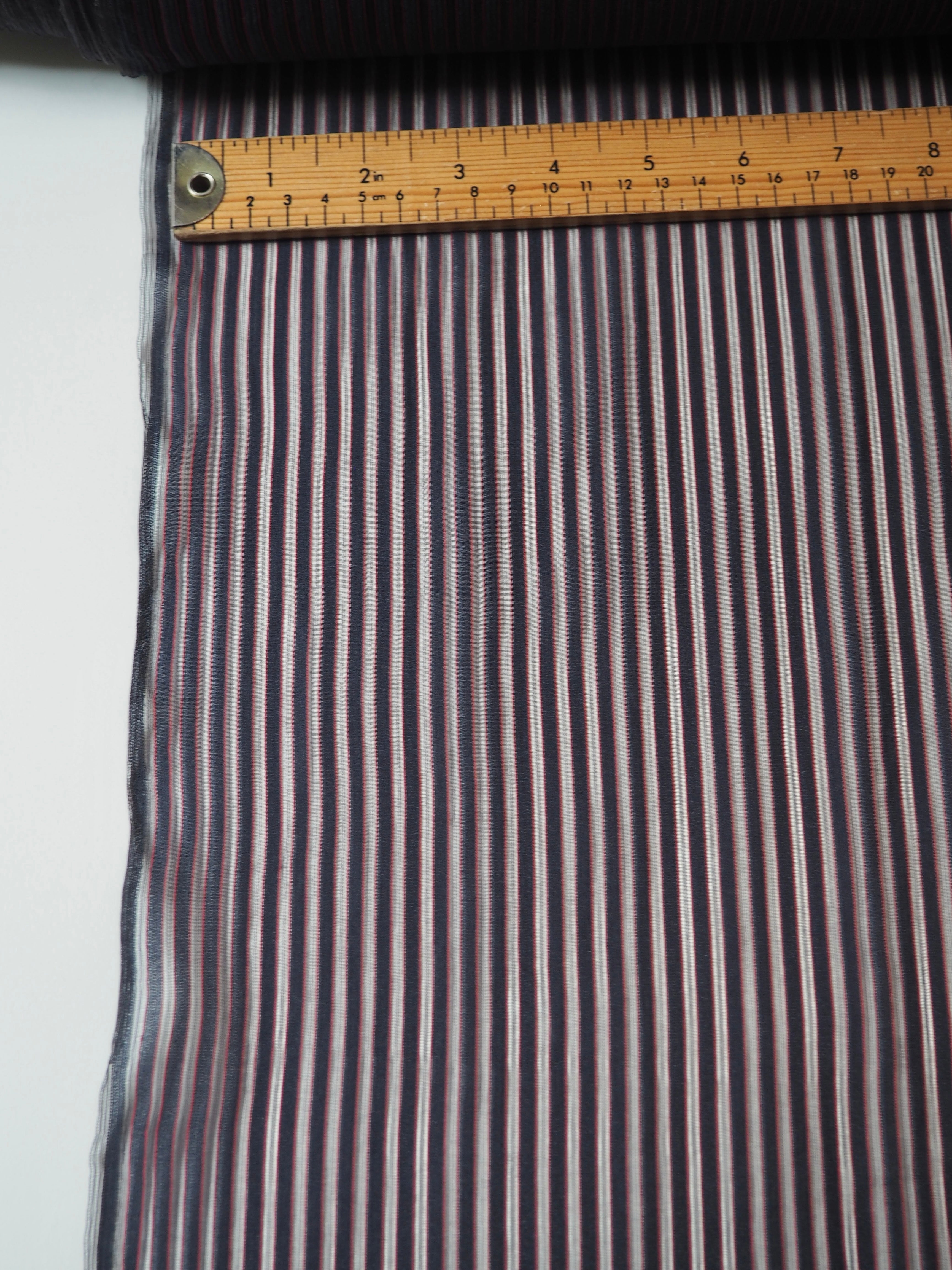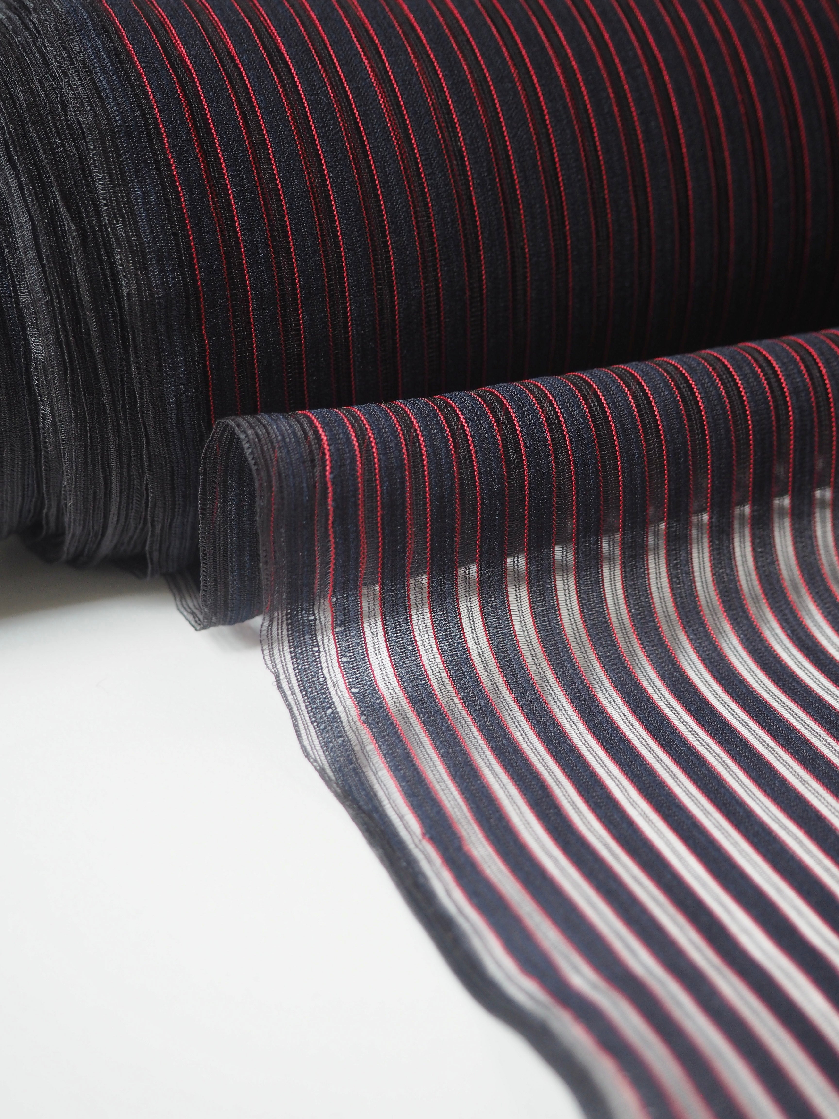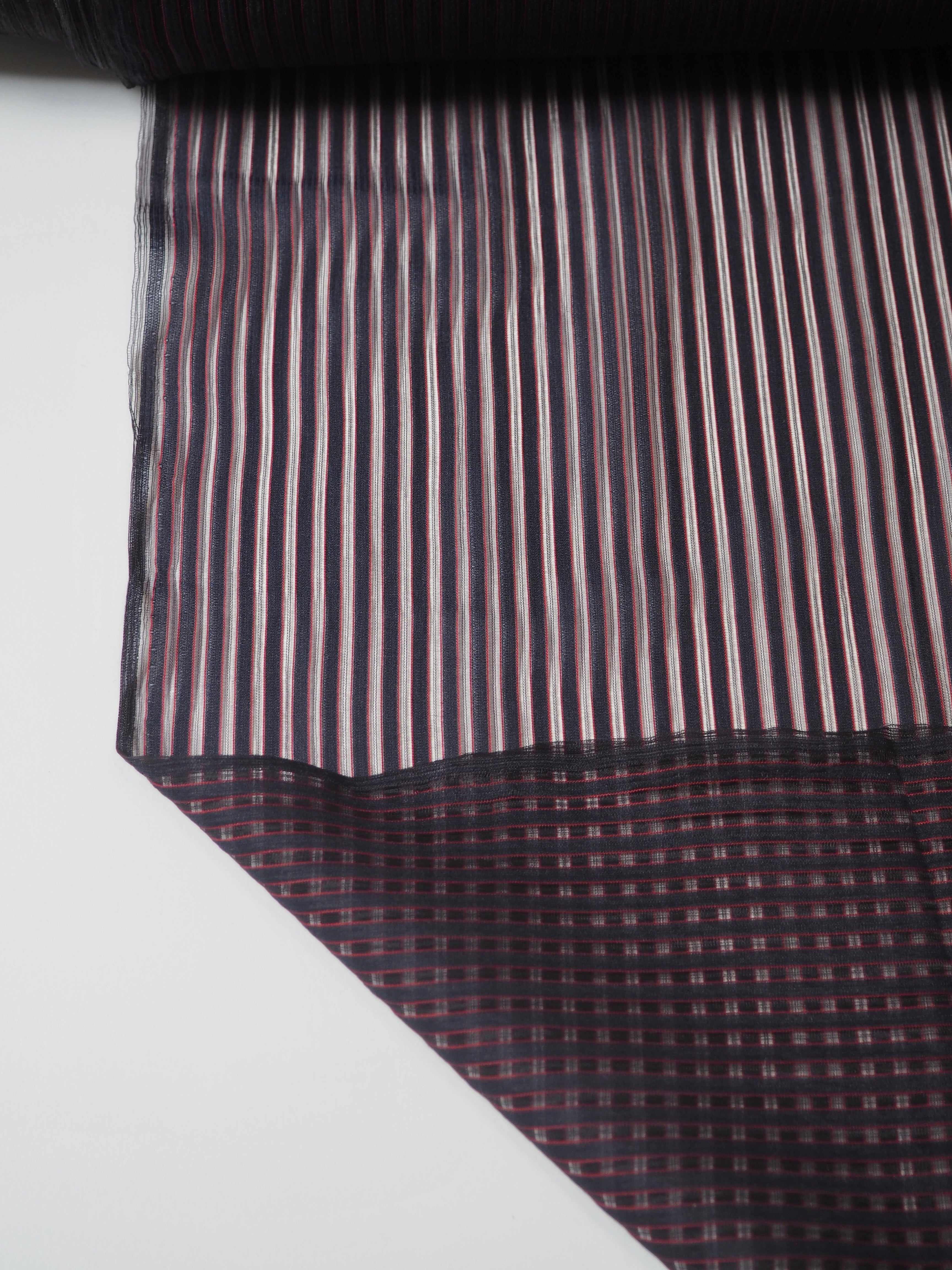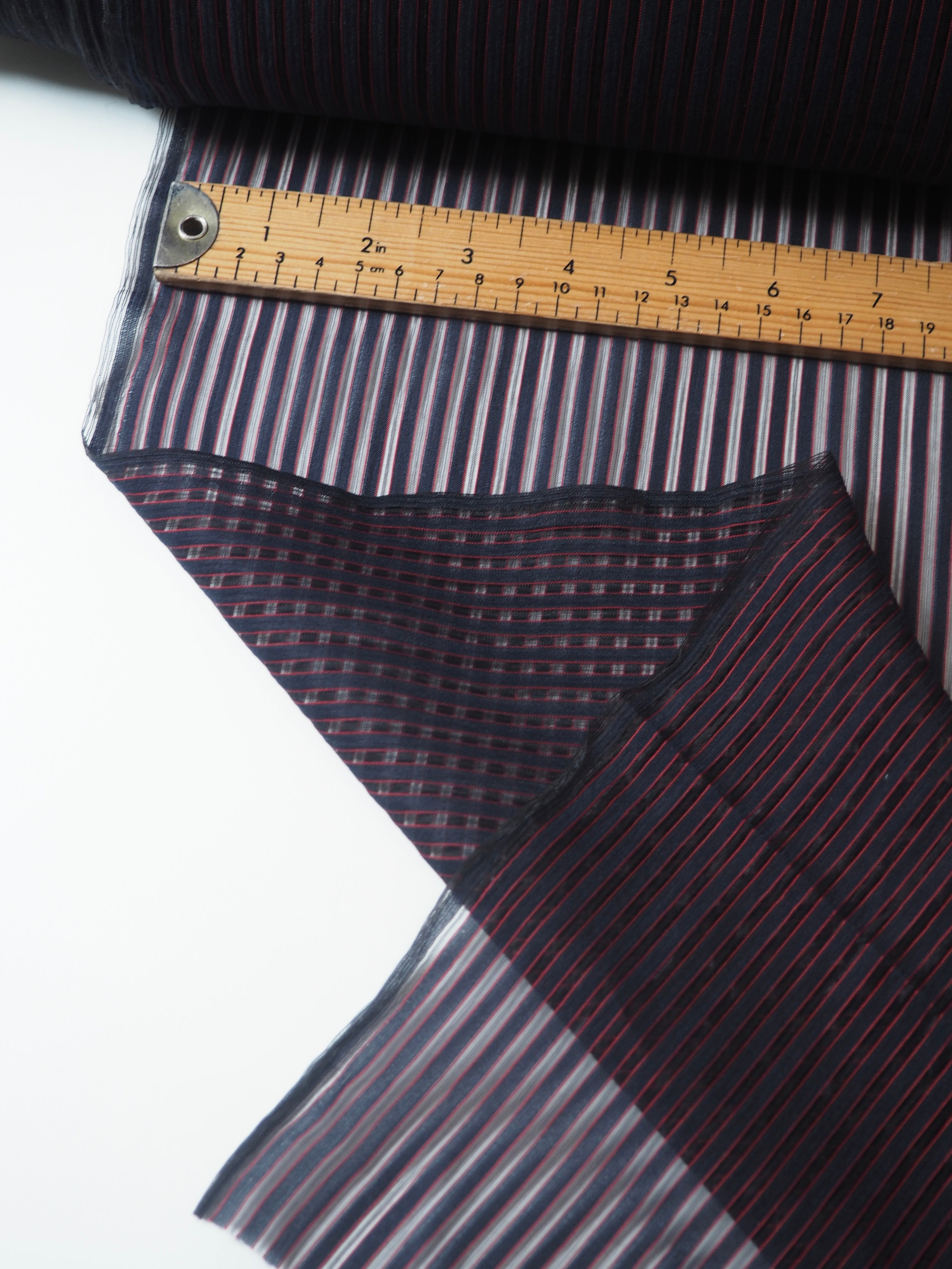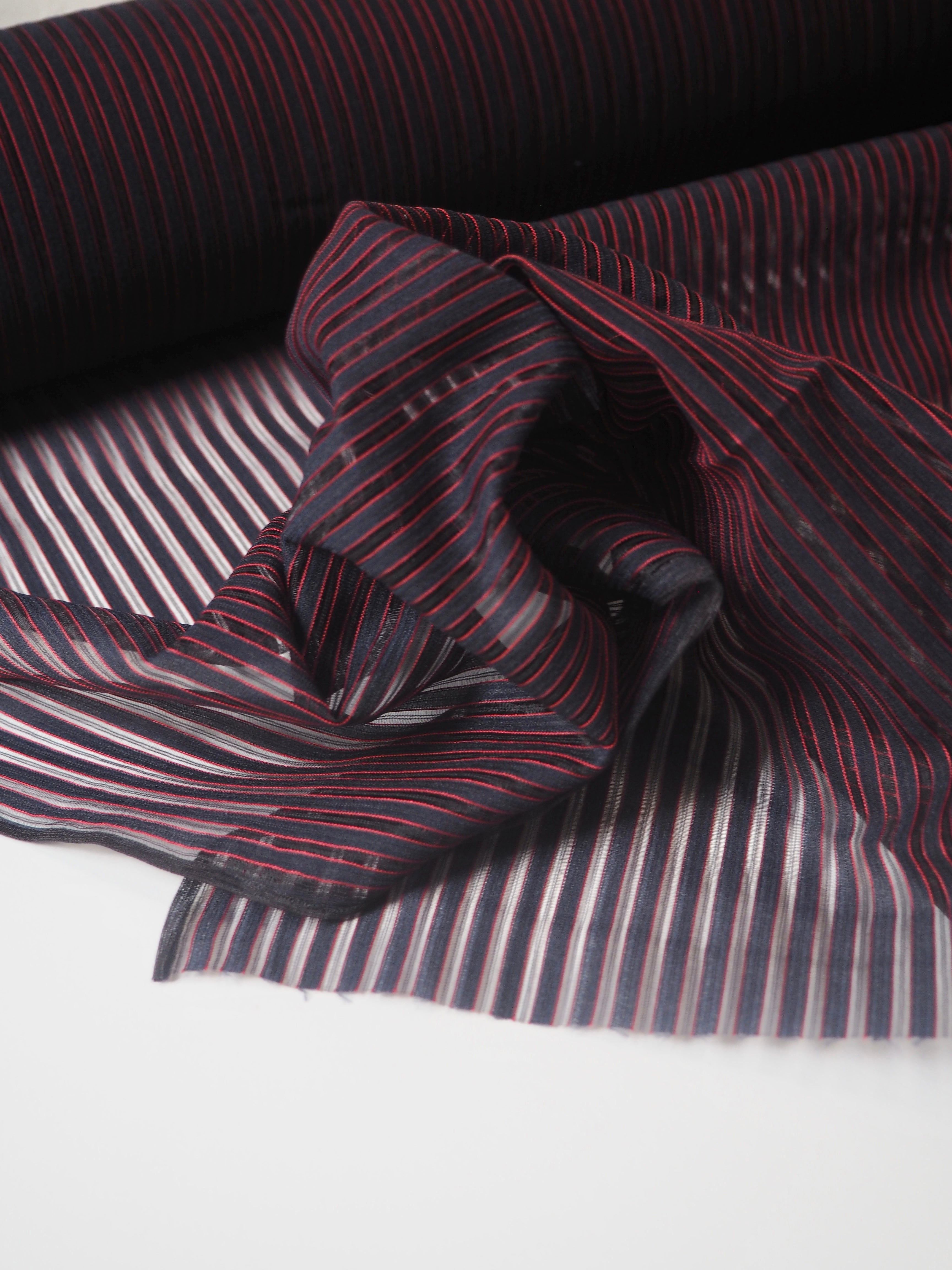This ex-designer fabric is a nylon organza. It's a unique cloth, with a navy and red stripe woven down the warp, offset with sheer black. Lightweight and a little crisp with a really good structure. Semi-sheer with a bit of a sheen in the black and red and pops! Would be so great in a sheer top or sheer sleeves!