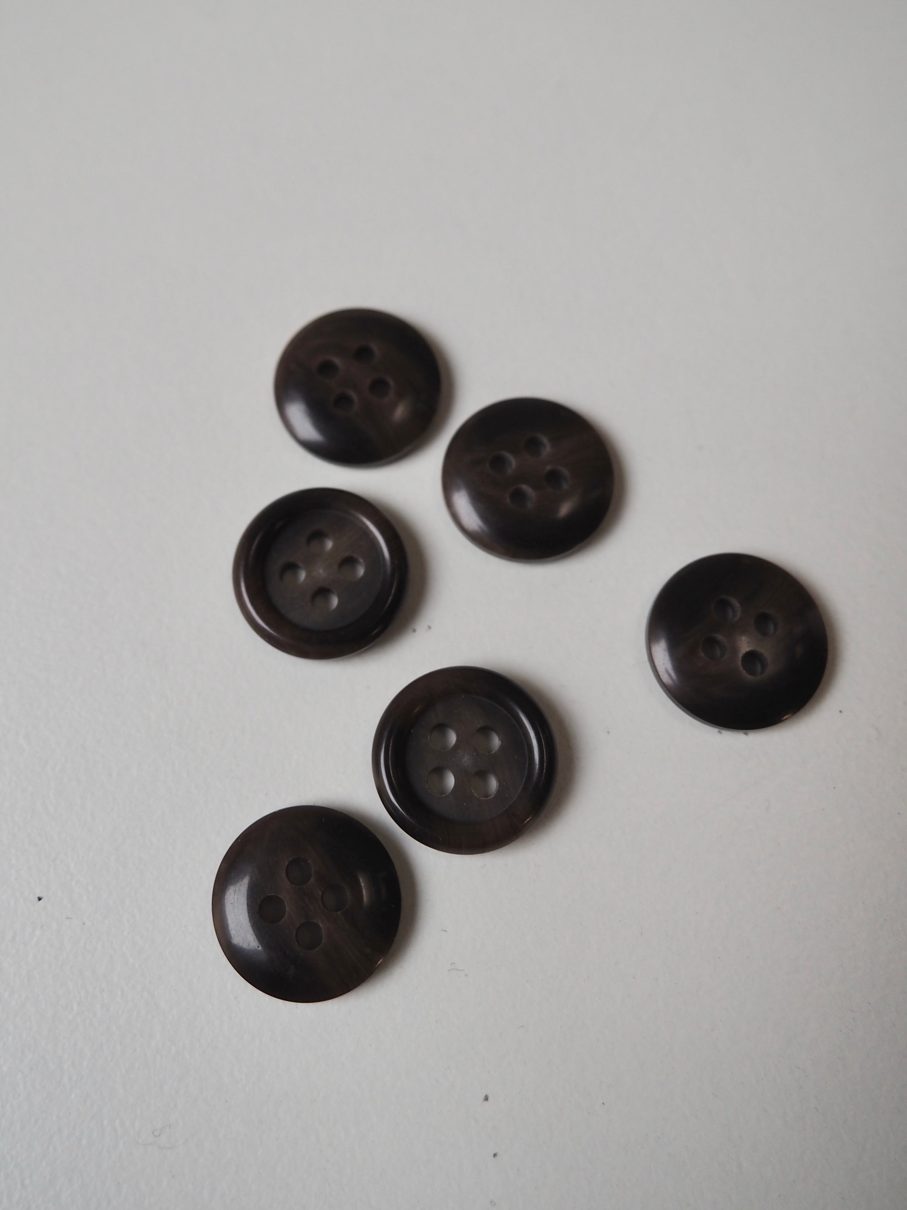This ex-designer trim is a 4-hole rimmed plastic button. The surface mimics horn or corozo with a swirl of light brown into dark brown. Perfect size for shirts and cardigans.