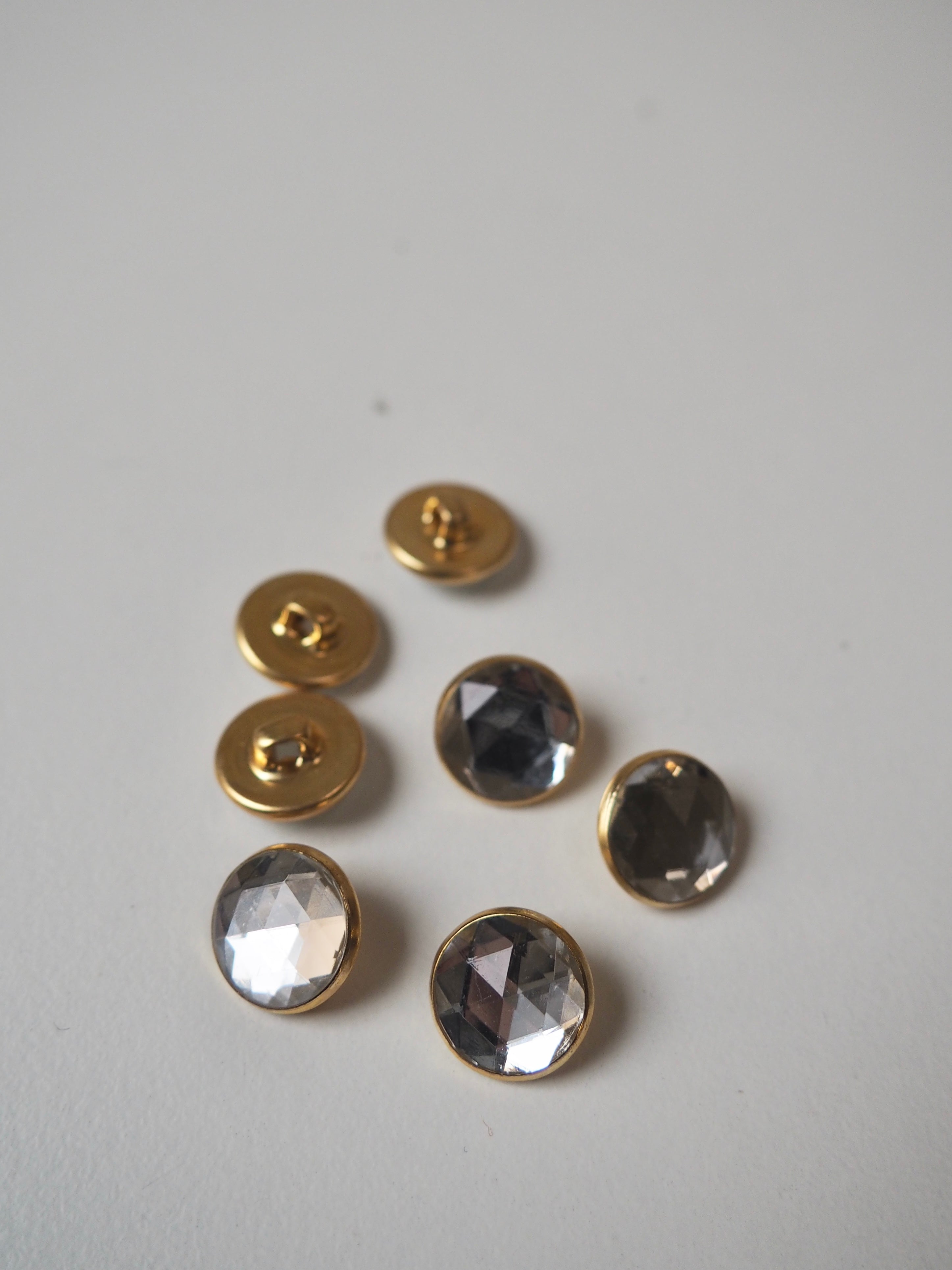 This ex-designer trim is a shank button. The front is a clear plastic crystal and rimmed with gold metal from the shank back. Perfect size for shirts and cardigans.