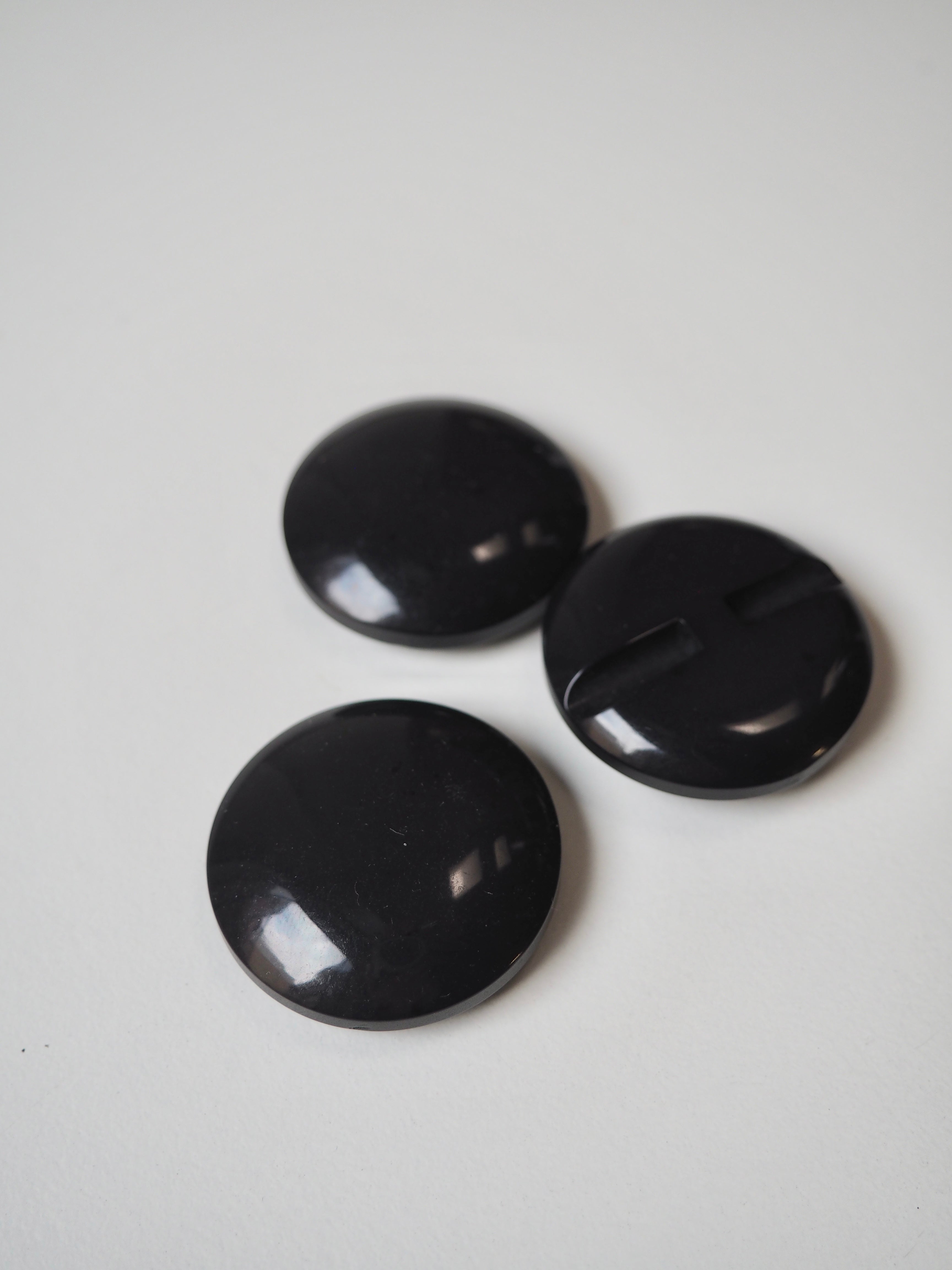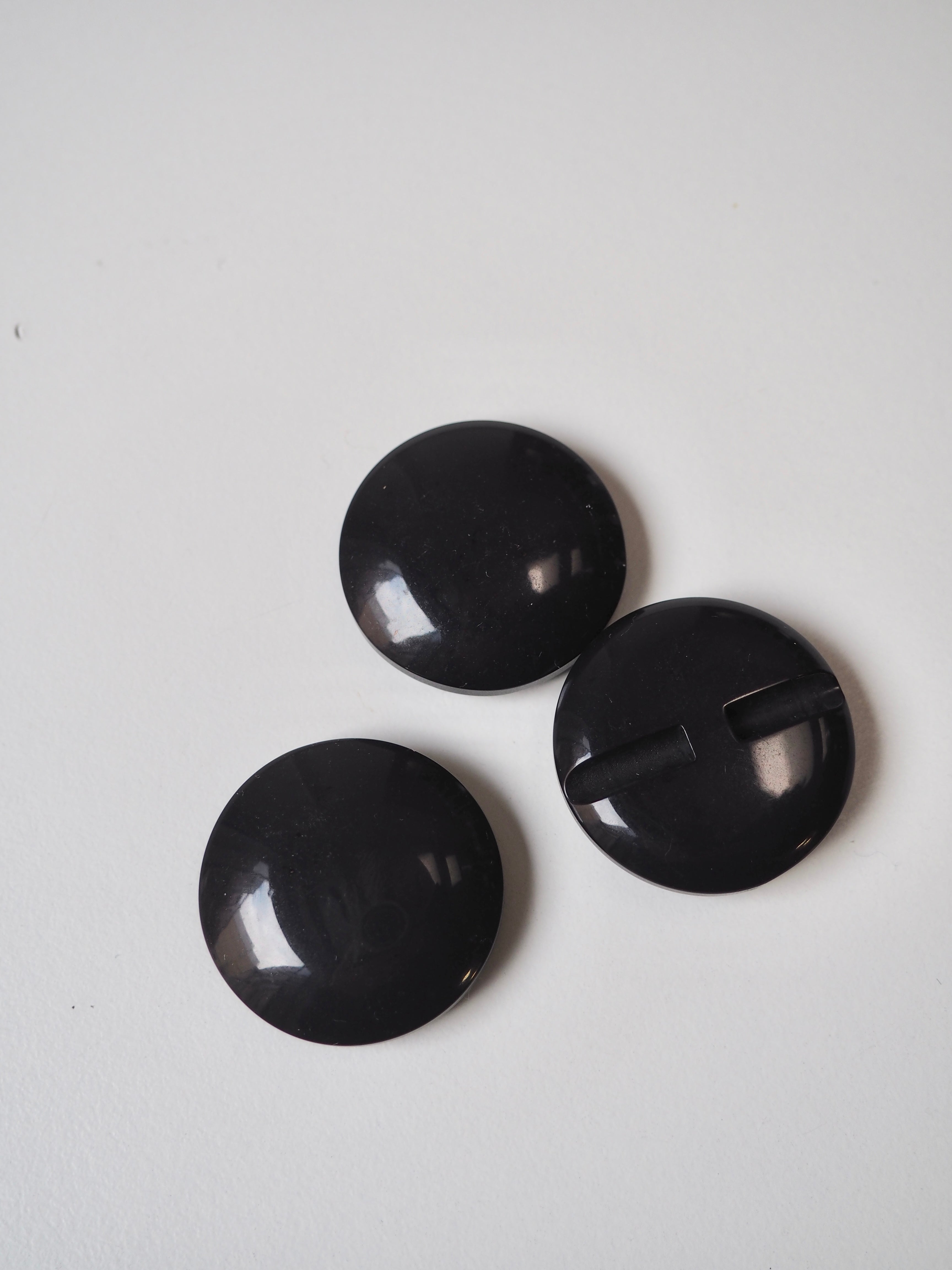 This ex-designer trim is a channel hole plastic button. They are a nearly black, dark grey, petrol colour. They are a gentle domed shape and the perfect size for coats and jackets.