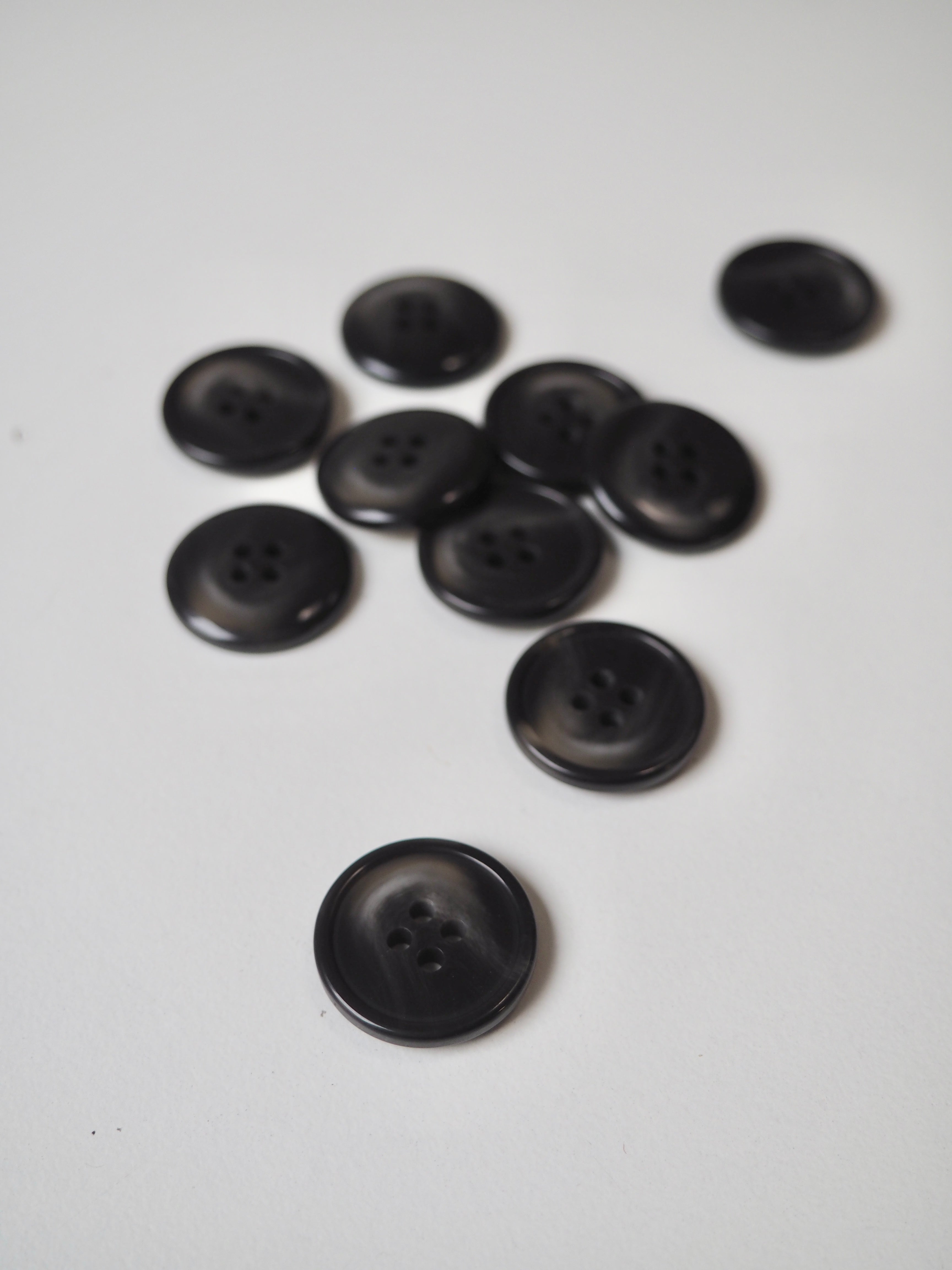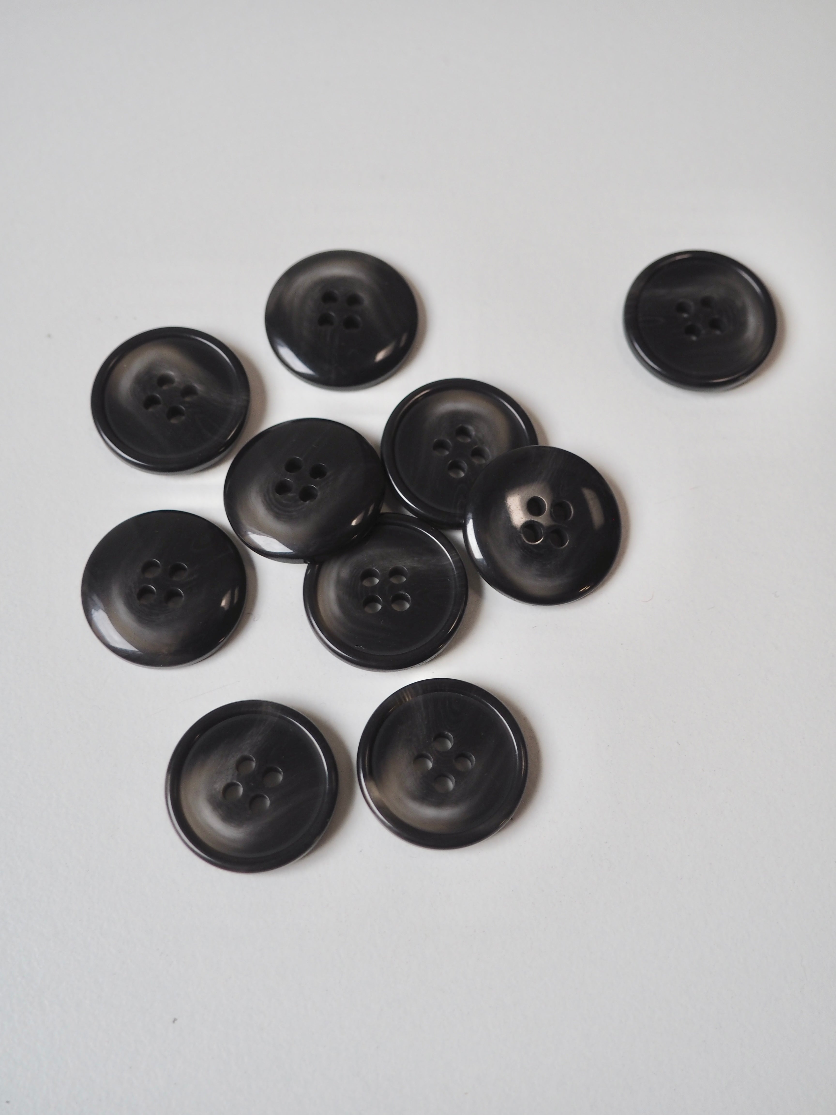 This ex-designer trim is a 4-hole rimmed plastic button. The surface mimics horn or corozo with a swirl of light grey into dark grey. Perfect size for coats, jackets and cardigans.