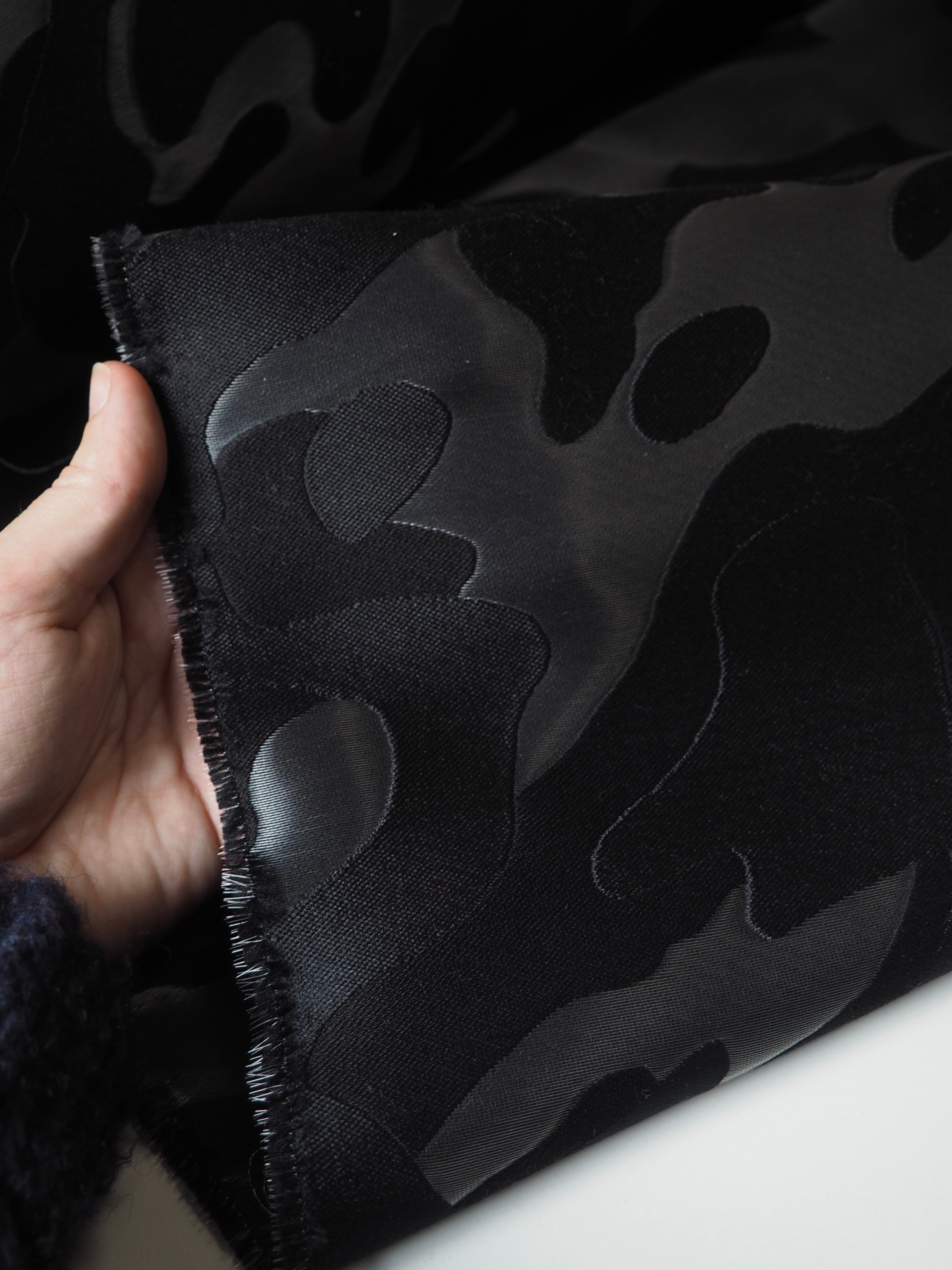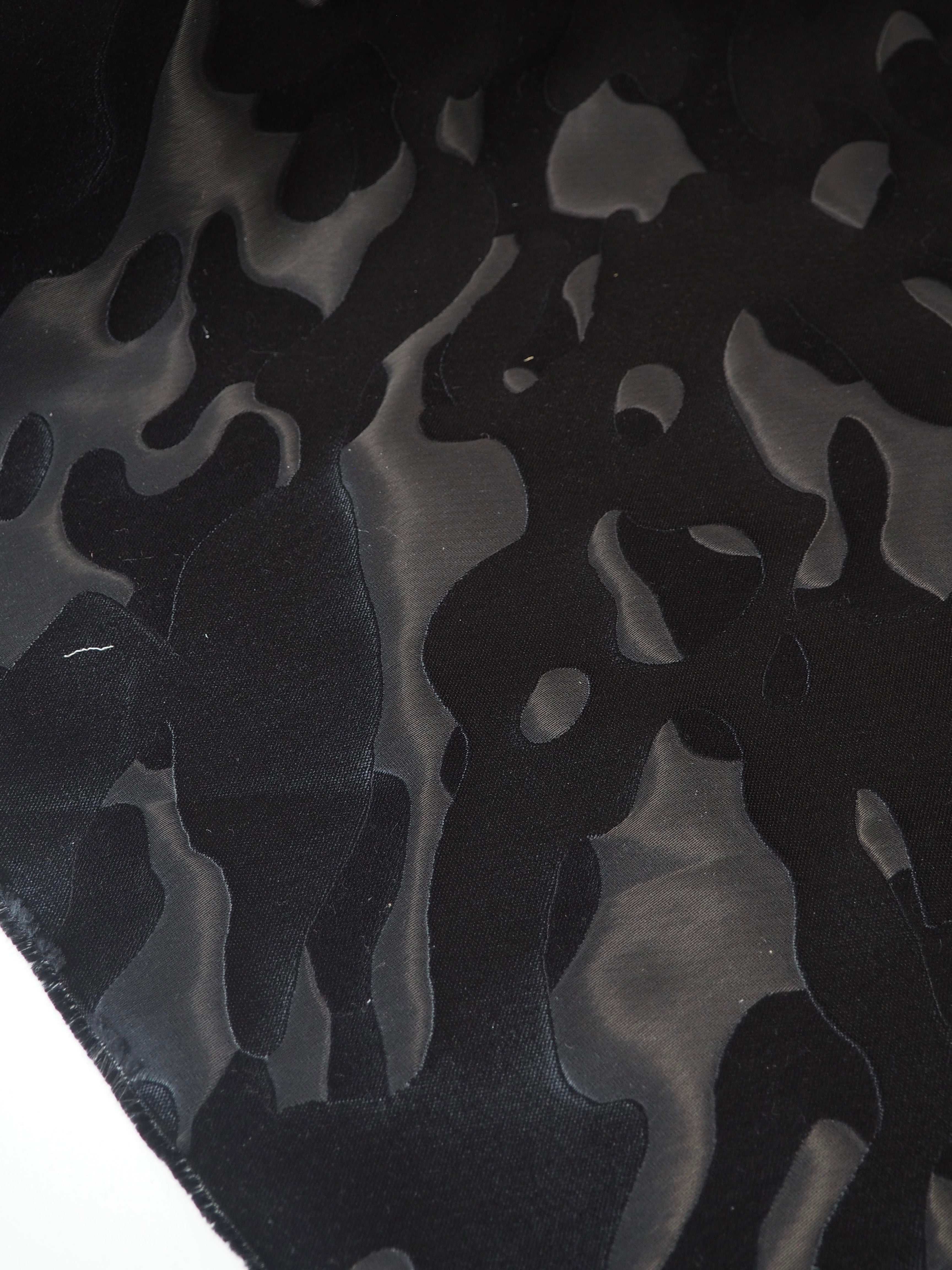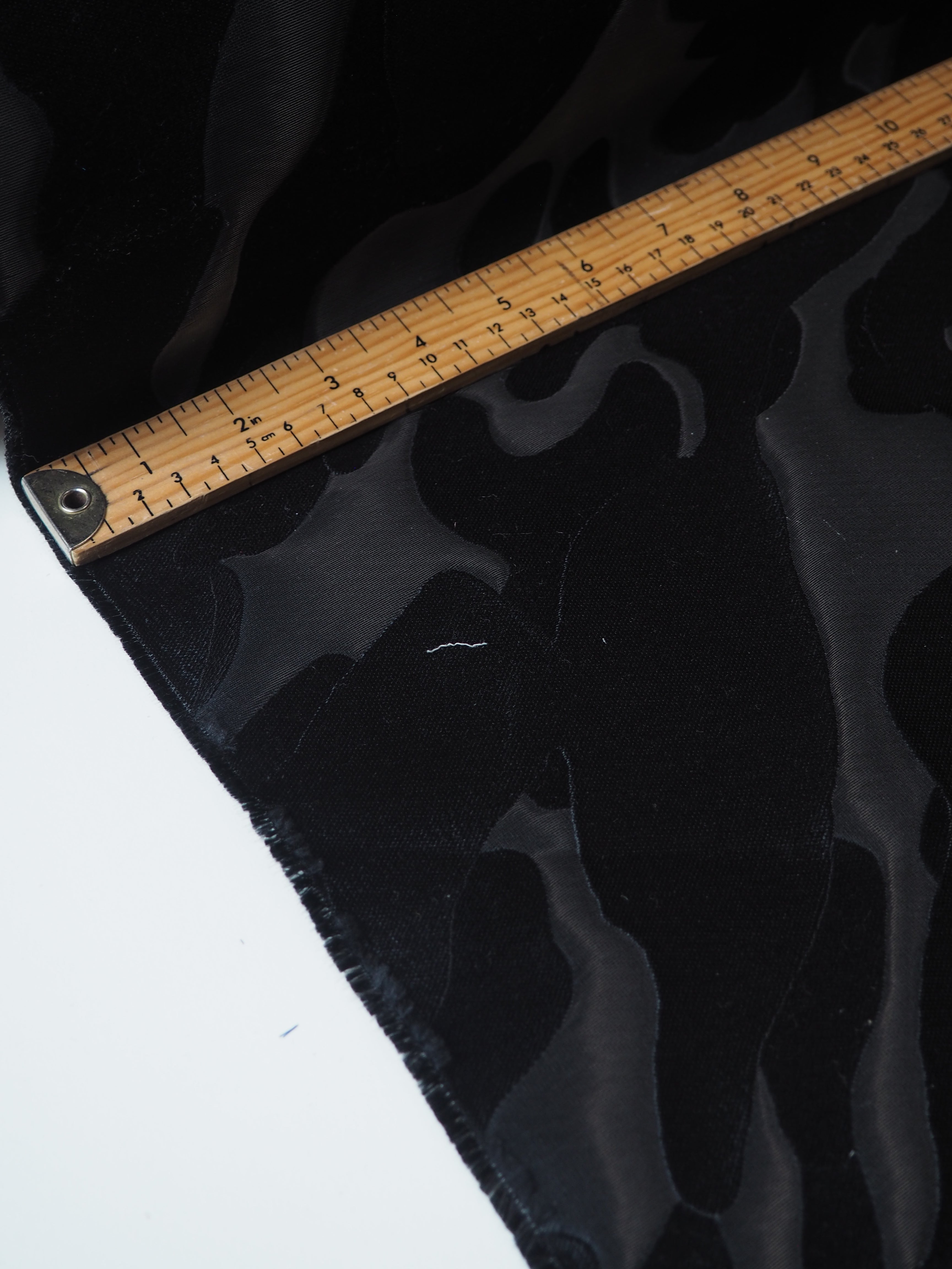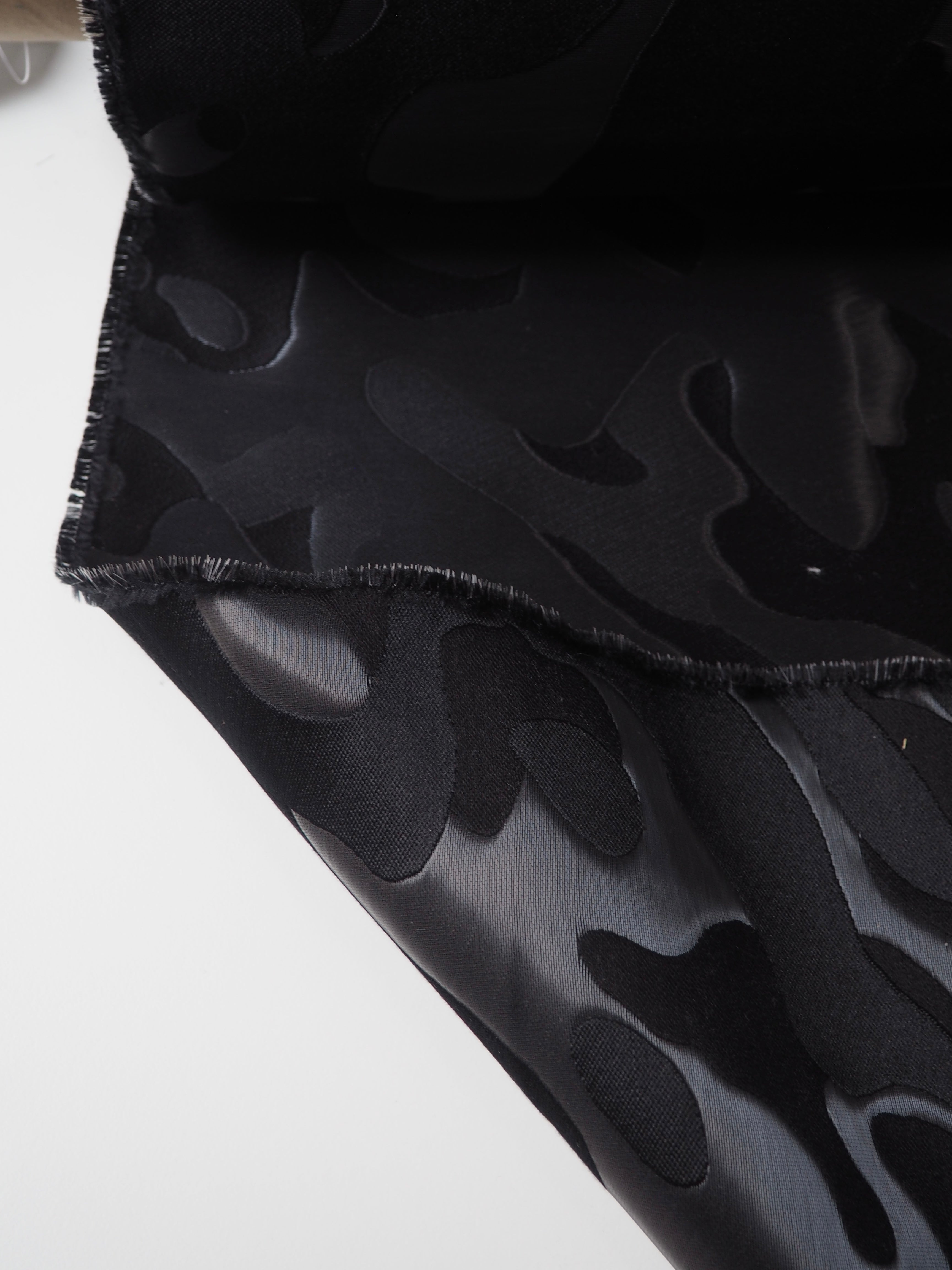 This ex-designer fabric is a unique jacquard. This black jacquard has a camouflage design, in a medium to large scale and a raised texture. Shiny white nylon threads are exposed in some areas, giving it a light catching shine and interesting depth. Medium weight with an incredible structure, similar to an organza, with a nice handle. Would be incredible in a jacket or as a bag!