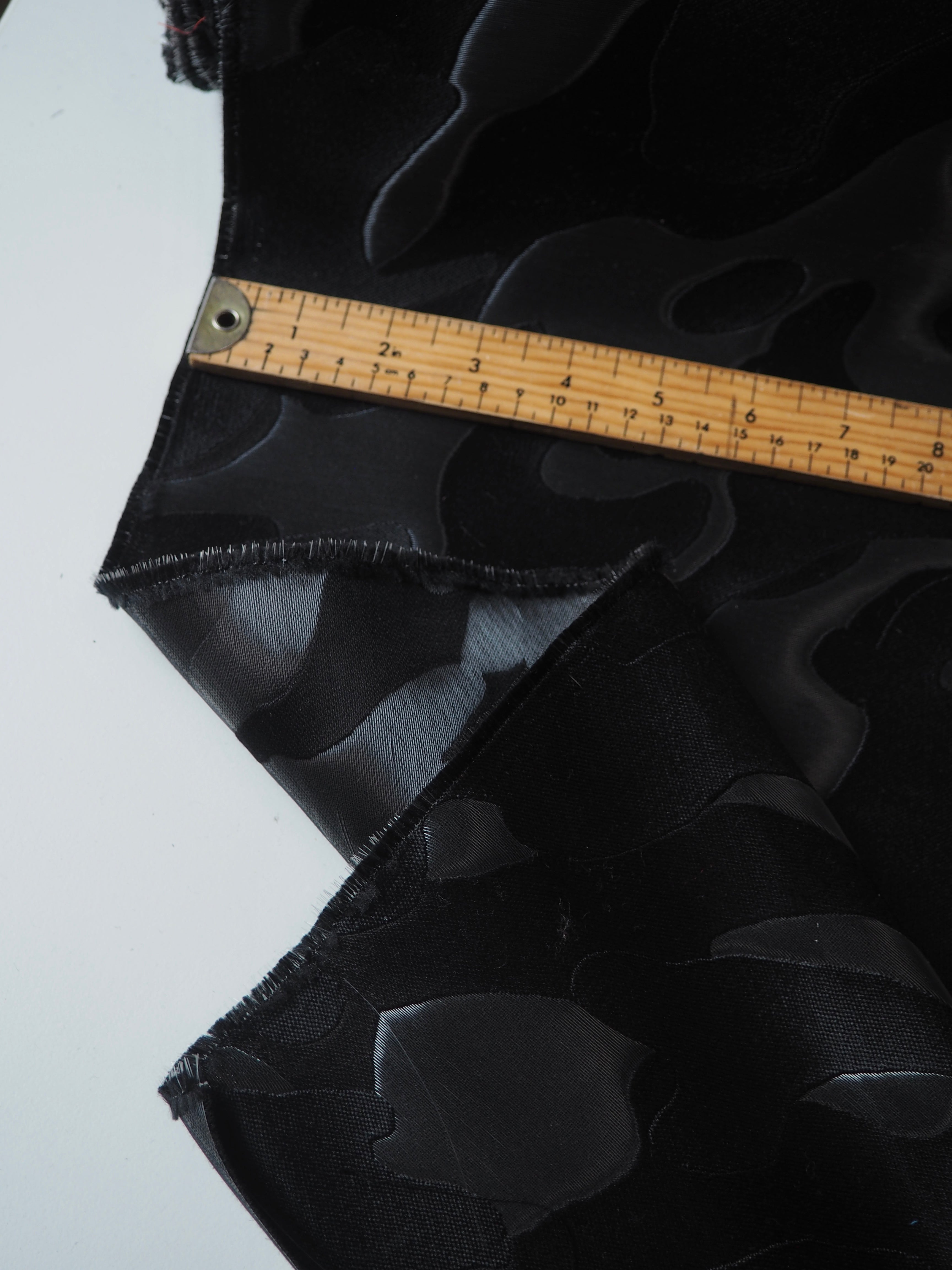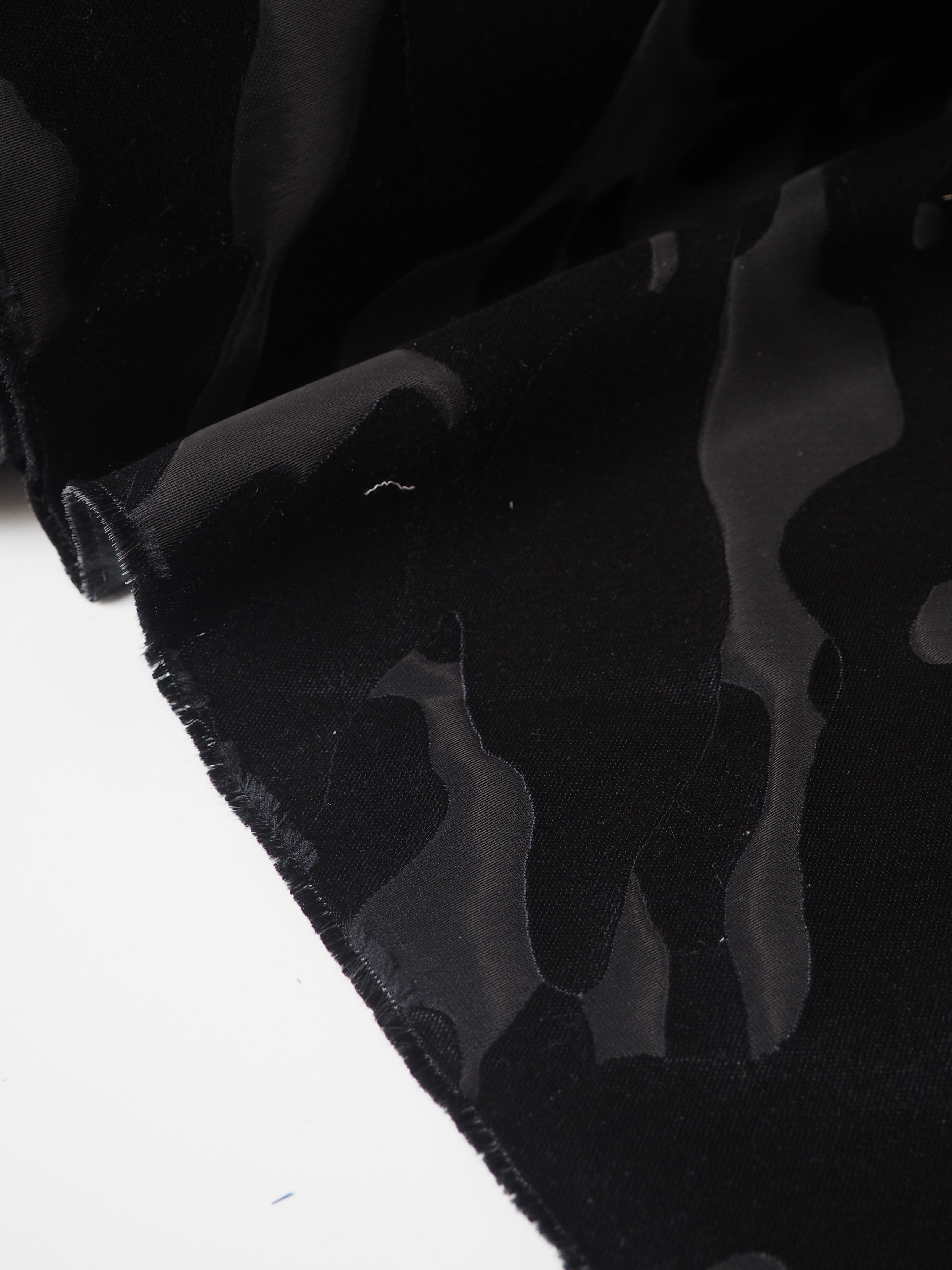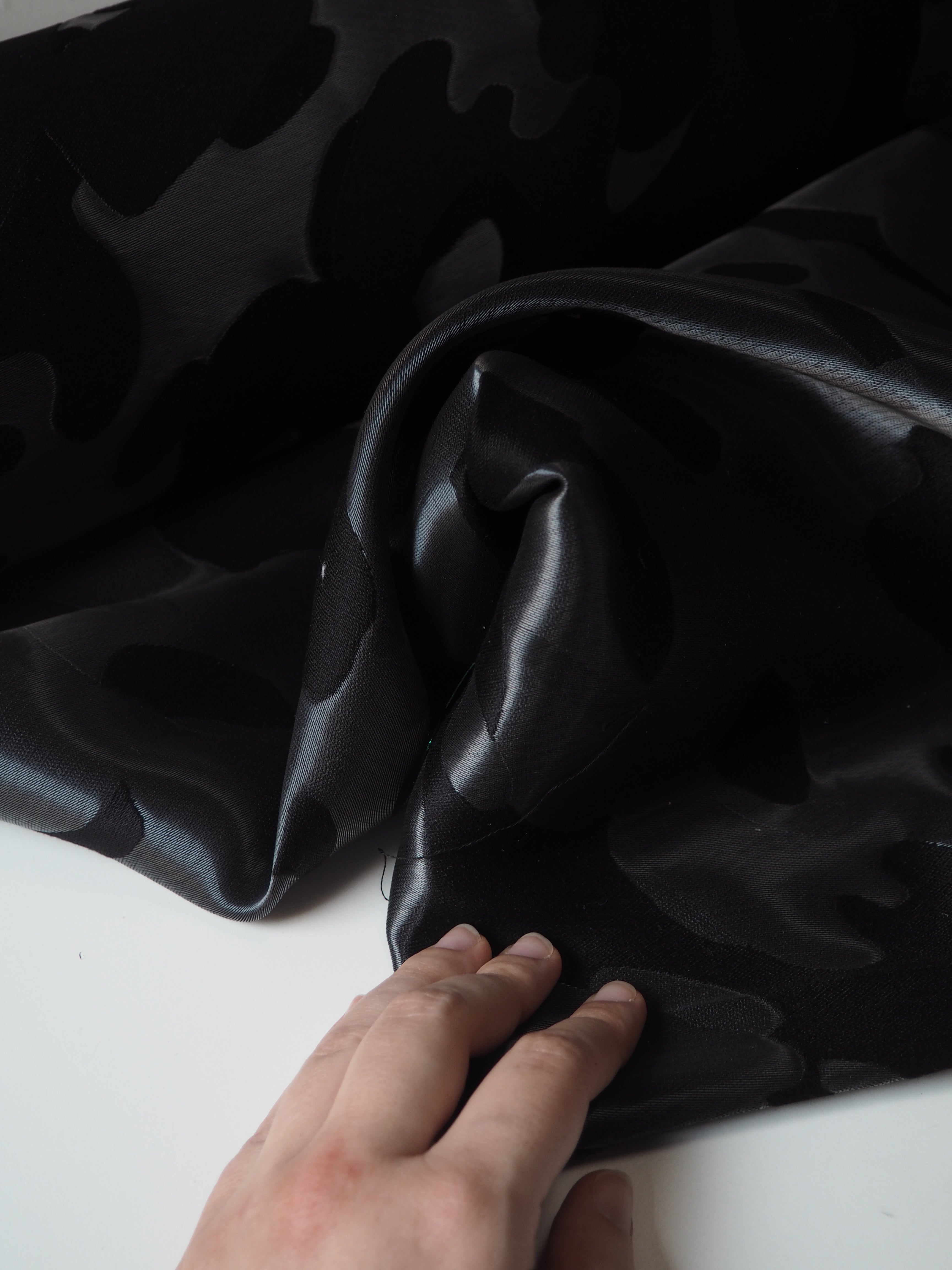 This ex-designer fabric is a unique jacquard. This black jacquard has a camouflage design, in a medium to large scale and a raised texture. Shiny white nylon threads are exposed in some areas, giving it a light catching shine and interesting depth. Medium weight with an incredible structure, similar to an organza, with a nice handle. Would be incredible in a jacket or as a bag!