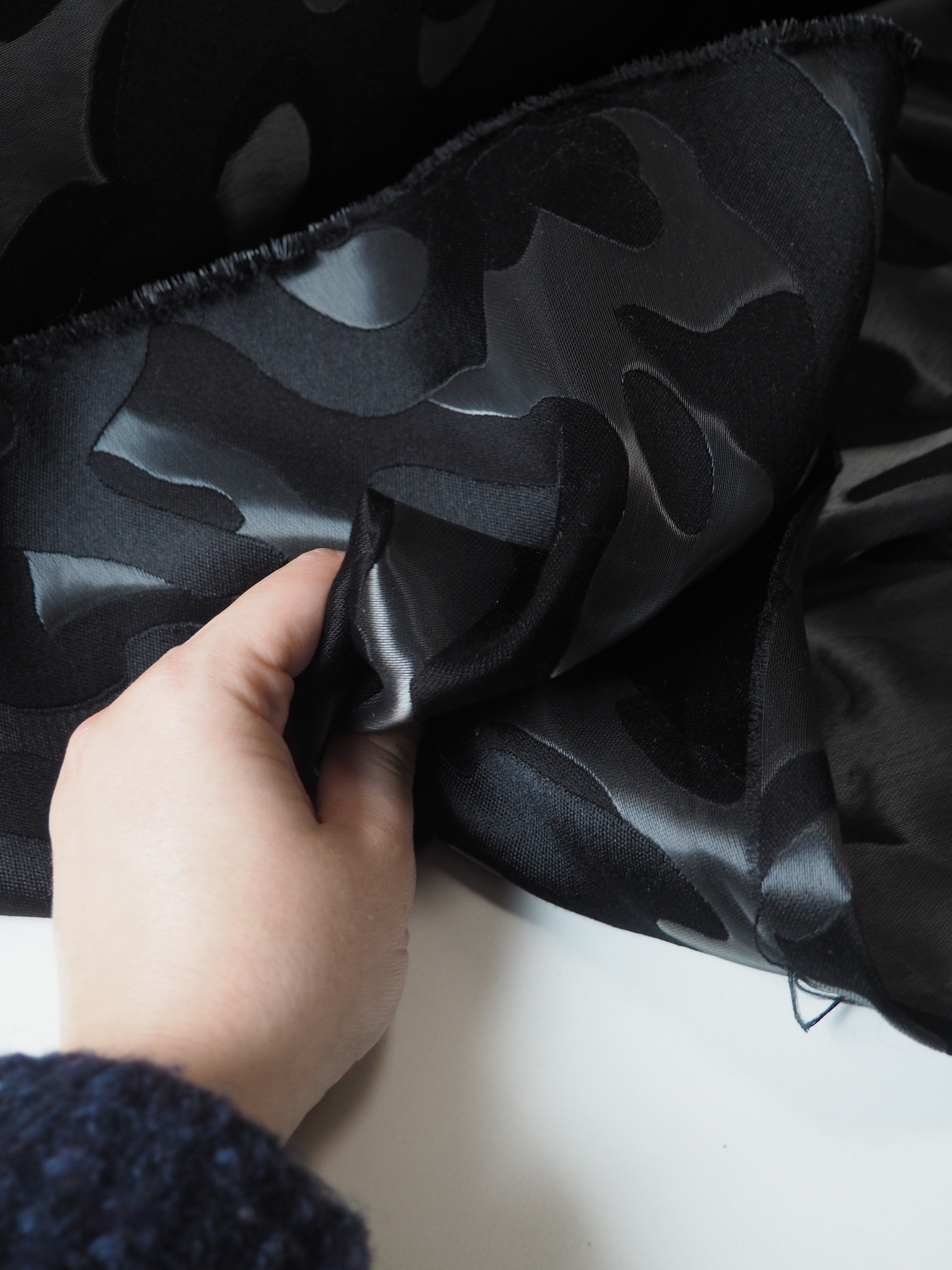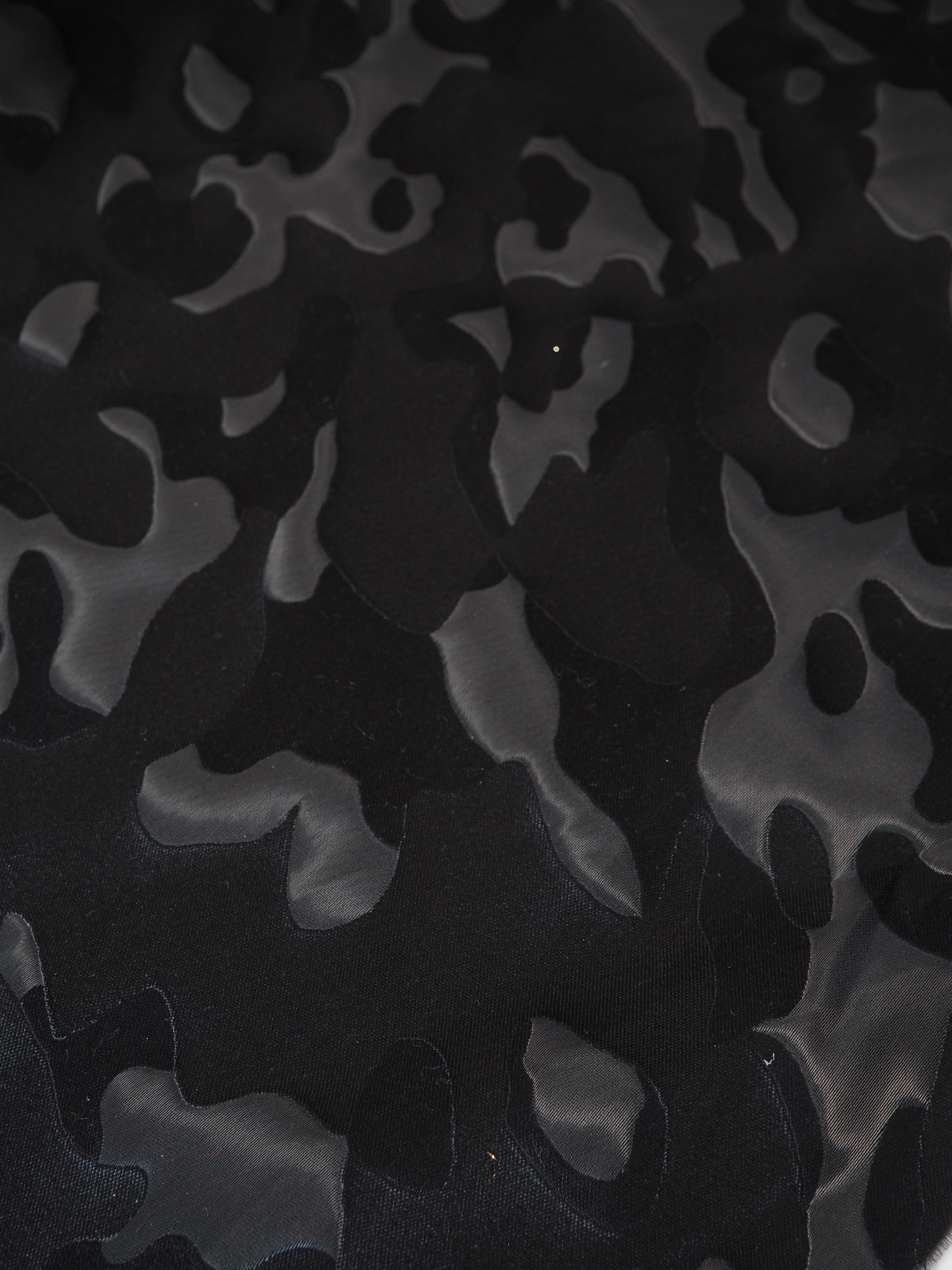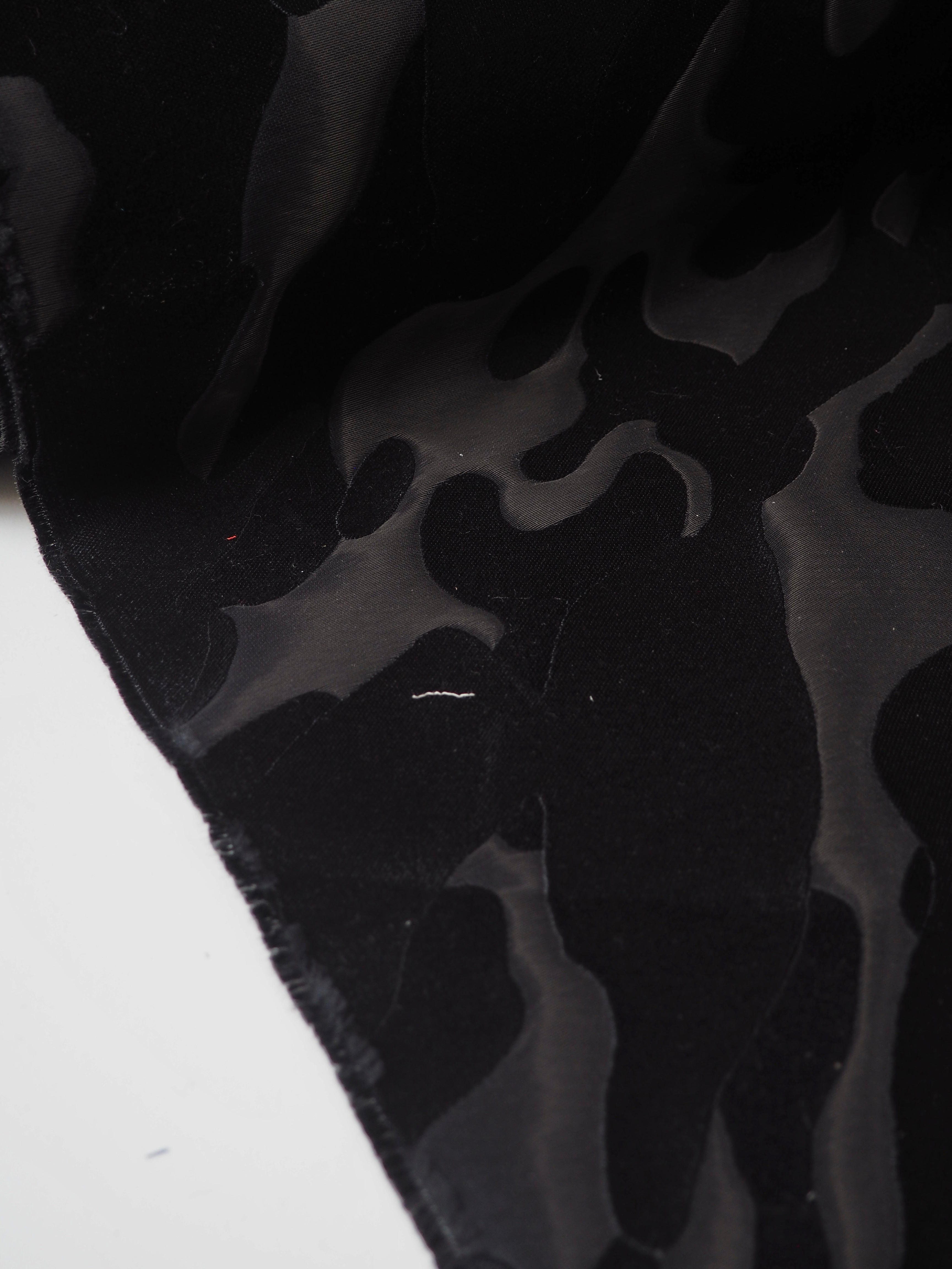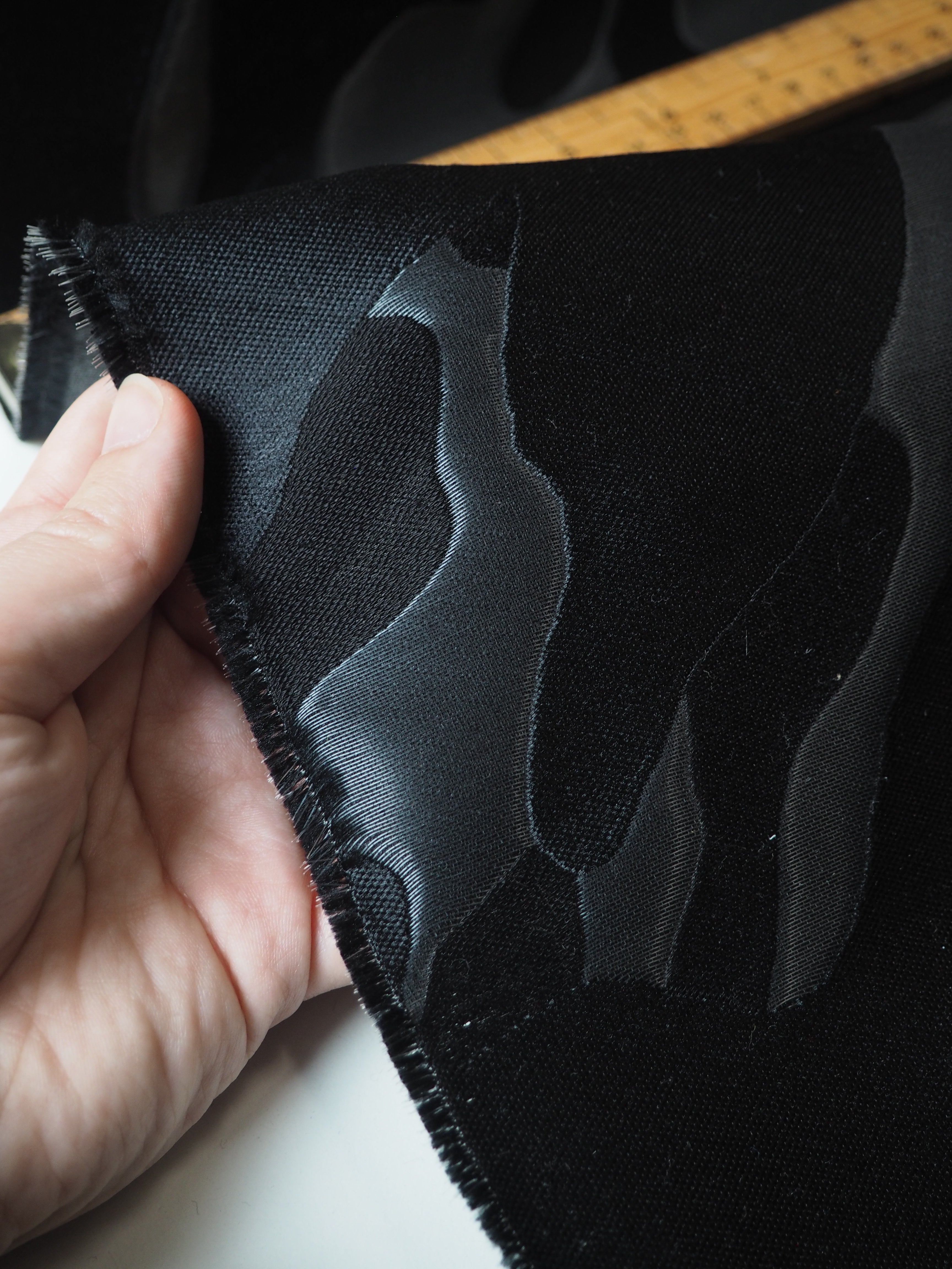 This ex-designer fabric is a unique jacquard. This black jacquard has a camouflage design, in a medium to large scale and a raised texture. Shiny white nylon threads are exposed in some areas, giving it a light catching shine and interesting depth. Medium weight with an incredible structure, similar to an organza, with a nice handle. Would be incredible in a jacket or as a bag!