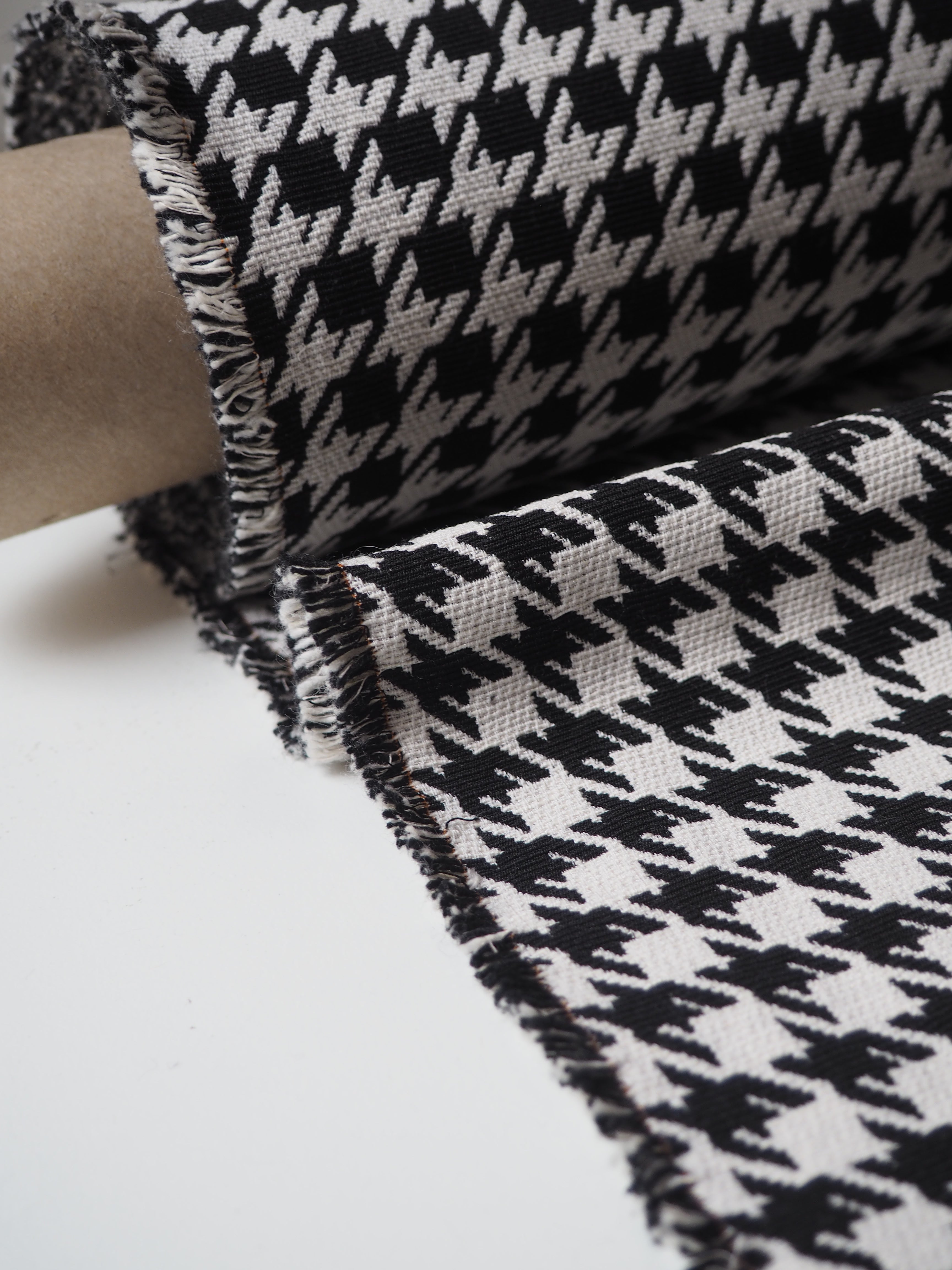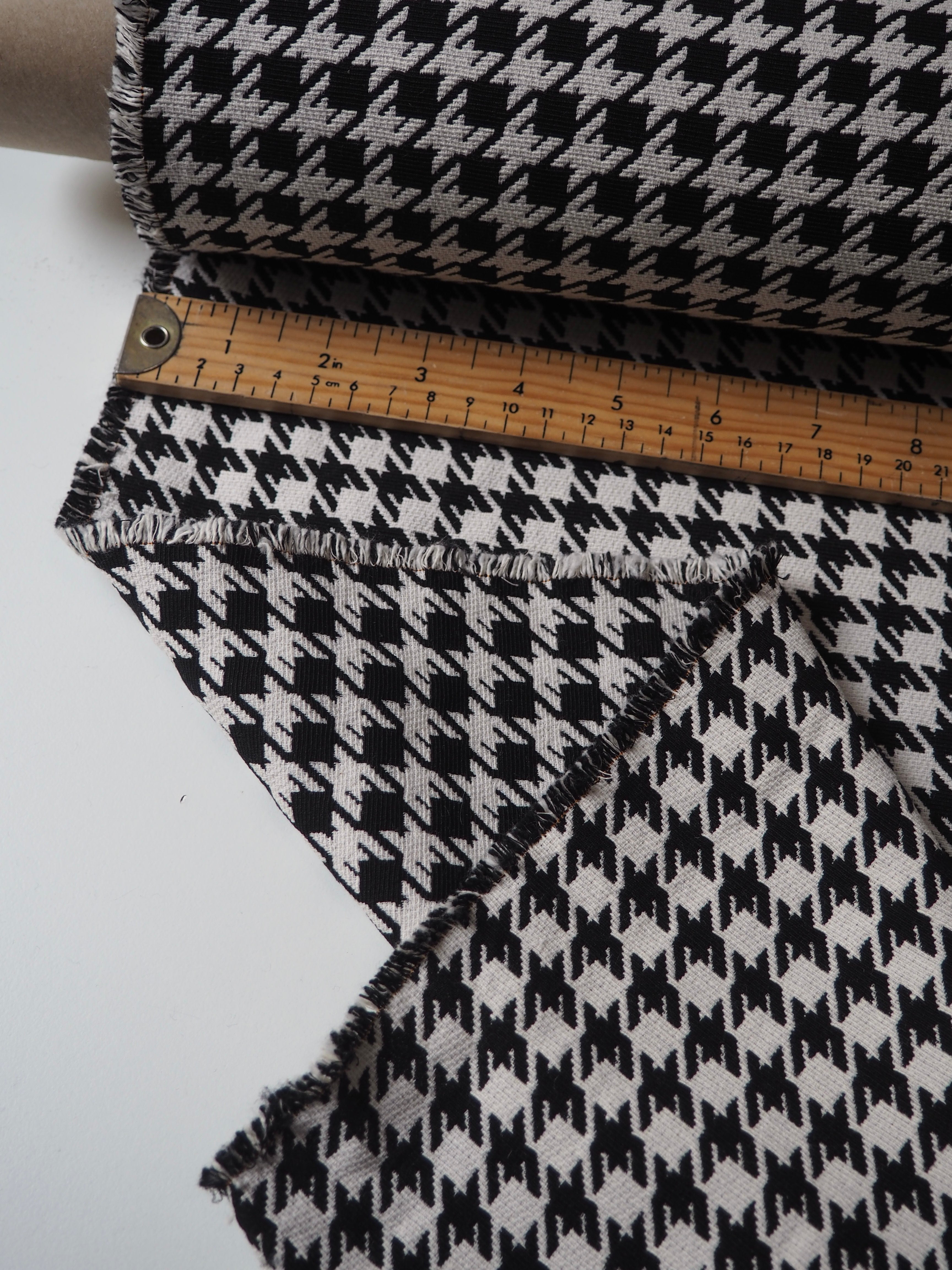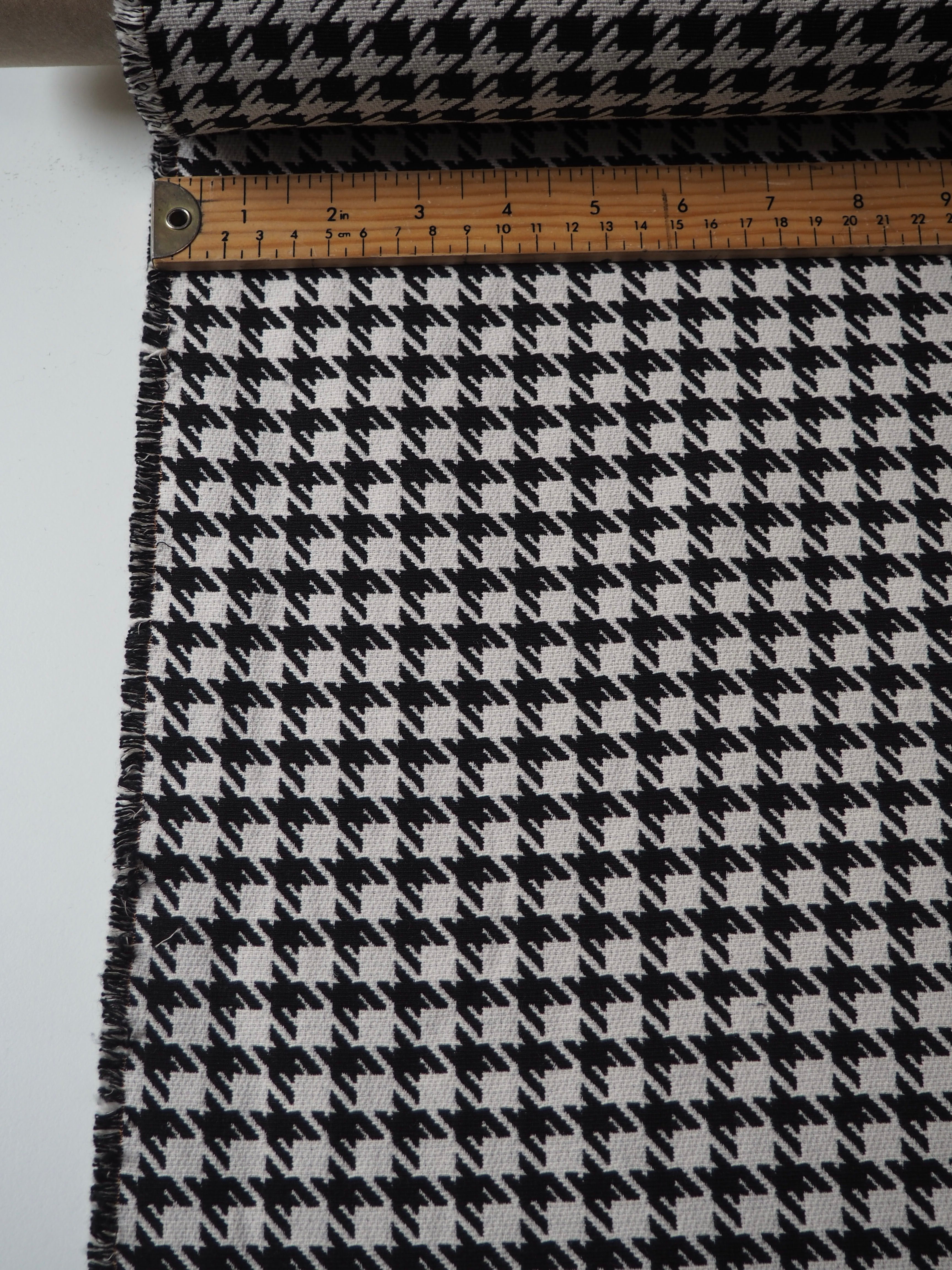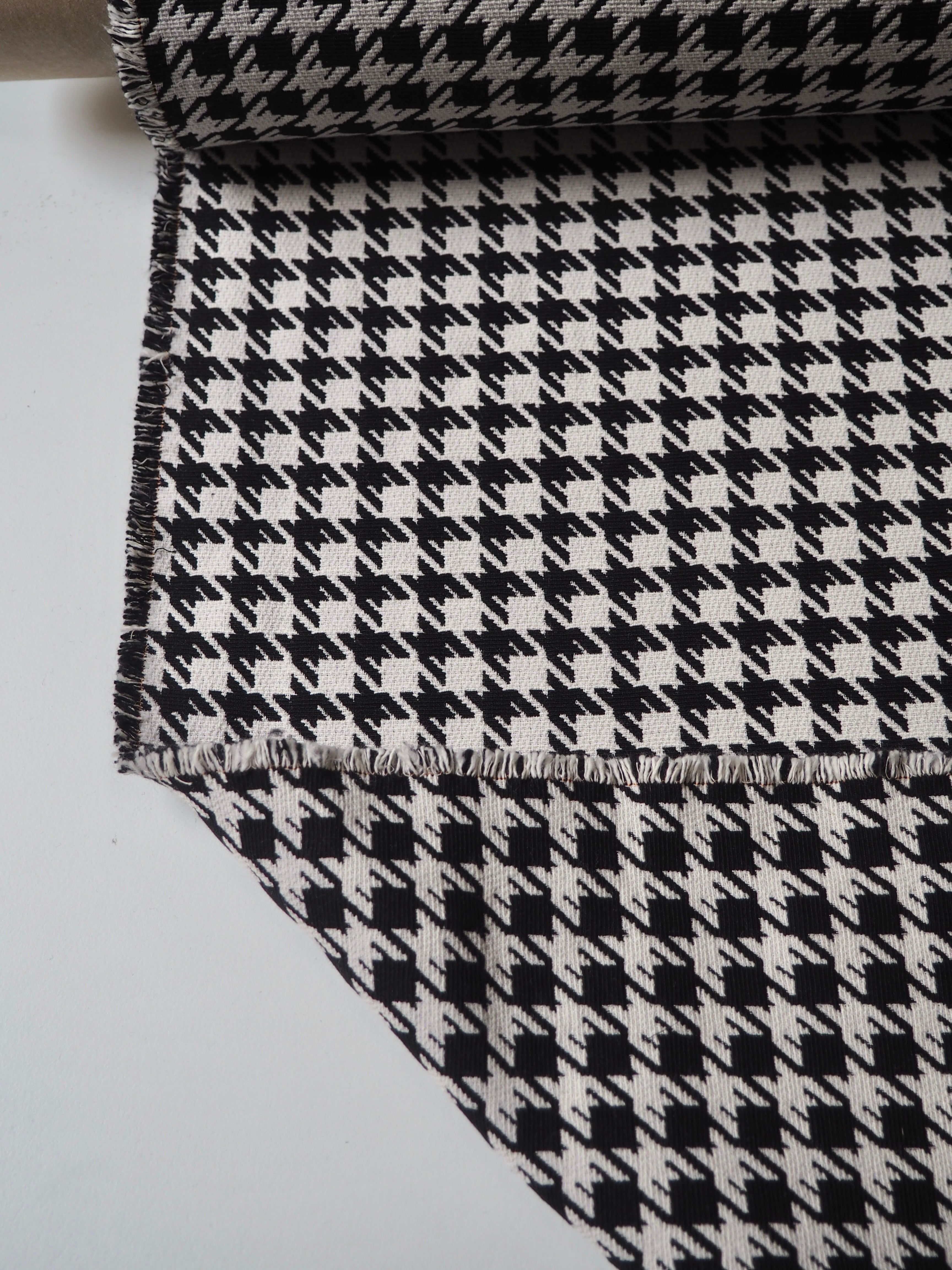 This ex-designer fabric is a jacquard. This double faced jacquard has a black and white houndstooth weave, swapping on each side. It has a lovely plush handle. Medium weight with an great structure. Has a slight give, about 5%, length ways. Perfect for furnishings or a bag!