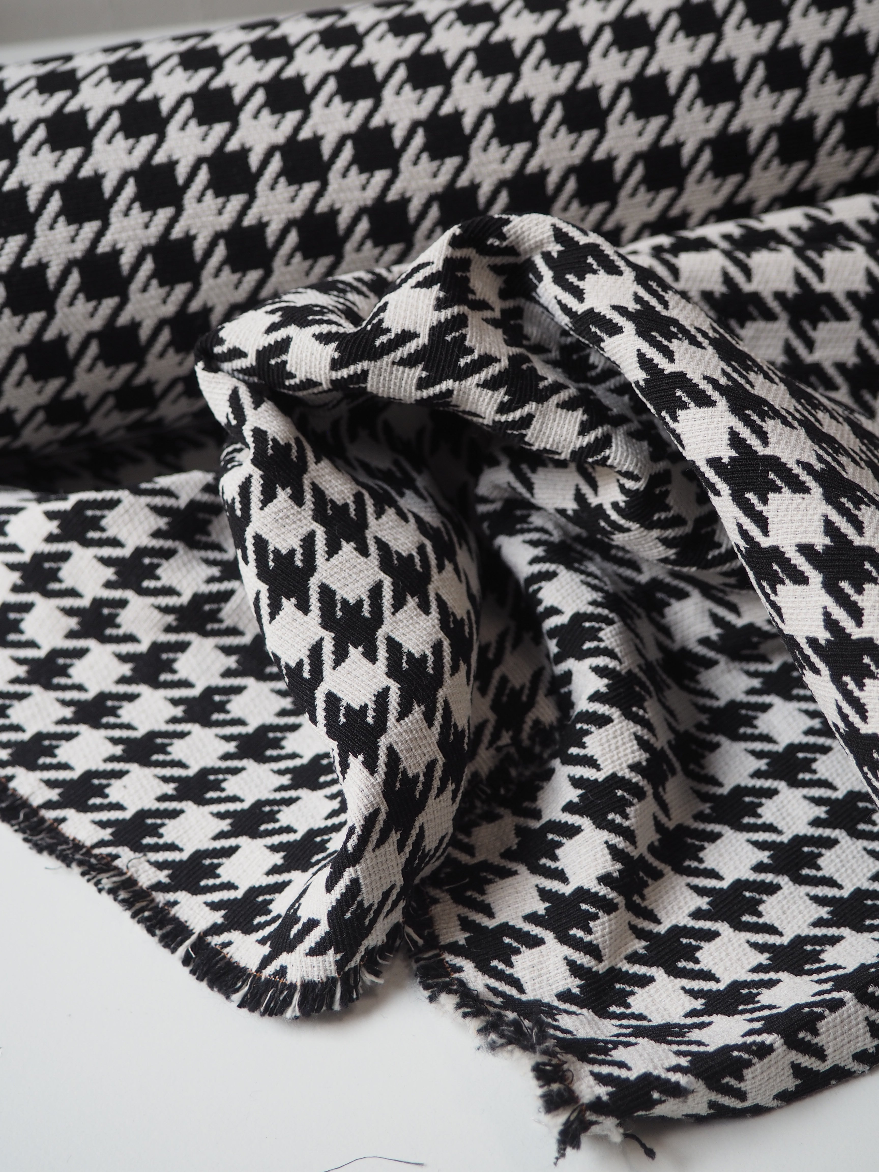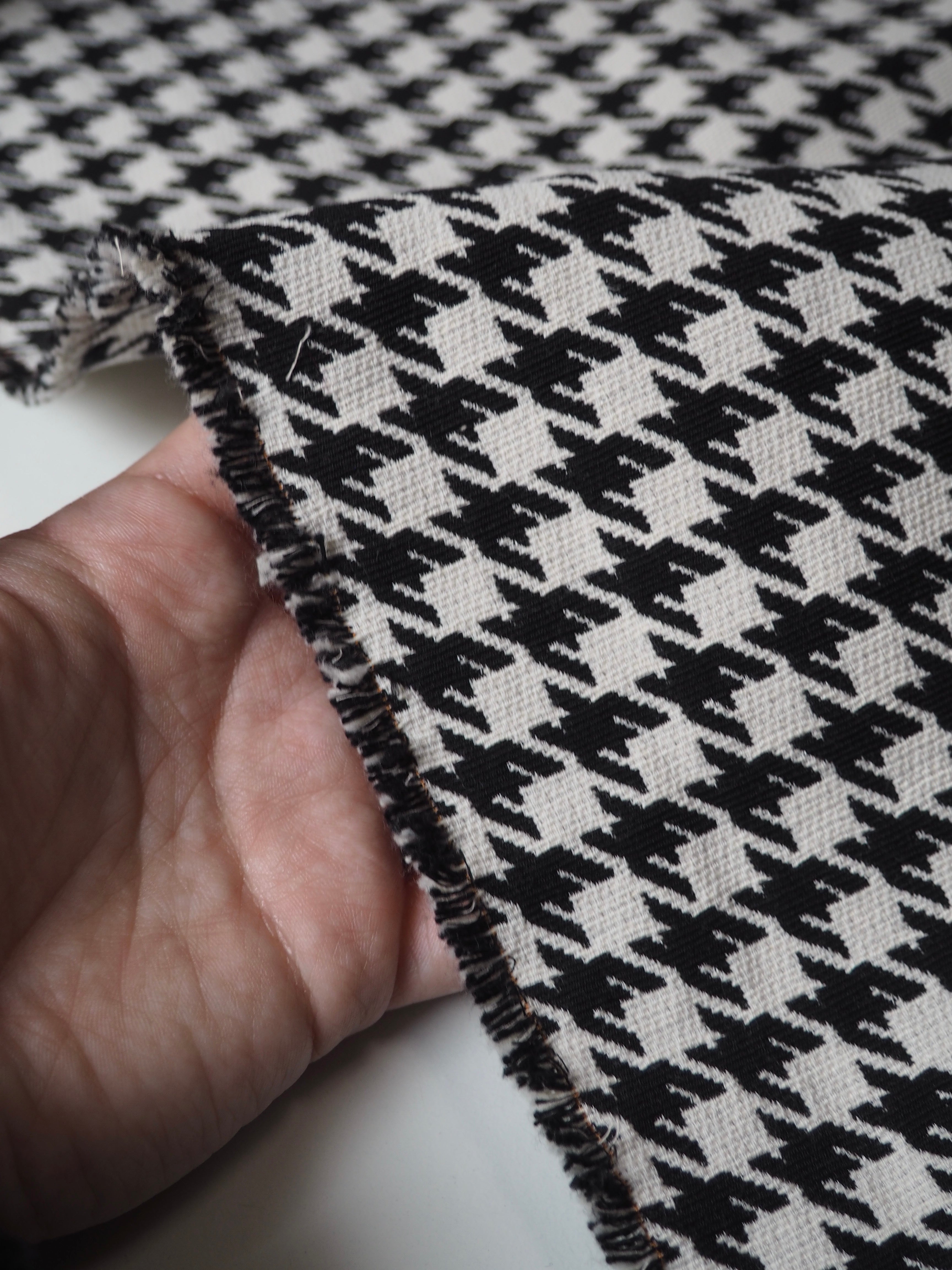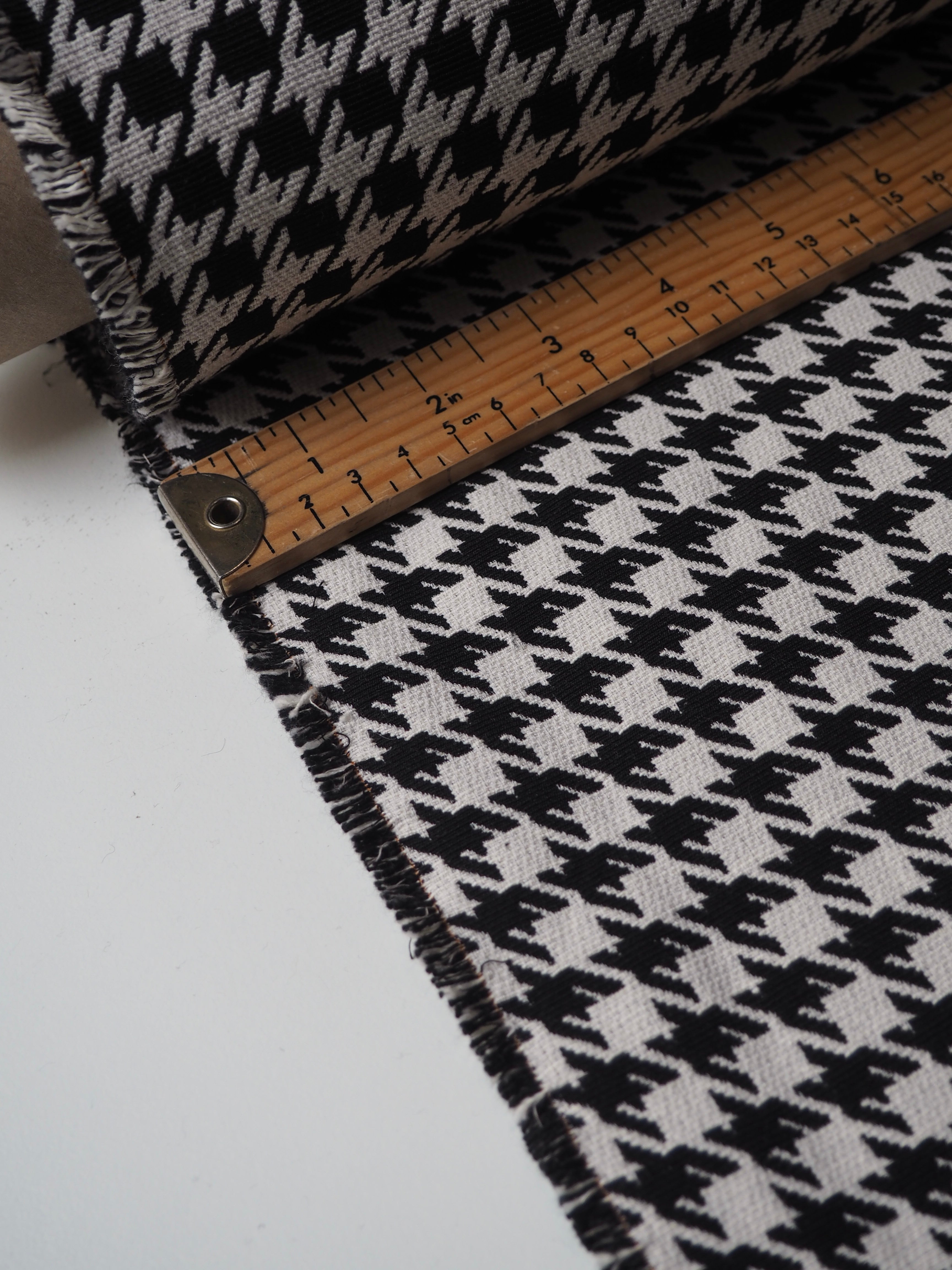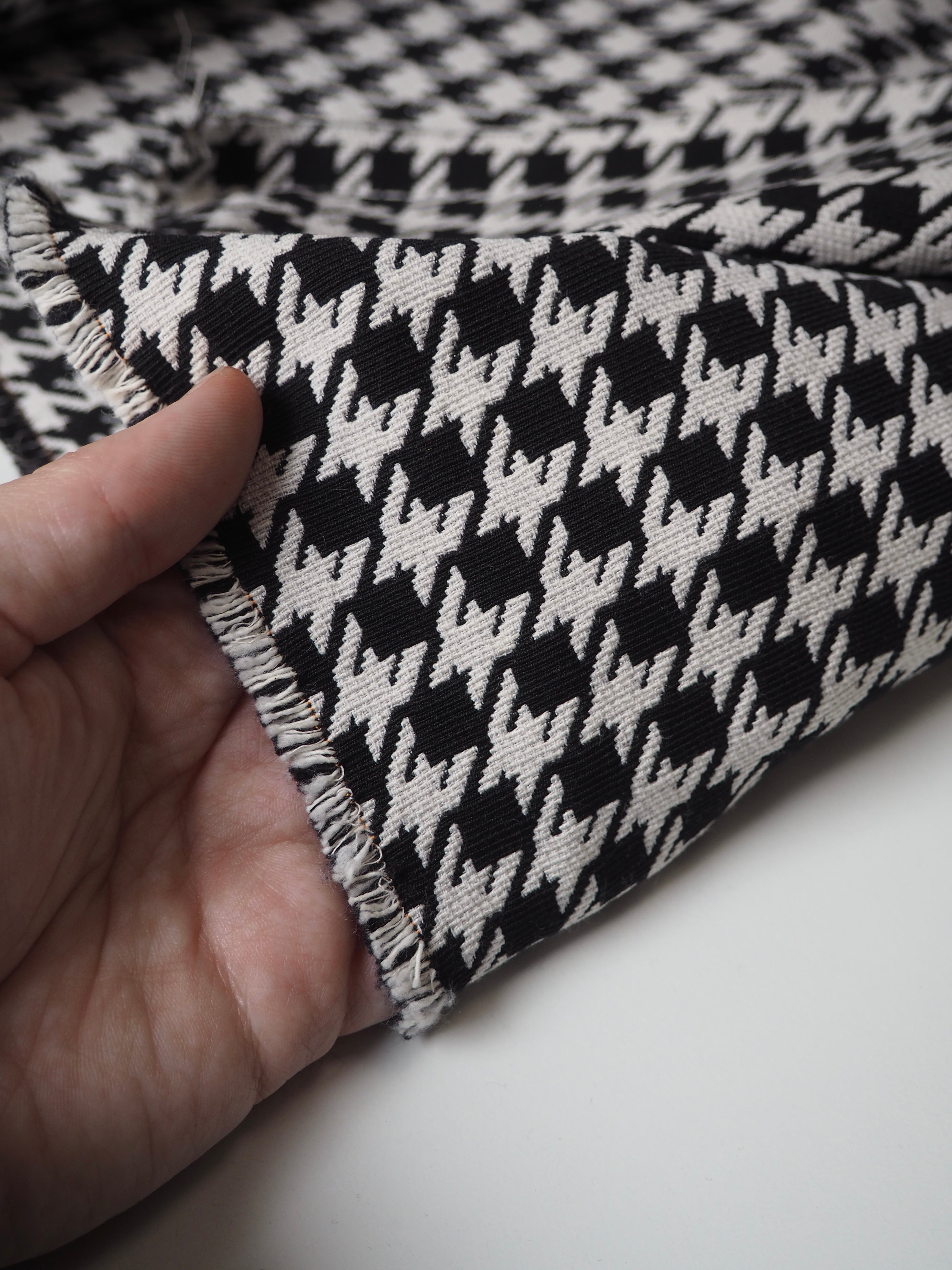 This ex-designer fabric is a jacquard. This double faced jacquard has a black and white houndstooth weave, swapping on each side. It has a lovely plush handle. Medium weight with an great structure. Has a slight give, about 5%, length ways. Perfect for furnishings or a bag!