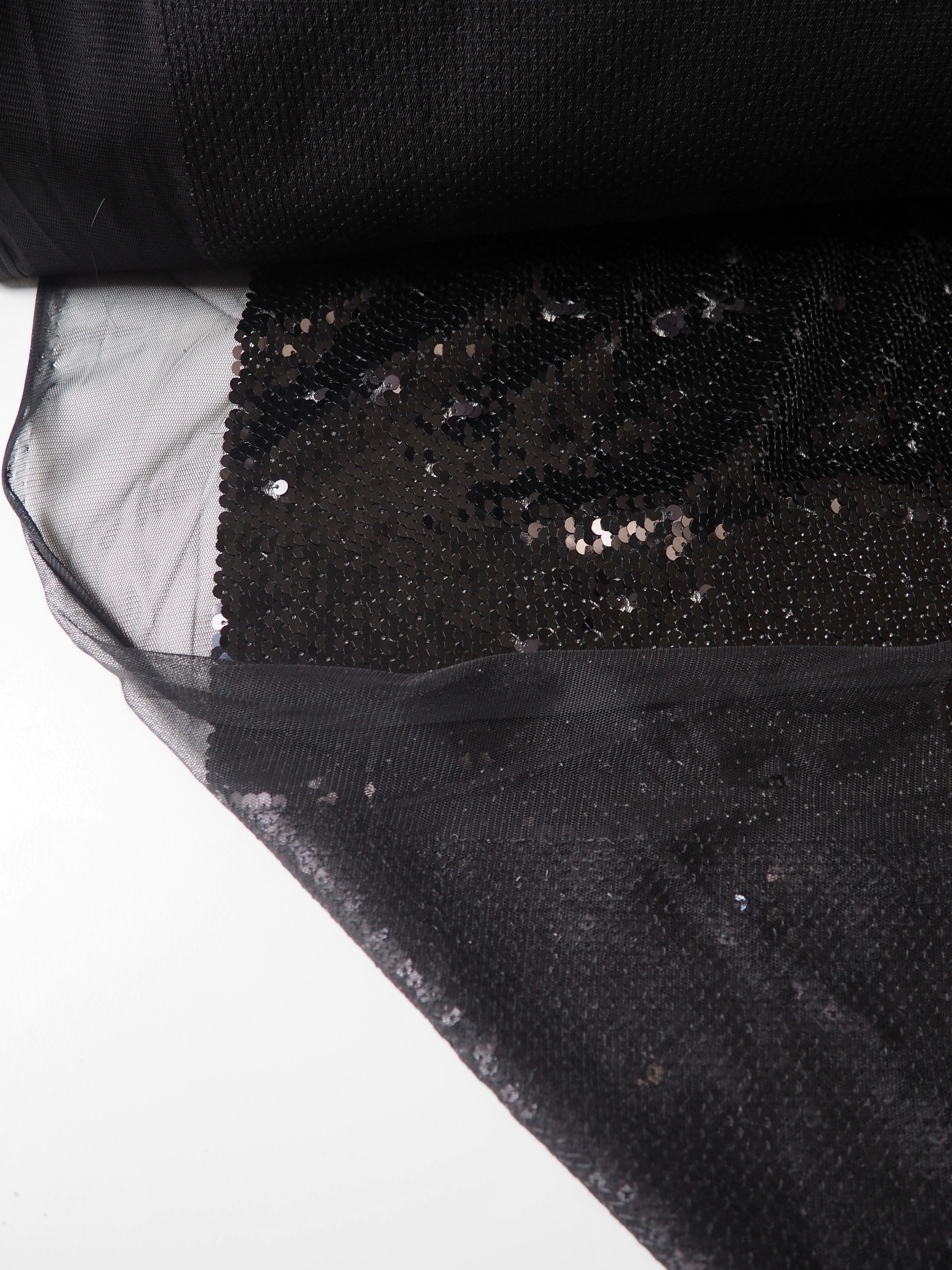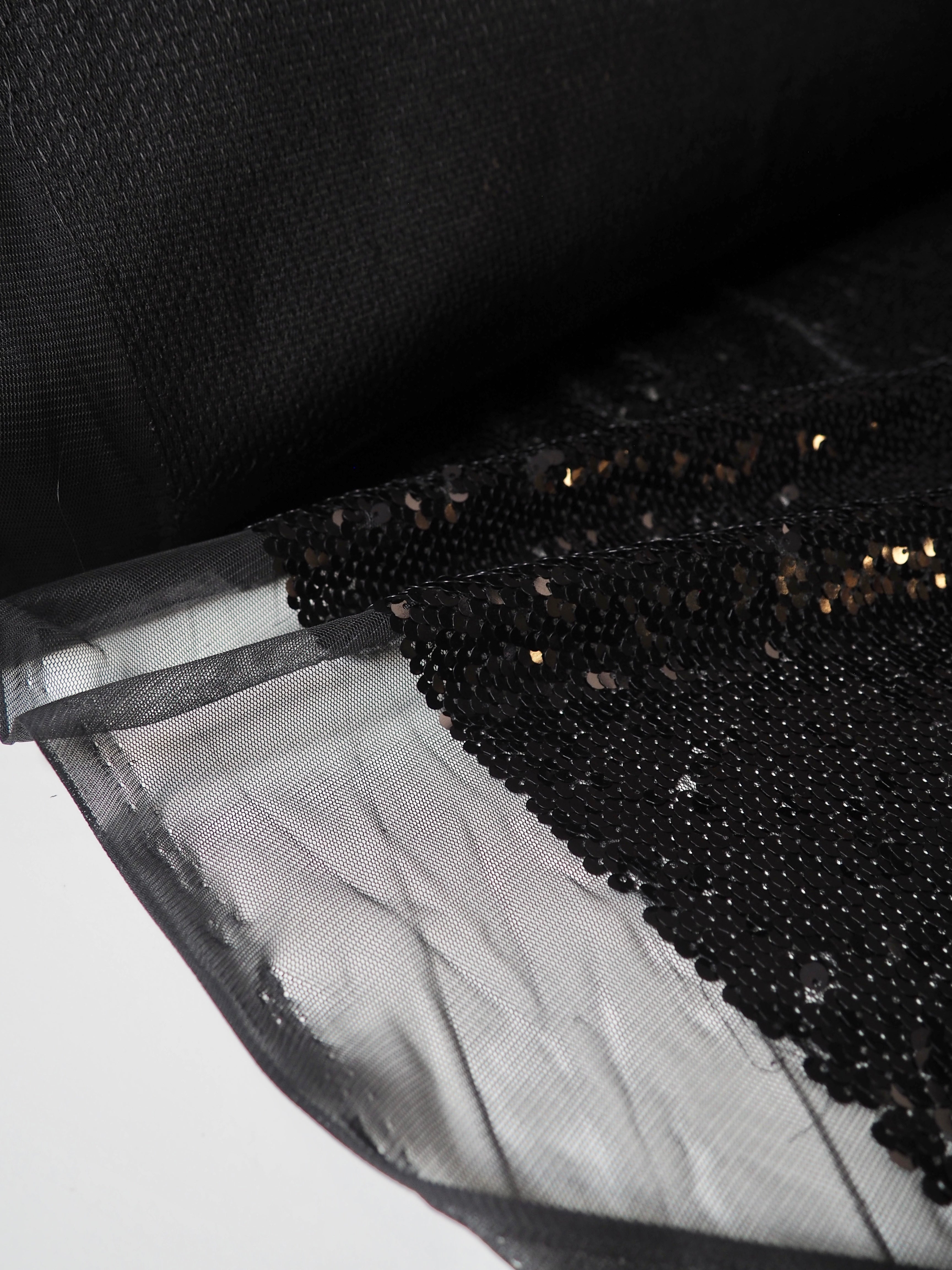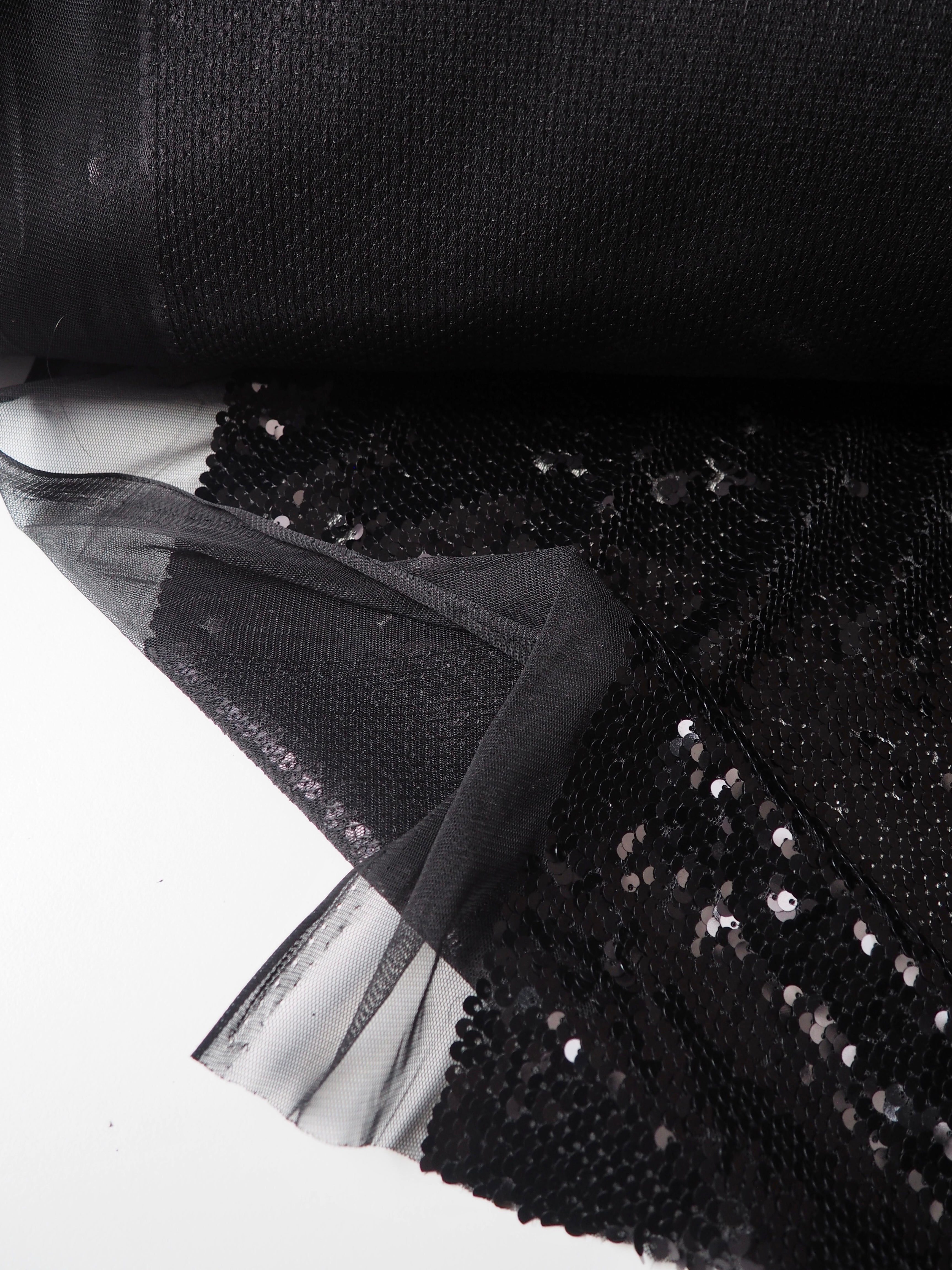 This ex-designer fabric is a sequin tulle. Shiny black sequins with matte backs are woven into this black tulle with eye-catching sheen and great movement in the light! It has a mermaid effect so you can pull the sequins either way for the desired effect. Medium to heavy weight and a good drape, and fuller coverage sequins. This fabric would be perfect for a party dress or skirt!