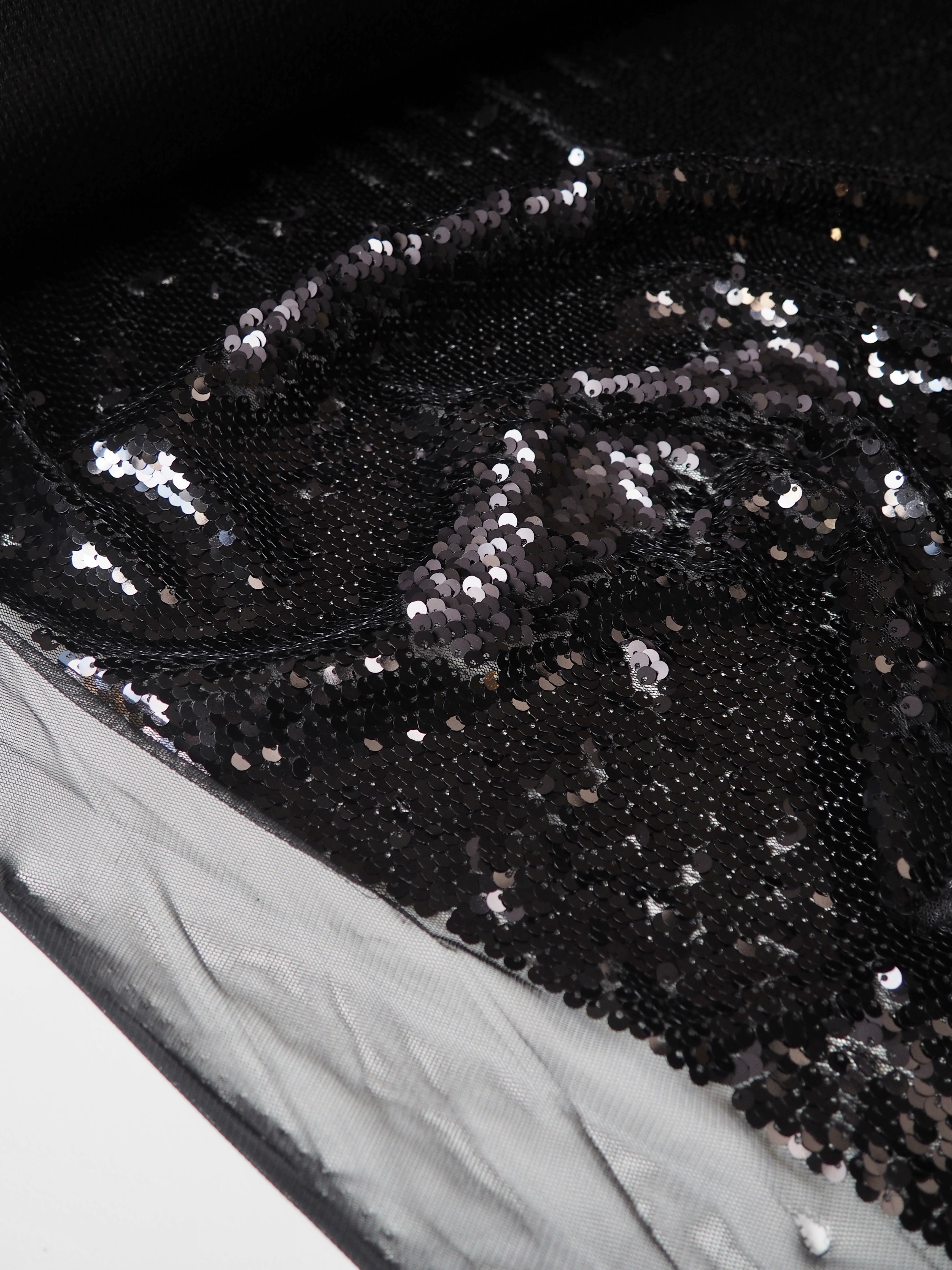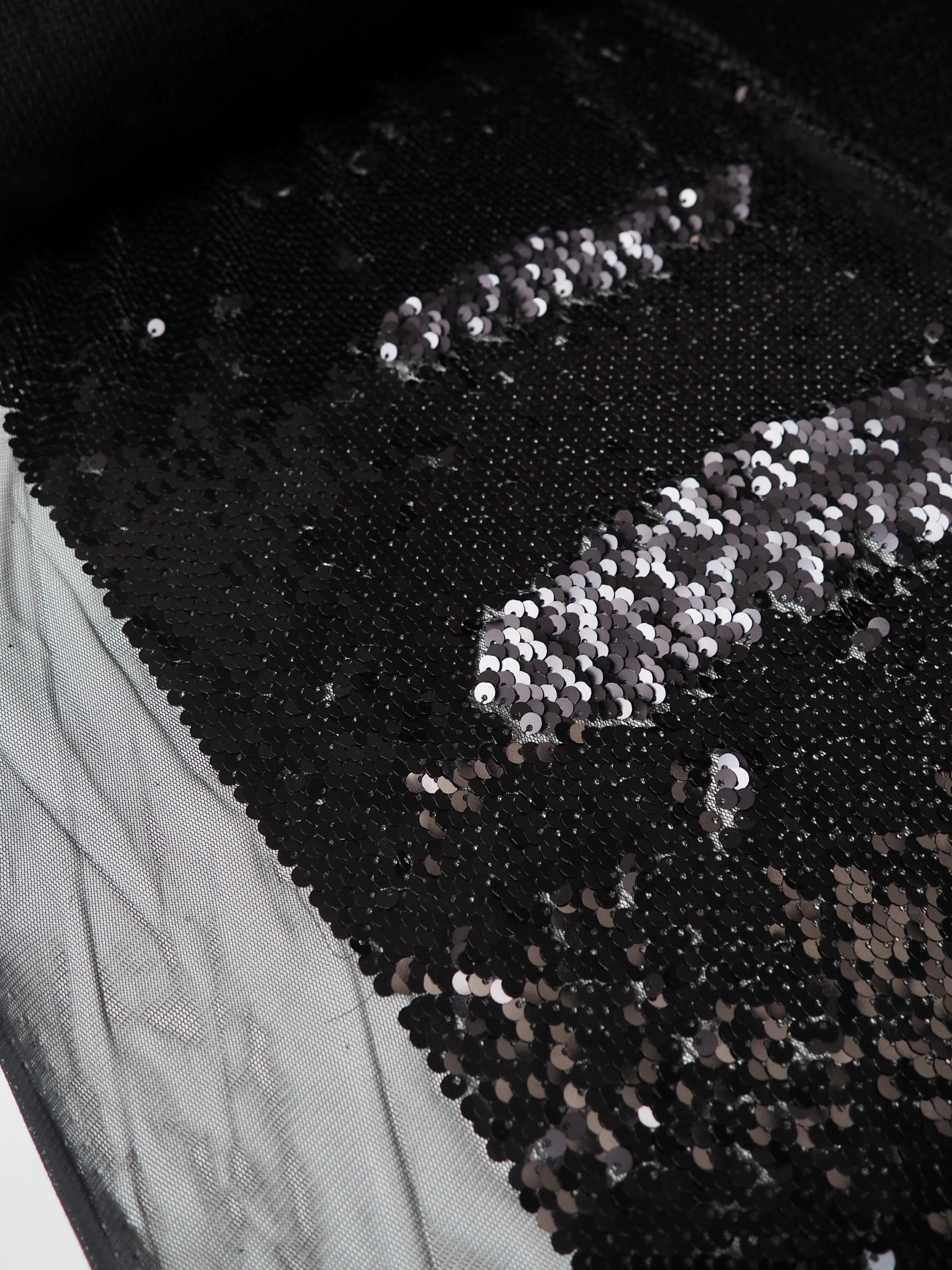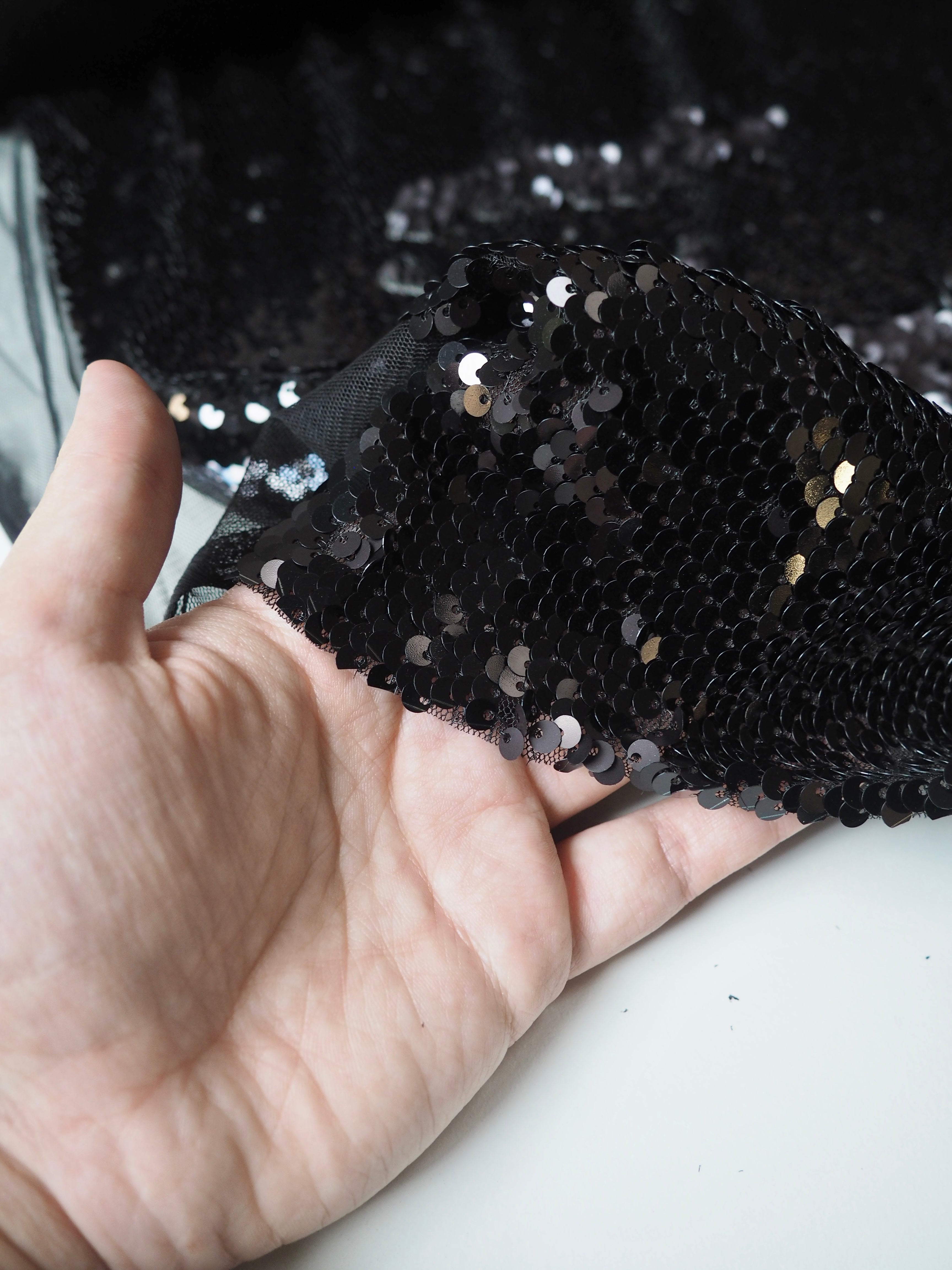 This ex-designer fabric is a sequin tulle. Shiny black sequins with matte backs are woven into this black tulle with eye-catching sheen and great movement in the light! It has a mermaid effect so you can pull the sequins either way for the desired effect. Medium to heavy weight and a good drape, and fuller coverage sequins. This fabric would be perfect for a party dress or skirt!