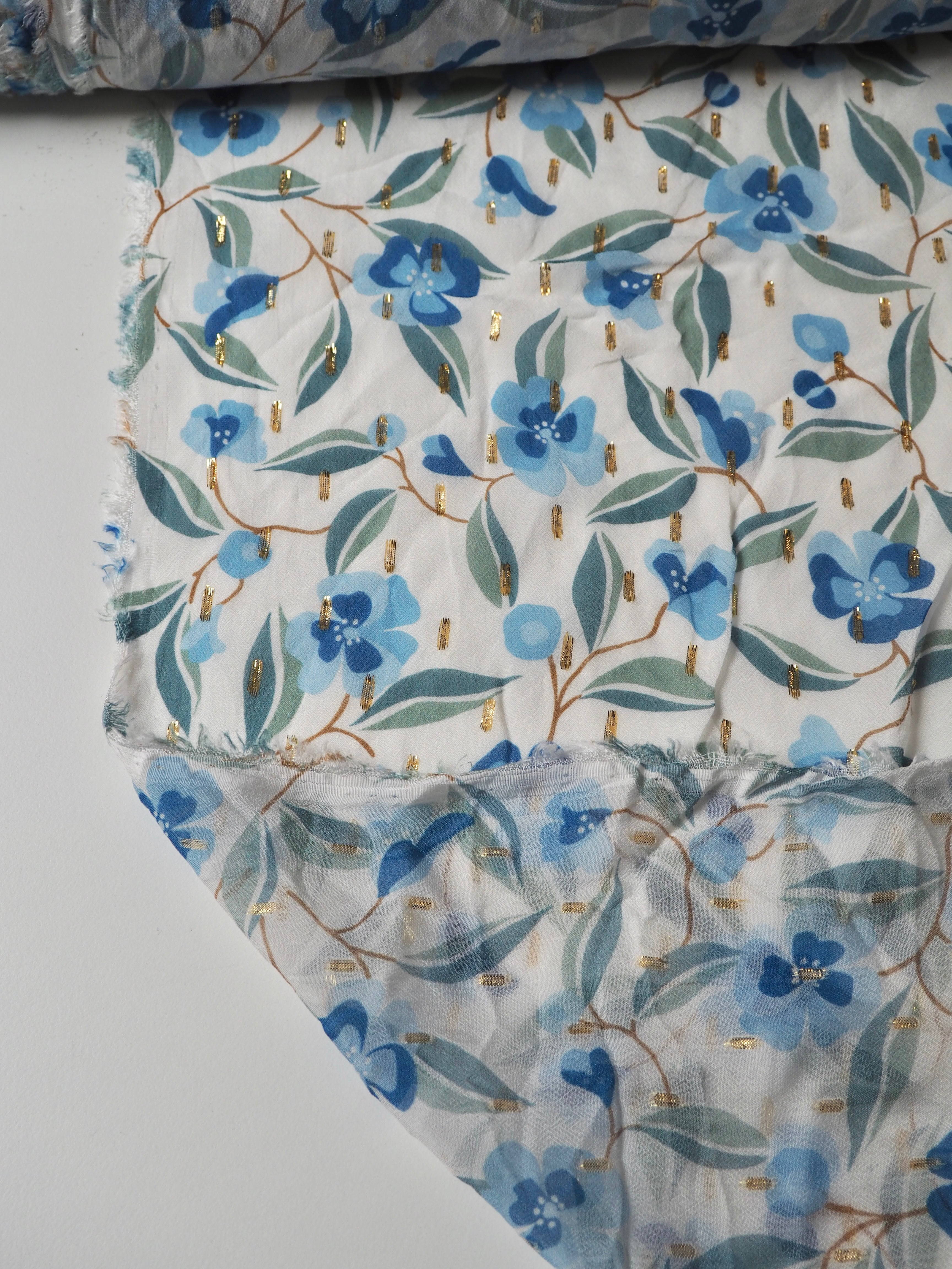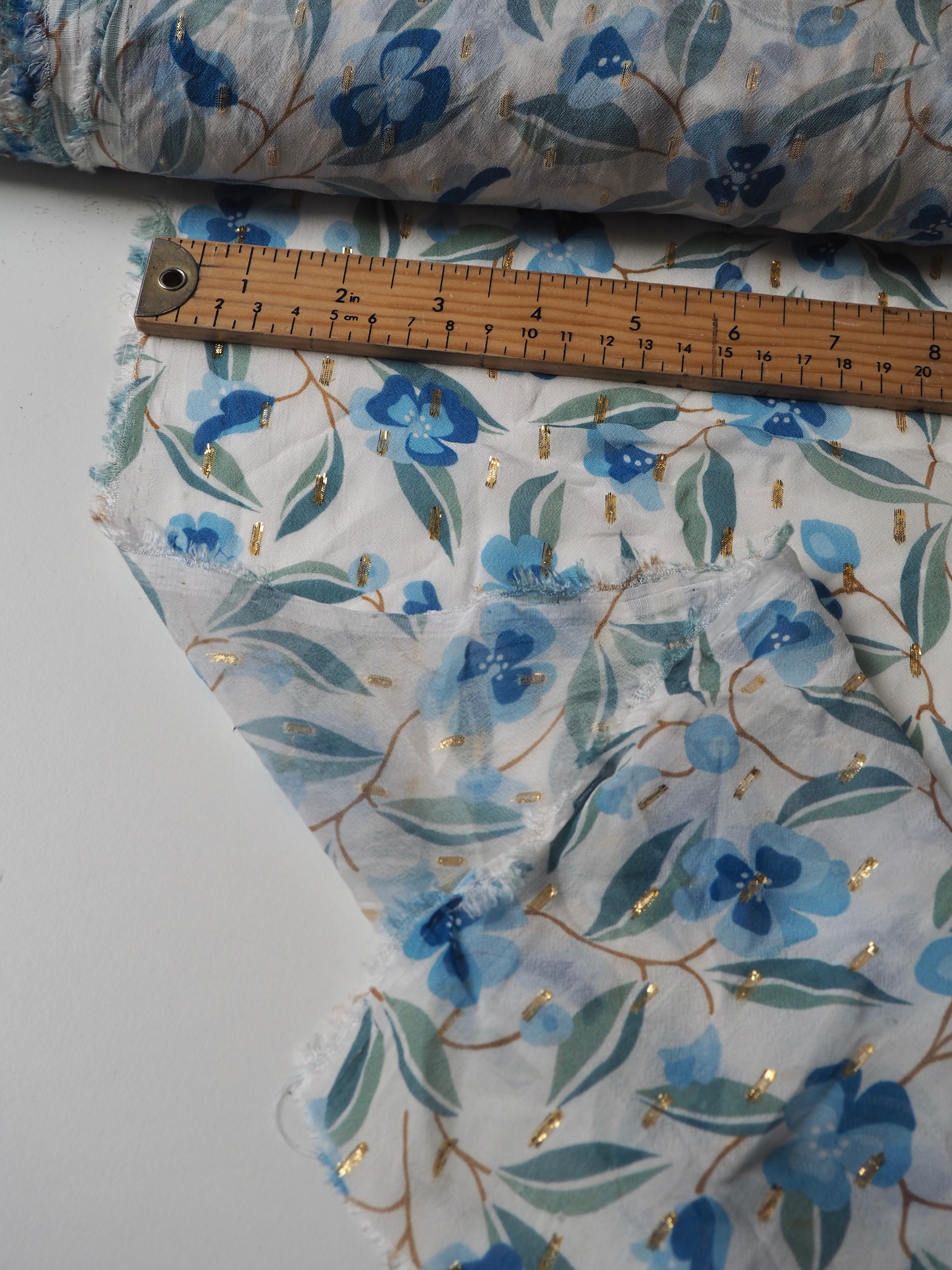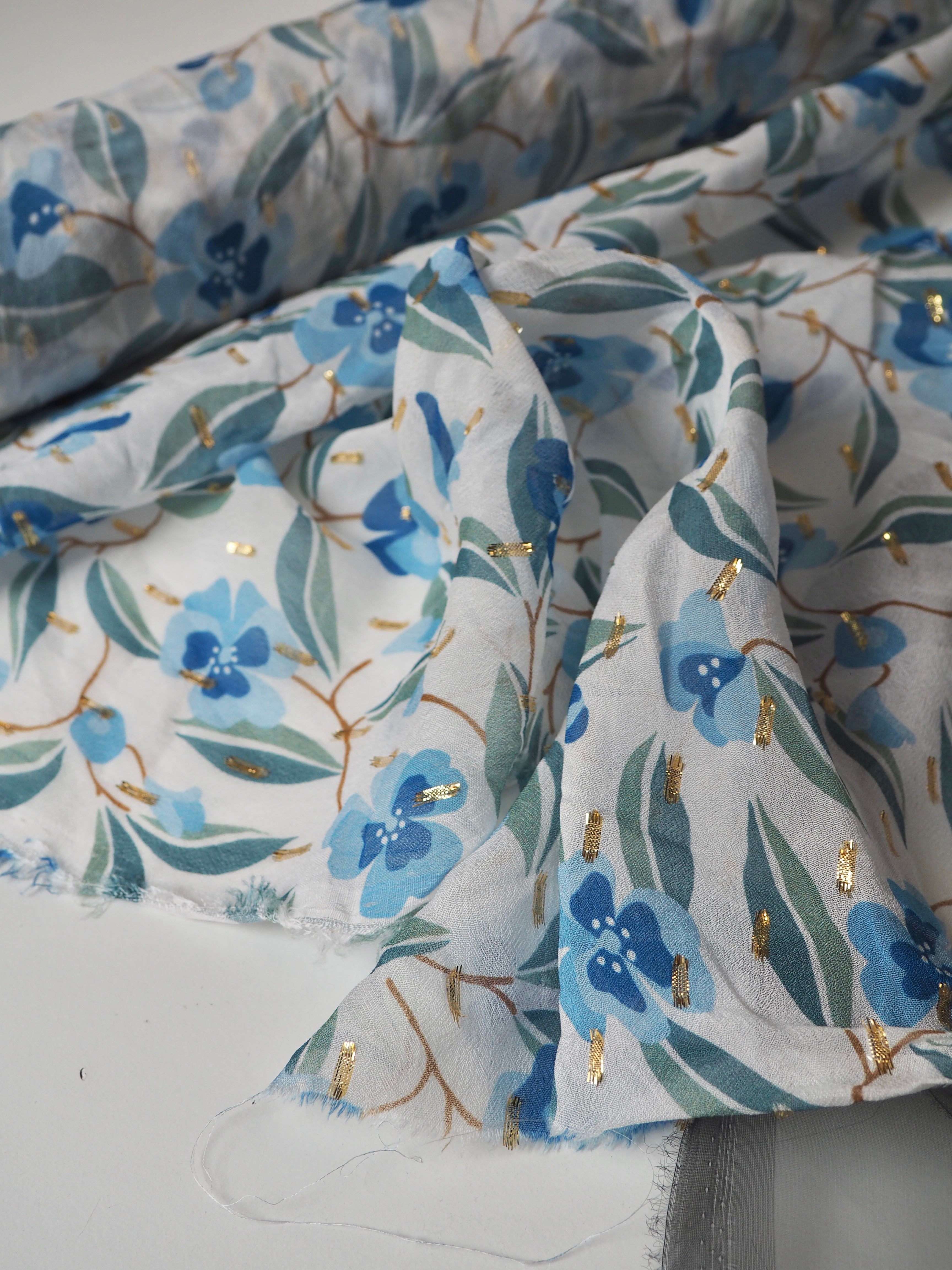 This ex-designer fabric is a printed chiffon. It's a chiffon with a white background and green and blue flowers. It's dotted with a gold lurex for extra sparkle. It's lightweight and semi-sheer, with wonderful drape. It has such a lovely handle! Great movement with a flat finish. Perfect for a scarf, drapey top, or swishy skirt!