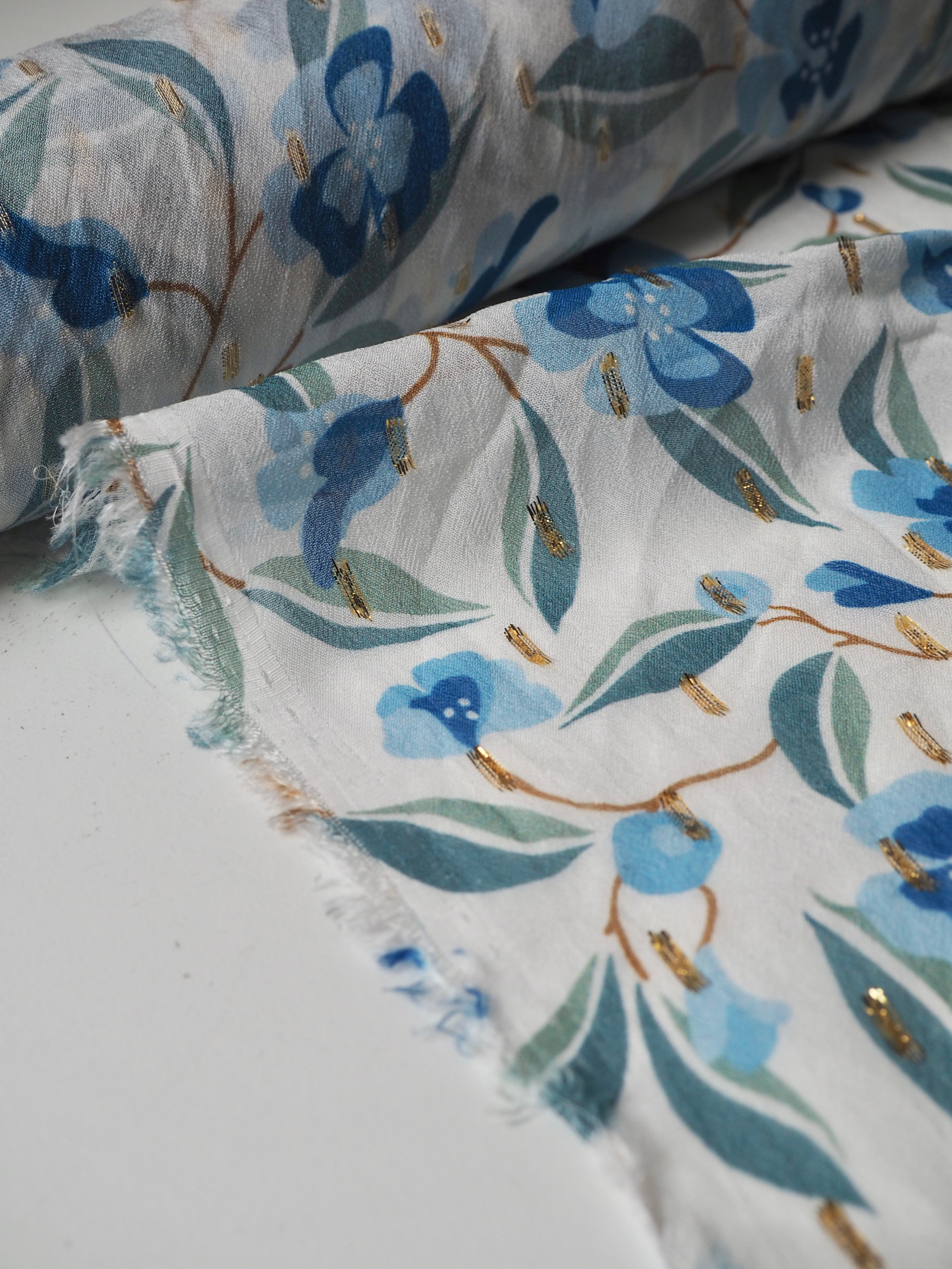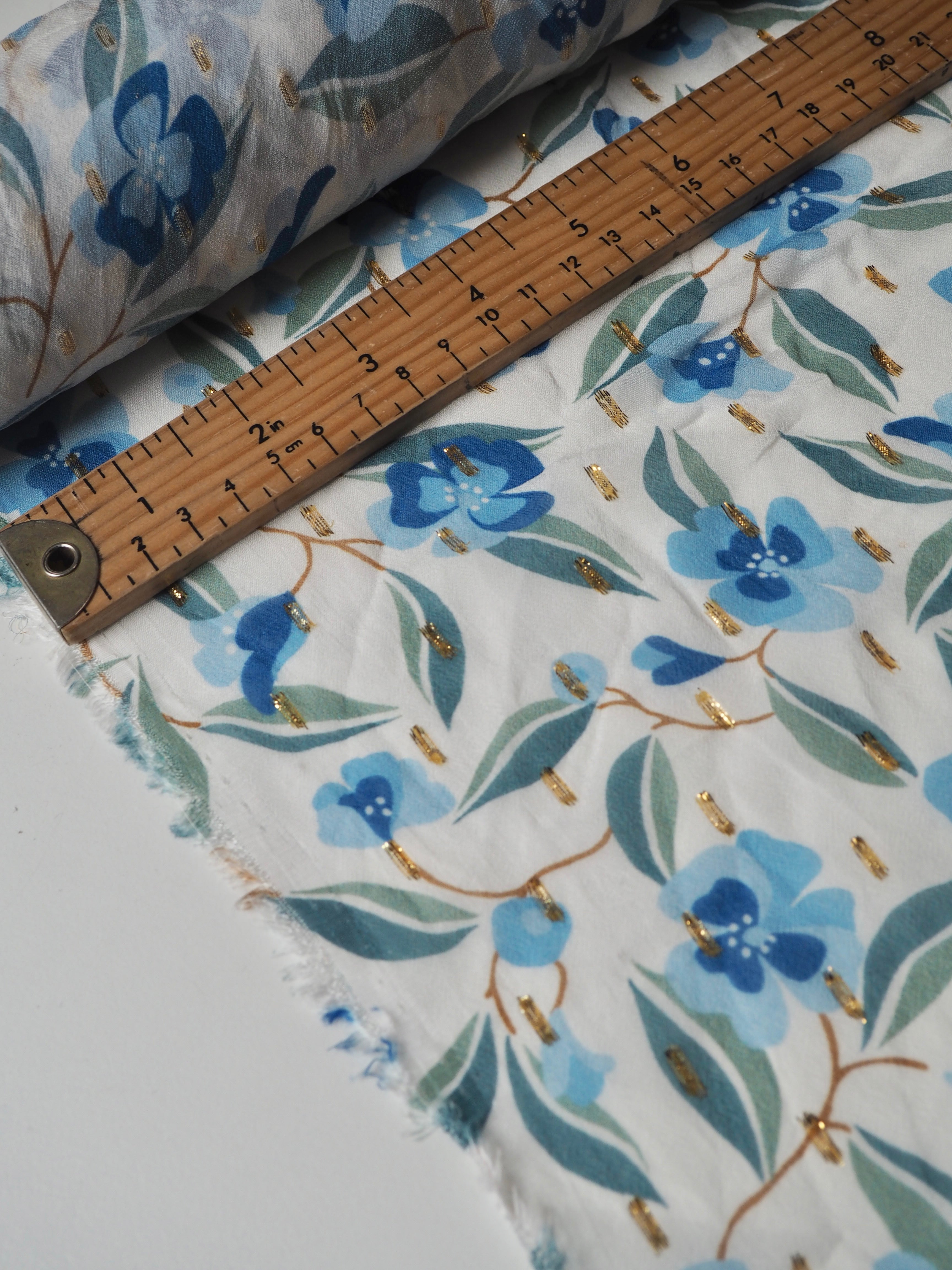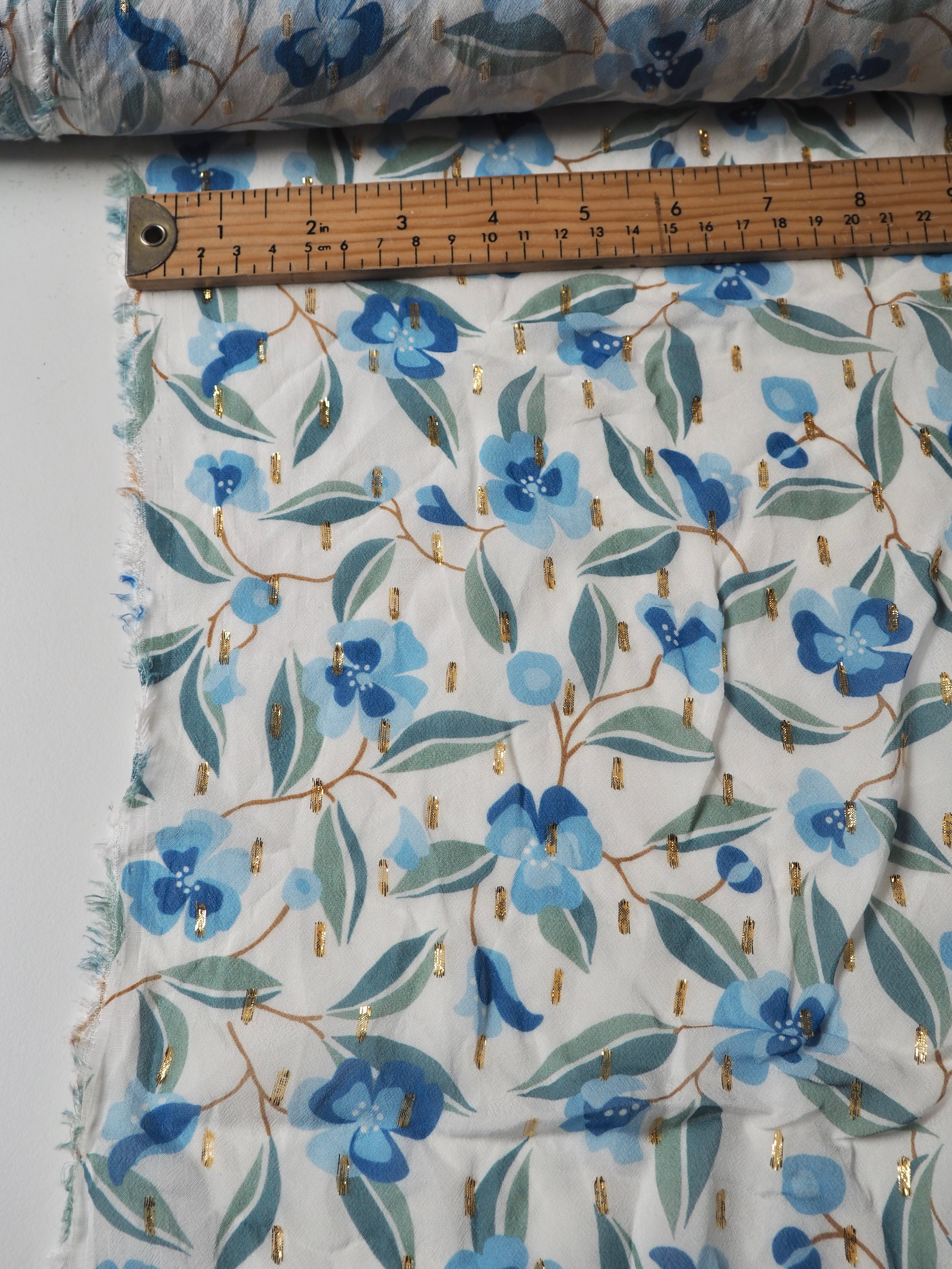 This ex-designer fabric is a printed chiffon. It's a chiffon with a white background and green and blue flowers. It's dotted with a gold lurex for extra sparkle. It's lightweight and semi-sheer, with wonderful drape. It has such a lovely handle! Great movement with a flat finish. Perfect for a scarf, drapey top, or swishy skirt!