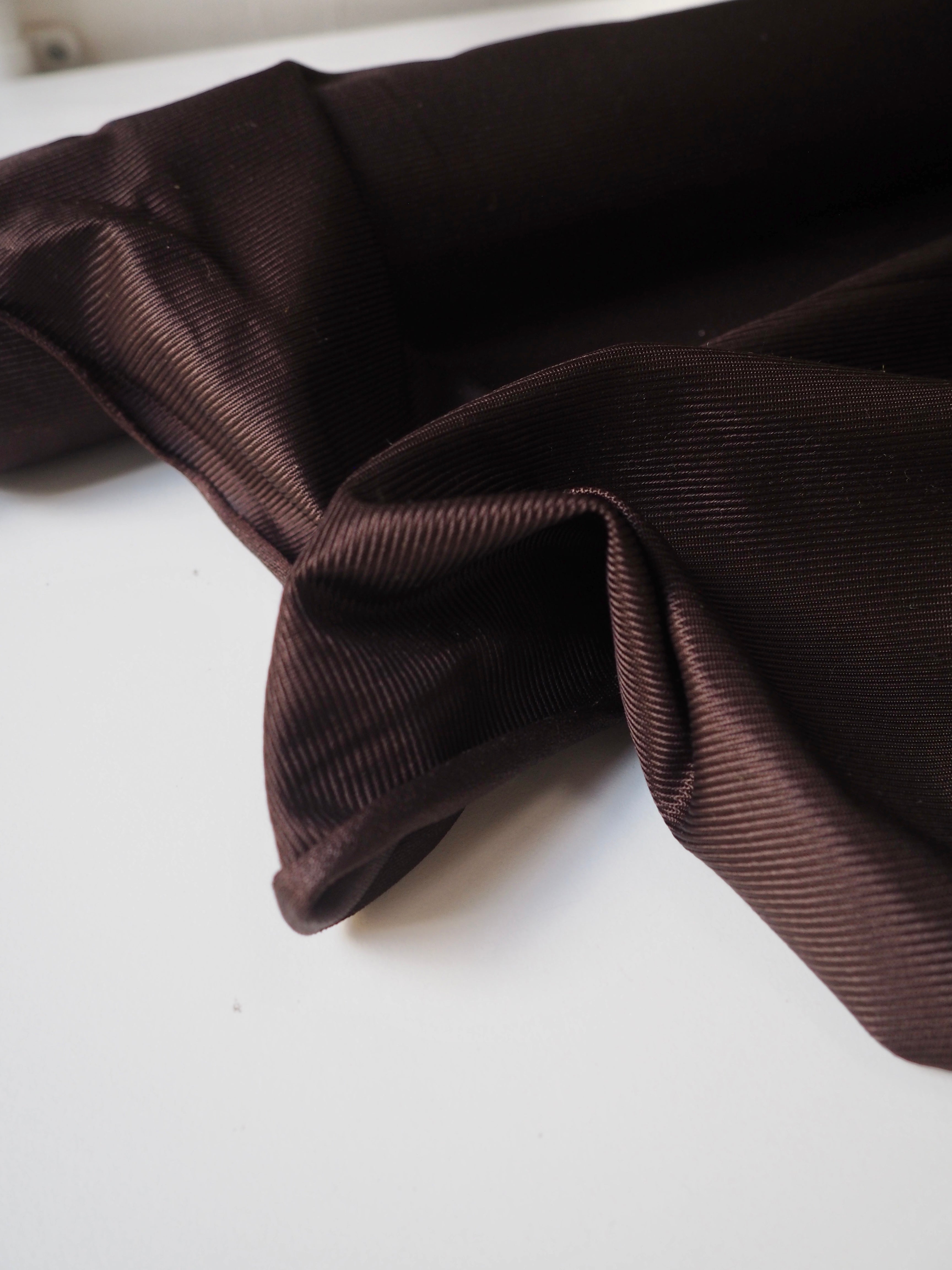 This ex-designer fabric is a jersey. It has a faille-like rib running the width of the cloth, with a smooth backing. Completely opaque, quite slinky, with a lovely sheen finish. Has a nice drape and approximately 20% width-ways stretch. Perfect for an elevated basic!