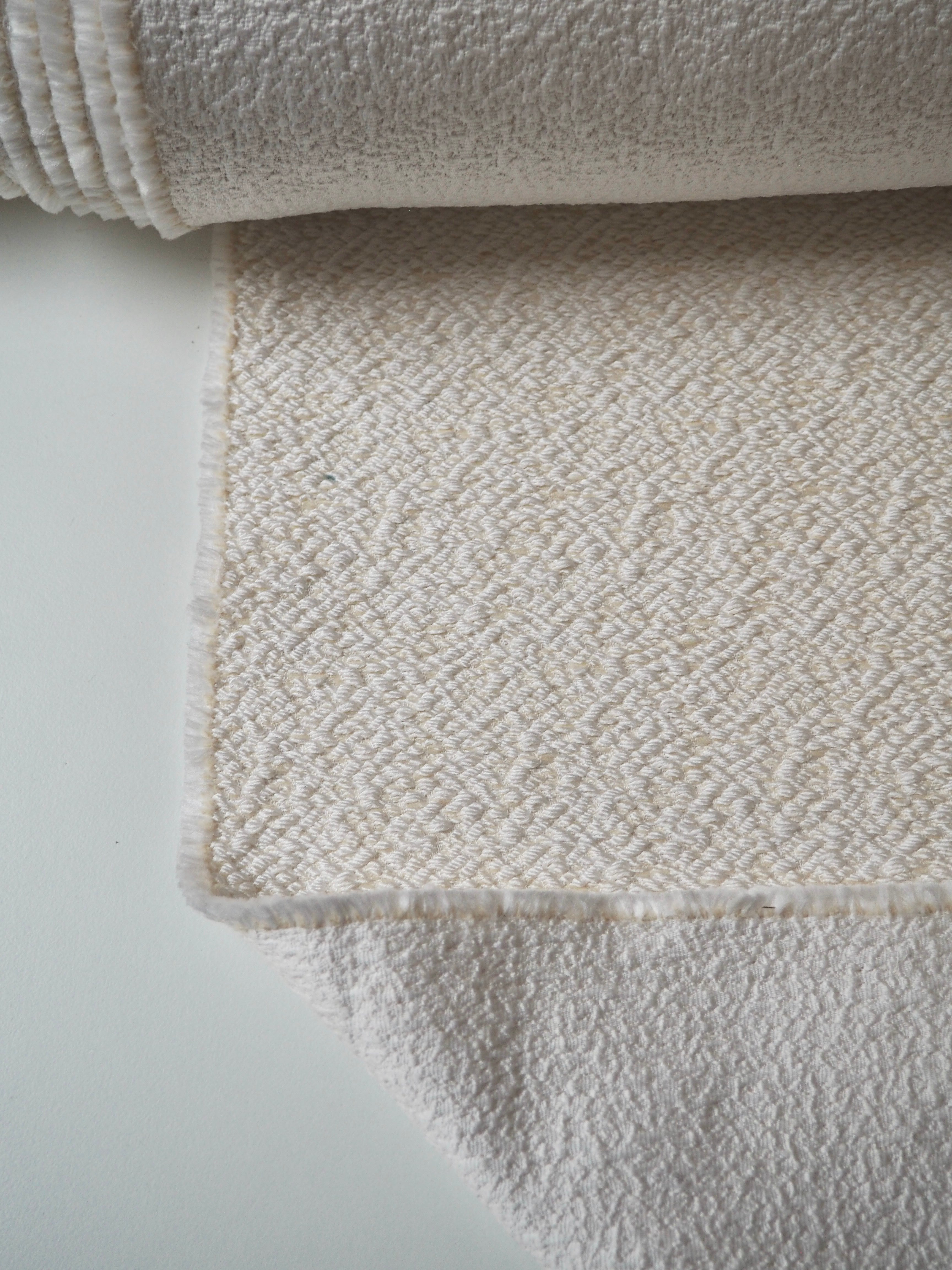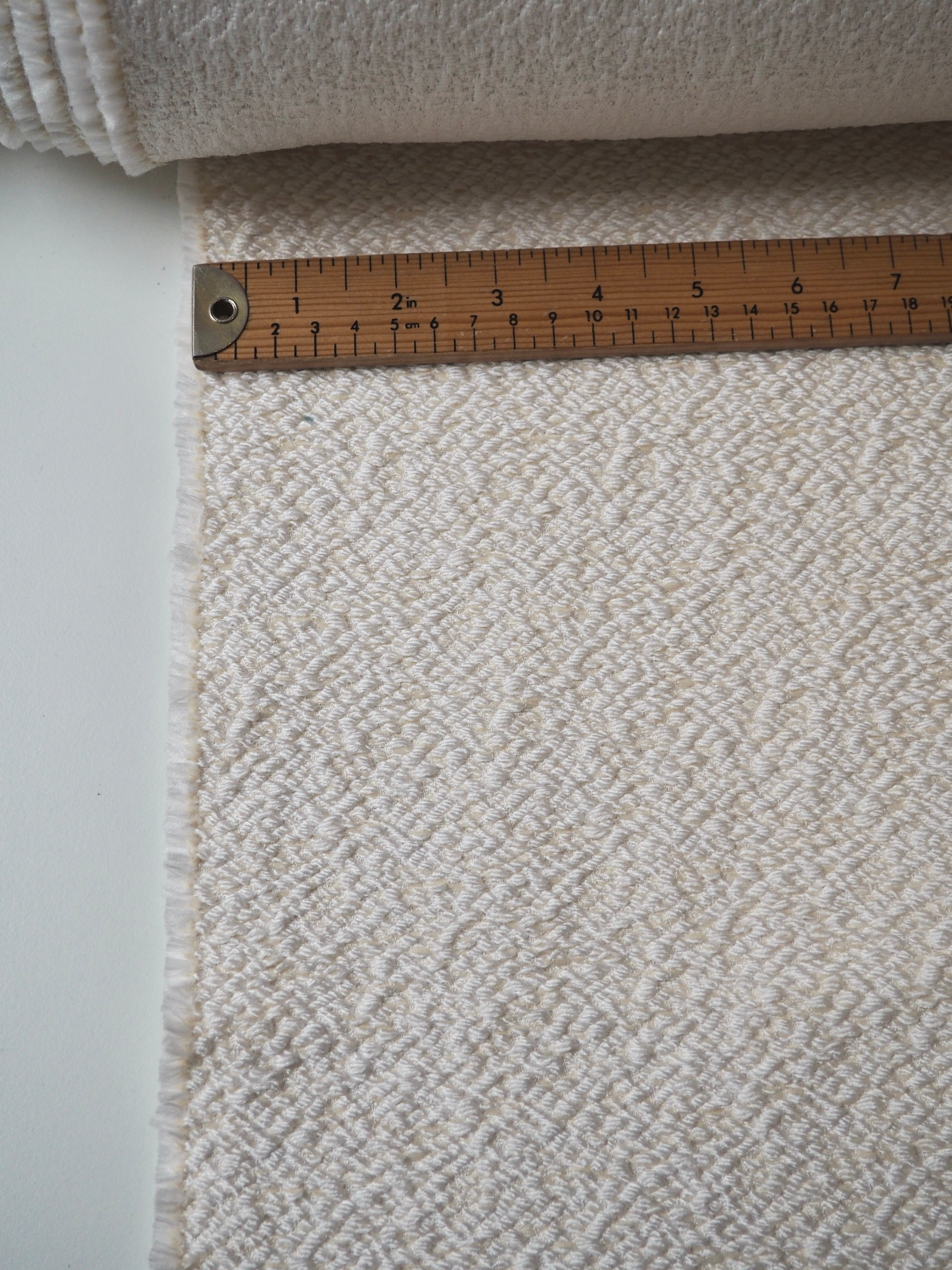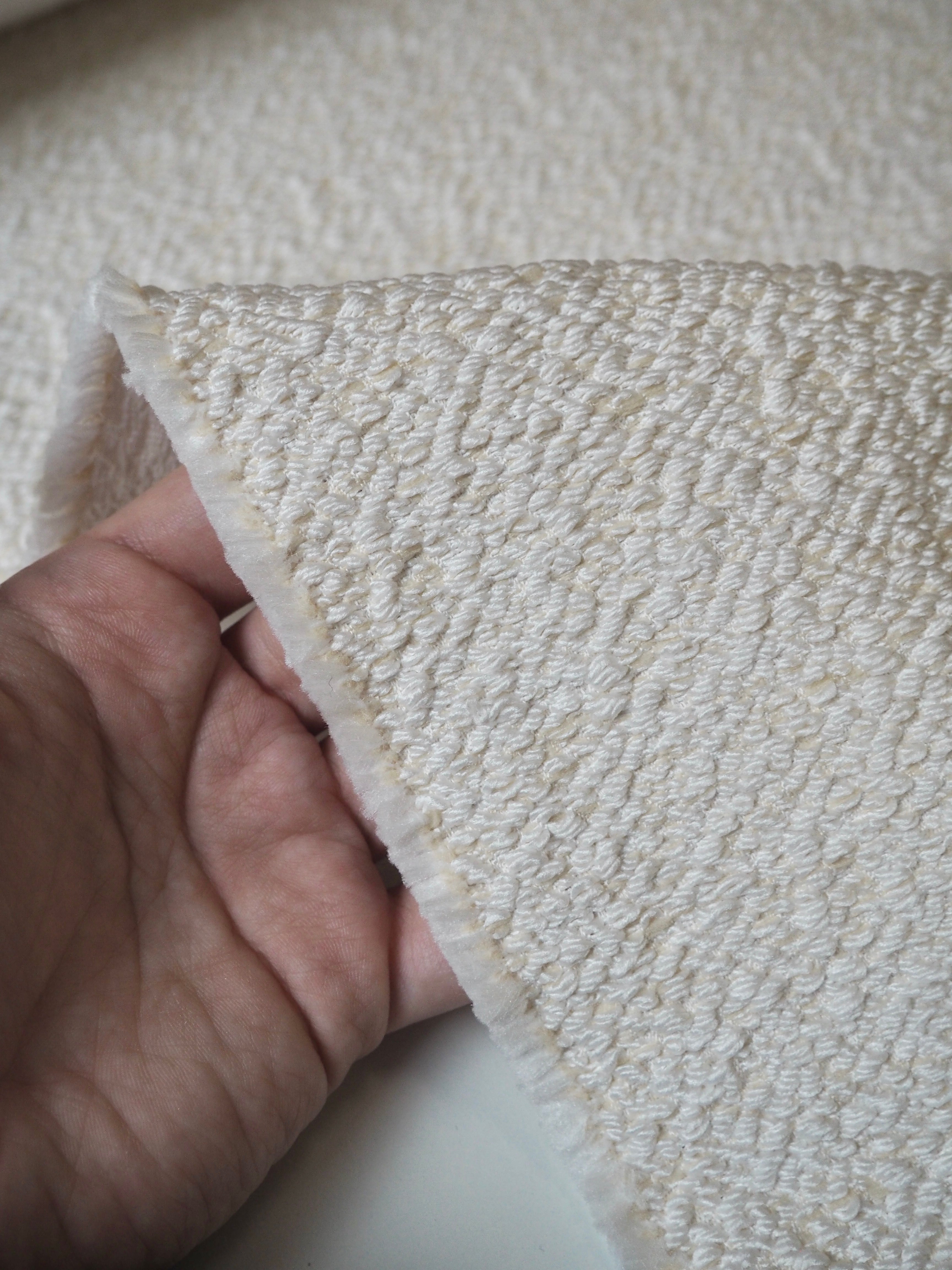 This ex-designer fabric is a jacquard. It has a textured, bumpy, raised topside that's quite interesting, in a cream and ivory shade mix. Gives it an interesting depth! It's medium weight with a sturdy handle. Opaque and has a great structure to play with. Has a sheen finish as well. Would be great on a structured jacket and furnishings, or even a bridal look!