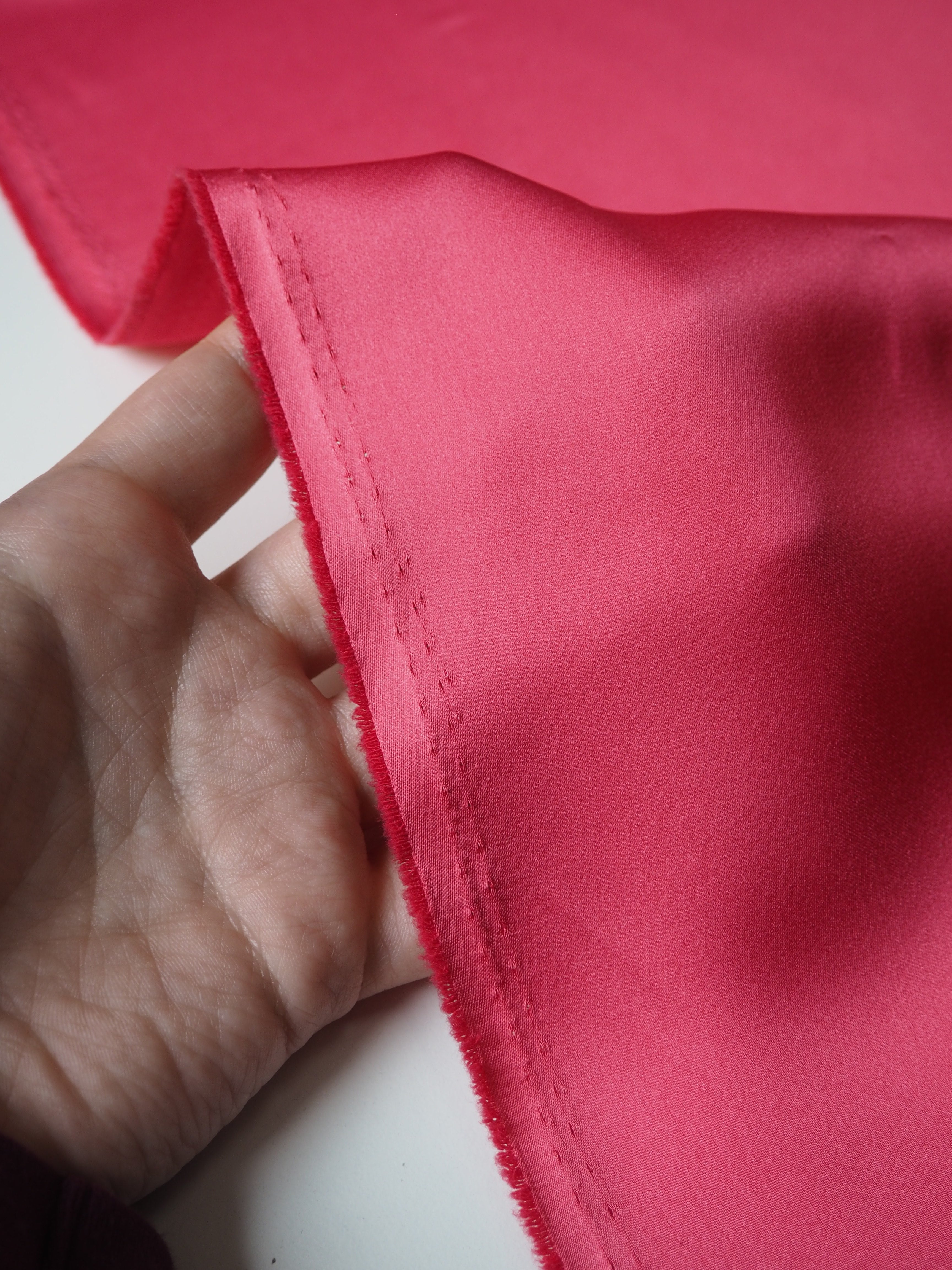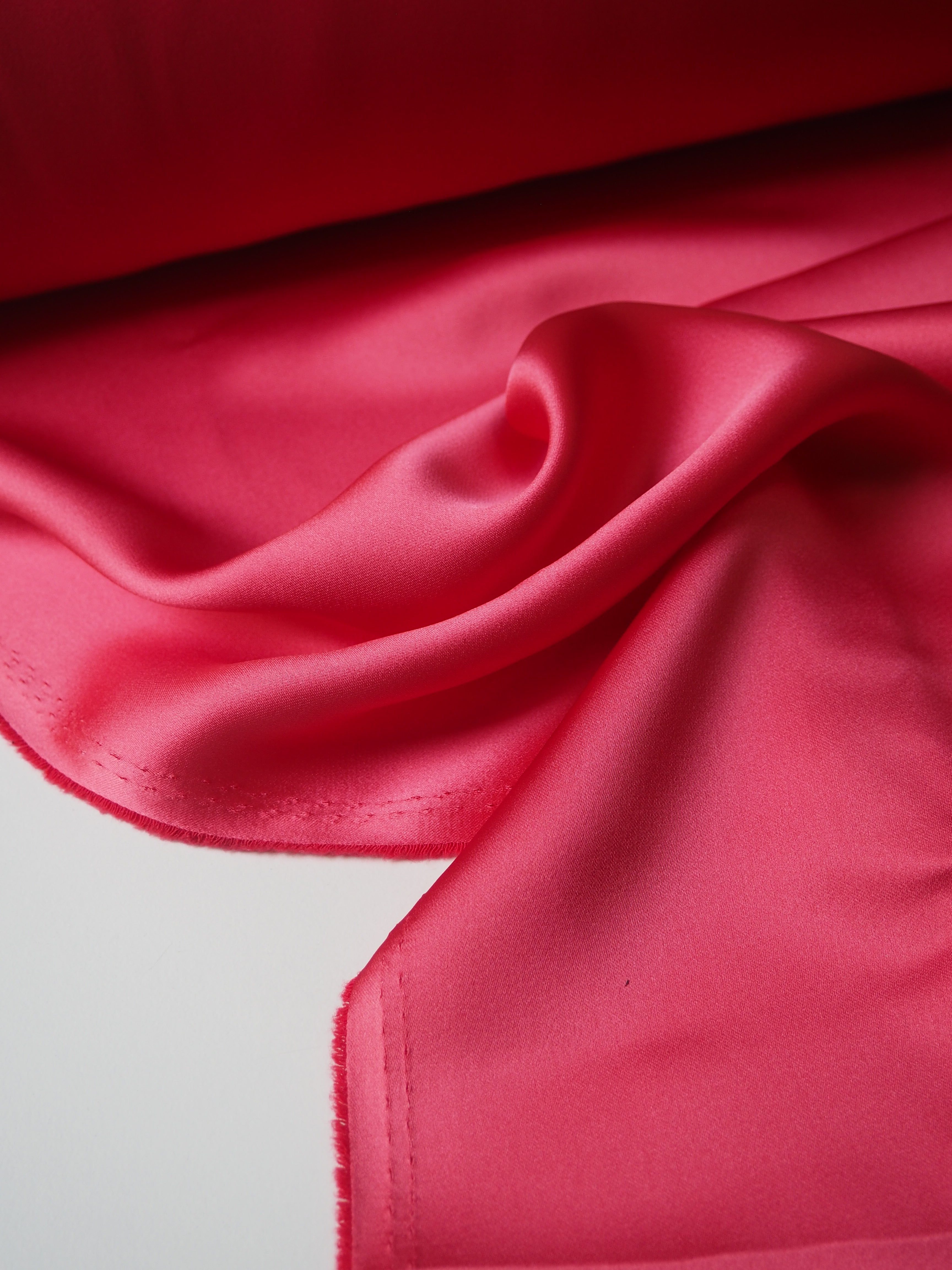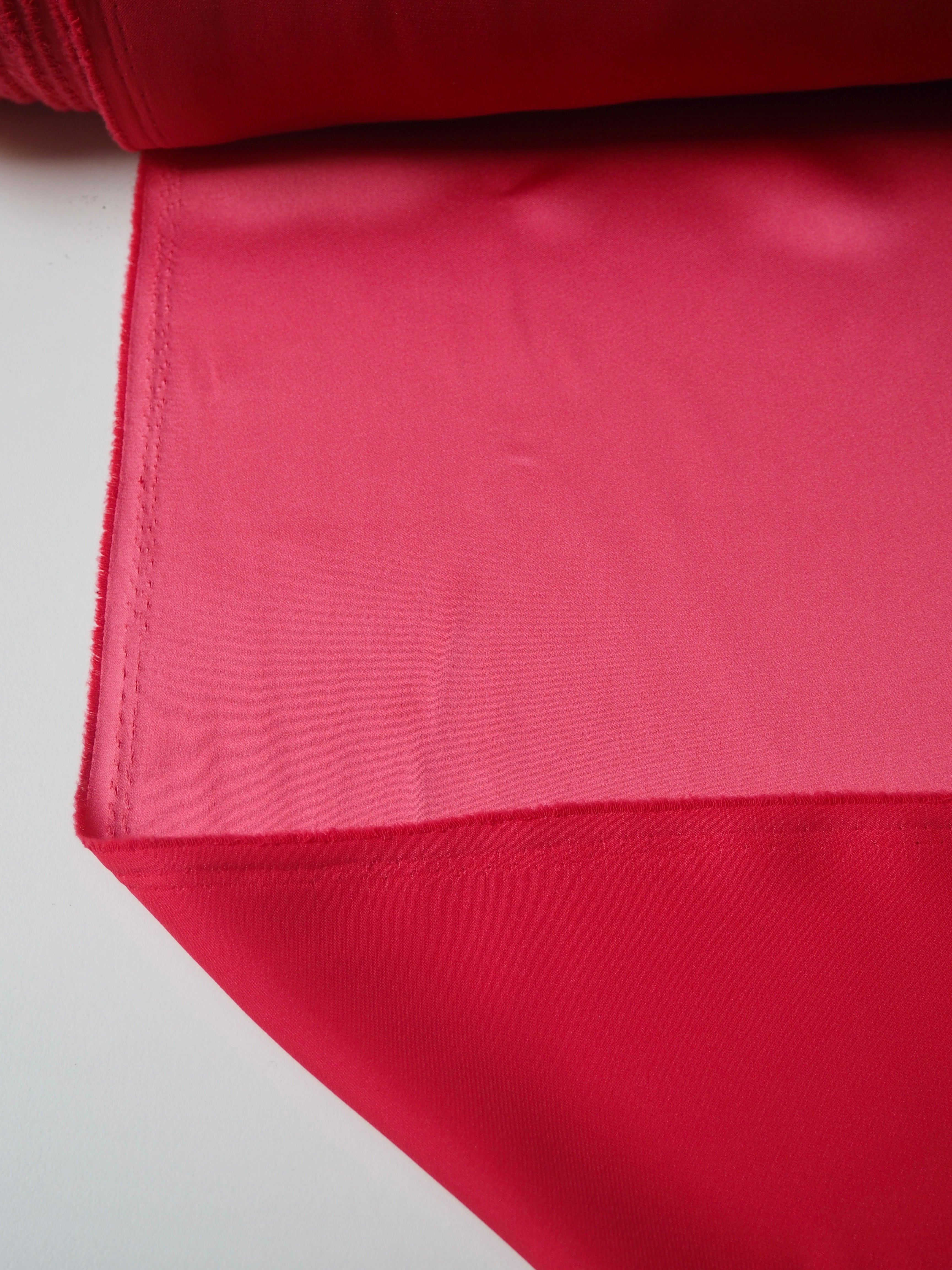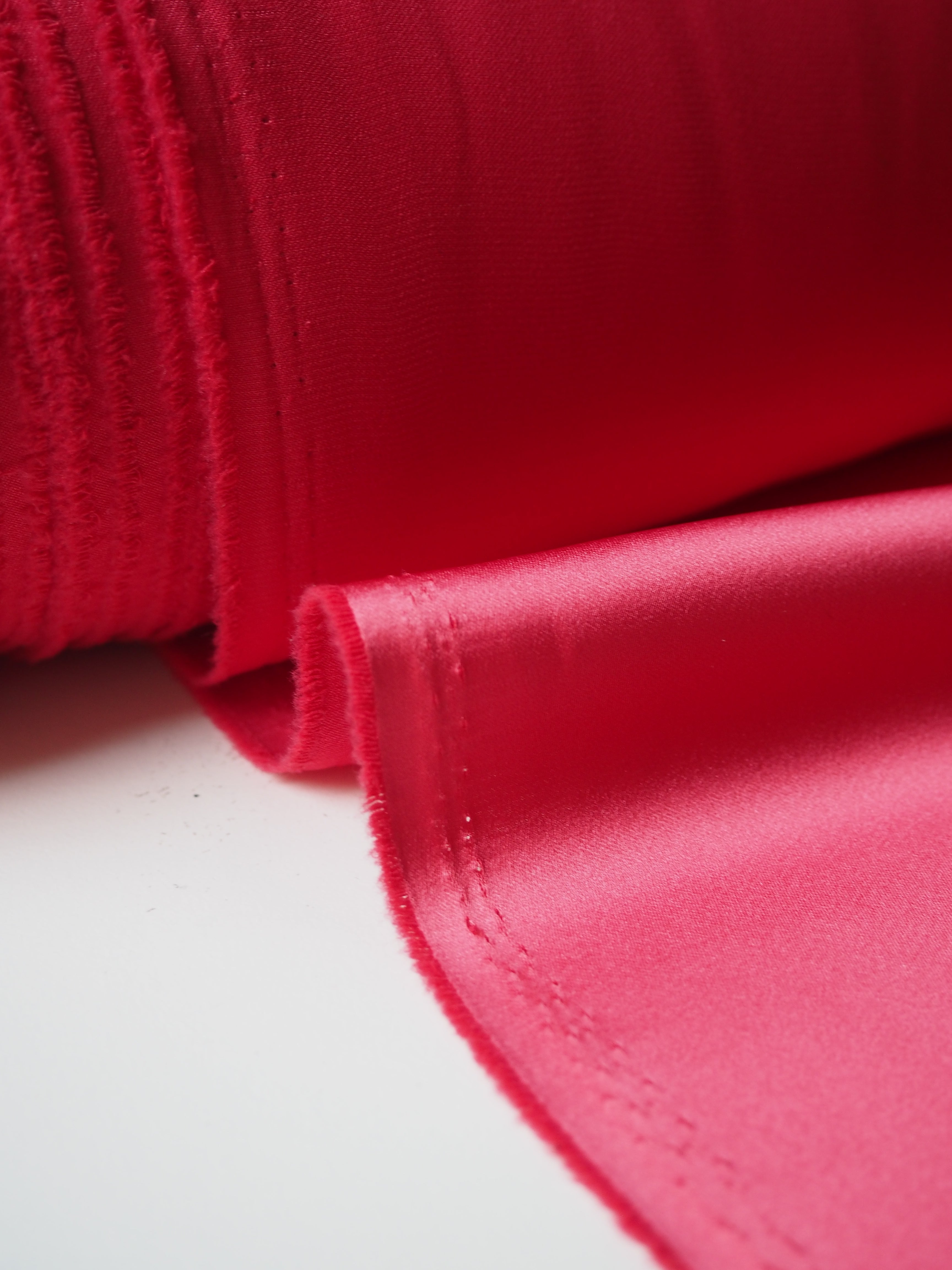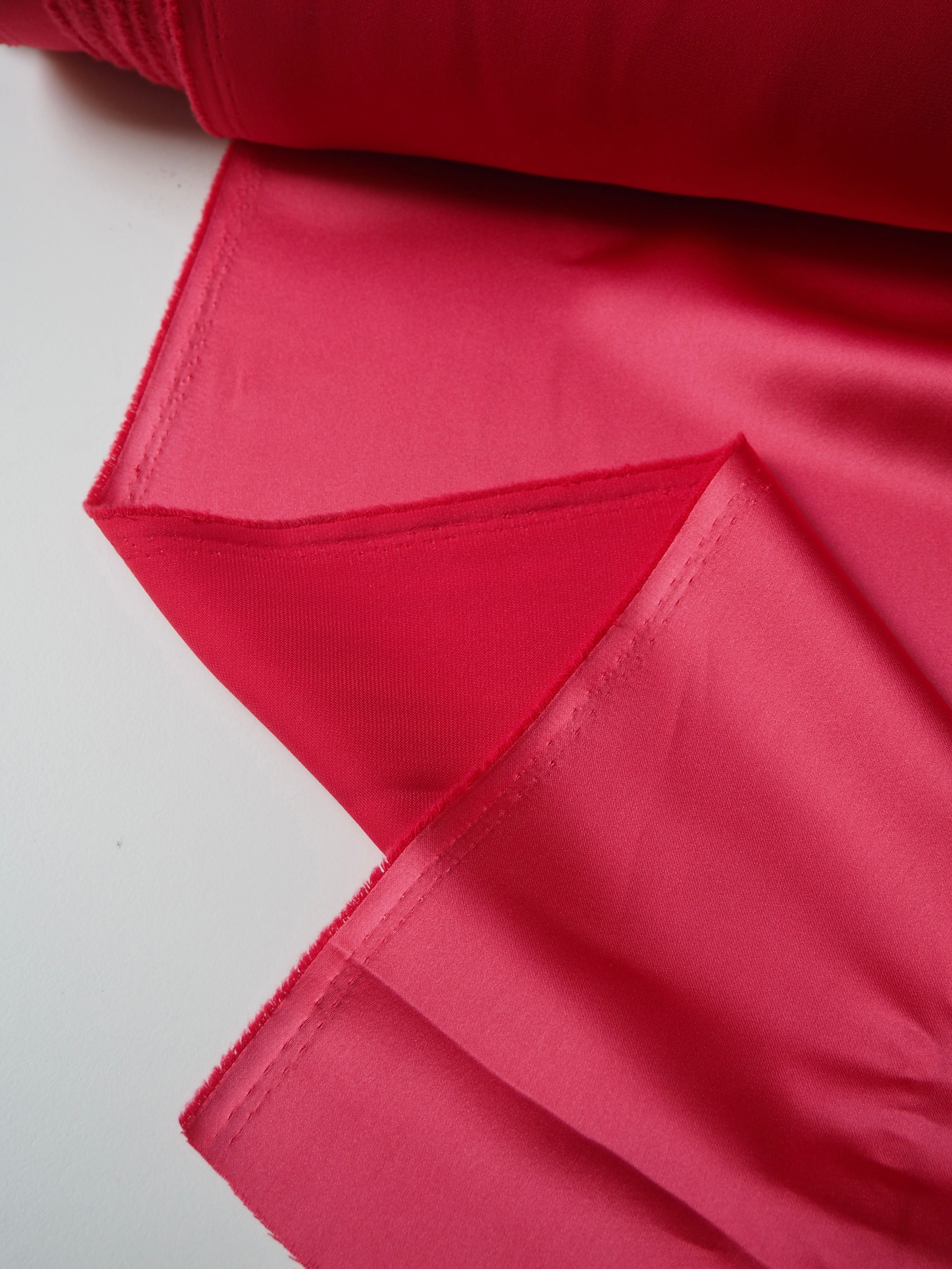 This ex-designer fabric is a satin. It's in a light red shade, in a light weight. It has a very smooth handle, slinky feel, and great movement and drape. Has a lovely smooth, satin sheen on the topside in a lighter red, with a crepe-y reverse. Has a lovely handle, and is fully opaque. Perfect for bias dresses!