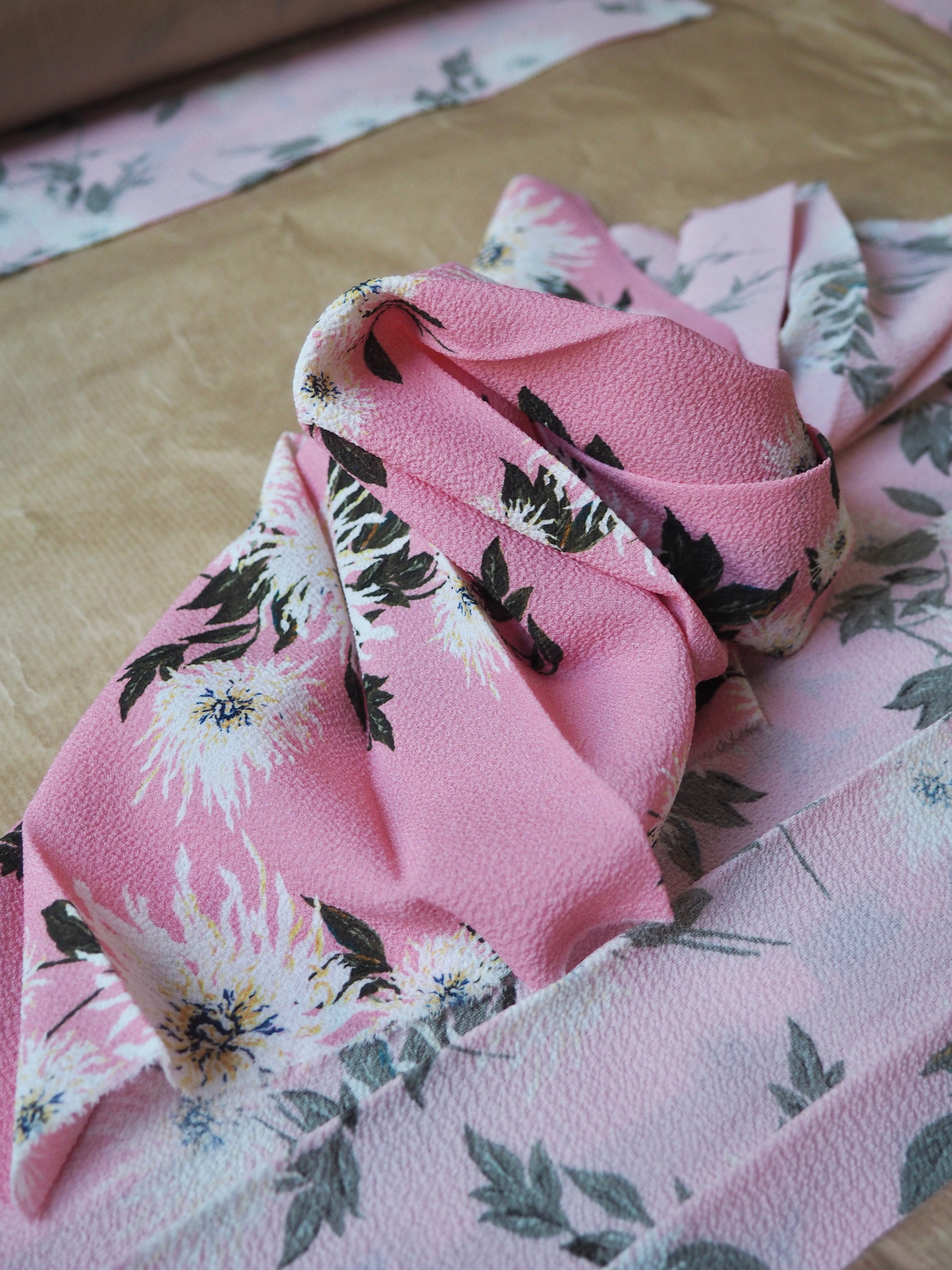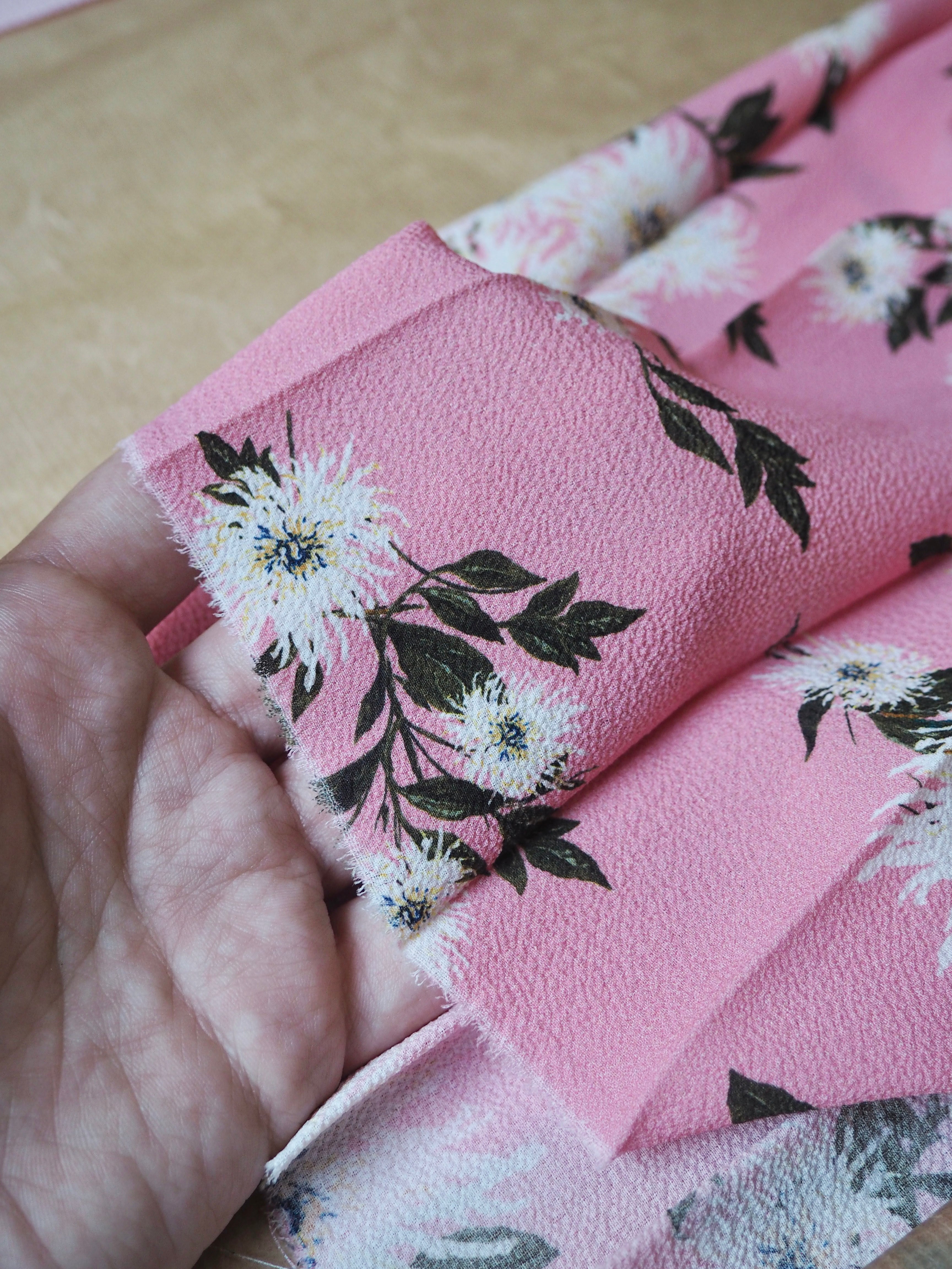 This ex-designer fabric is a pre-pleated crepe. It's a pink floral crinkle crepe, that has been knife-pleated and cut into uniform pieces. The pleats are about 4cm deep. The pleating transforms this cloth to give it a soft drape with wonderful movement. Opaque with a soft and pliant handle. Has the perfect bounce for tops or piecing together for a skirt!