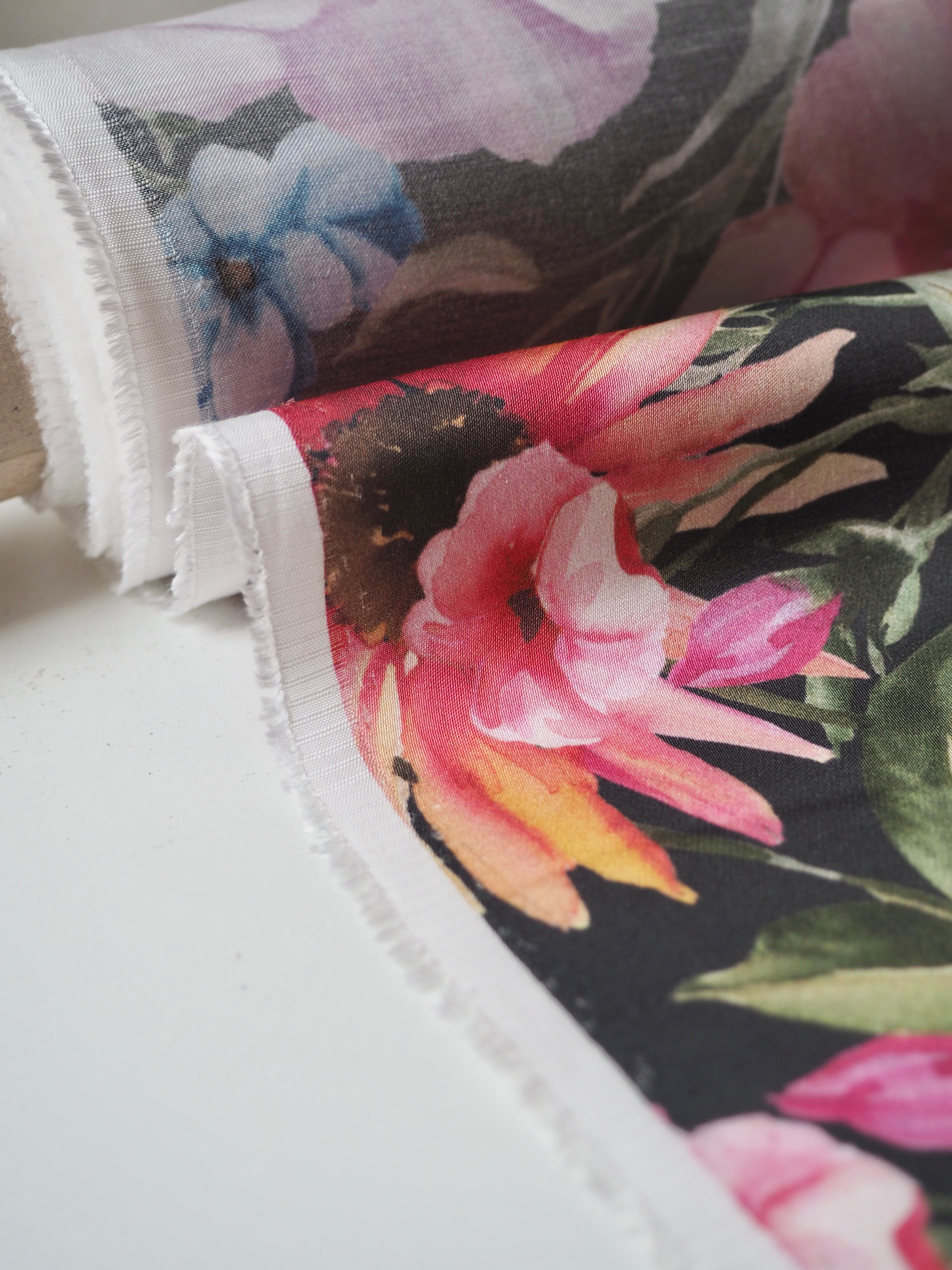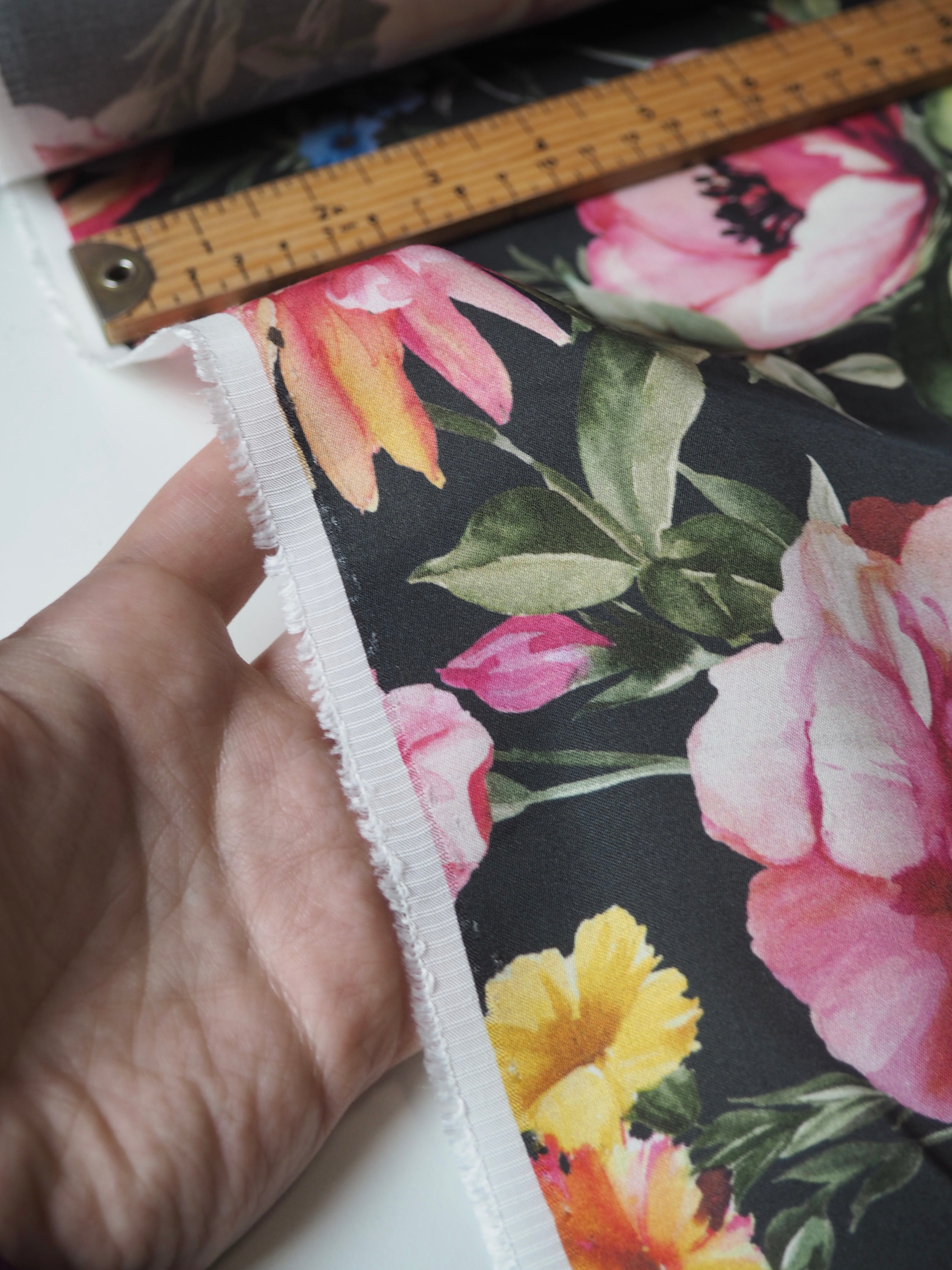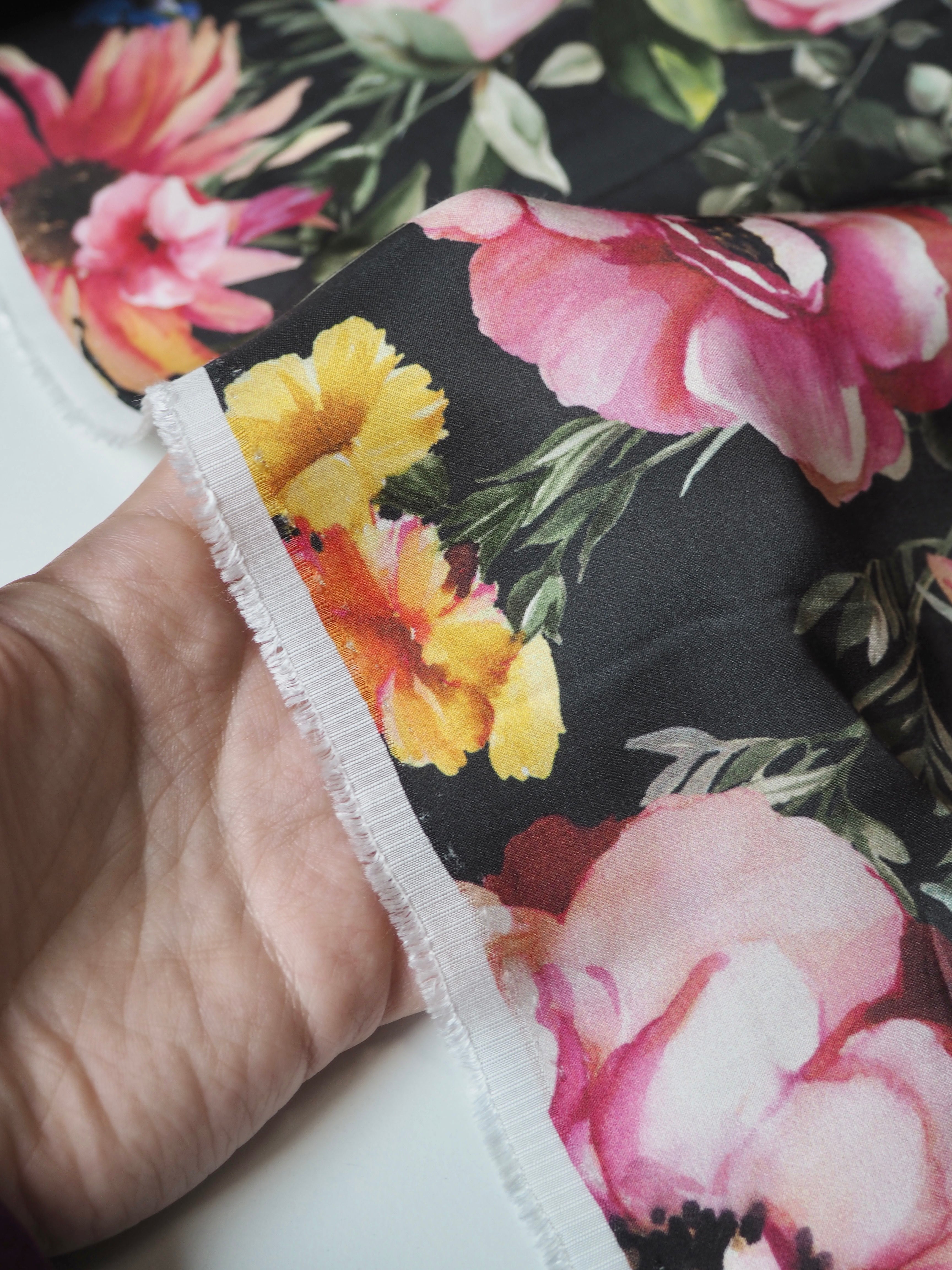 This ex-designer fabric is a smooth viscose. It's in a vibrant floral on black print, with a sateen finish. It's very lightweight and fully opaque. It's so drapey and has beautiful movement! Has a great smooth handle and would be lovely as a summer top or  dress!