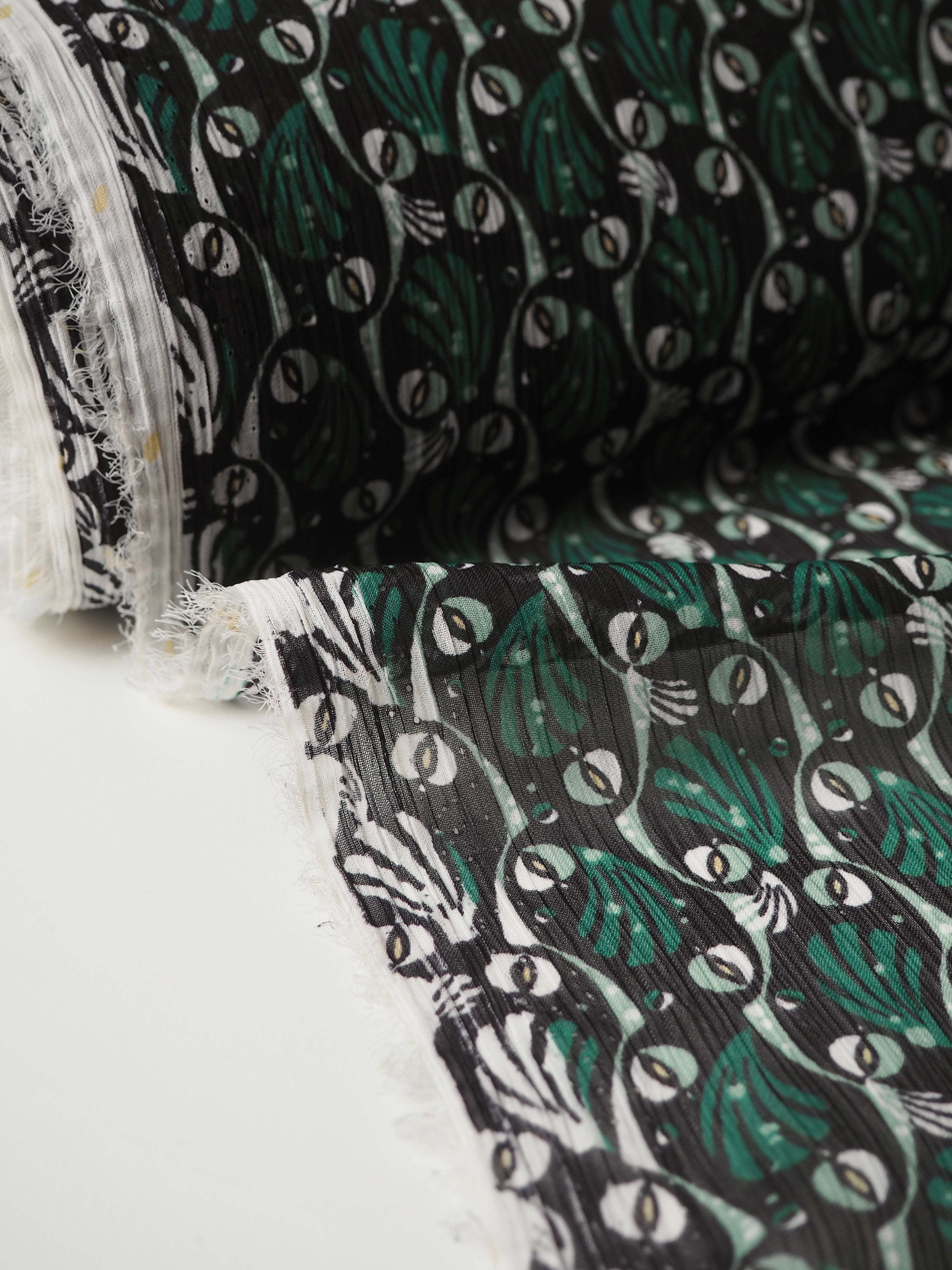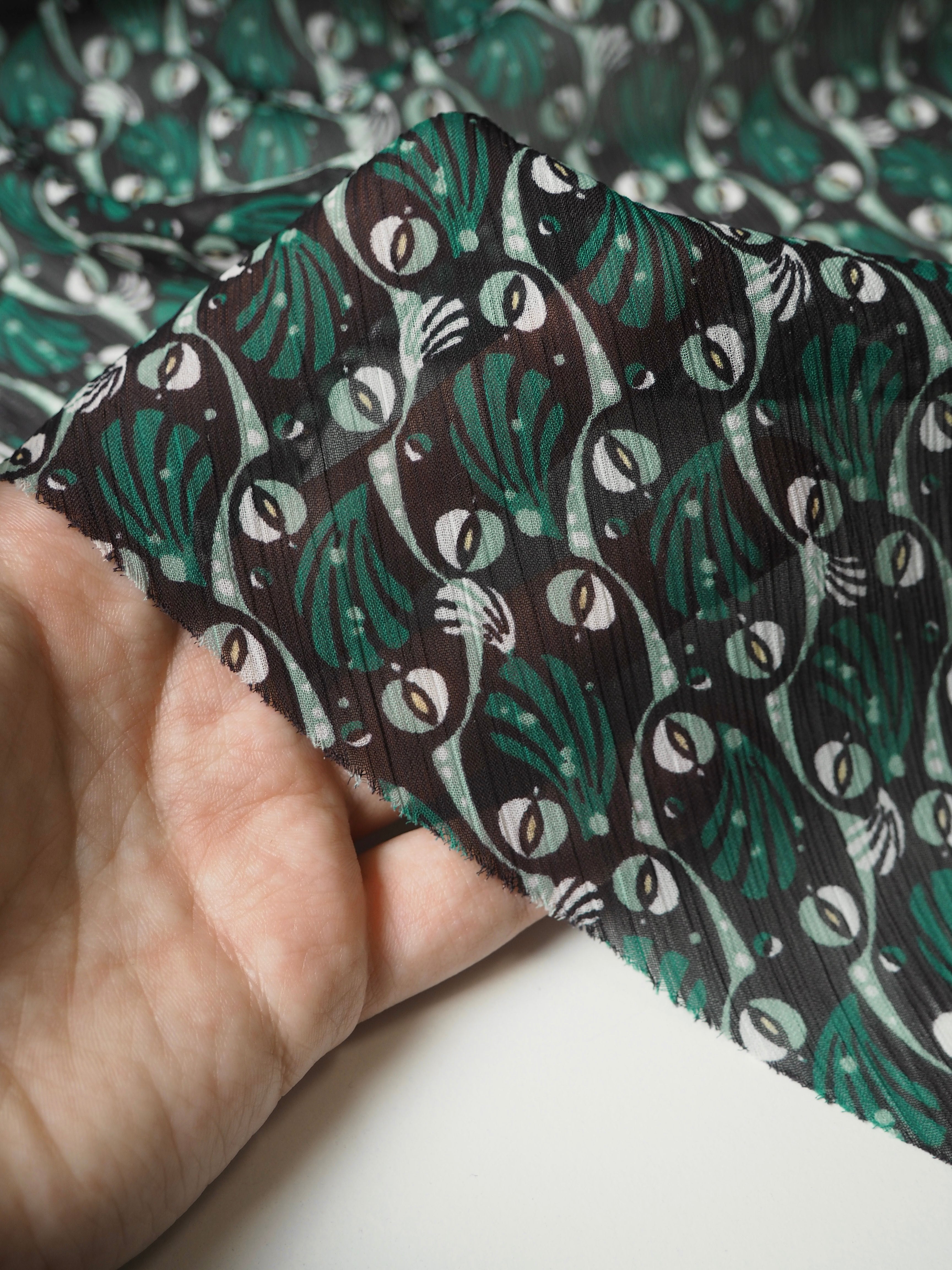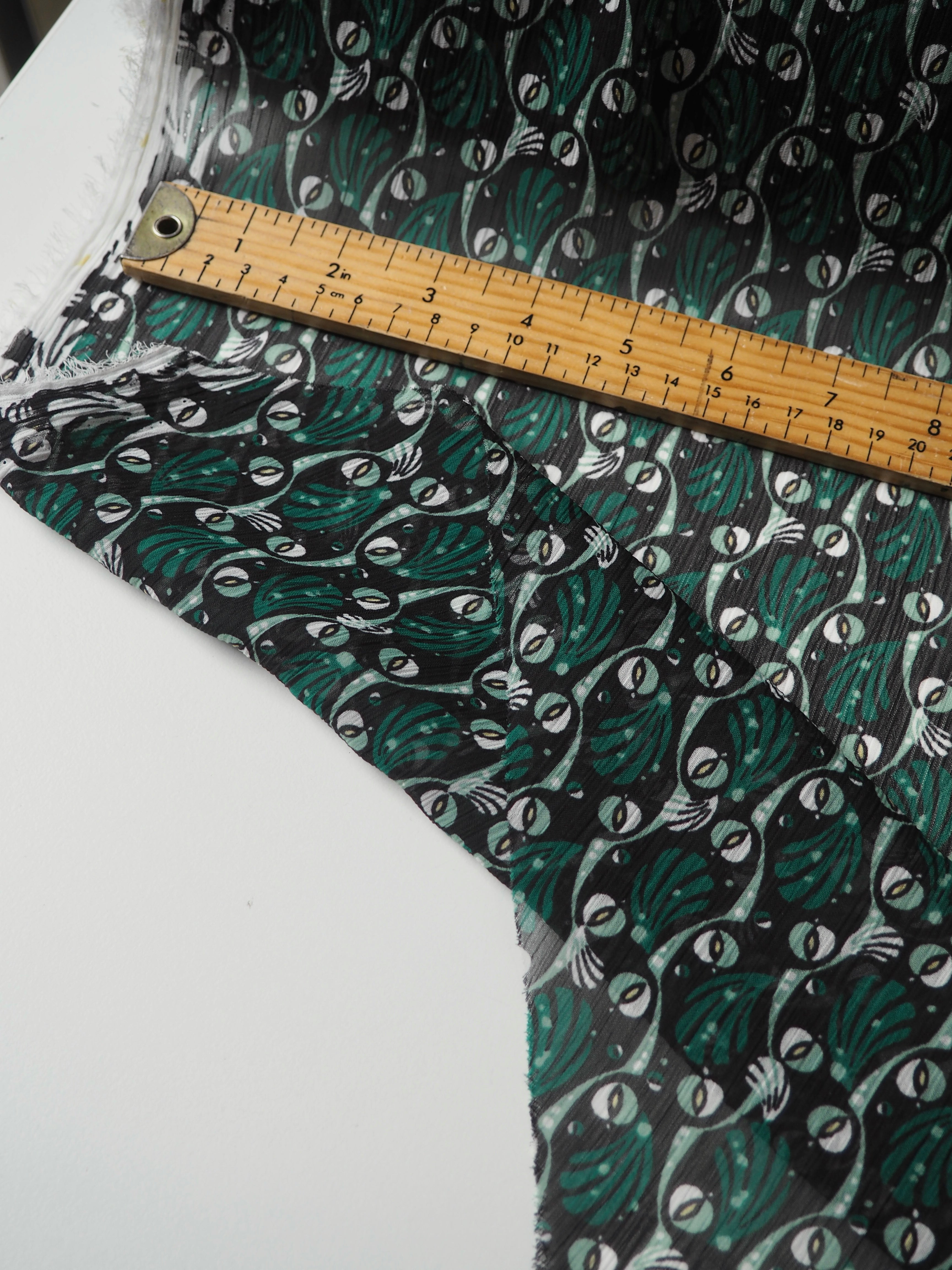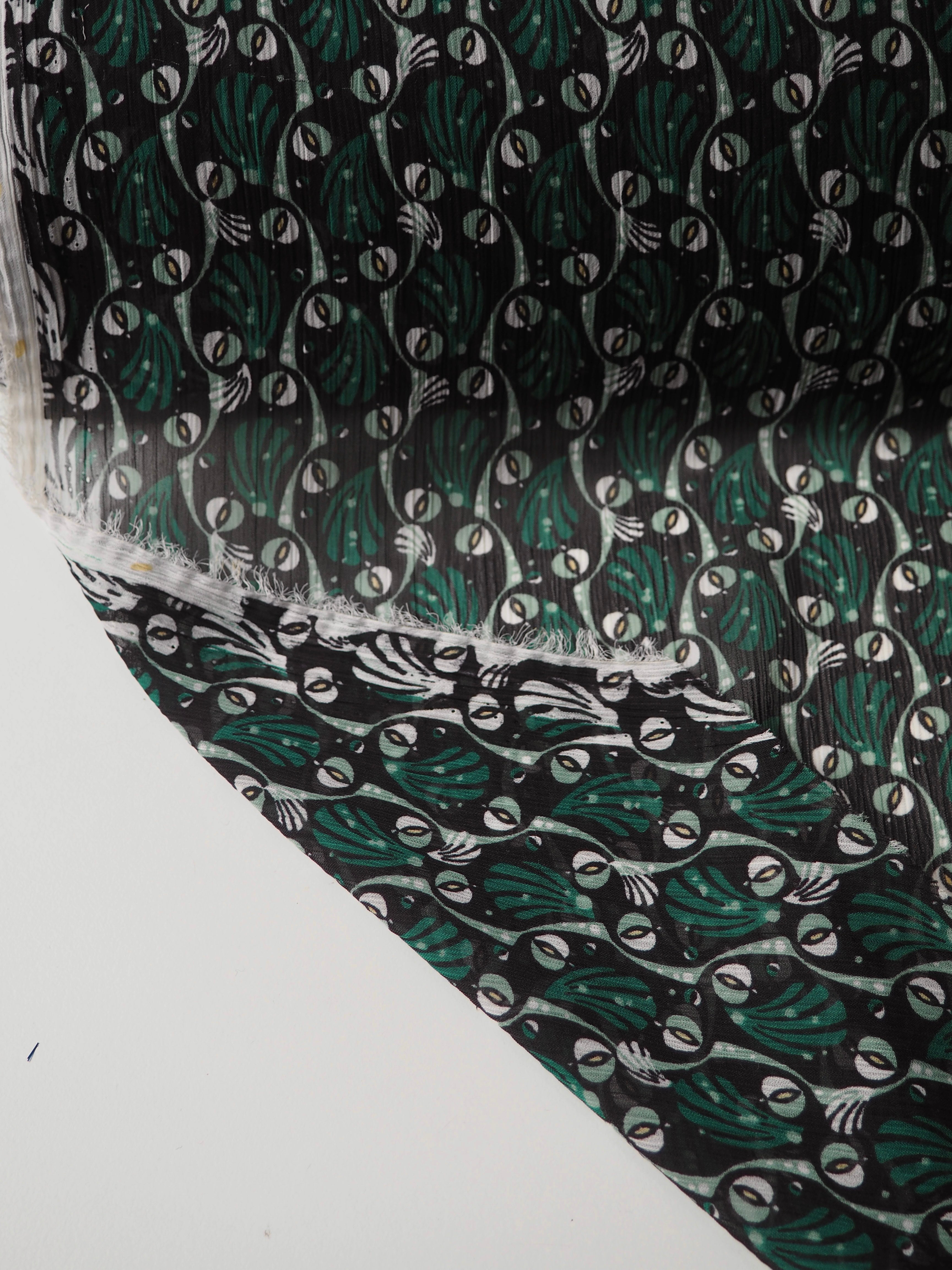 This ex-designer fabric is a printed chiffon. It's a crinkled chiffon with a print of green shell-like shapes striped down the warp. It's lightweight and semi-sheer, with wonderful drape. It has such a nice crinkly handle as well. Great movement with a flat finish. Perfect for a scarf, drapey top, or swishy skirt!