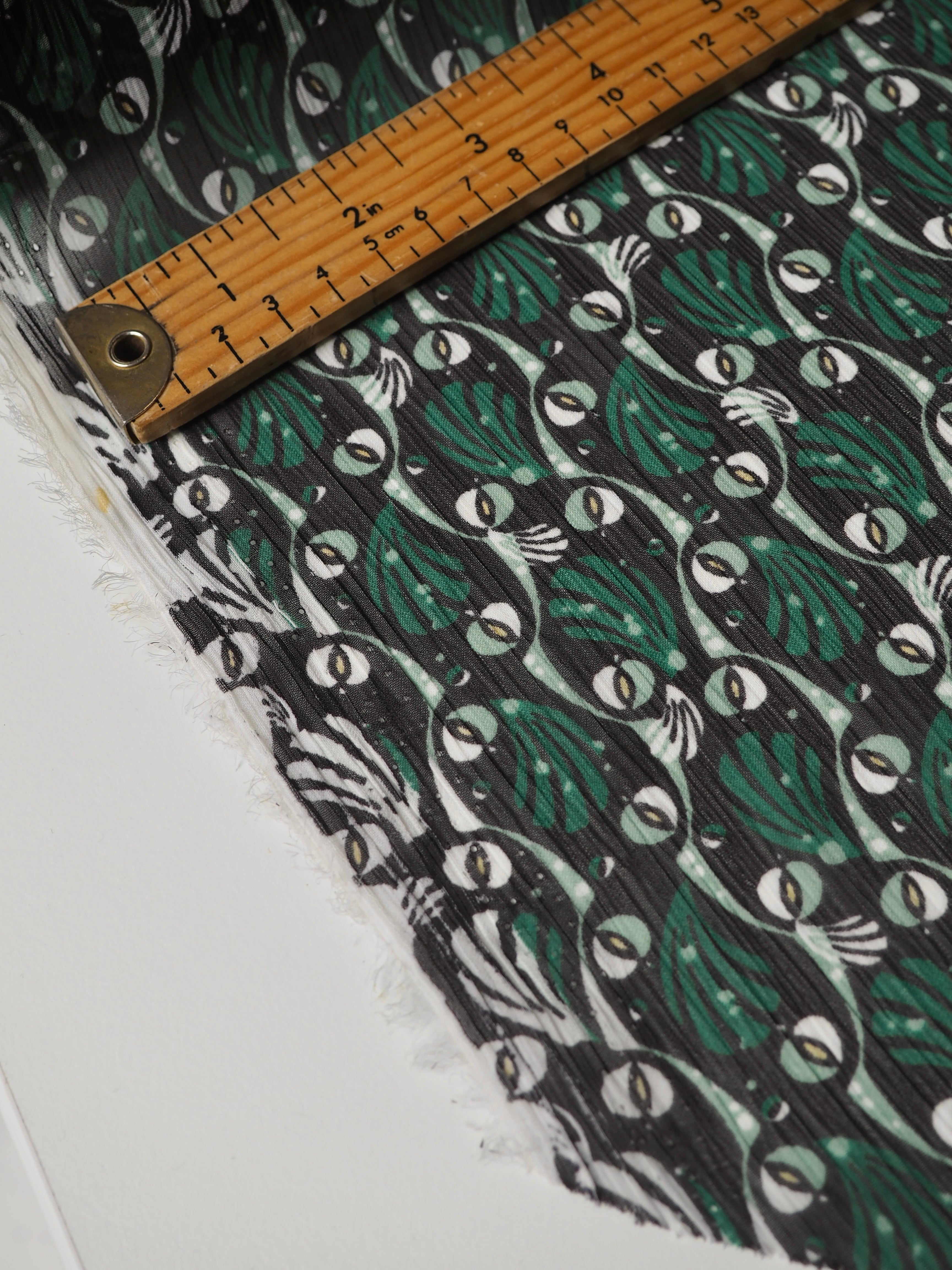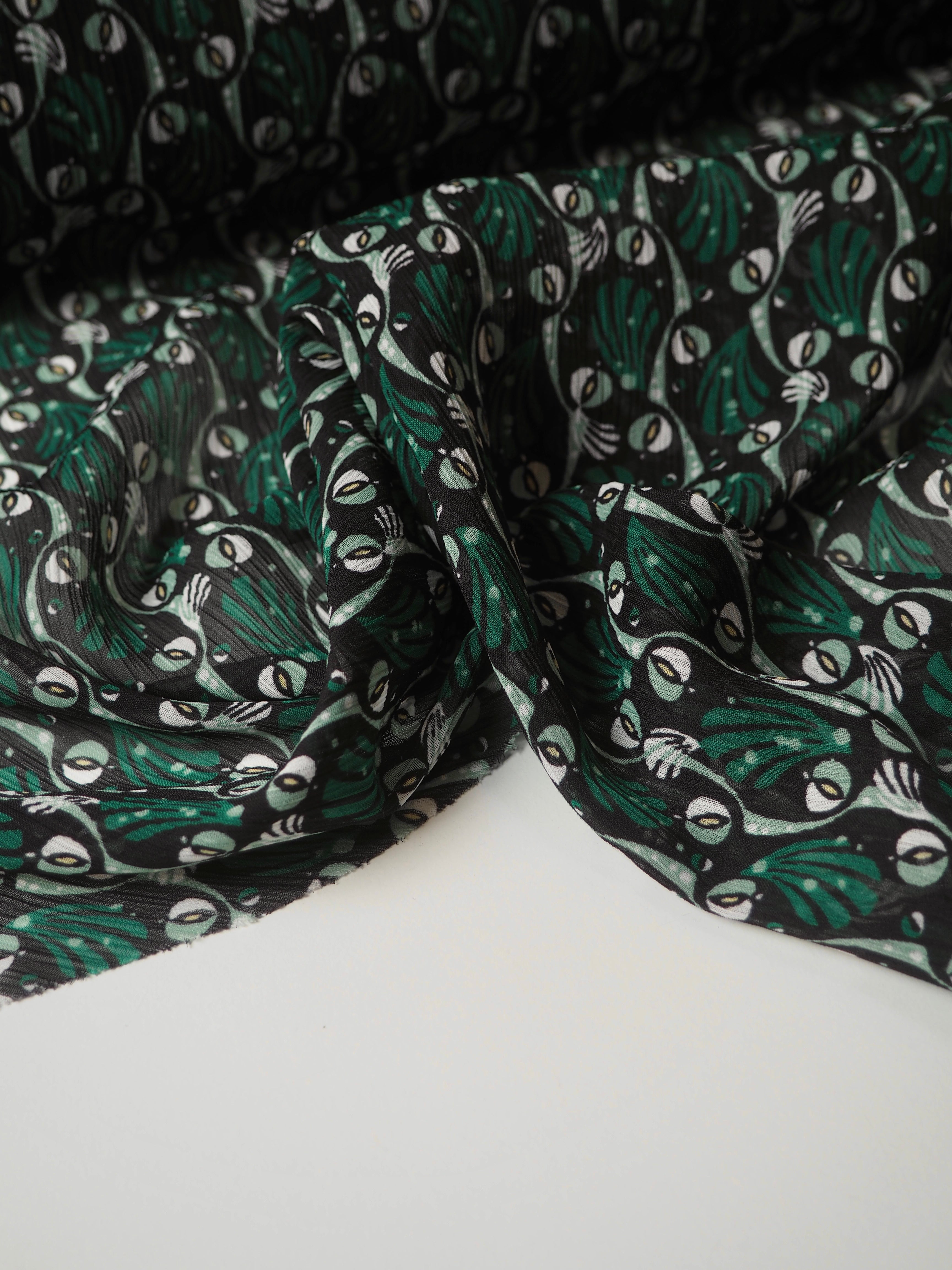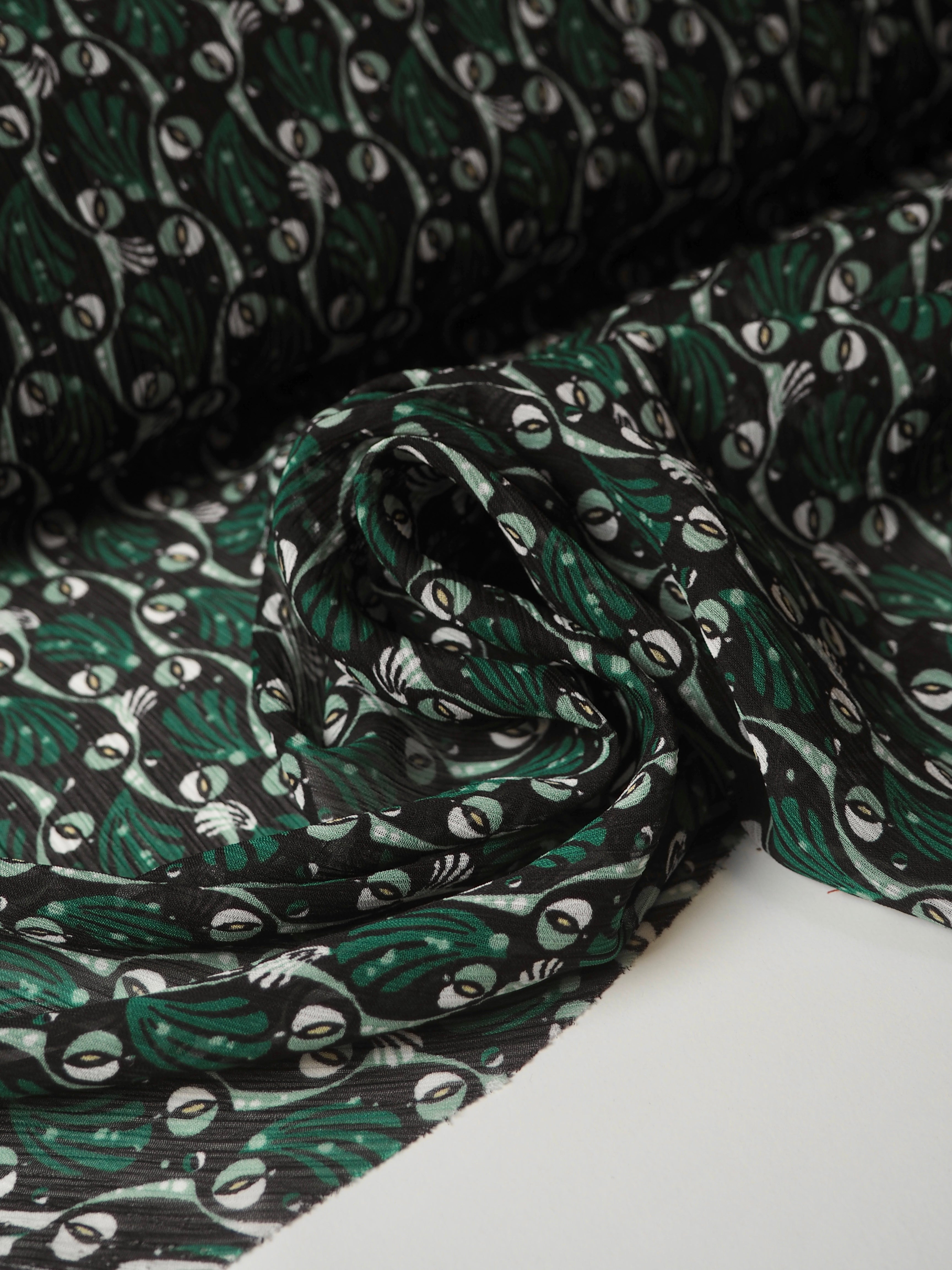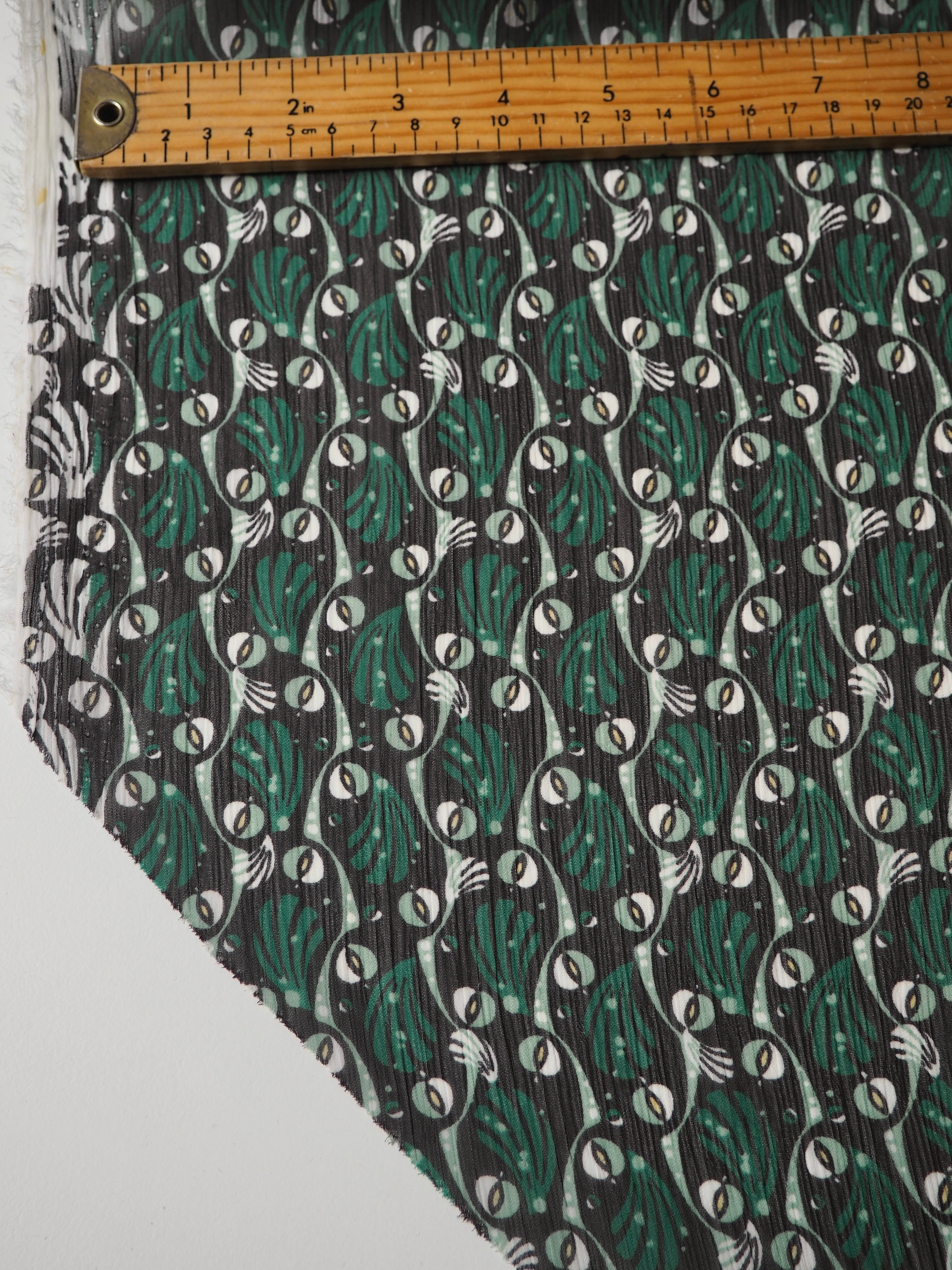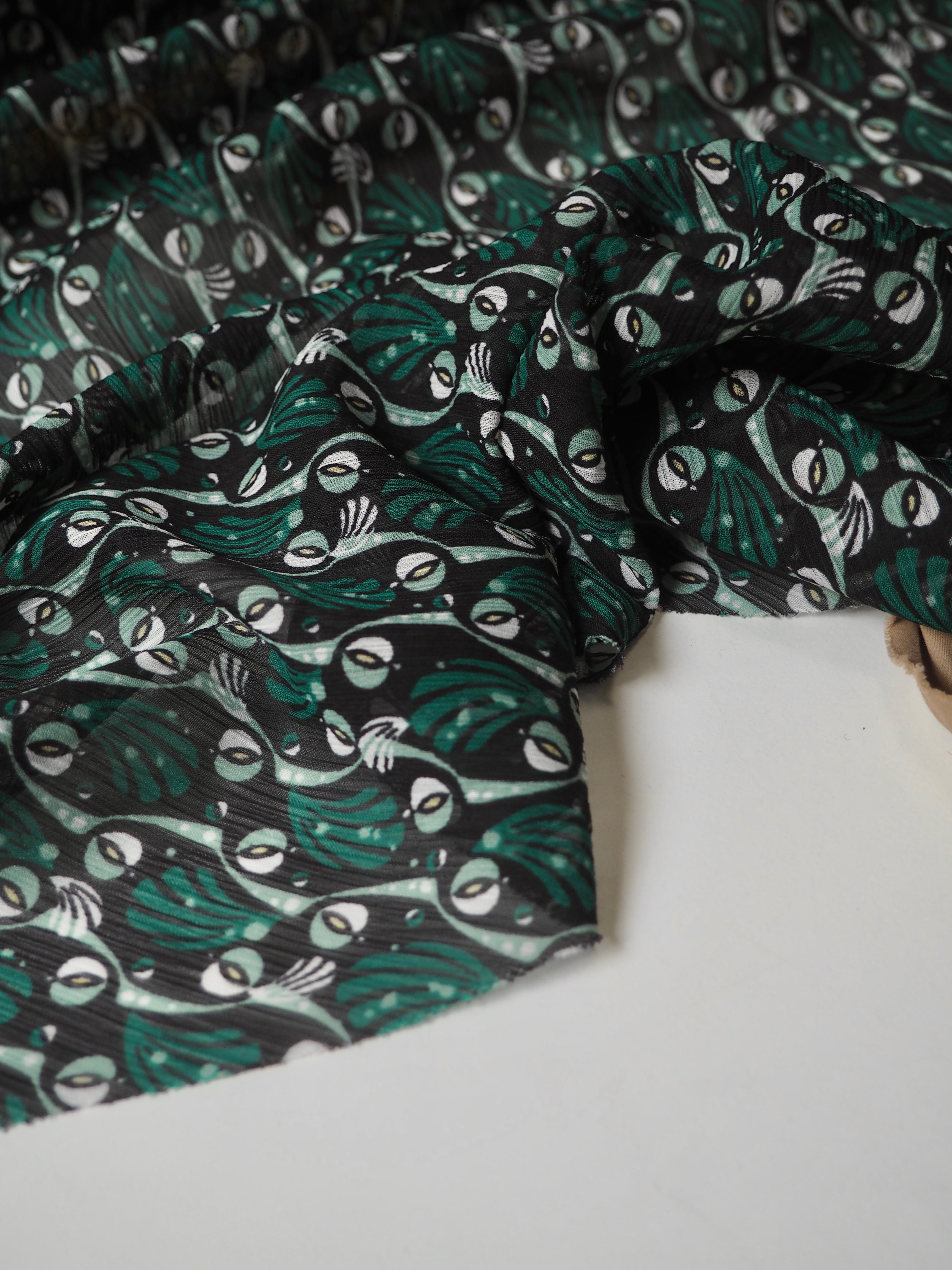This ex-designer fabric is a printed chiffon. It's a crinkled chiffon with a print of green shell-like shapes striped down the warp. It's lightweight and semi-sheer, with wonderful drape. It has such a nice crinkly handle as well. Great movement with a flat finish. Perfect for a scarf, drapey top, or swishy skirt!
