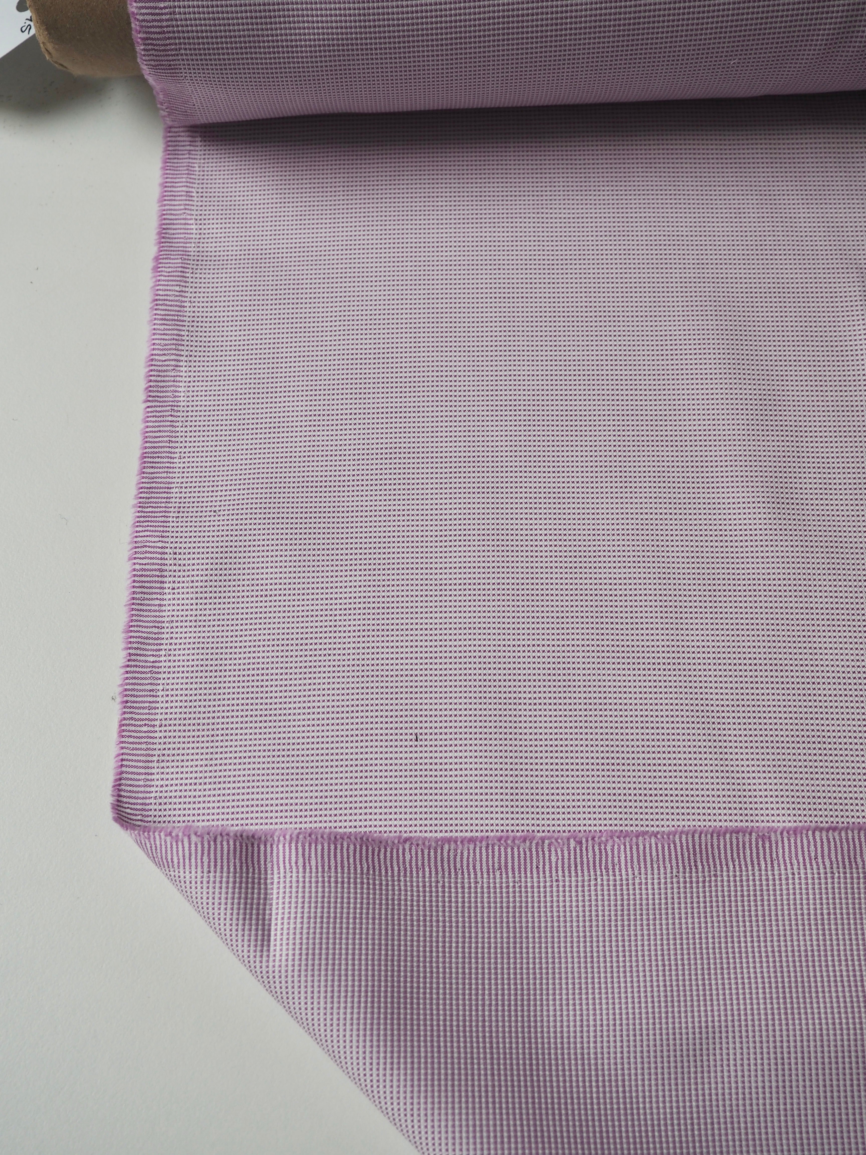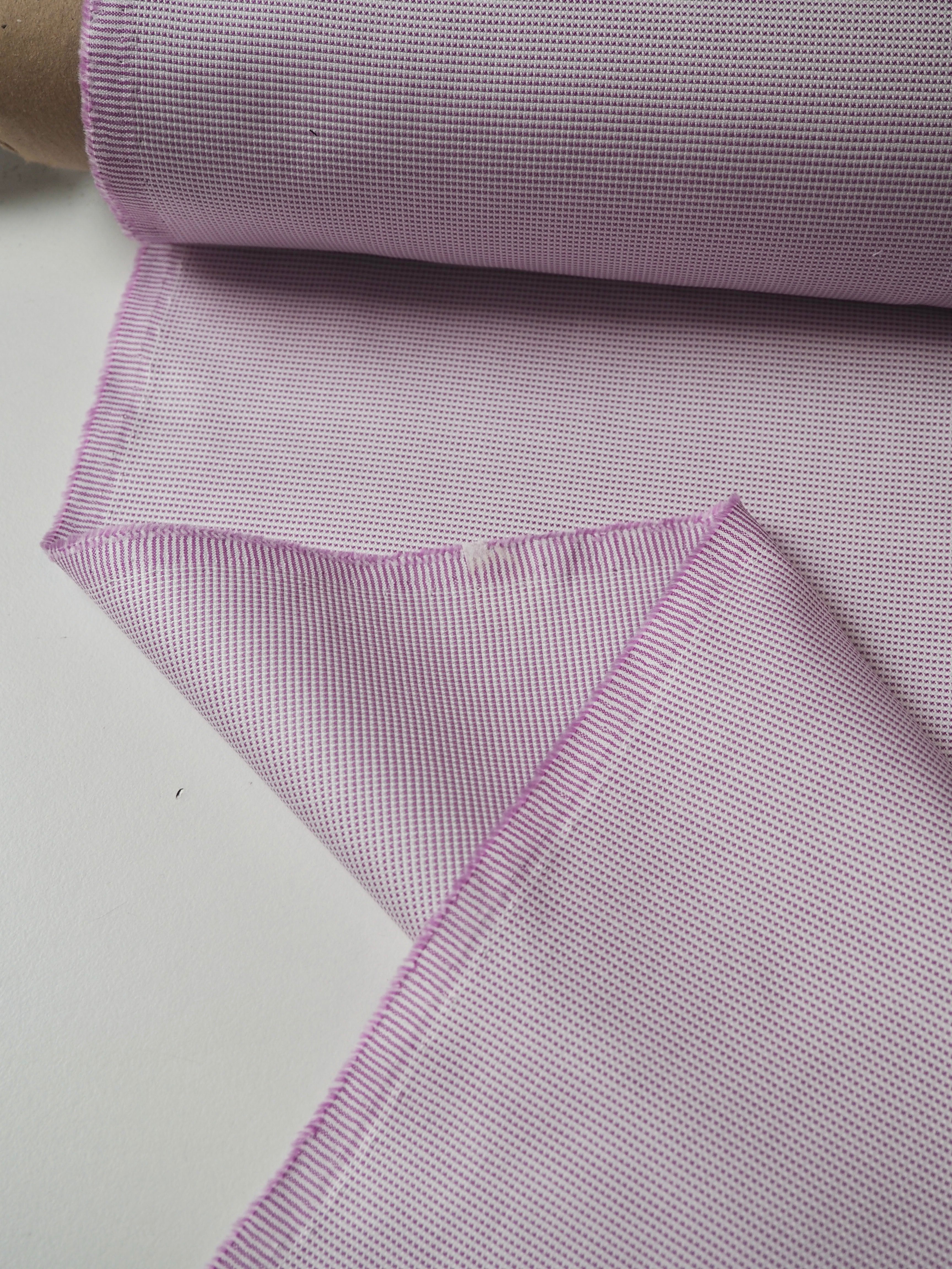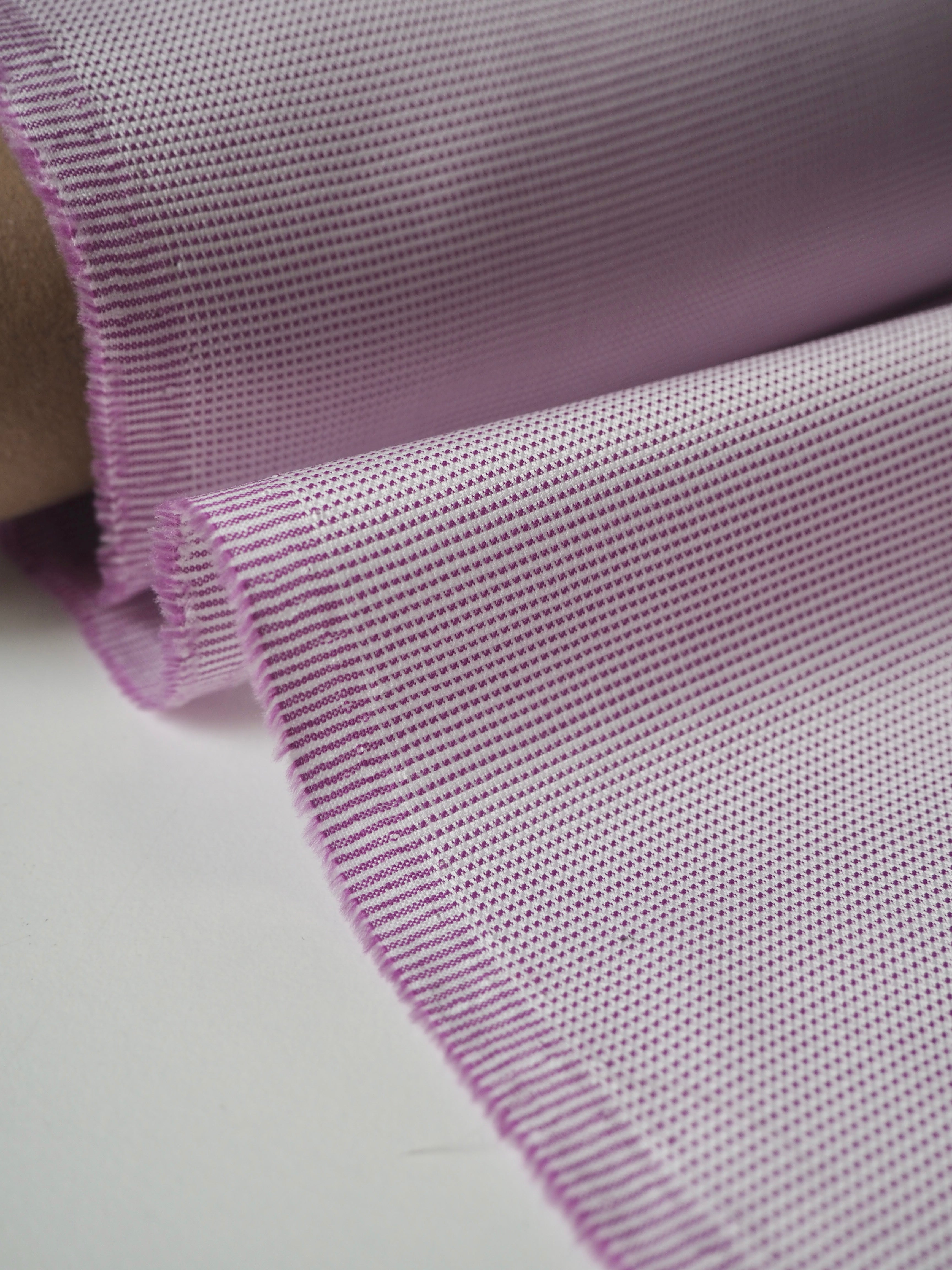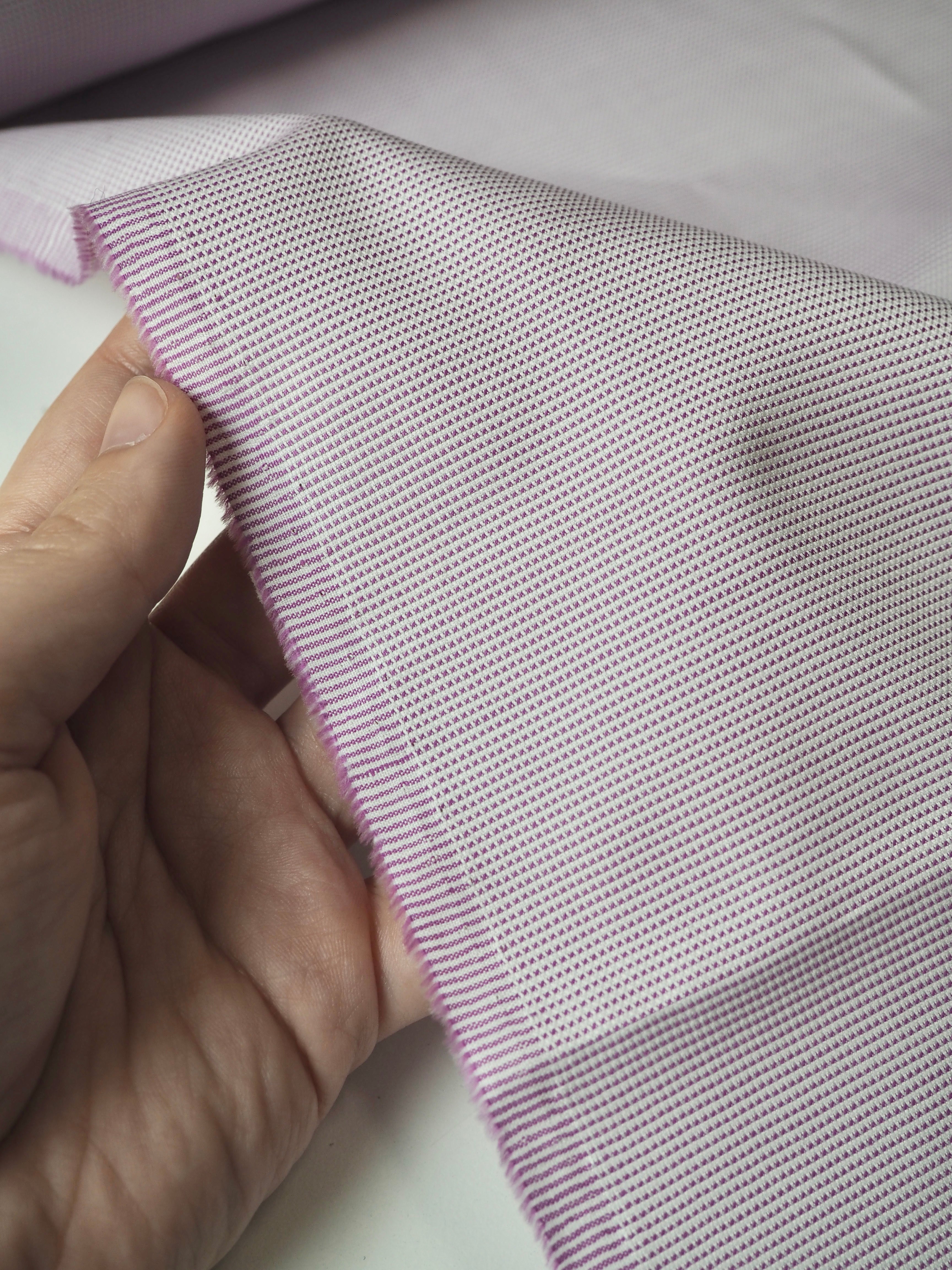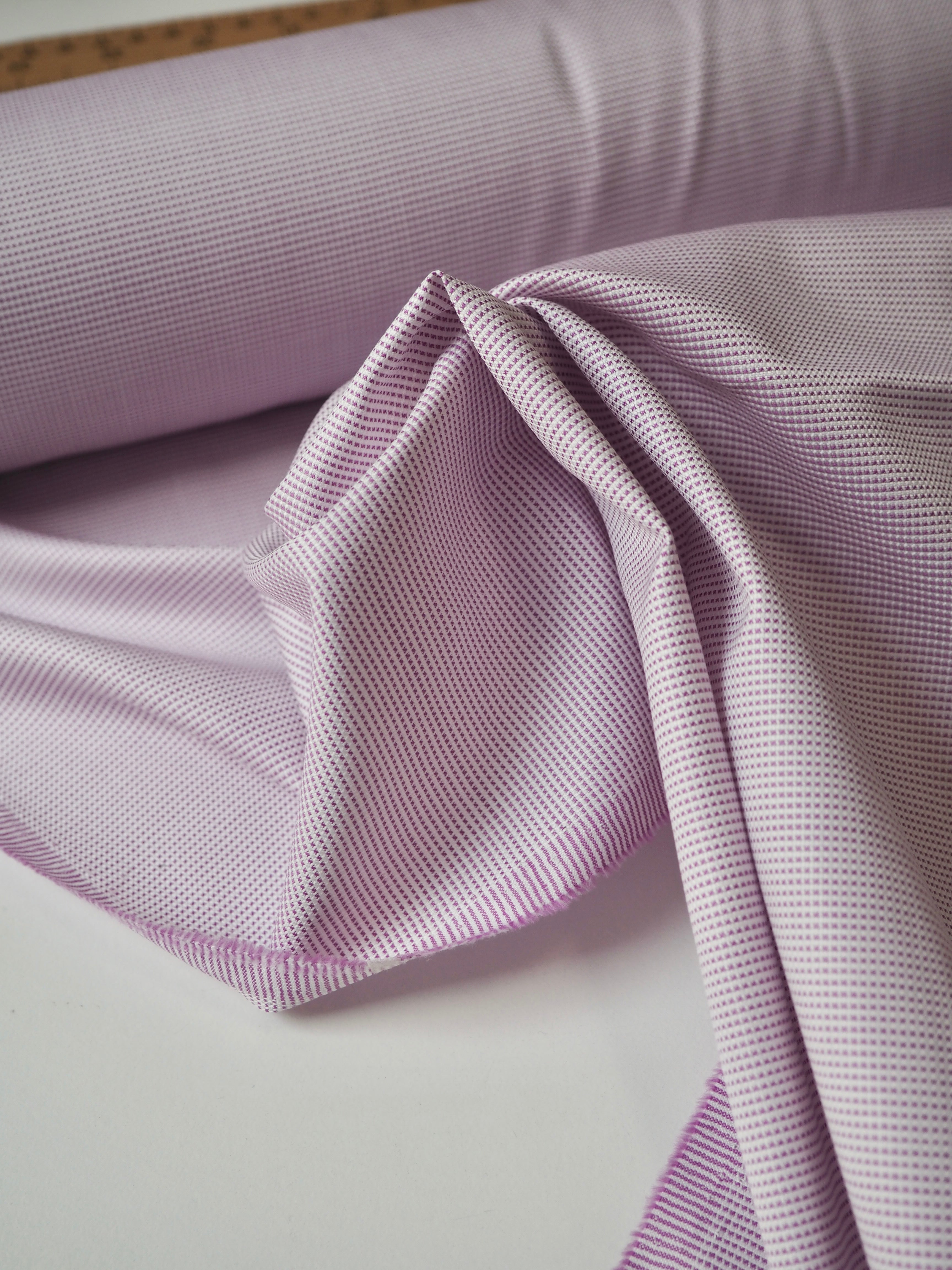 This ex-designer fabric is a shirting. It's one of two variations of the same name, with very slightly varied weaves. It's a densely woven cotton, that has subtle dotted weave like an Oxford cloth. It's lightweight and opaque, with a gentle structure and crisp drape. It's soft and comfortable on the skin. It would make a lovely classic shirt or shirt dress!