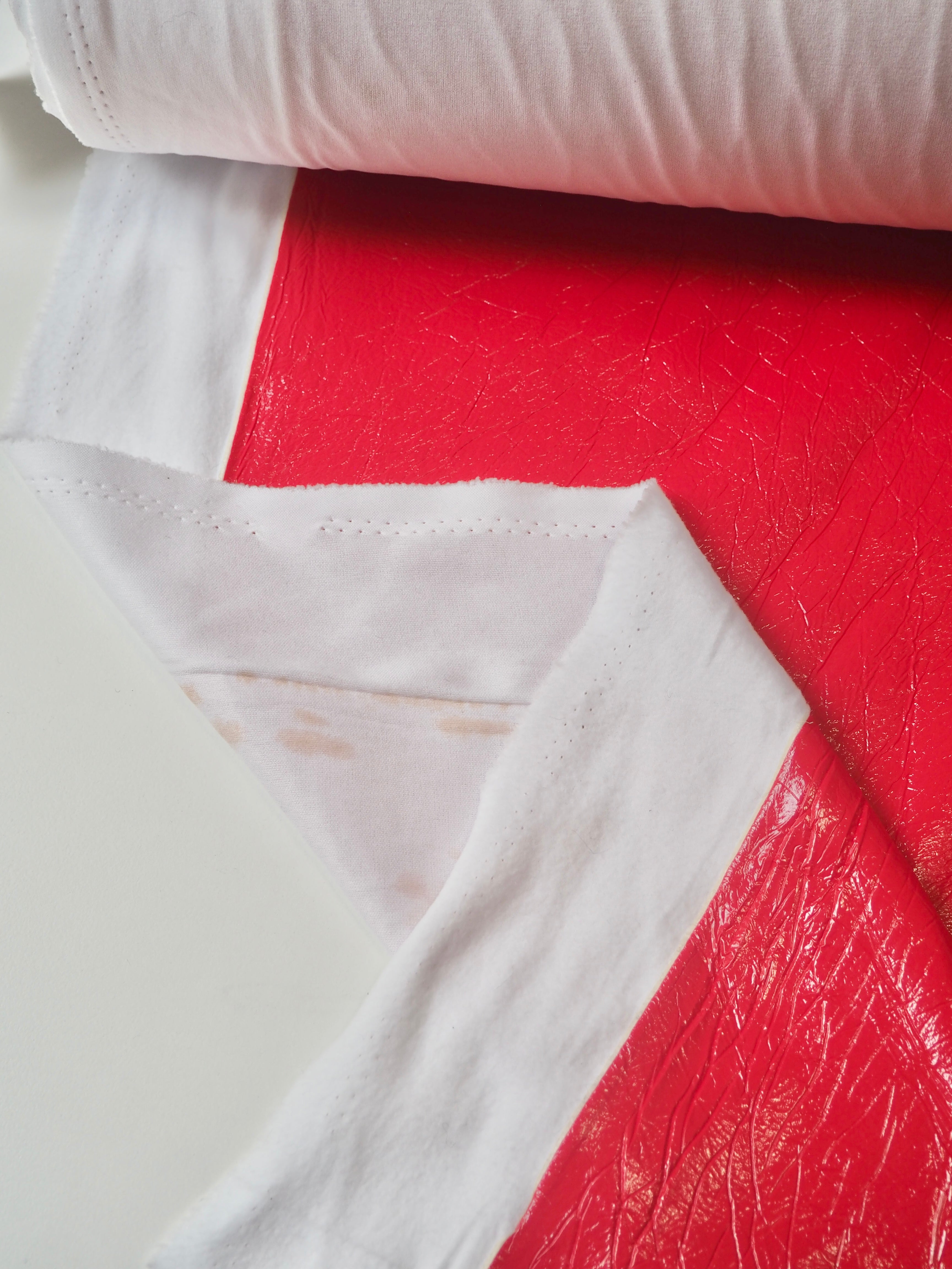This ex-designer fabric is a stretch pleather. Lightweight and super smooth, it is made from a thin red polyurethane coating on a white fleeced jersey backing. Has a bright patent sheen that looks slightly distressed. Approximately 20% width way stretch and great recovery. Would be perfect for form fitting garments as the stretch means you can move with ease. We would love this in a little mini skirt or even a light trench! This cloth does have some dotting on the reverse, the price is reflected in this.