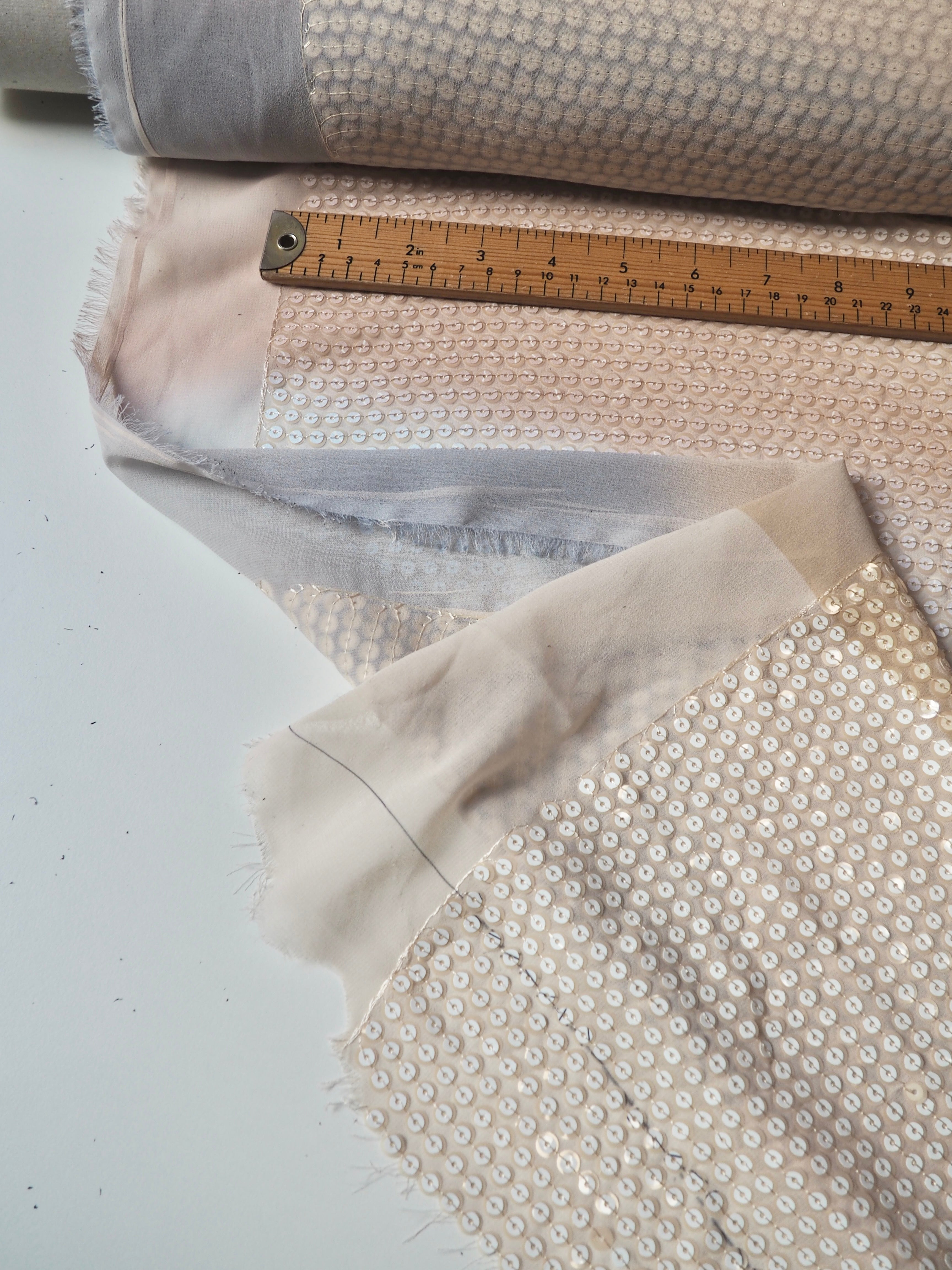 This ex-designer fabric is a sequin chiffon. Shiny white sequins are woven in stripes onto this ombre chiffon. It's really unique, with great movement and a beautiful drape. Lightweight, most opaque with the sequins, and very colourful. Has a nice gentle handle. Would be perfect for a party dress or skirt!