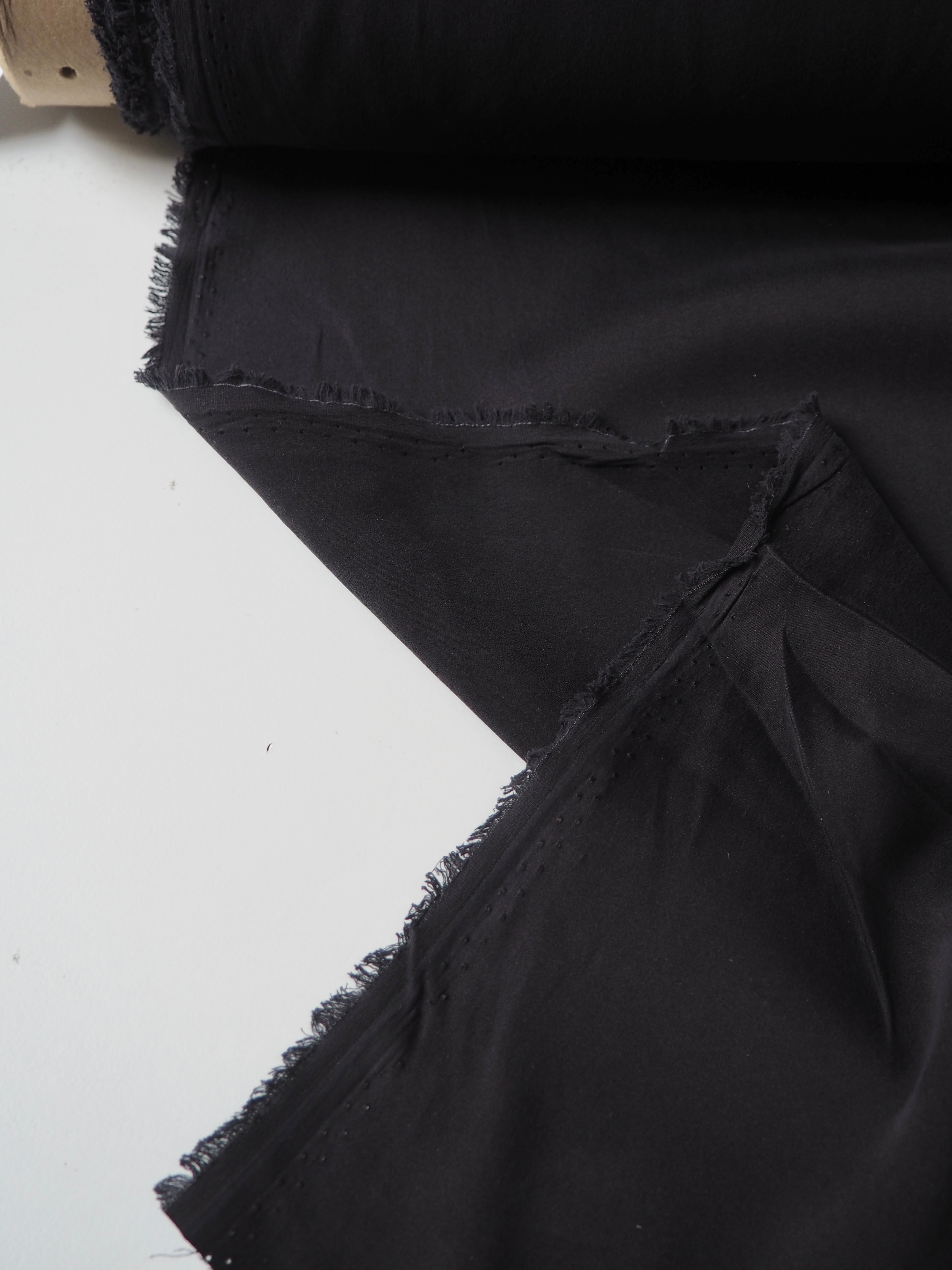This ex-designer fabric is a washed silk. It's a luxuriously soft silk, with a washed finish. This makes the silk drape better and softens it. The stretch gives it more versatility, with about 15% width-ways. It has incredible liquid movement! Super lightweight and opaque. Such a wonderful handle, feels so fantastic to the touch! Perfect for skirts, blouses, and lingerie!