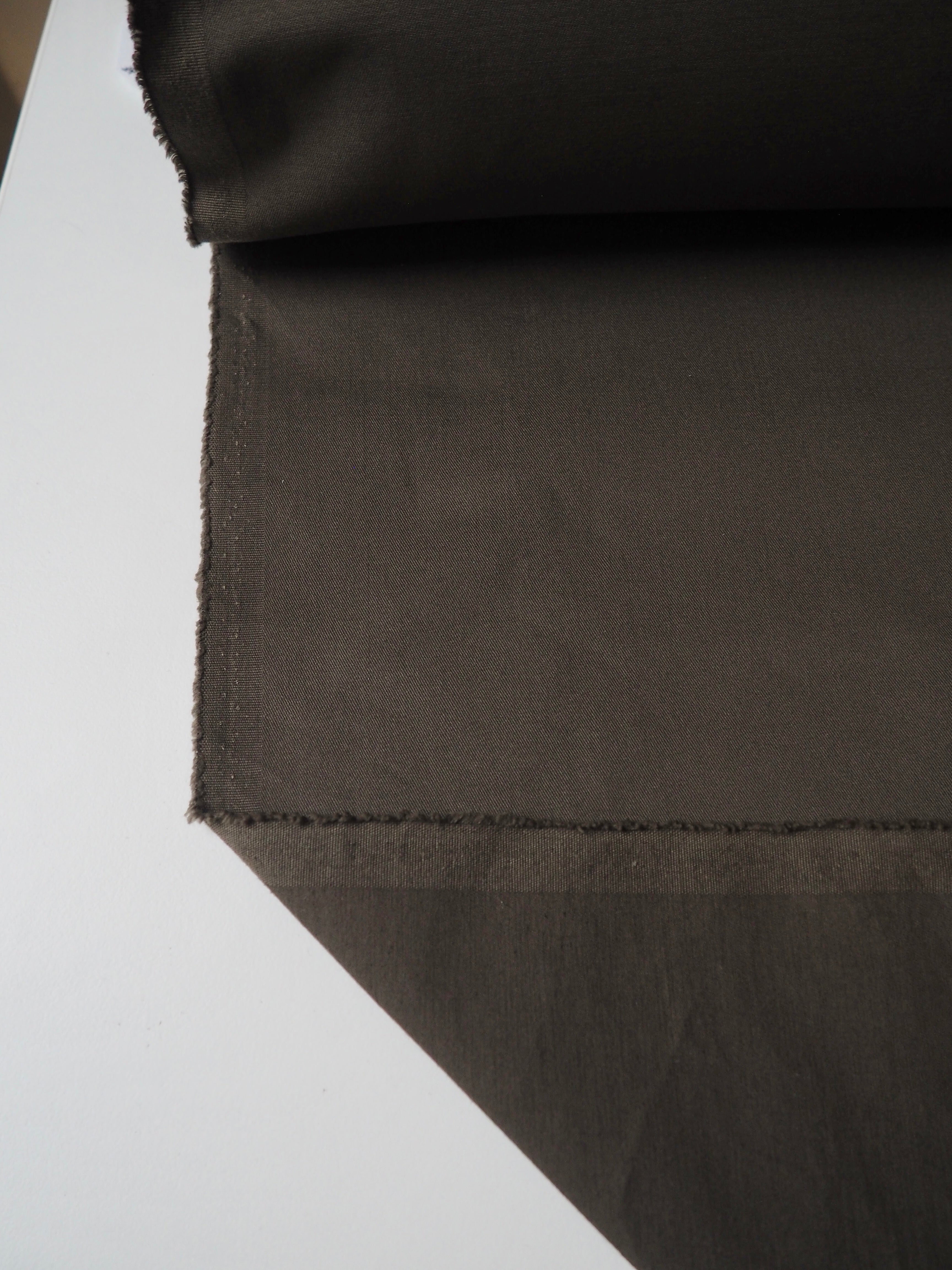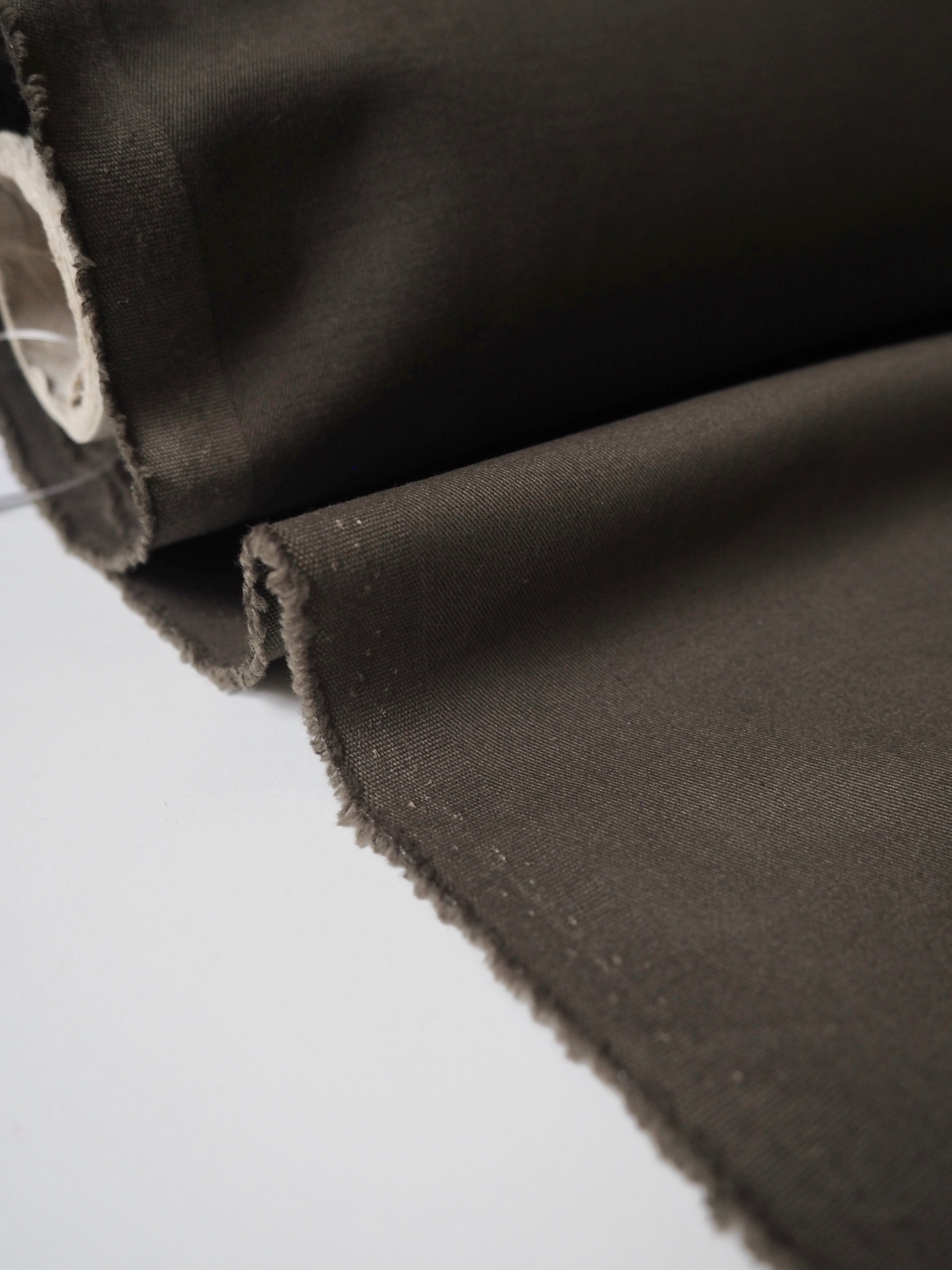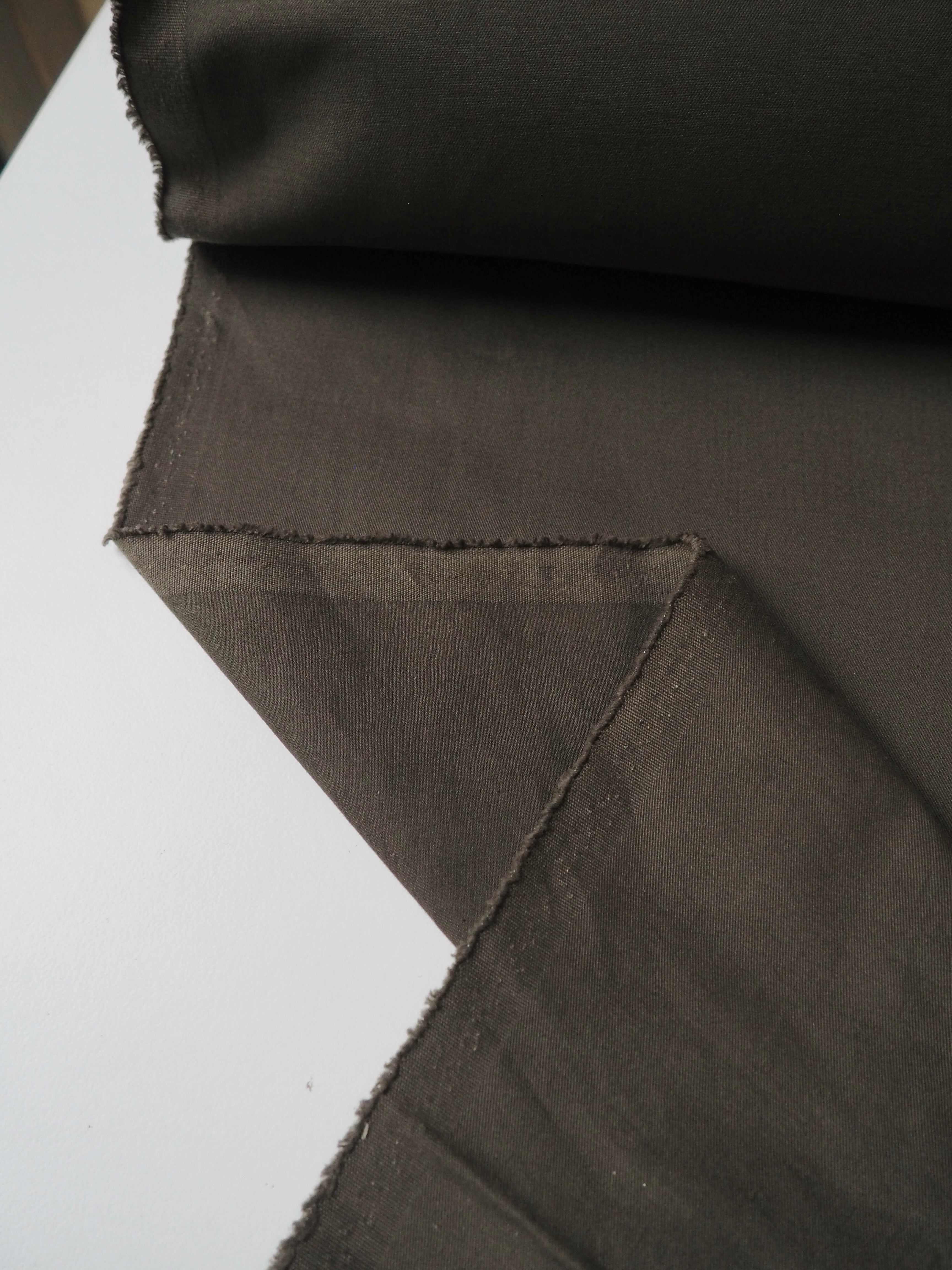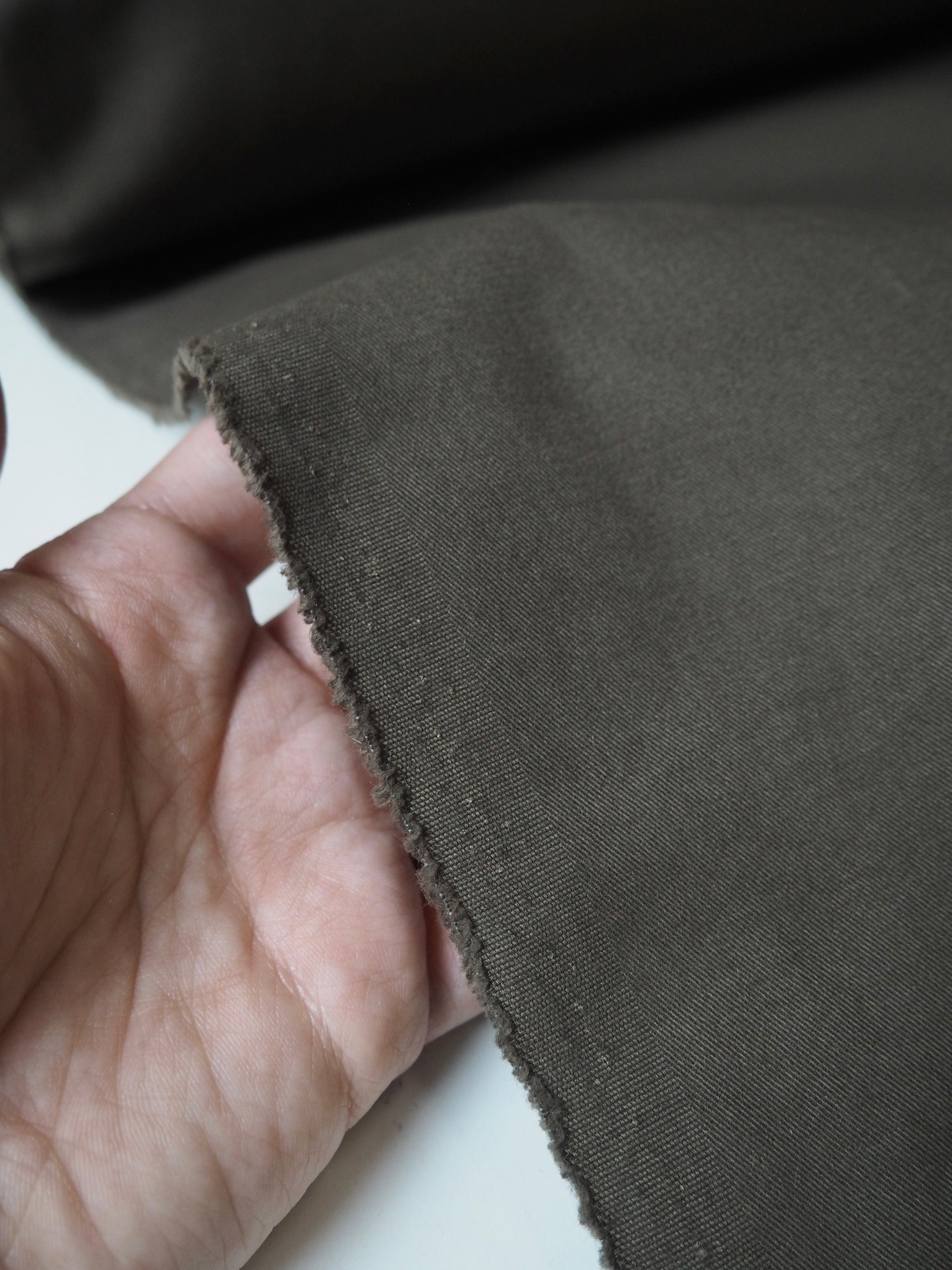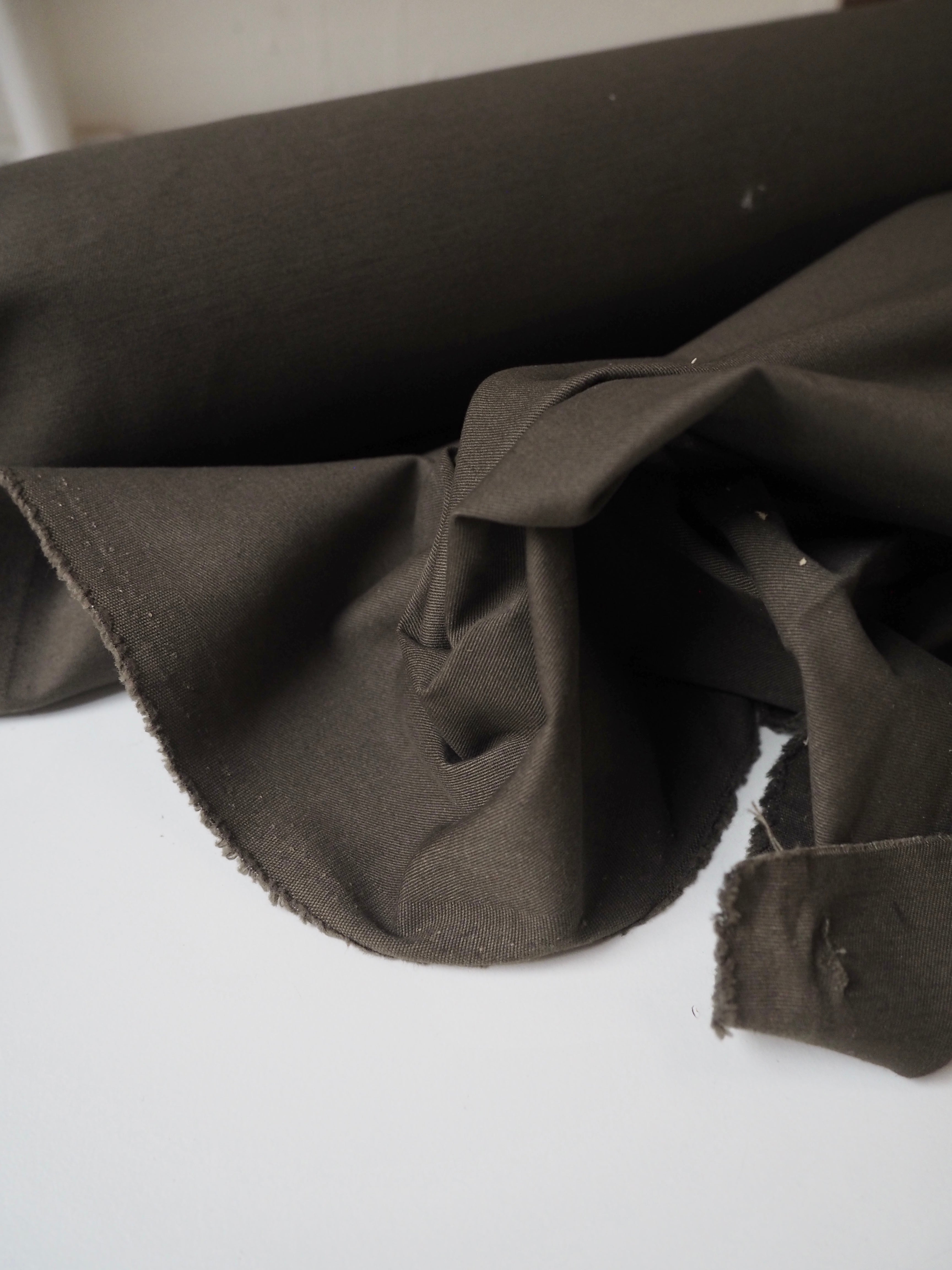 This ex-designer fabric is a cotton twill. Light to medium weight with a great structure and subtle twill weave. A lovely soft brushed handle with a nice 20% stretch width ways. A sturdy cloth and opaque. Perfect for a jacket or trousers!