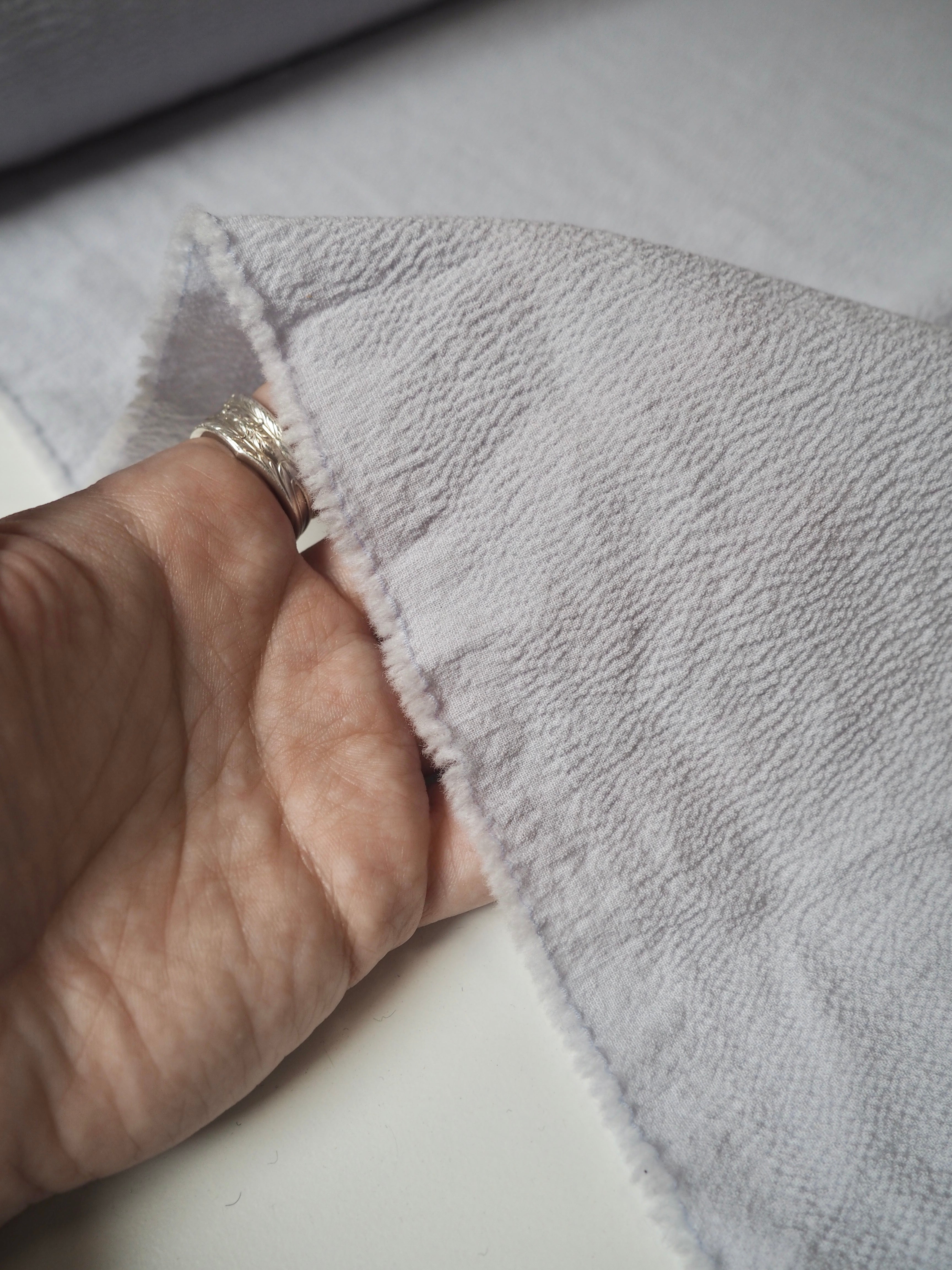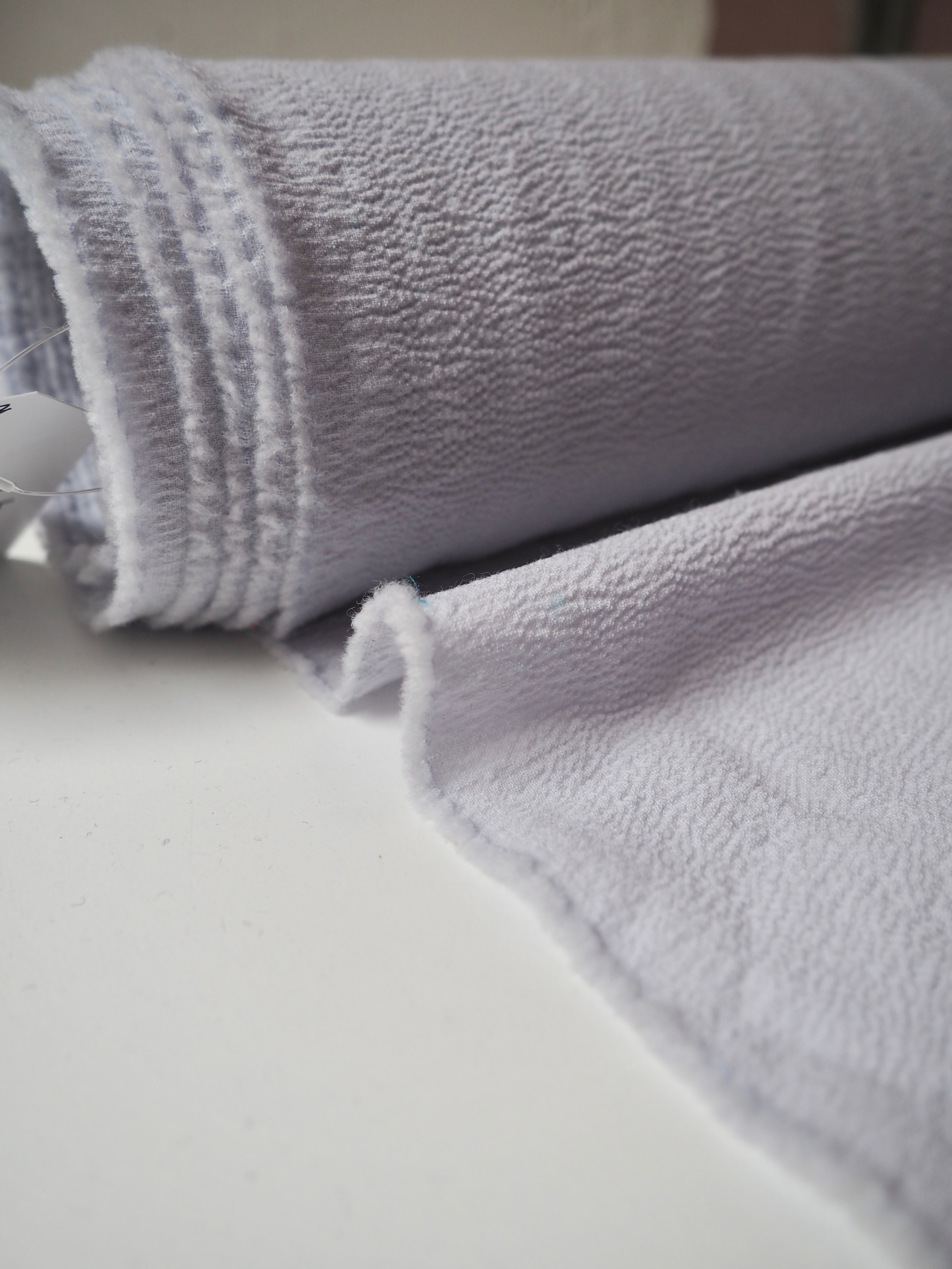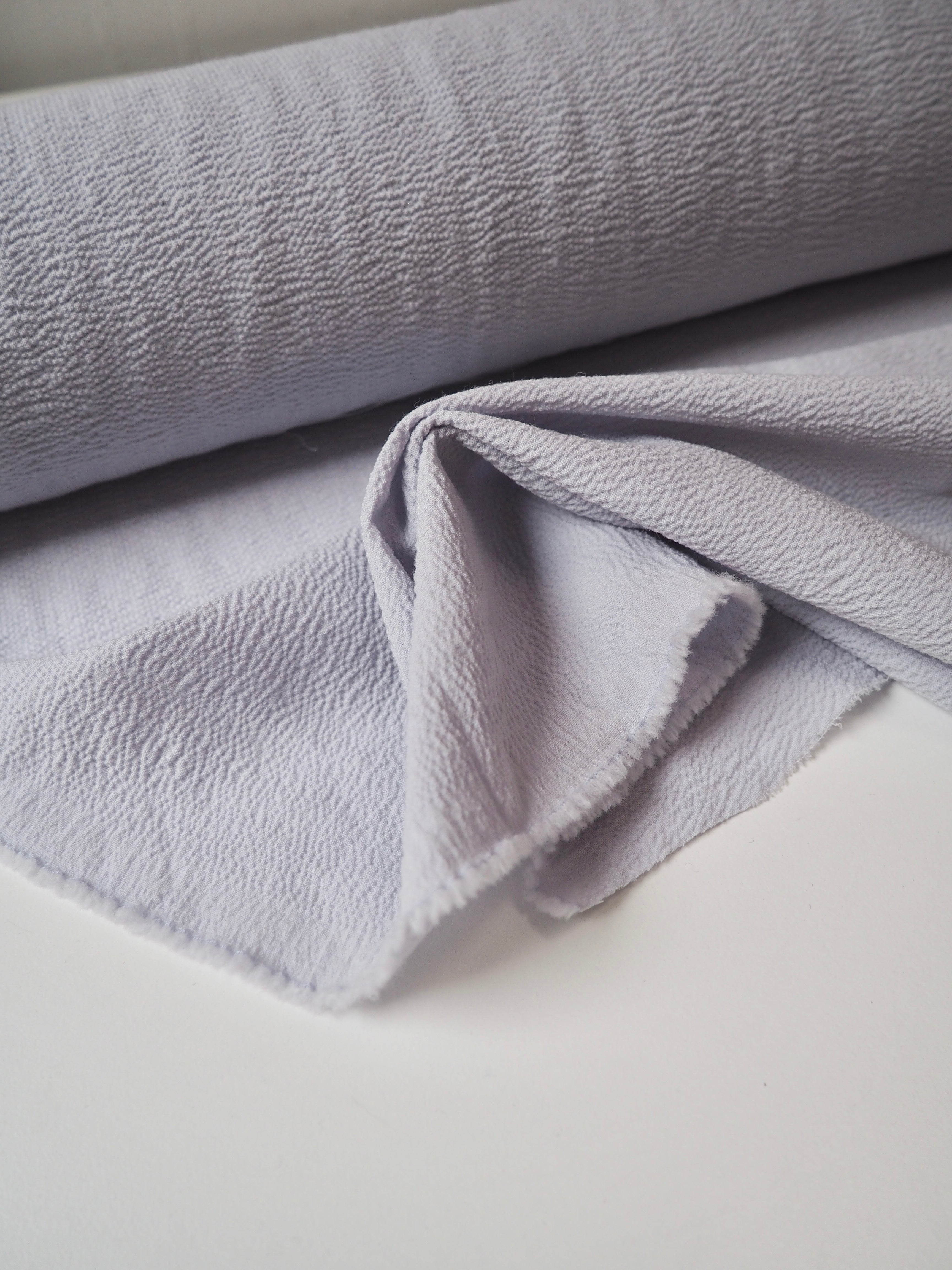 This ex-designer fabric is a wool crepe. It's a crinkle-y wool with some length ways stretch, about 10%. It's lightweight, with such a gentle and graceful drape. It still has the characteristic crepe texture, and is very soft and warm. In a pale blue/purple shade. Beautiful for a