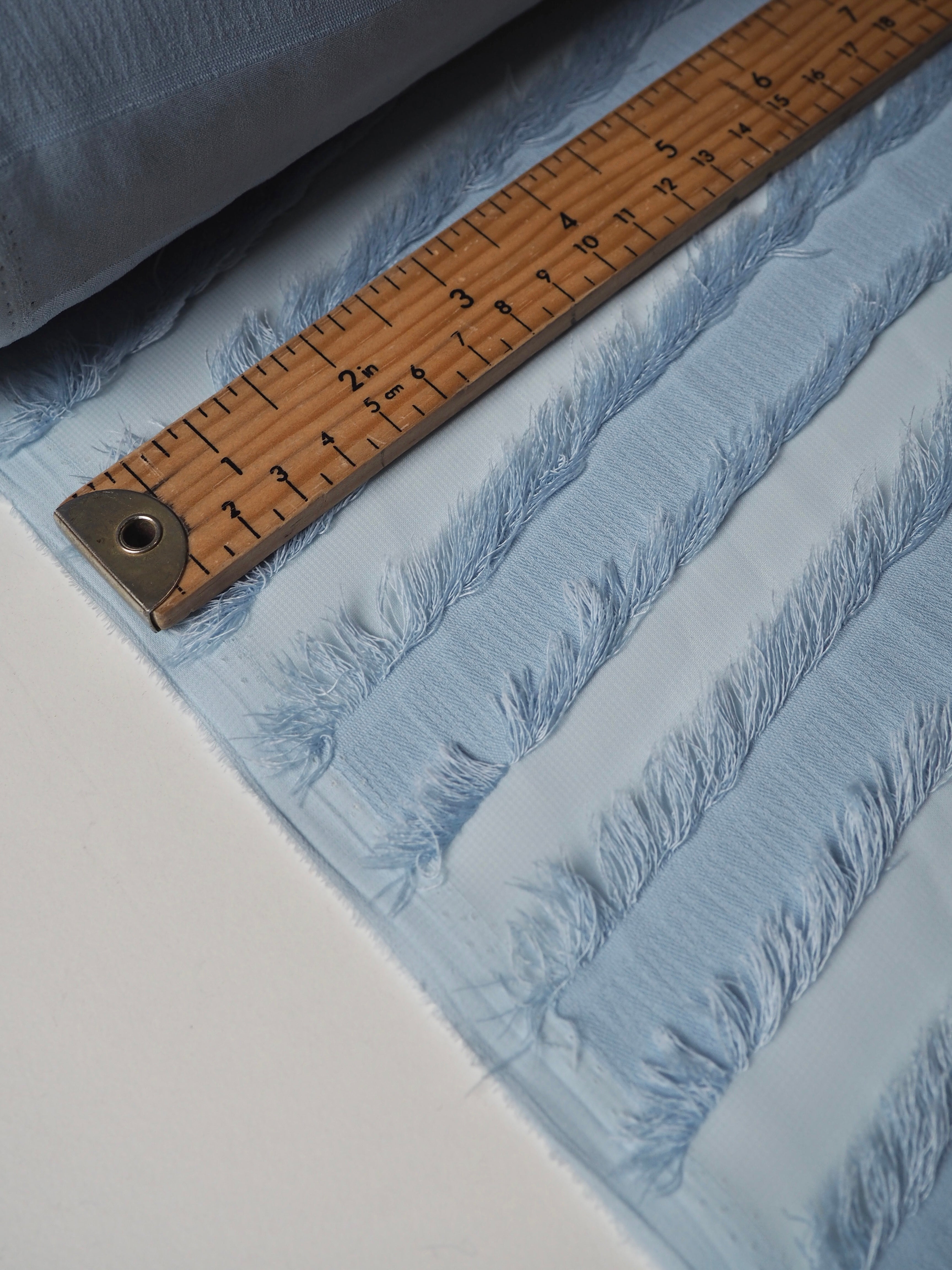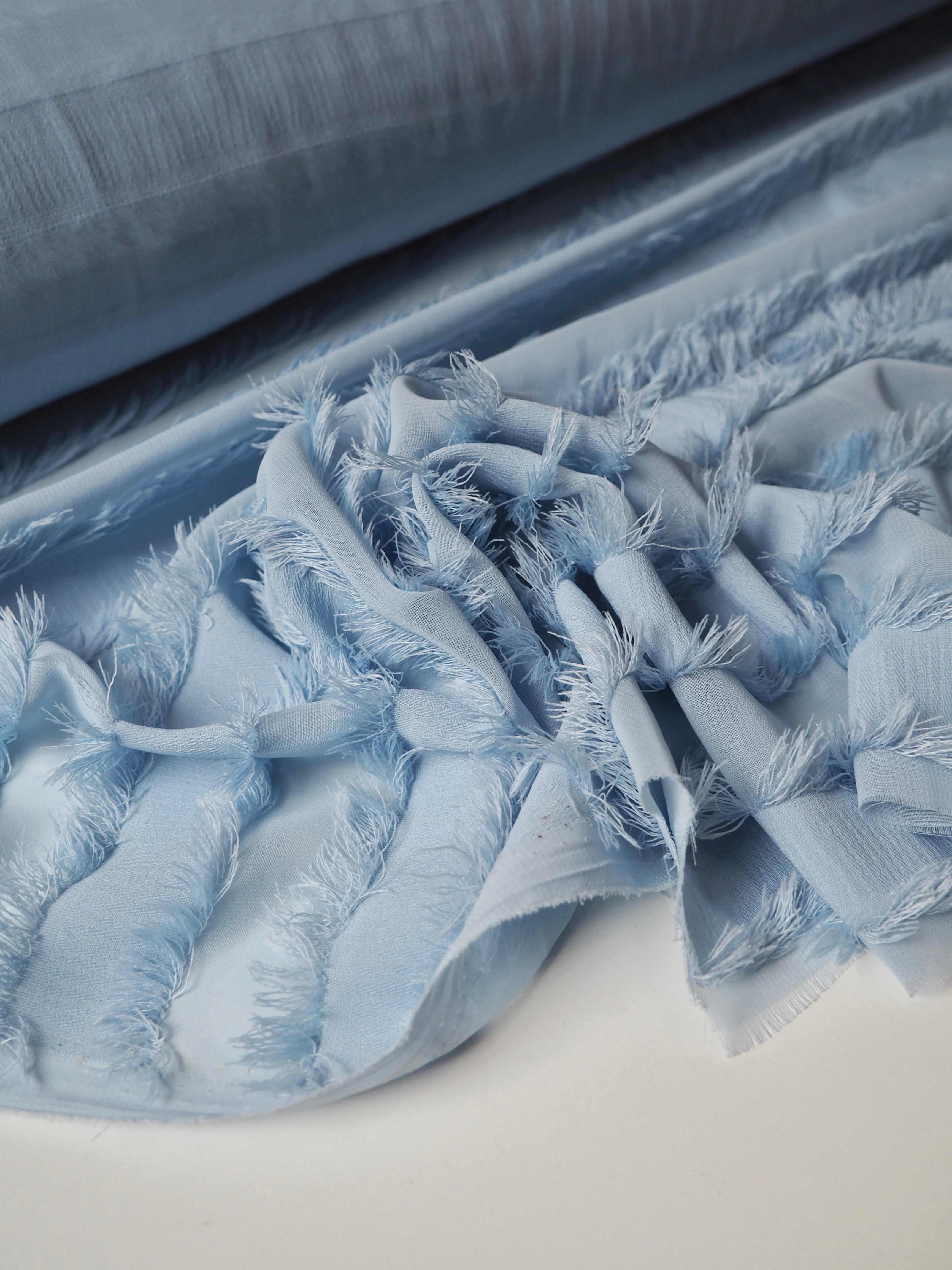 This ex-designer fabric is a stripe and fringe chiffon. It's in a light blue shade, with a stripe weave and fringed edge. Lightweight with a gorgeous airy drape. Has a very soft handle. Such a unique cloth that feels and looks so cool! Wonderful movement! Would look amazing as a blouse or as the overlay of a dress!