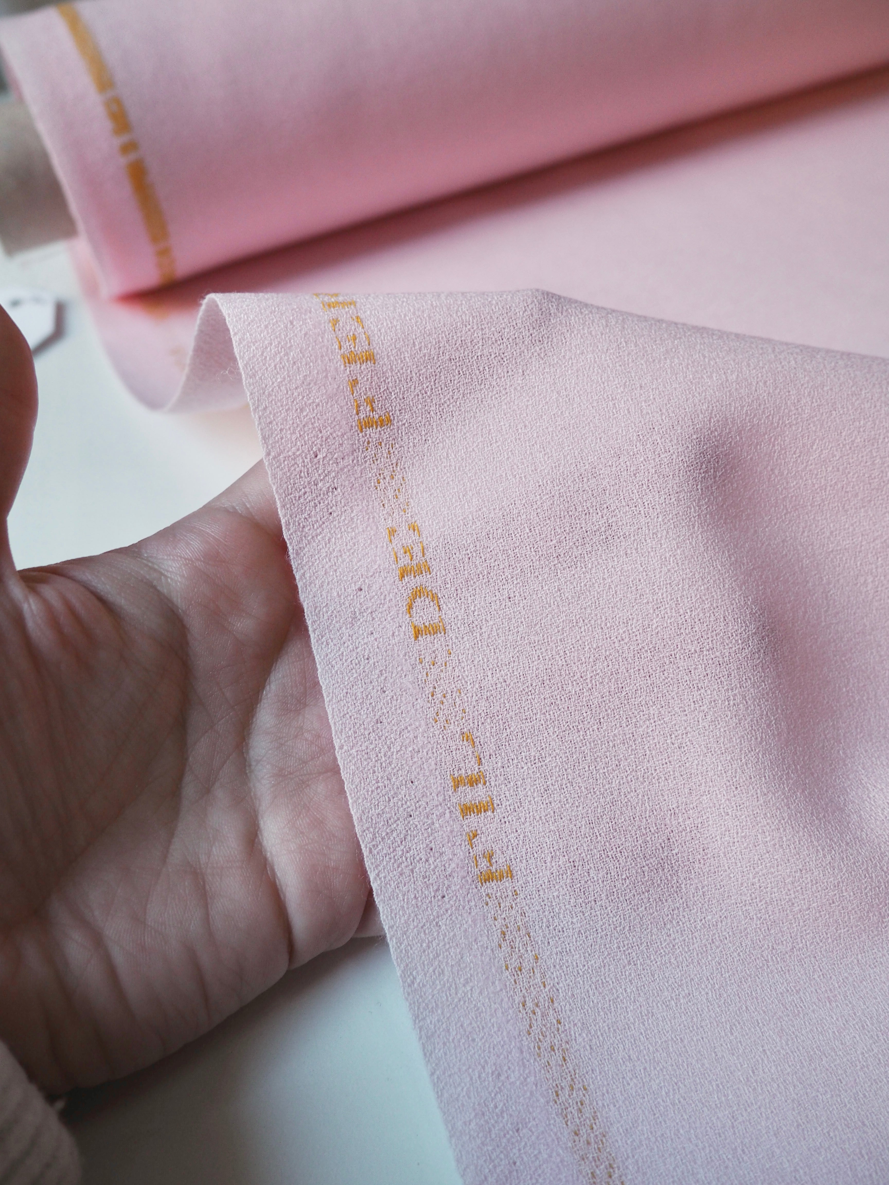 This ex-designer fabric is a wool crepe. It's a beautiful cloth with a sturdy but comfortable weave. It's made of pure wool and feels and looks so luxurious! It has a soft structure and really lovely soft crepe handle. Lightweight, and perfect for tailoring projects. Flexible and has a wonderful drape that makes it so easy to work with! The perfect cloth for a lifetime pair of wide leg trousers!