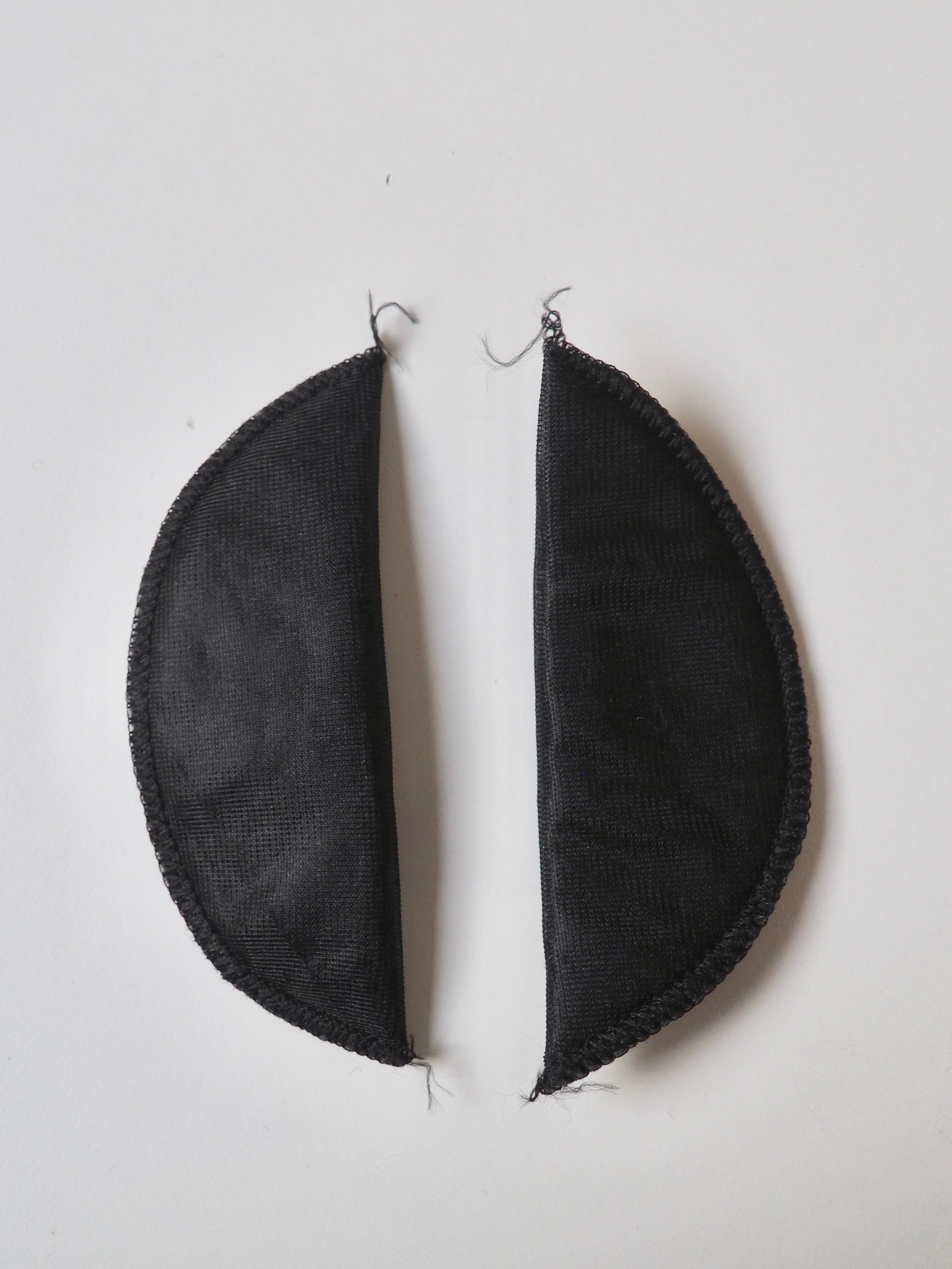 A narrow width shoulder pad with a light thickness perfect for more lightly structured garment. It is made up of a soft springy wadding inner covered with a thin, black mesh polyester fabric, overlocked together at the edge. Great for adding shaping to a light jacket, tailored dress or less structured coat.