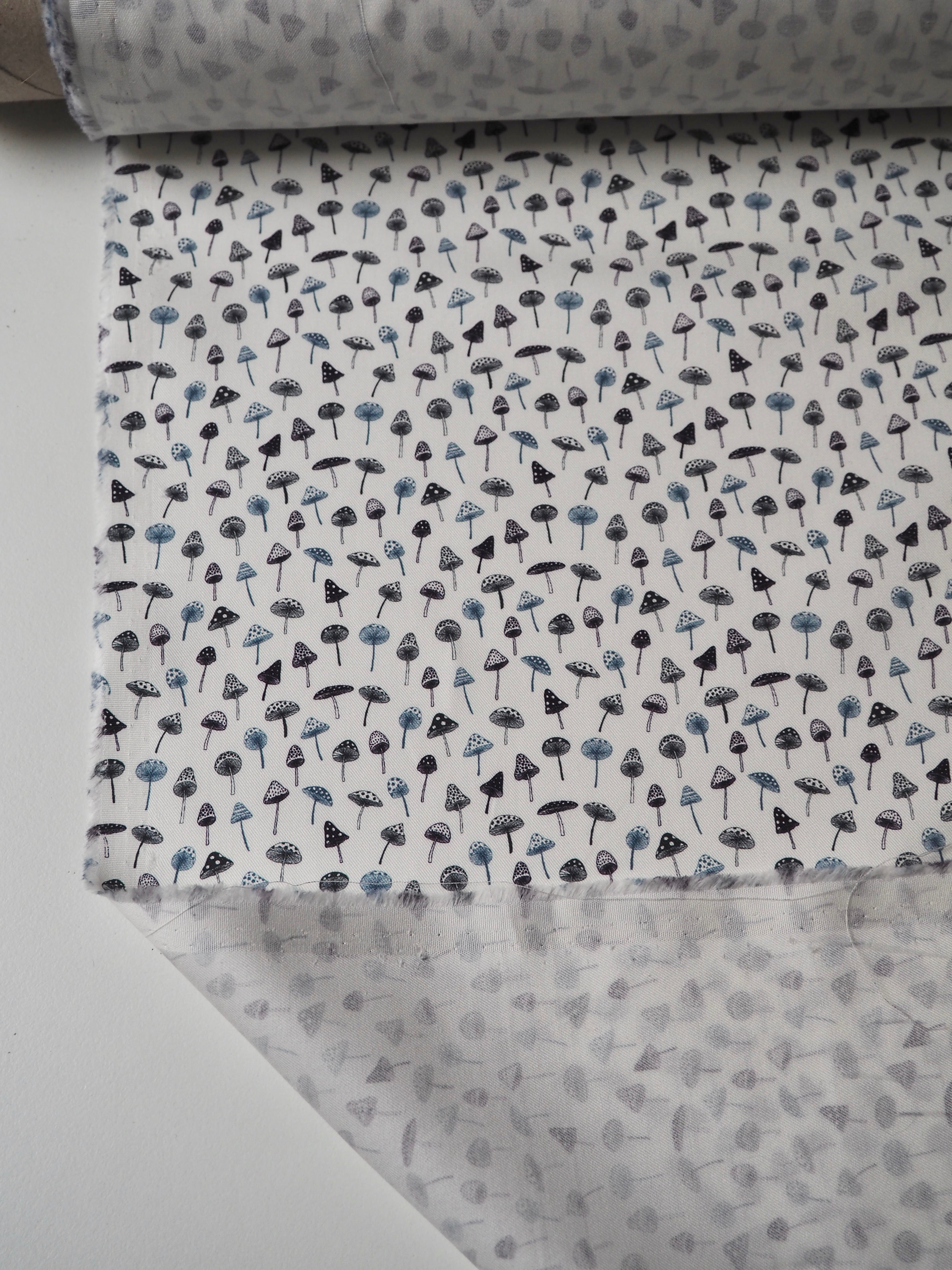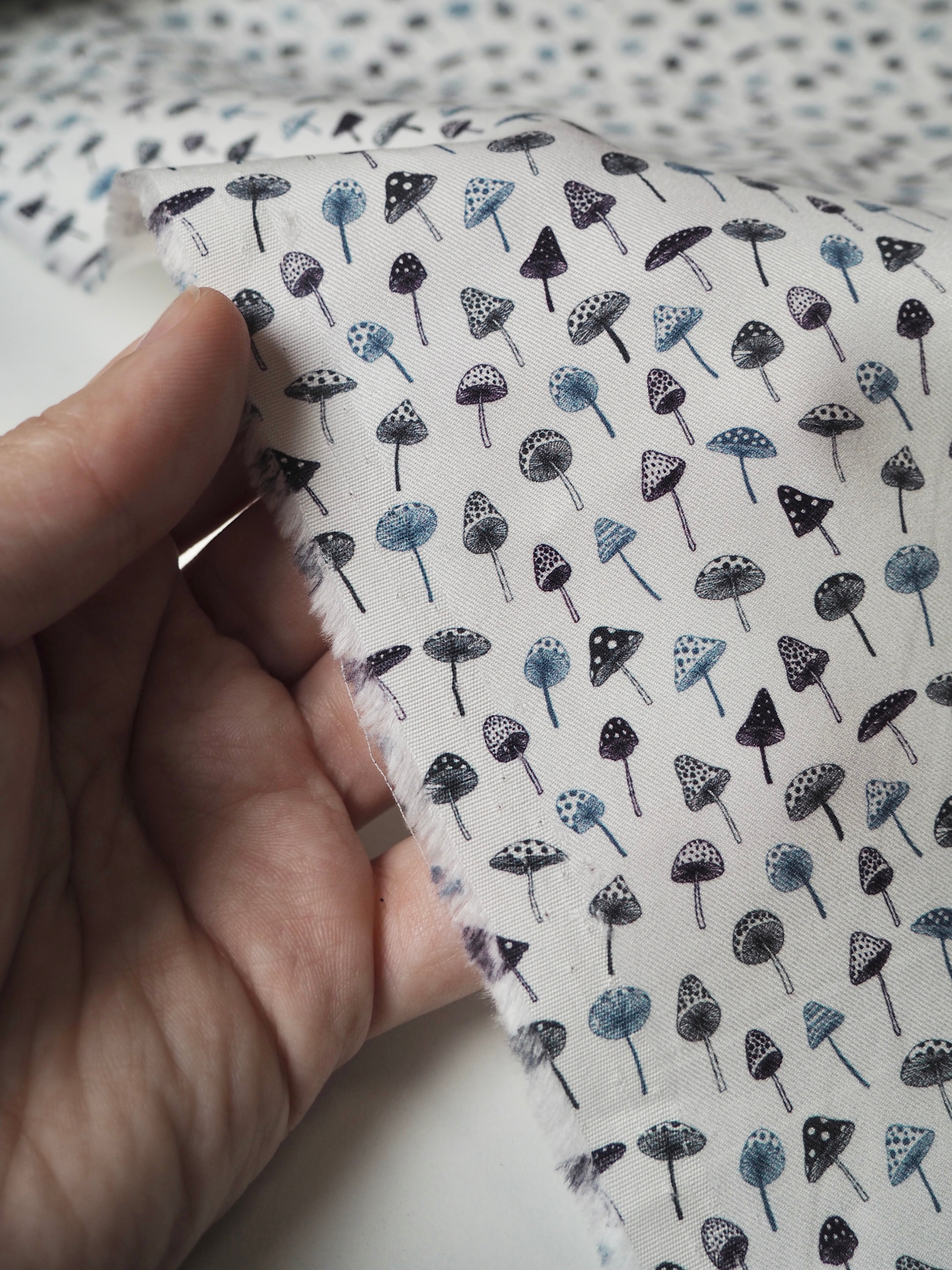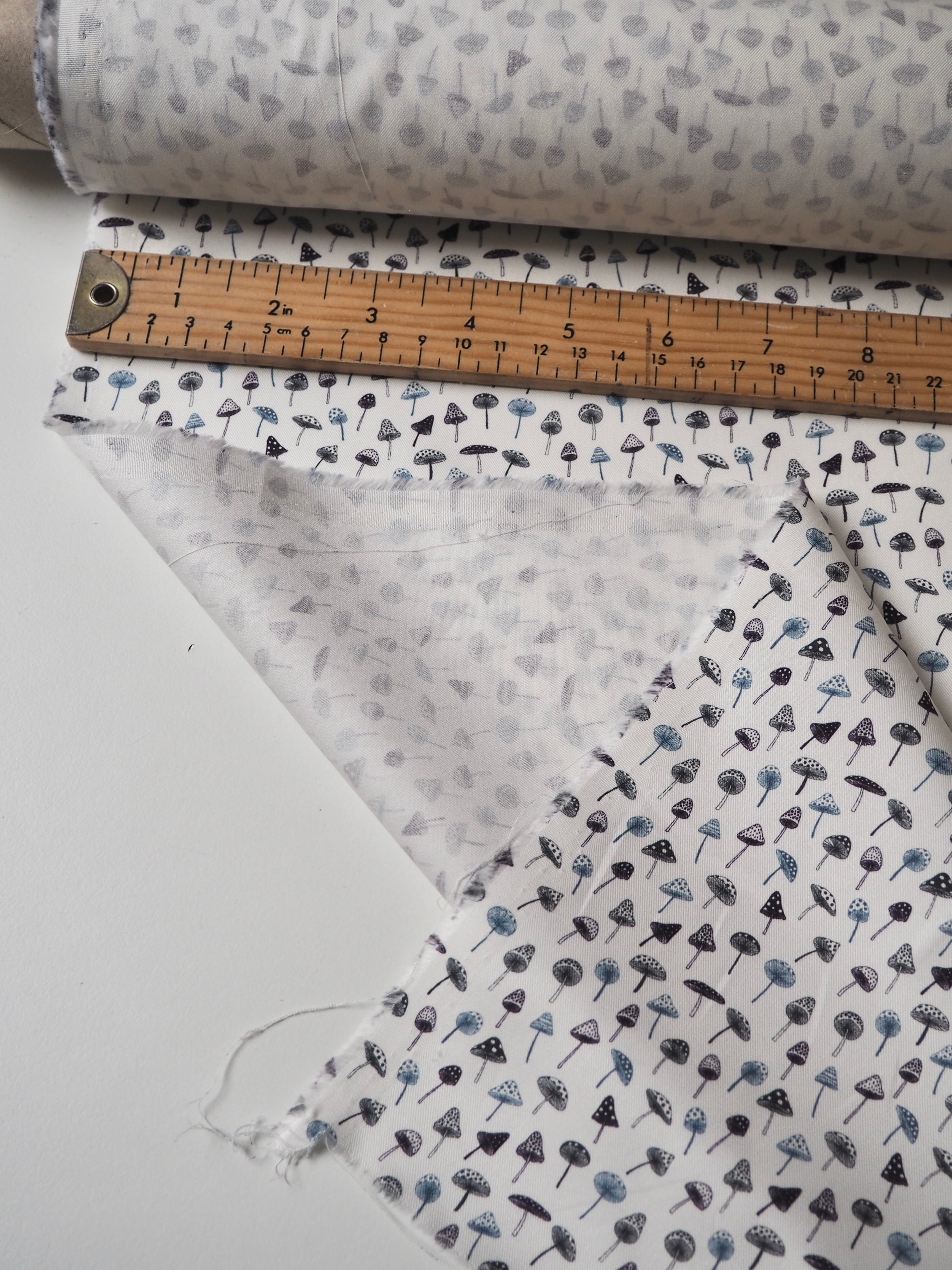 This ex-designer fabric is a classic Liberty cotton twill. It's a small scale mushroom print. A top-quality Liberty cotton in a light to medium weight. Soft with a lovely drape and slight crispness. Has a wonderful cotton handle and a slight sheen. Fully opaque! We would love to see a light jacket or bag!