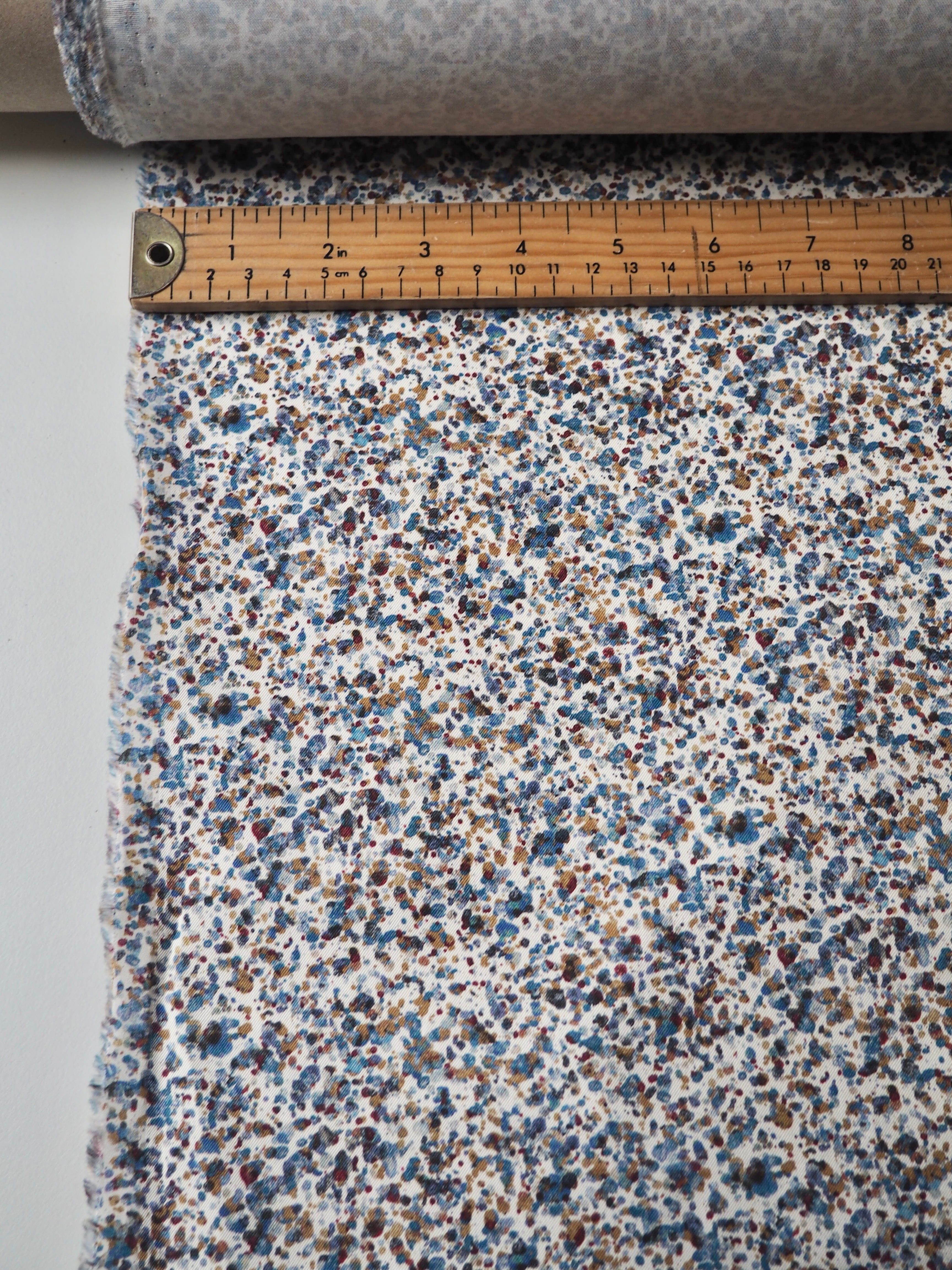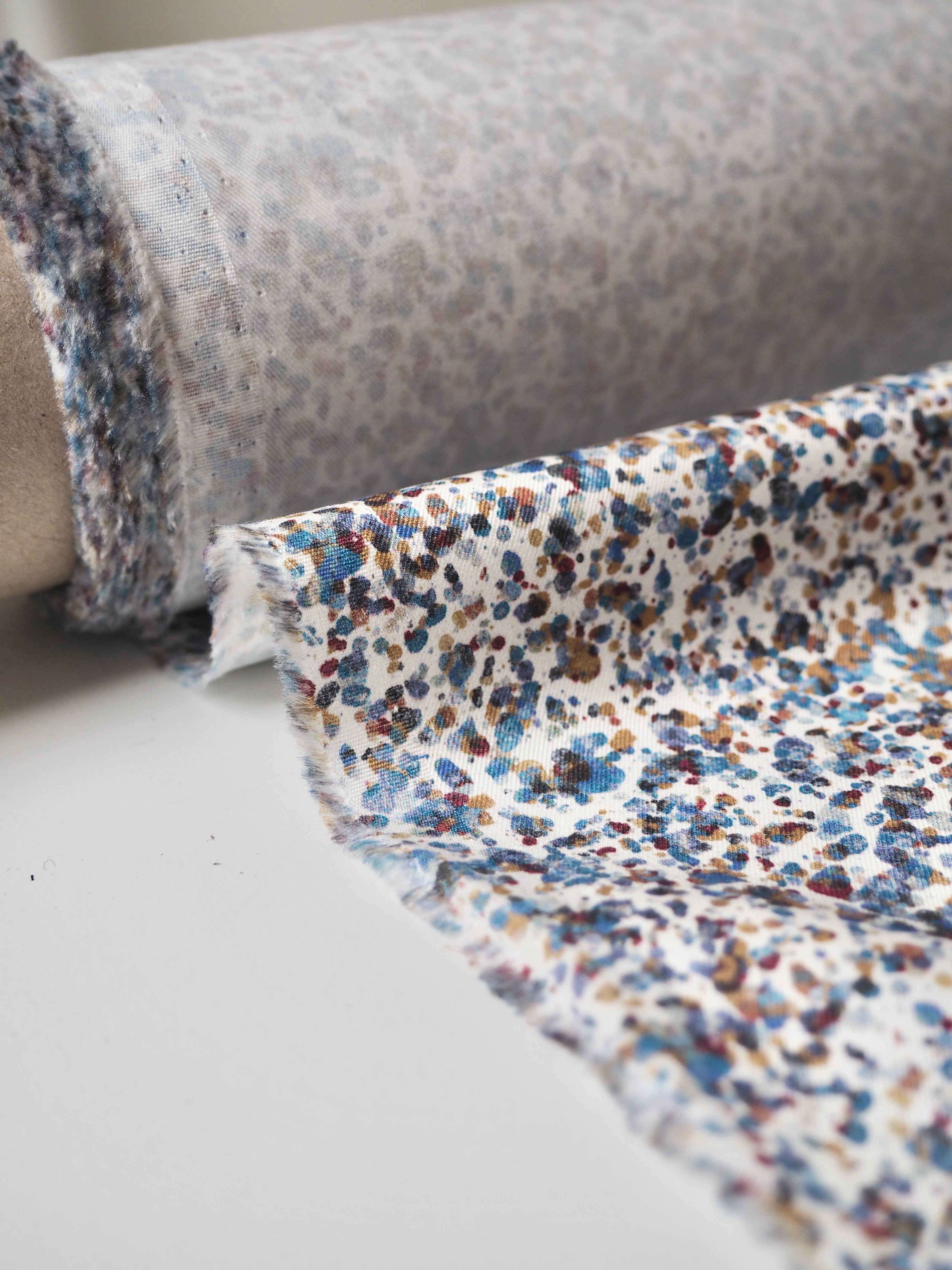 This ex-designer fabric is a classic Liberty cotton twill. It's a small scale multi-coloured dotted print. A top-quality Liberty cotton in a light to medium weight. Soft with a lovely drape and slight crispness. Has a wonderful cotton handle and a slight sheen. Fully opaque! We would love to see a light jacket or bag!