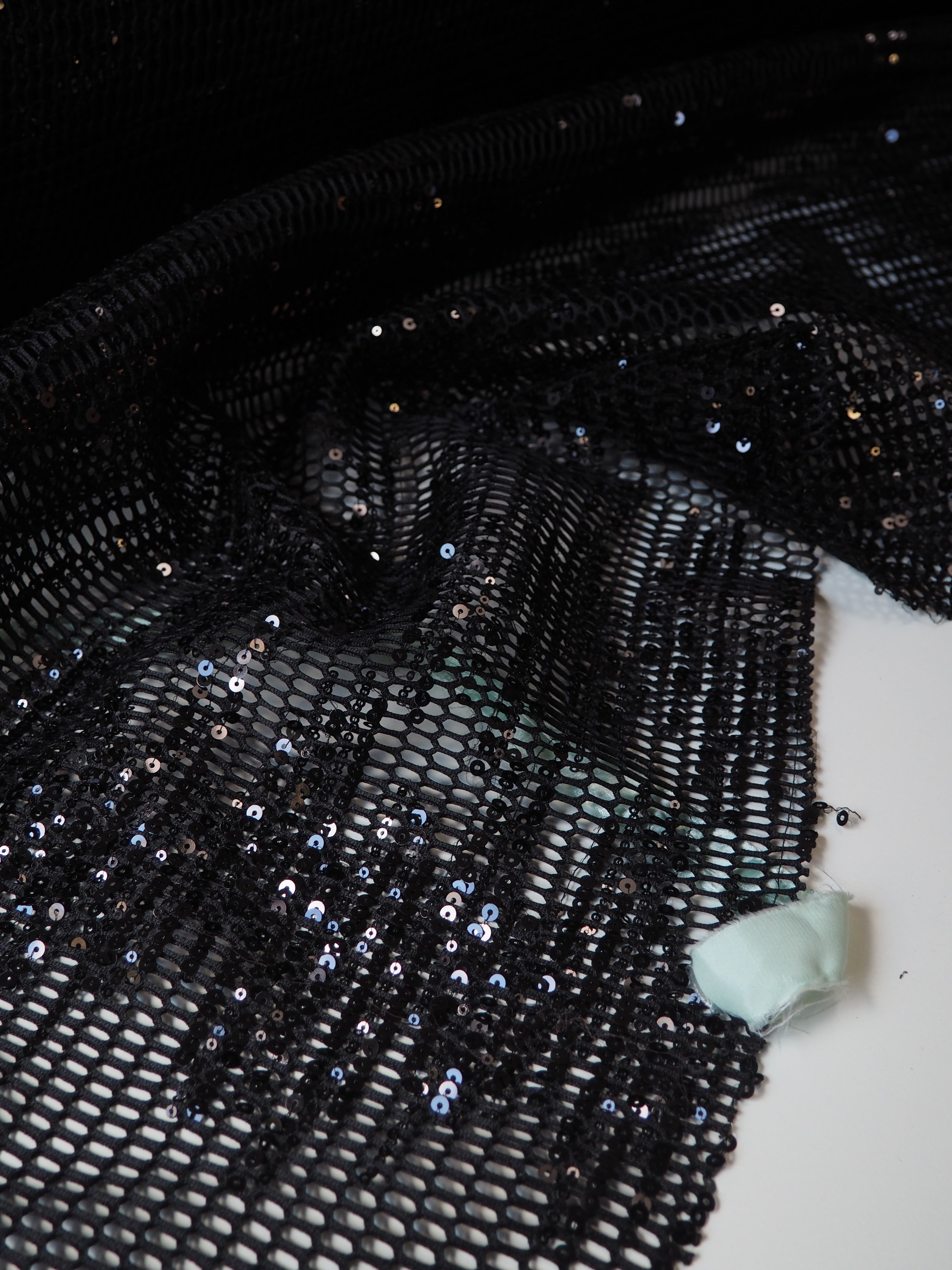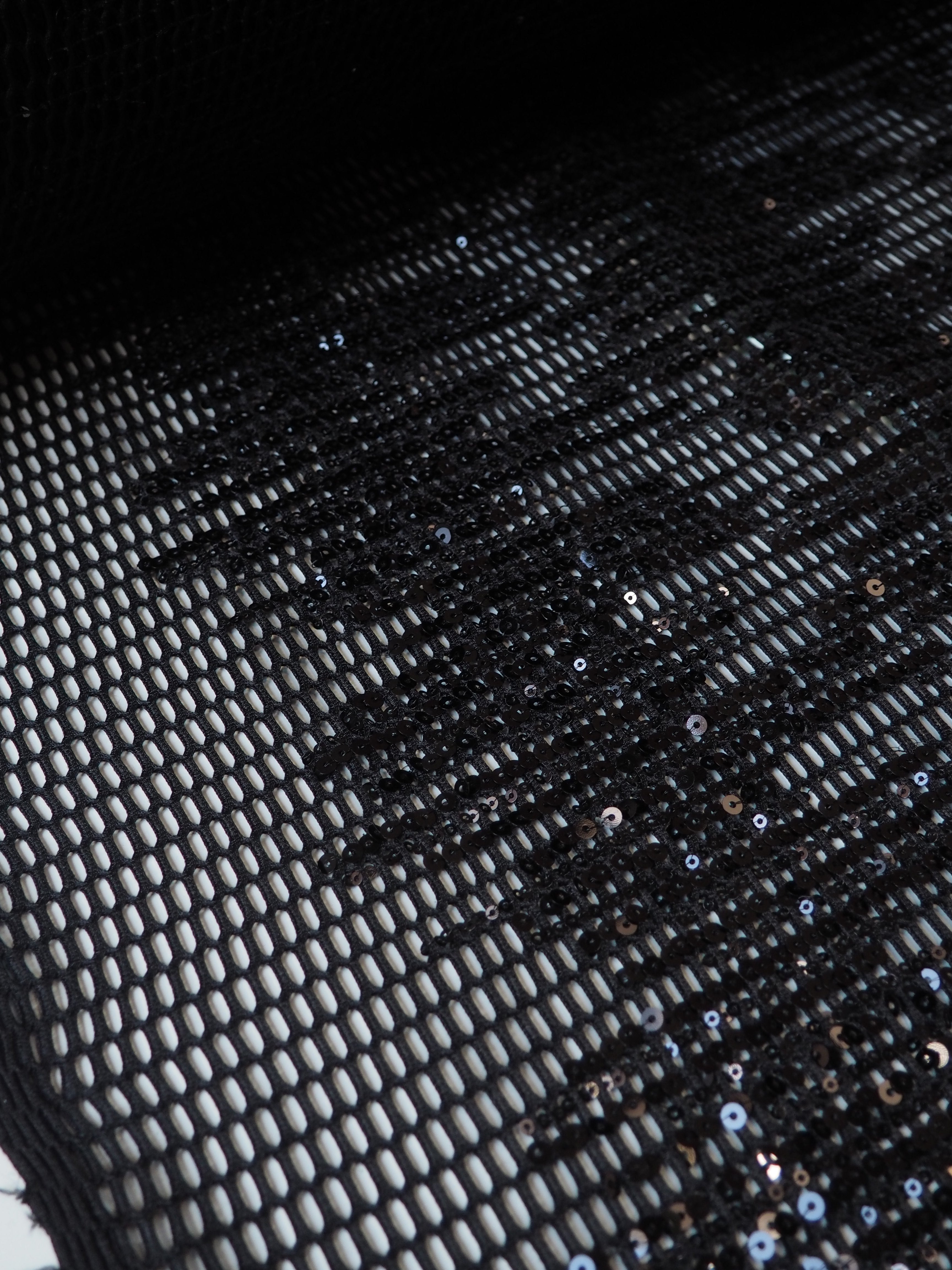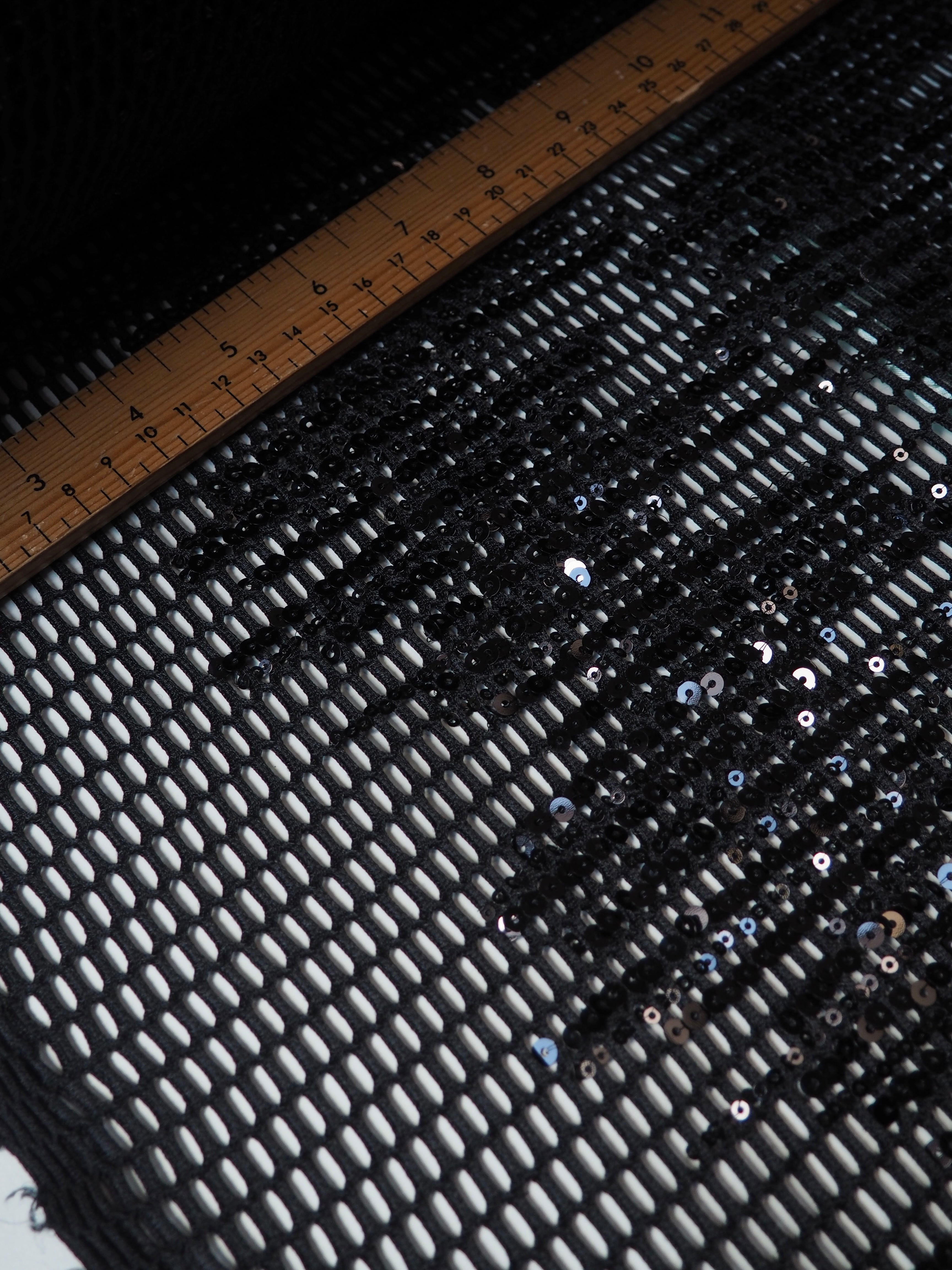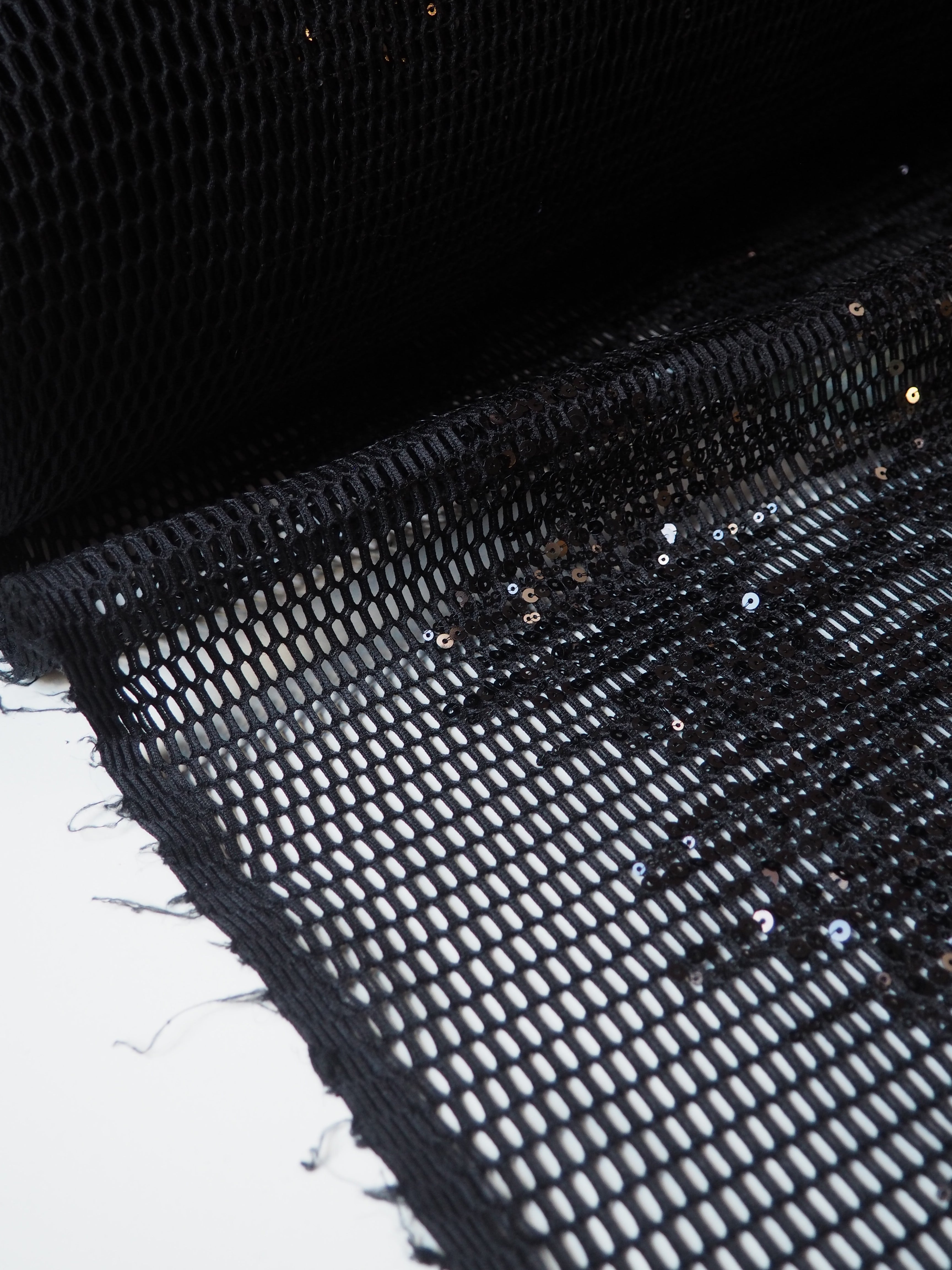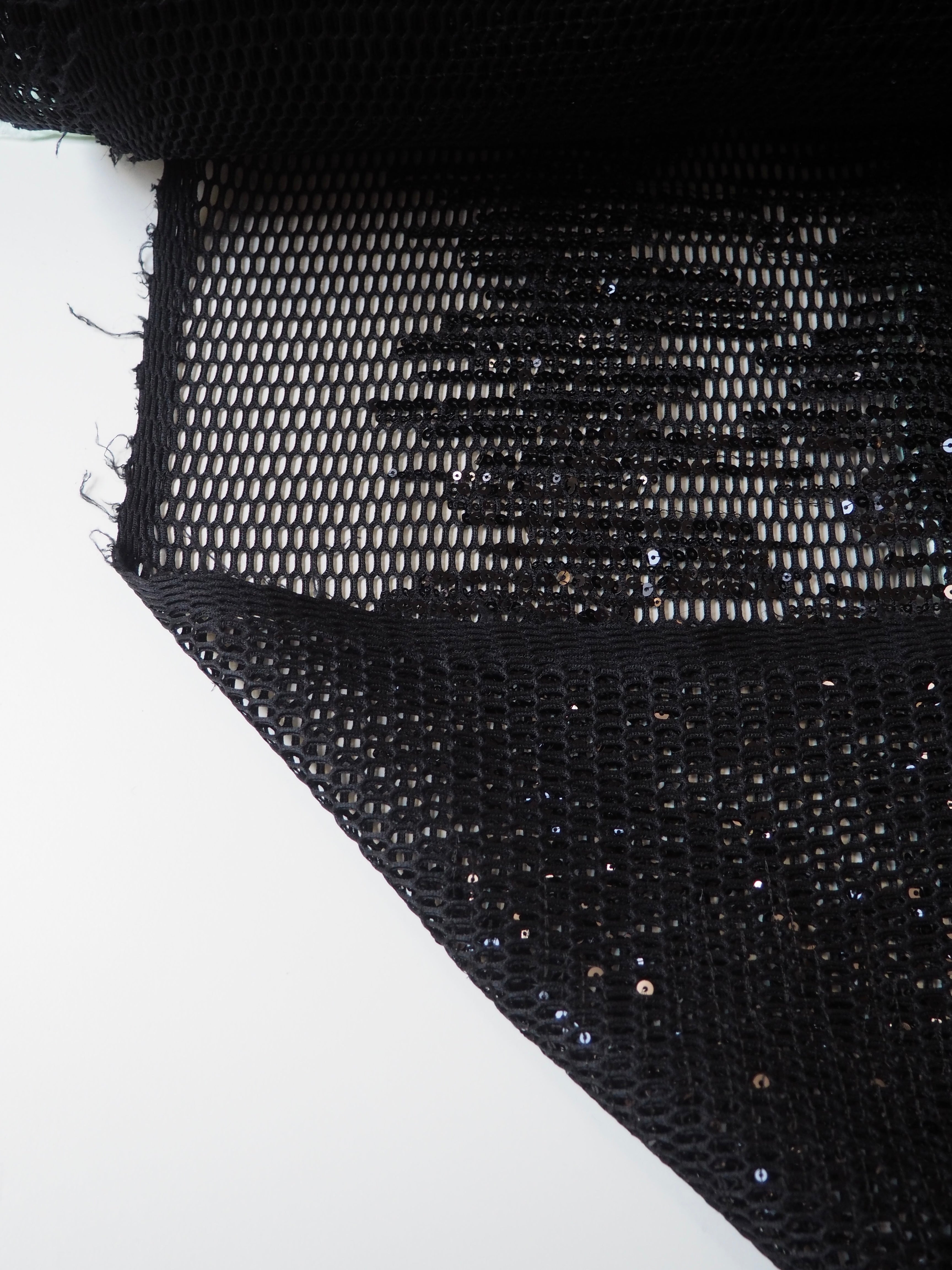 This ex-designer fabric is a unique mesh. It's a black mesh with large holes, and black sequins stitched in abstract striped grouping across the cloth. It's lightweight and has a nice structure to play with. Great as an overlay, or to be used for a sheer top, or even a bag!