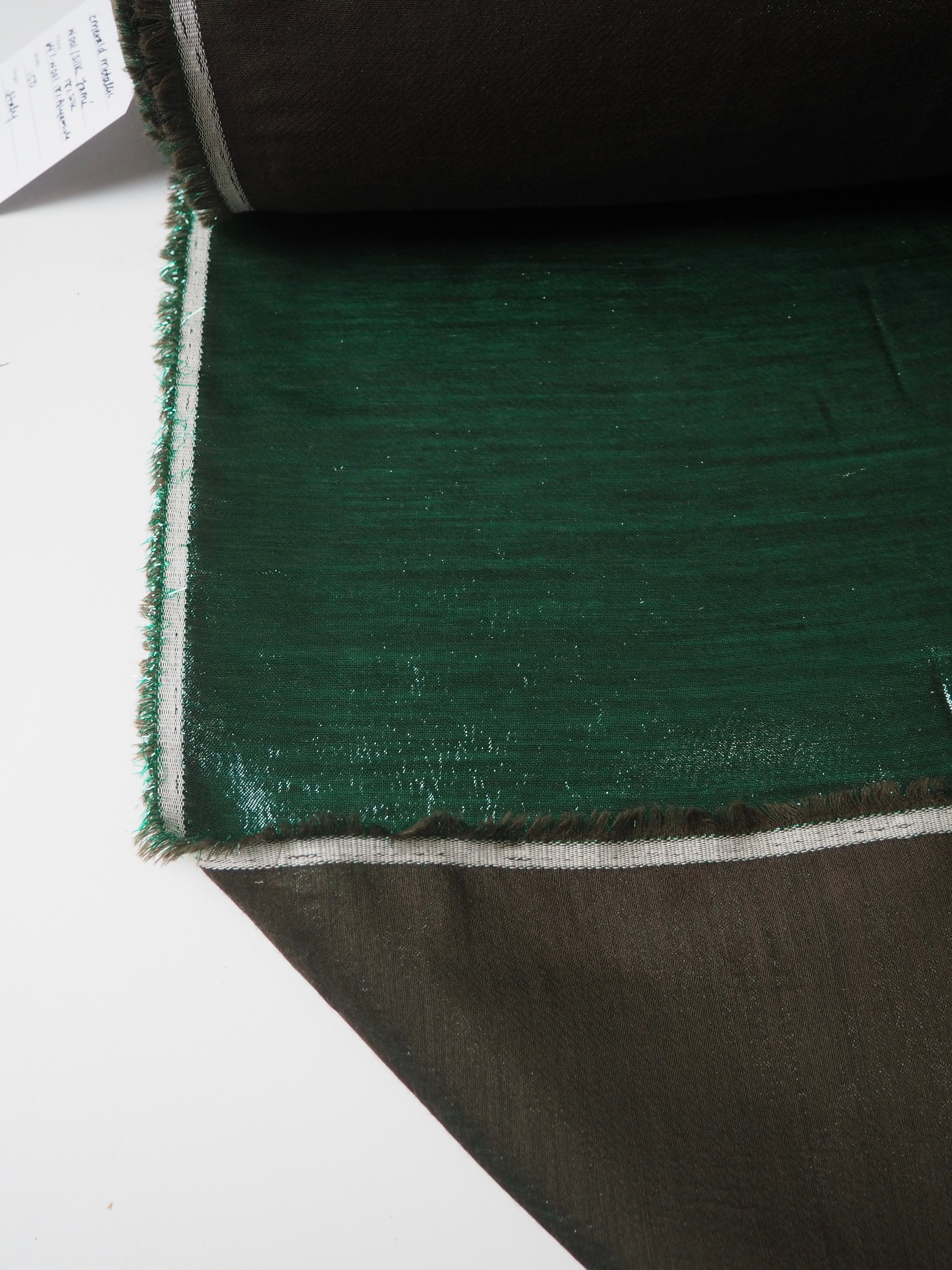 This ex-designer fabric is a unique cloth. It's a wool and silk blend lamé, with green metallic threads on the topside, and a soft brown reverse. It has such a liquid movement and gorgeous sheen finish. It's slightly sheer when held to the light. Lightweight, and has lots of flexible structure. Drapes similar to an organza. Perfect for a lightweight top or festive dress!