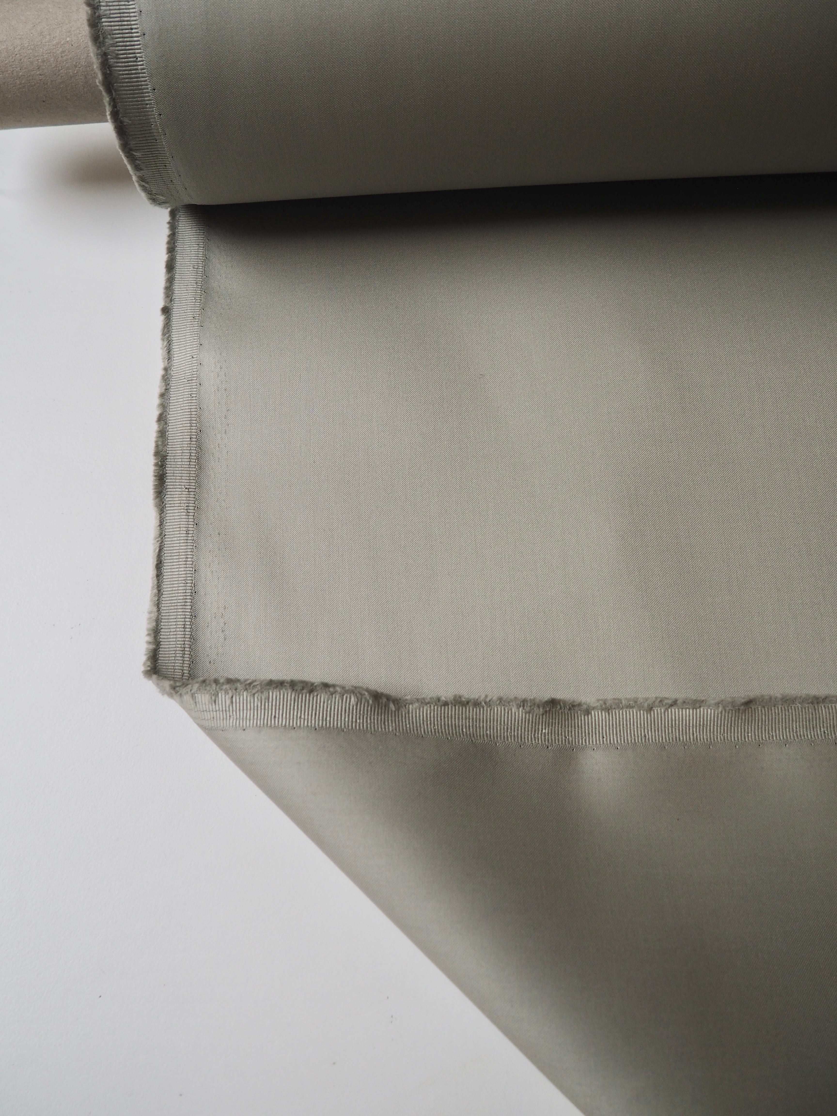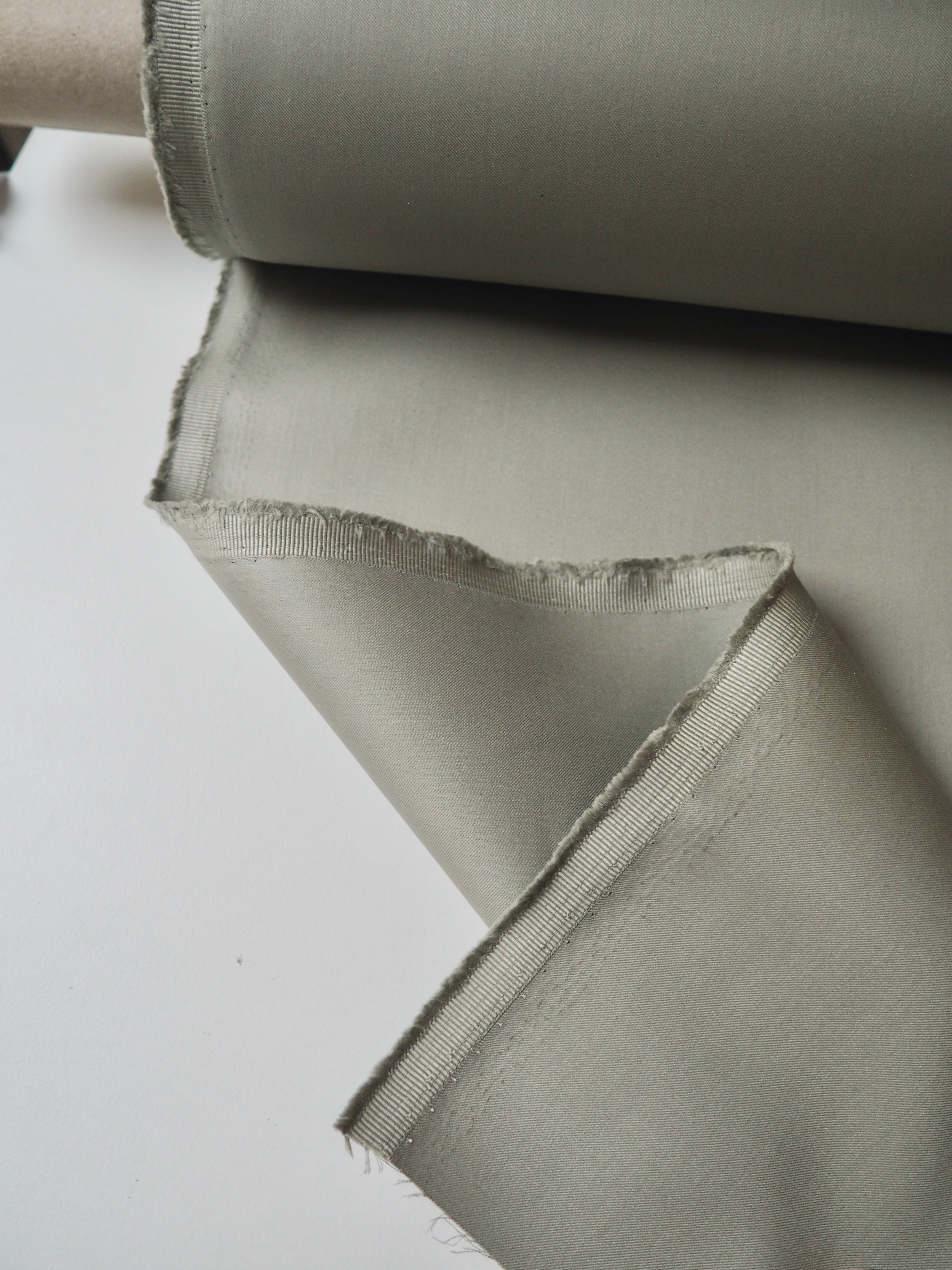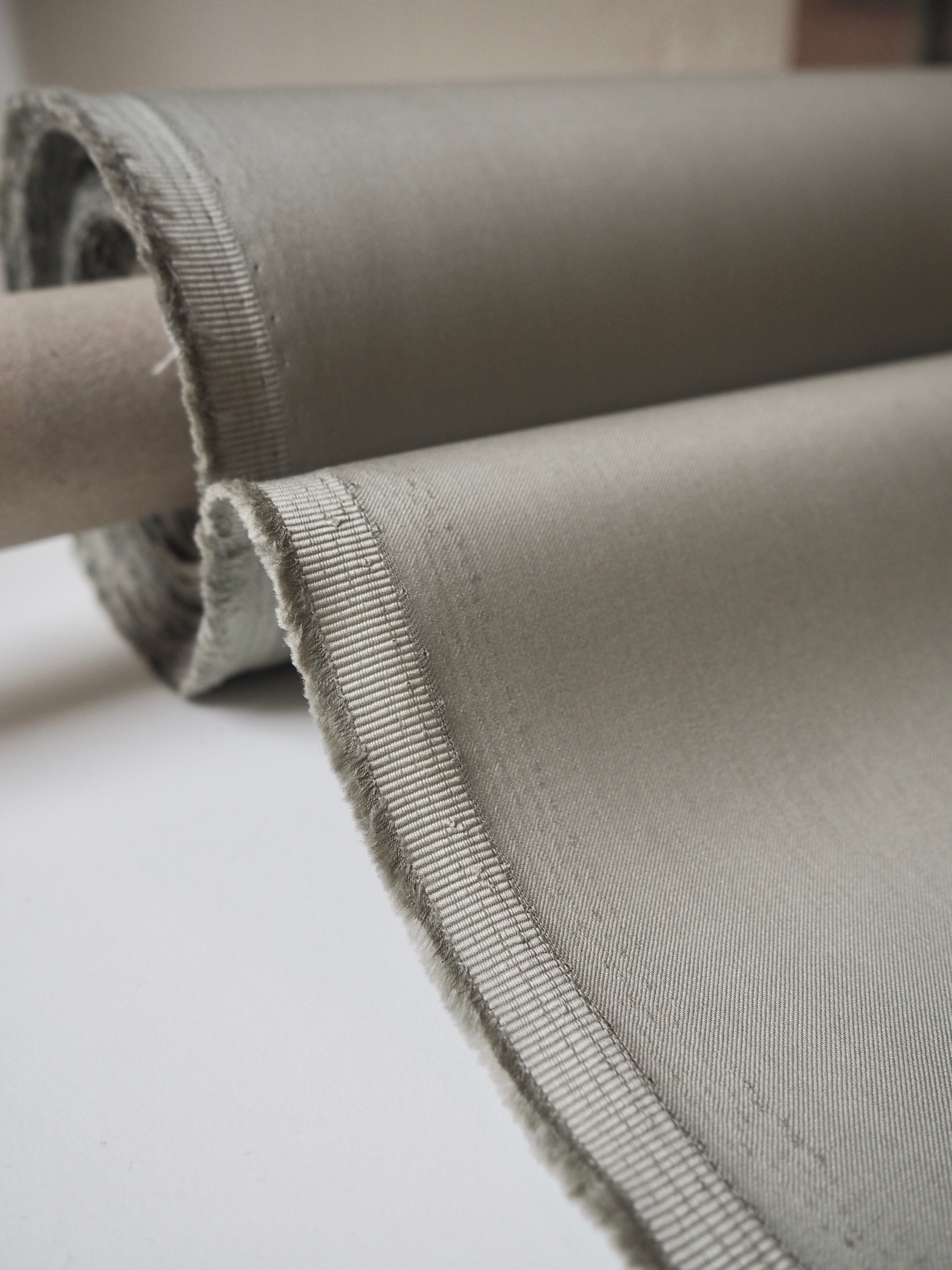 This ex-designer fabric is a double cotton twill. In a pale grey-ish eucalyptus colour. It's double faced, with a very structured handle and sateen finish on both sides. It's medium to heavy weight, with a lovely soft feel. We love this for jacket!