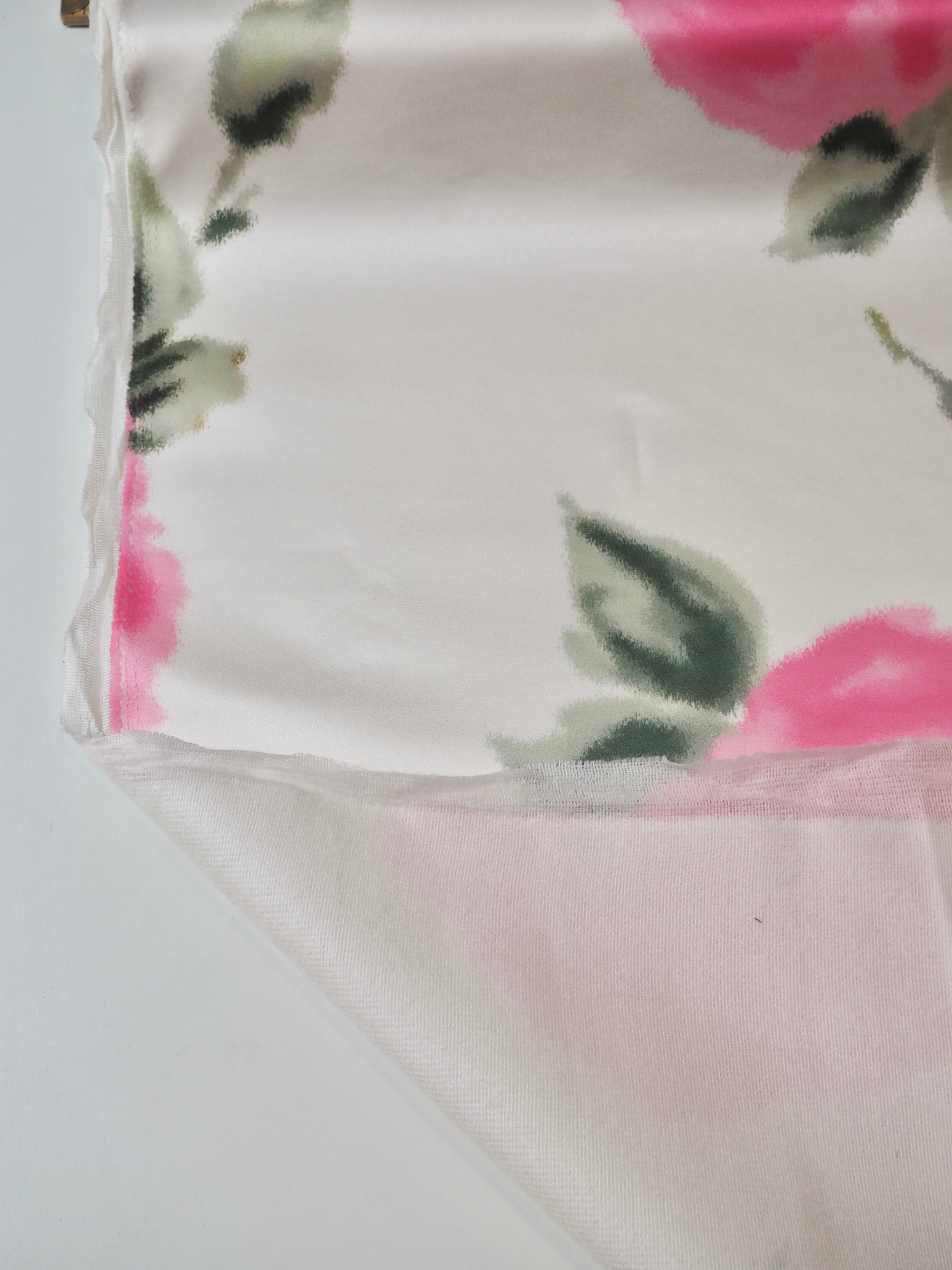 This ex-designer fabric is a lovely satin. It's a slightly warped rose print on a medium weight white satin. It's pre-interfaced, which gives it more structure to work with and fuller opacity. Lovely handle and gentle softness! Beautiful for a dress or top, or even a cropped jacket!