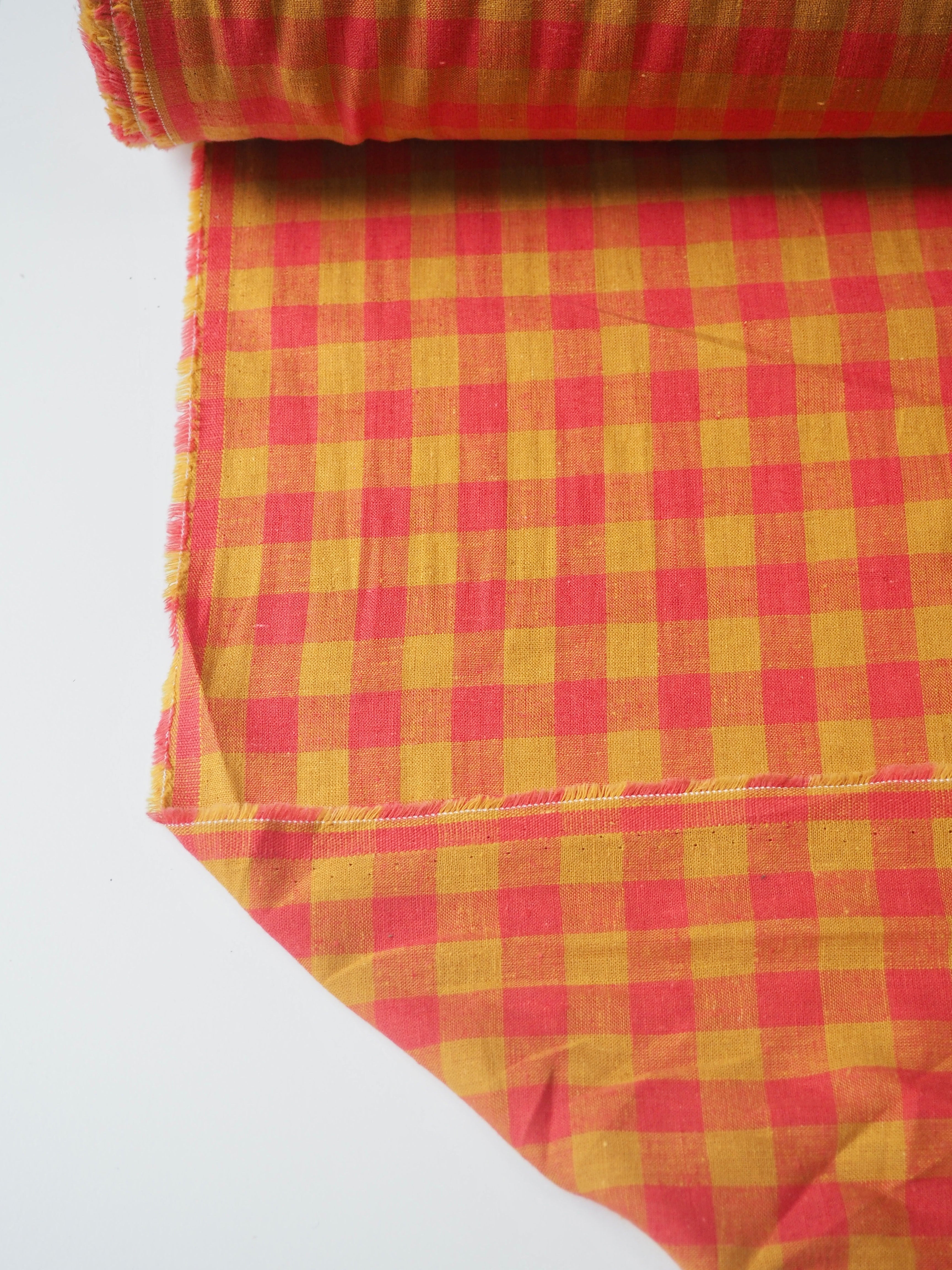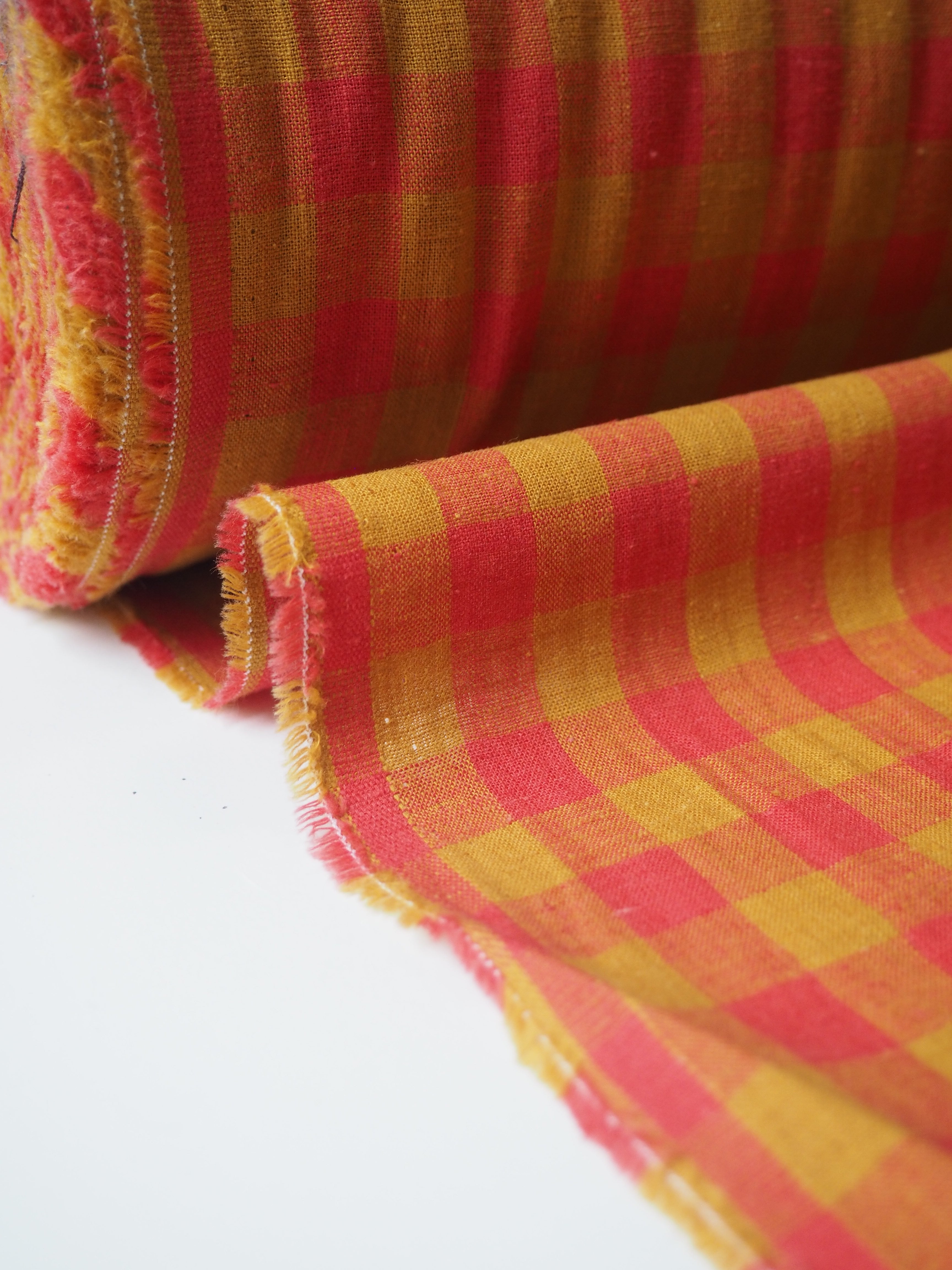 This ex-designer fabric is a bold cotton/linen. It's a warm berry pink and butterscotch yellow/orange small scale gingham check. It's from a London-based brand called Beyond Nine. Checks are about 1.25cm. It has a super soft and gentle blended weave, with an ideal cotton-y handle that's so wearable. That little bit of linen really elevates the cloth! Very lightweight with a gentle structured drape, breathable, and fully opaque. Lovely for our Everyday Dress/Top, summer tops or Everyday Trousers, (or even a co-ord!), or a tablecloth and napkin set! We can't wait to see what you make!