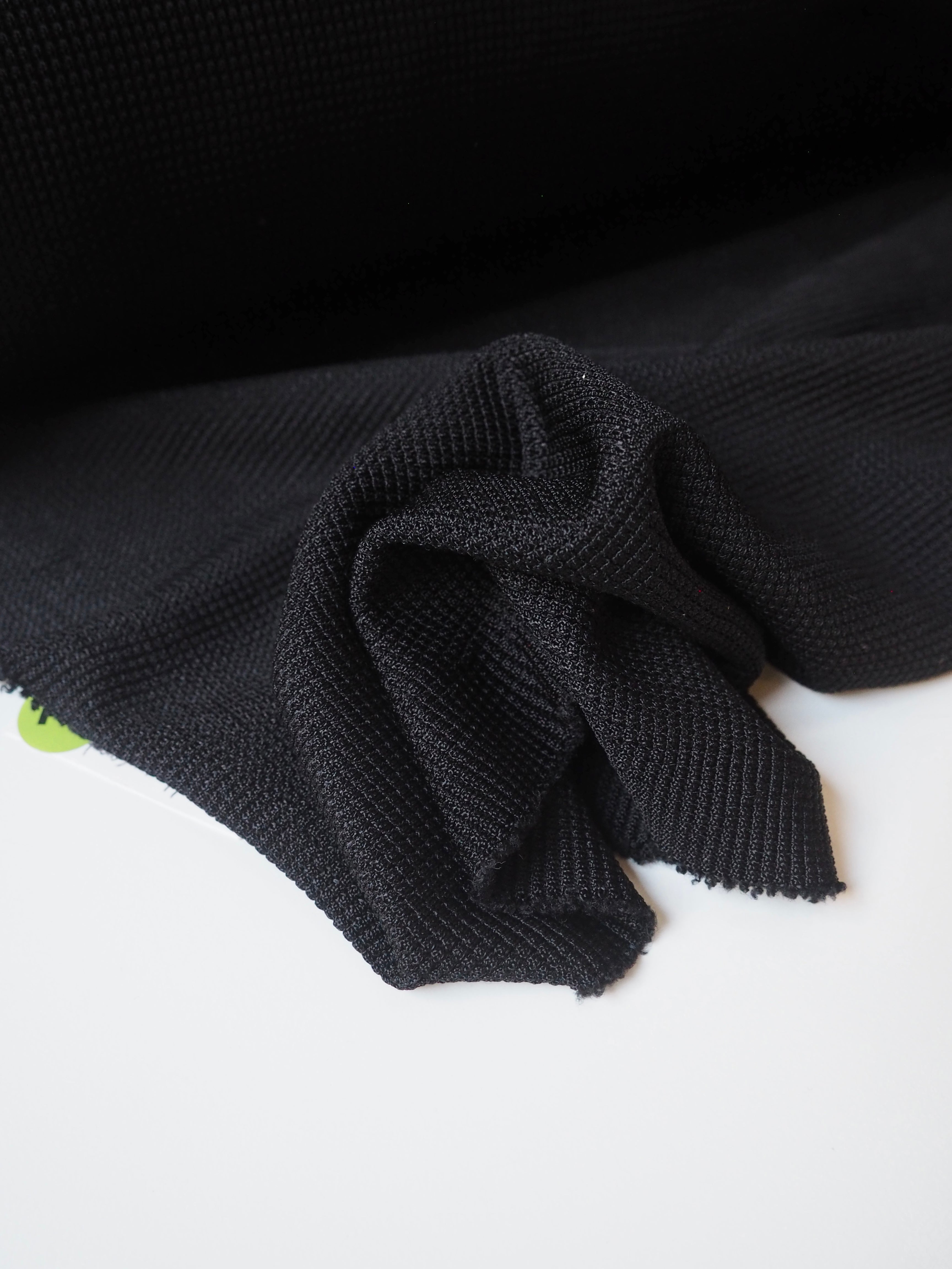 This ex-designer fabric is a unique knit. It has a honeycomb-like, very similar to a pronounced rib knit. It has a great 50% natural stretch both ways. It's semi-sheer when stretched, and is very soft and comfortable. Lightweight, with a great drape, and a textured handle. Is quite bouncy and so fun! Would make the coolest overlay or sheer top!